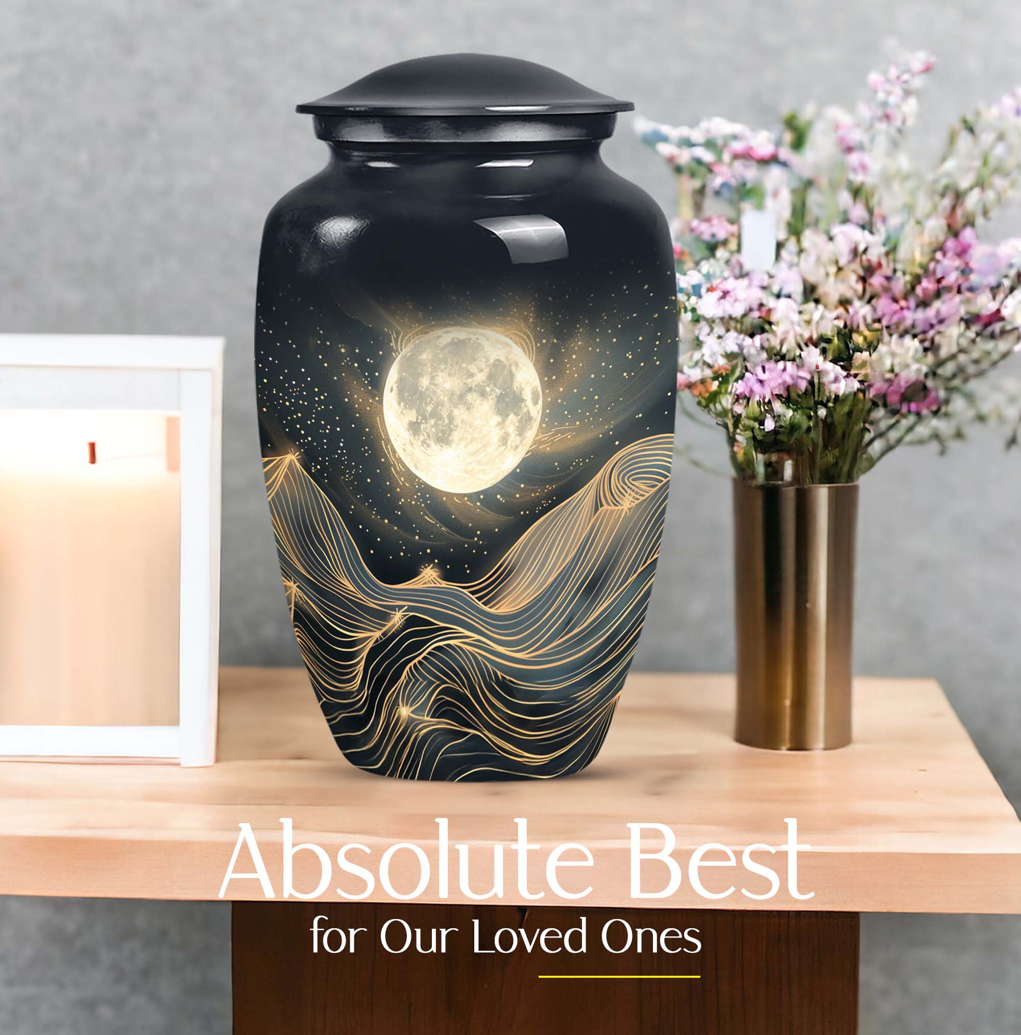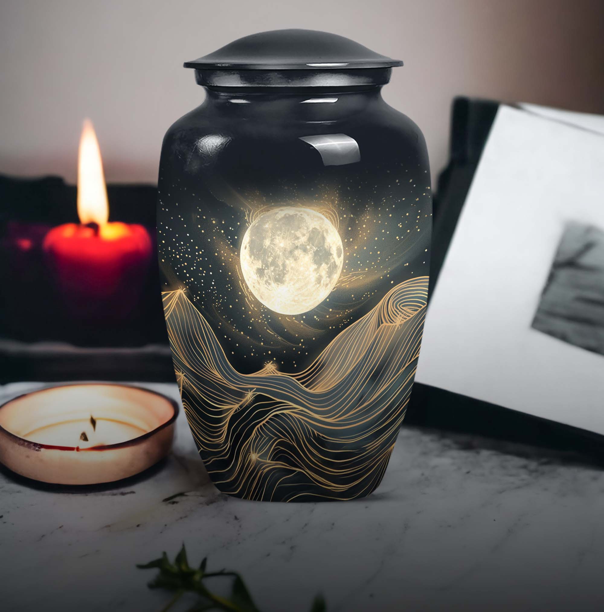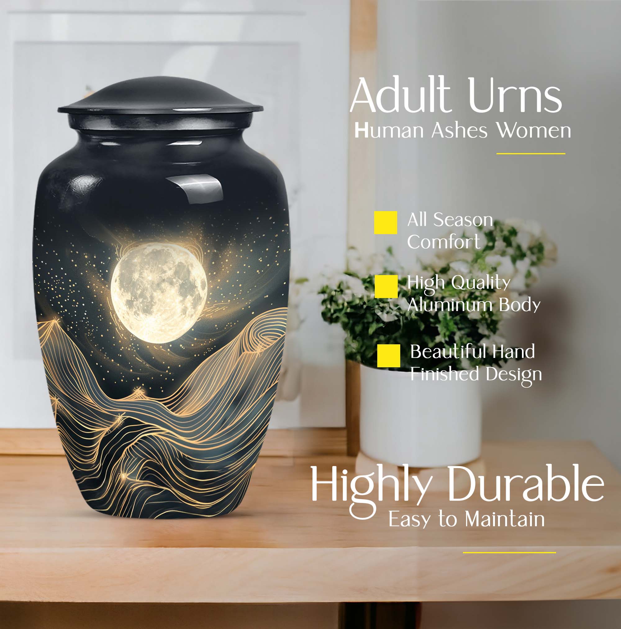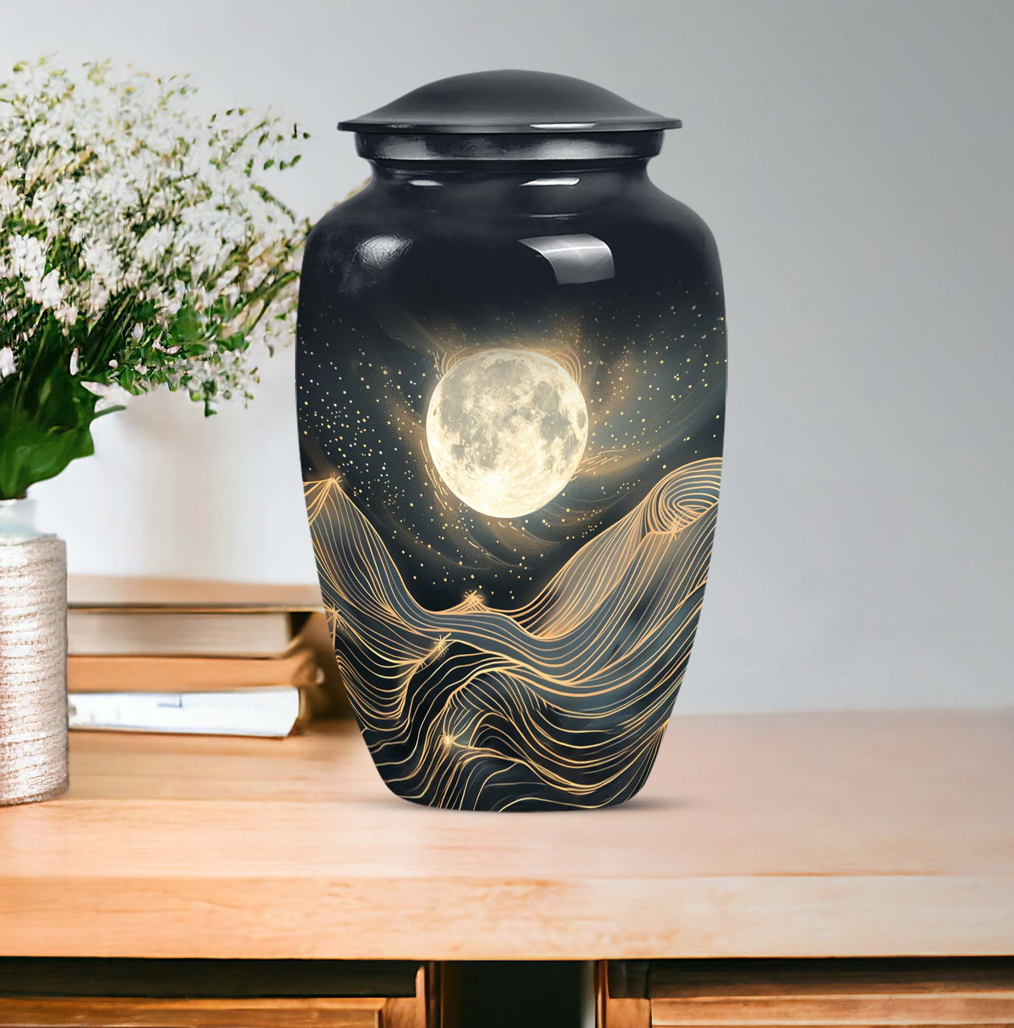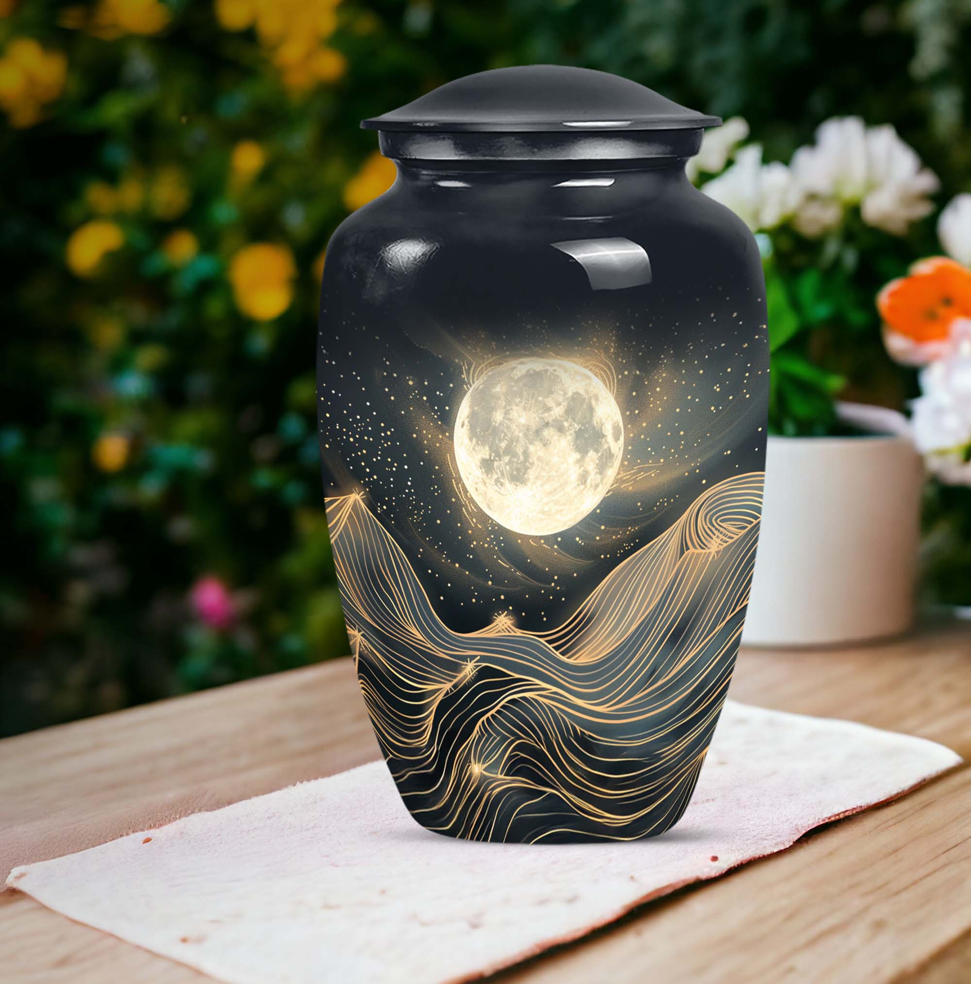 Experience a solemn and elegant tribute to your beloved with this beautifully crafted Lunar Urn, a memorable representation of life and love. Built to a size of 10 inches and a weight of 3.3 pounds, this large urn offers substantial capacity of 200 cubic inches, aptly accommodating the ashes of an adult. Delicately sculpted from high quality, lightweight Aluminium, this distinctive piece boasts an Abstract theme that makes each remembrance uniquely yours. This Lunar Memorial Urn comes with the thoughtful addition of a velvet pouch, providing a protective containment for the ashes. With an option to personalize through engraved names, this keepsake ensures that your loved ones are never forgotten. Frequently sought-after keywords such as 'memorial funeral urns', 'funeral urns for burial', 'human ash urns', 'urns for human ashes', and 'mom cremation urn' resonate with our offering, positioning it as a paramount choice for consumers navigating through memorial ceremony supplies online. Note: The design attribute of this listing has not been disclosed in compliance with your instruction.