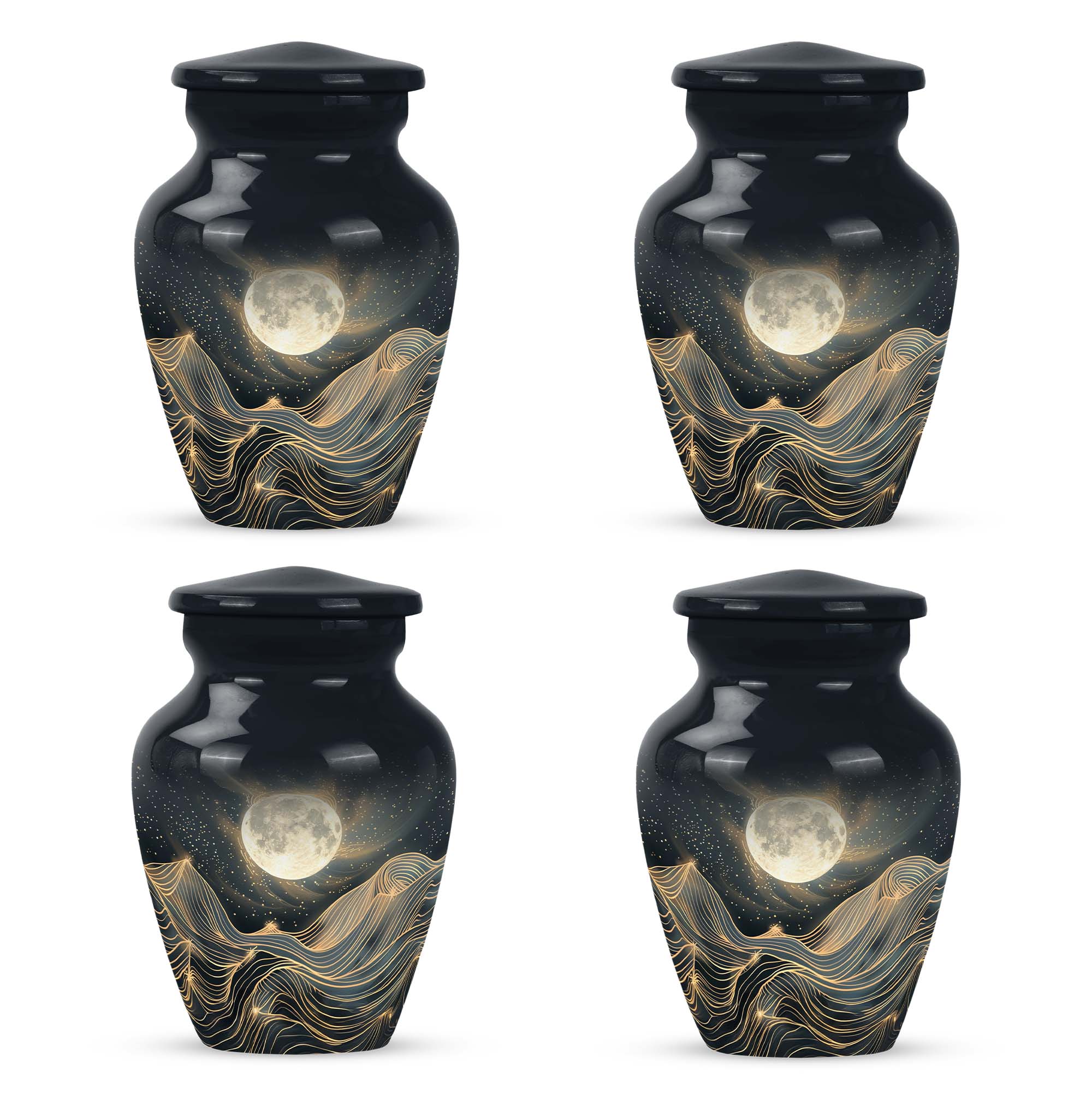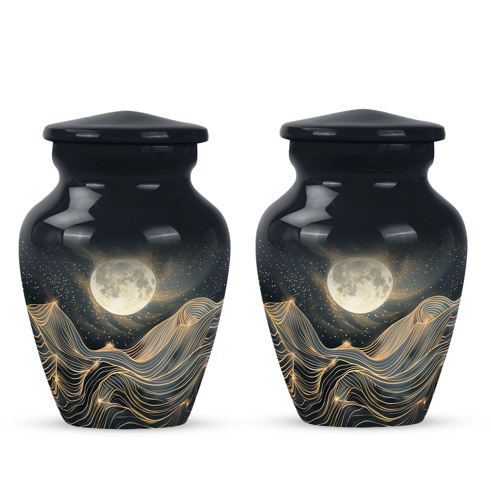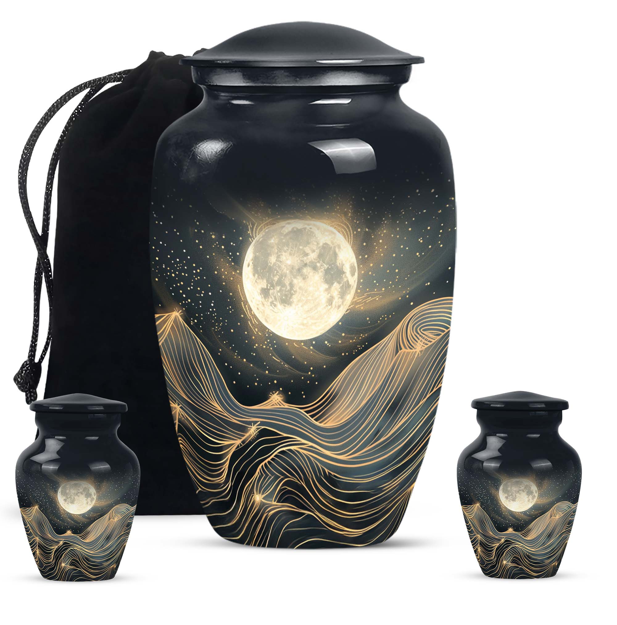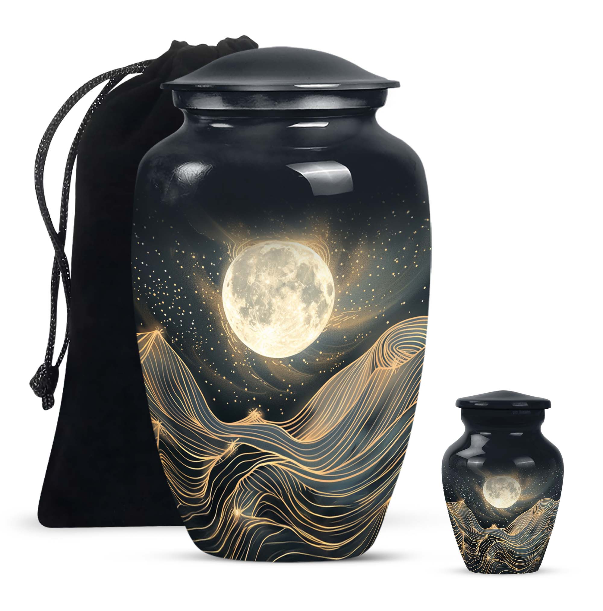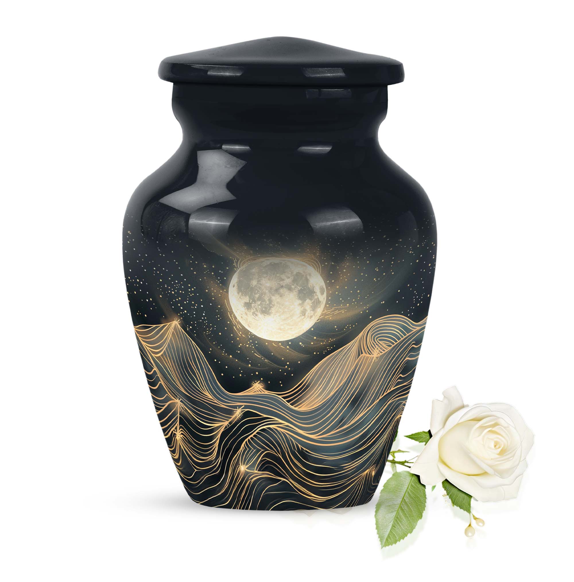 Experience a solemn and elegant tribute to your beloved with this beautifully crafted Lunar Urn, a memorable representation of life and love. Built to a size of 10 inches and a weight of 3.3 pounds, this large urn offers substantial capacity of 200 cubic inches, aptly accommodating the ashes of an adult. Delicately sculpted from high quality, lightweight Aluminium, this distinctive piece boasts an Abstract theme that makes each remembrance uniquely yours. This Lunar Memorial Urn comes with the thoughtful addition of a velvet pouch, providing a protective containment for the ashes. With an option to personalize through engraved names, this keepsake ensures that your loved ones are never forgotten. Frequently sought-after keywords such as 'memorial funeral urns', 'funeral urns for burial', 'human ash urns', 'urns for human ashes', and 'mom cremation urn' resonate with our offering, positioning it as a paramount choice for consumers navigating through memorial ceremony supplies online. Note: The design attribute of this listing has not been disclosed in compliance with your instruction.