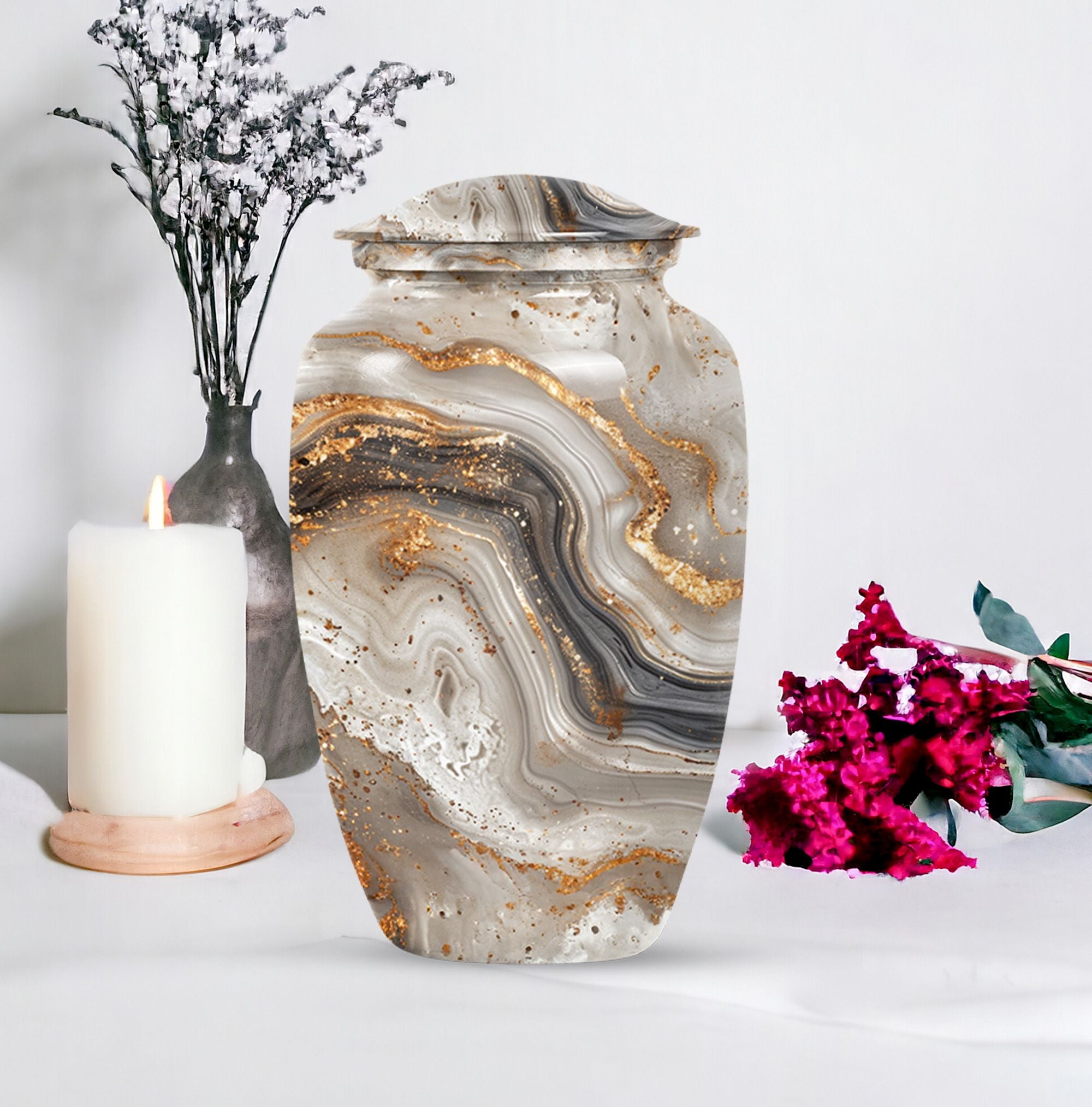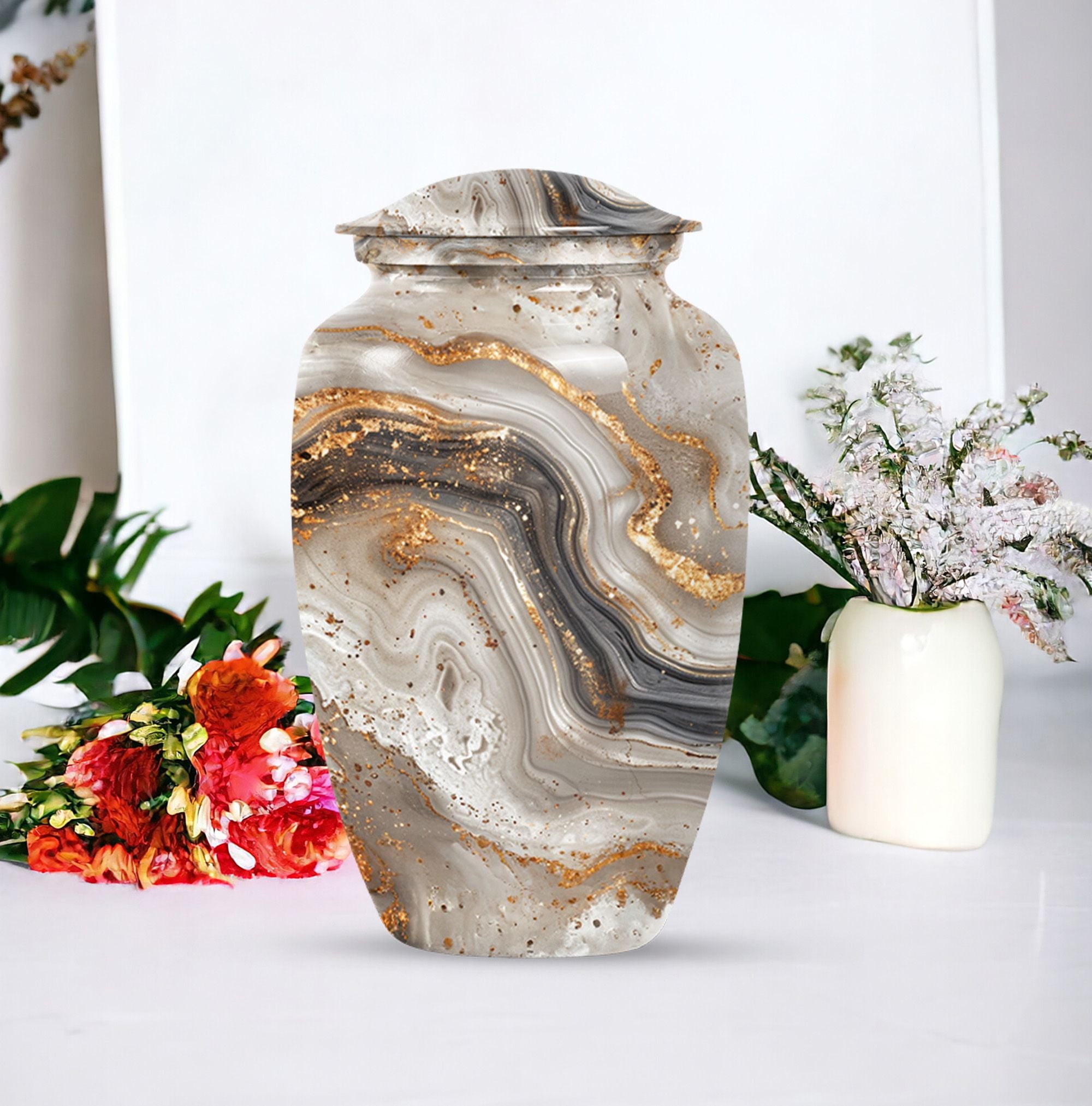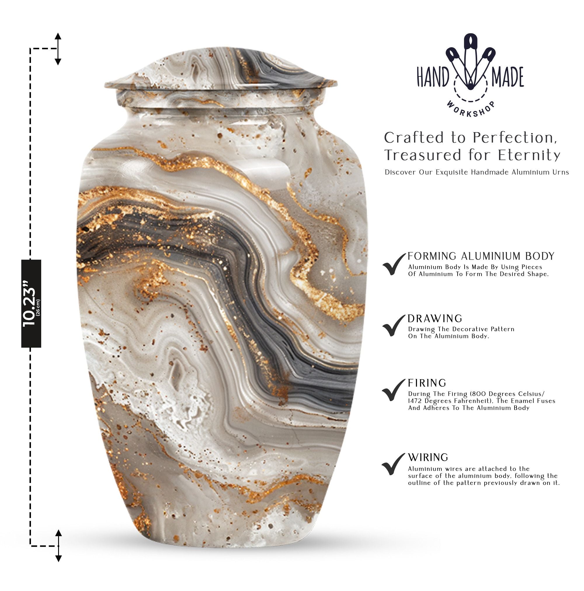 Unveiling the Vibrant Swirl Urn, a grand tribute to your beloved departed. Measuring 10 inches in height and weighing 3.3 pounds, this large urn fills its role as an ideal memorial perfectly. Its classic urn design is an embodiment of eternal peace, an abstract tribute reflecting the infinite spirit of a loved one. Constructed from aluminium, its durability ensures long-lasting preservation of memories. With a remarkable 200 cubic inches capacity, the urn can hold ashes of an adult male and adult female comfortably. Moreover, its customization feature allows you to personalize it with engraved names, making it a unique token of remembrance. Furthermore, a velvet pouch for containment of ashes is included, adding an elevated touch. Ideal for funeral scenarios and memorial ceremonies, it serves as an exquisite resting place. Highlighted by keywords like 'funeral large urns for human ashes adult male', 'memorial urns', 'cremation companion urns', and 'cremation urns', it's the perfect tribute to your beloved departed. Embrace the memory of your loved one with our Vibrant Swirl Urn, a symbol of everlasting love.