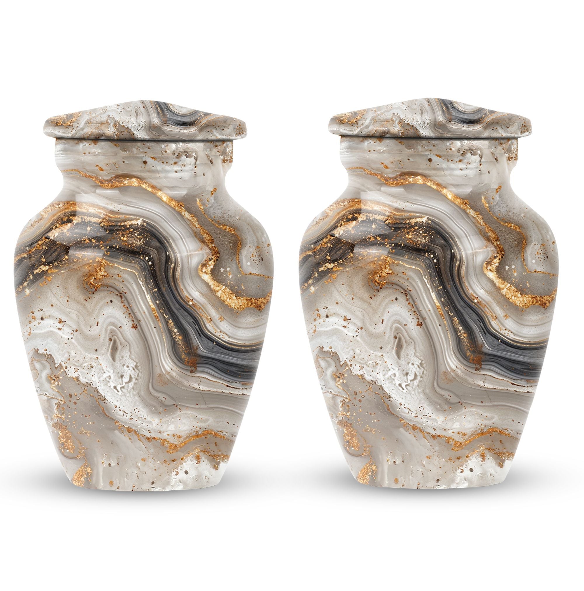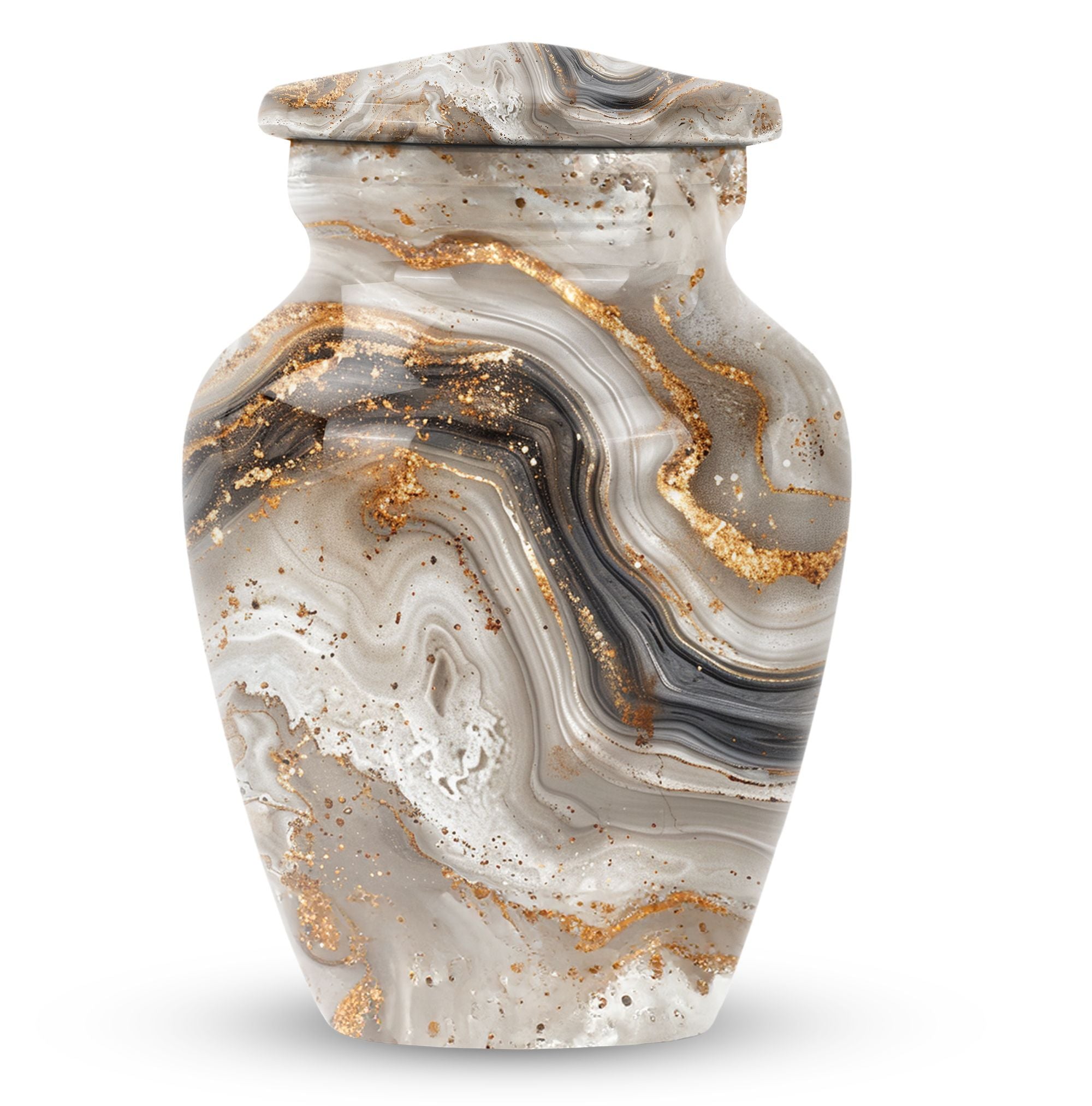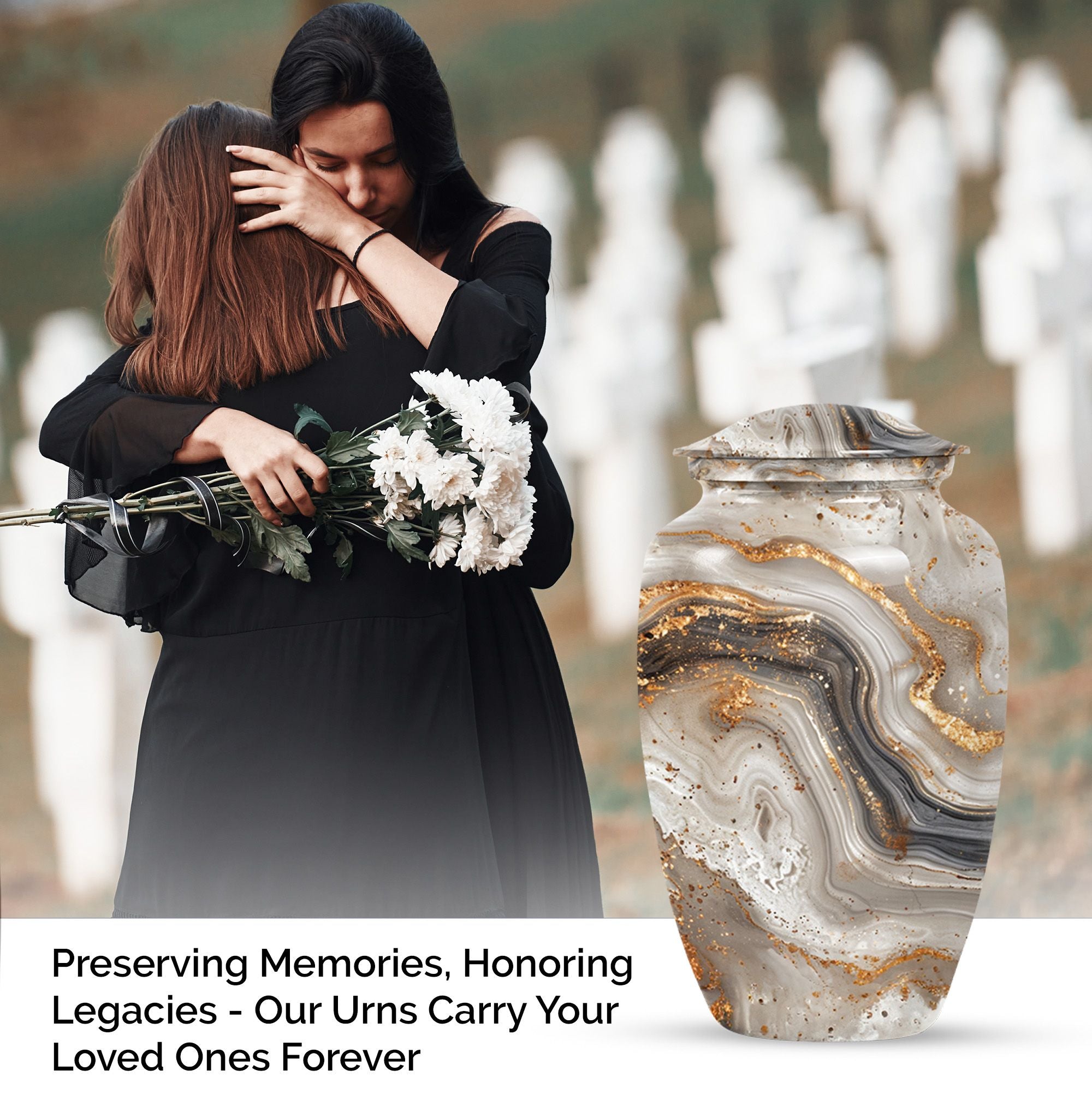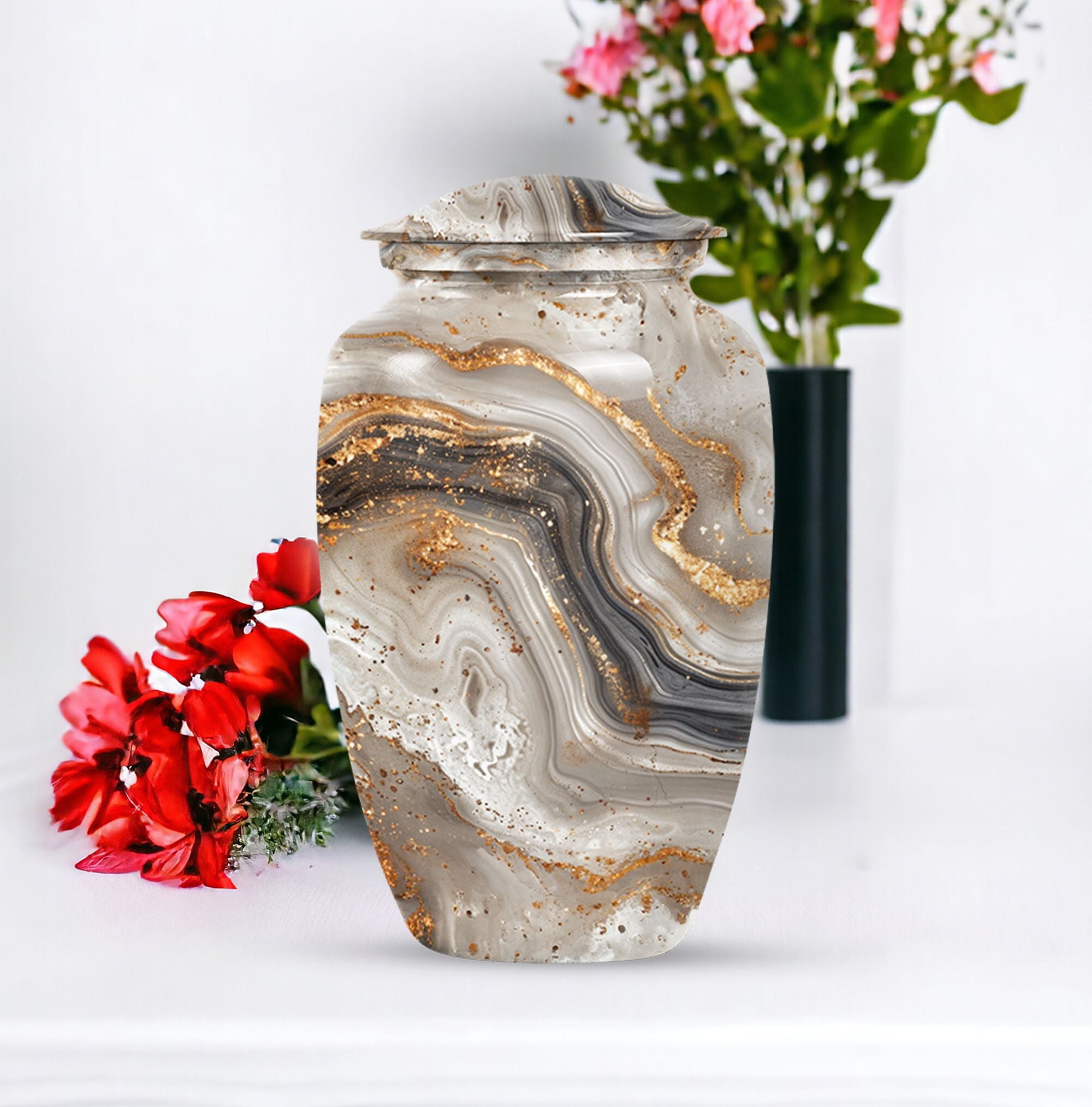 Unveiling the Vibrant Swirl Urn, a grand tribute to your beloved departed. Measuring 10 inches in height and weighing 3.3 pounds, this large urn fills its role as an ideal memorial perfectly. Its classic urn design is an embodiment of eternal peace, an abstract tribute reflecting the infinite spirit of a loved one. Constructed from aluminium, its durability ensures long-lasting preservation of memories. With a remarkable 200 cubic inches capacity, the urn can hold ashes of an adult male and adult female comfortably. Moreover, its customization feature allows you to personalize it with engraved names, making it a unique token of remembrance. Furthermore, a velvet pouch for containment of ashes is included, adding an elevated touch. Ideal for funeral scenarios and memorial ceremonies, it serves as an exquisite resting place. Highlighted by keywords like 'funeral large urns for human ashes adult male', 'memorial urns', 'cremation companion urns', and 'cremation urns', it's the perfect tribute to your beloved departed. Embrace the memory of your loved one with our Vibrant Swirl Urn, a symbol of everlasting love.