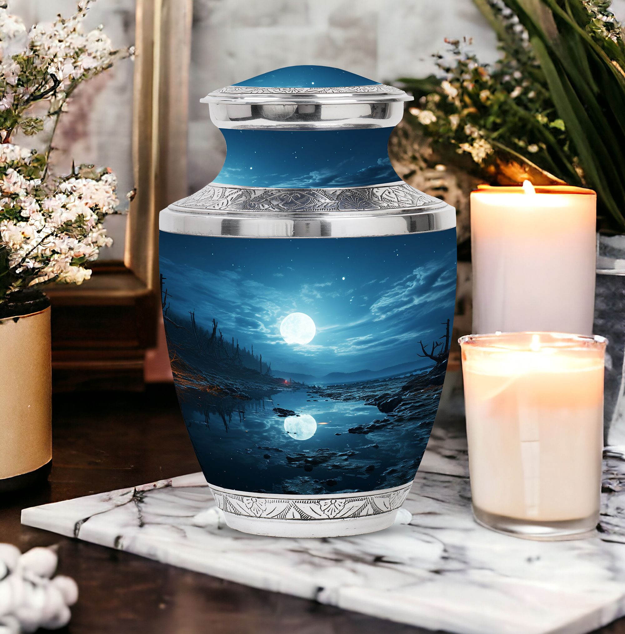 Illuminate the memory of a loved one with our majestic Moon Urn, a sublime choice for those seeking blue urns for human ashes adorned with celestial mystique. Immaculately constructed to honor and remember beloved adult females, this resting piece offers more than just solace. It's a touch of grace, mirroring the eternal sky. With distinctive aesthetics and robust build, it also answers your need for medium urns for human ashes. Our Moon Urns are unique paeans to all personalities and resonate exceptionally well as cremation urns for men. Each urn is designed to pacify your longing and exemplify your love for those who are now unseen but forever felt. If your heart is on the search for burial urns for adult human ashes or specifically urns for cremation ashes of a mother, our Moon Urn offers a tender solace, a sanctum where love never fades but remains eternally vibrant.