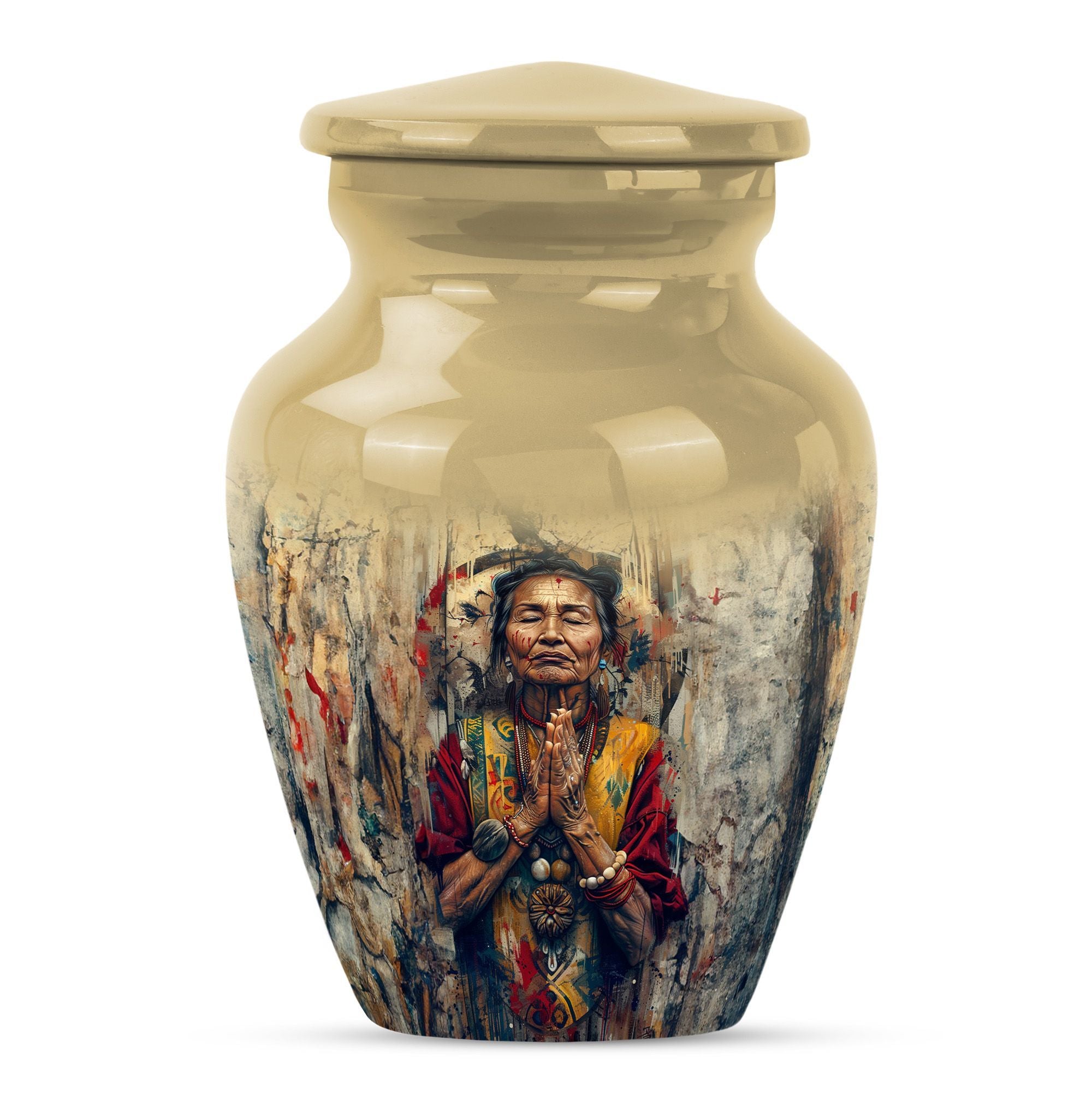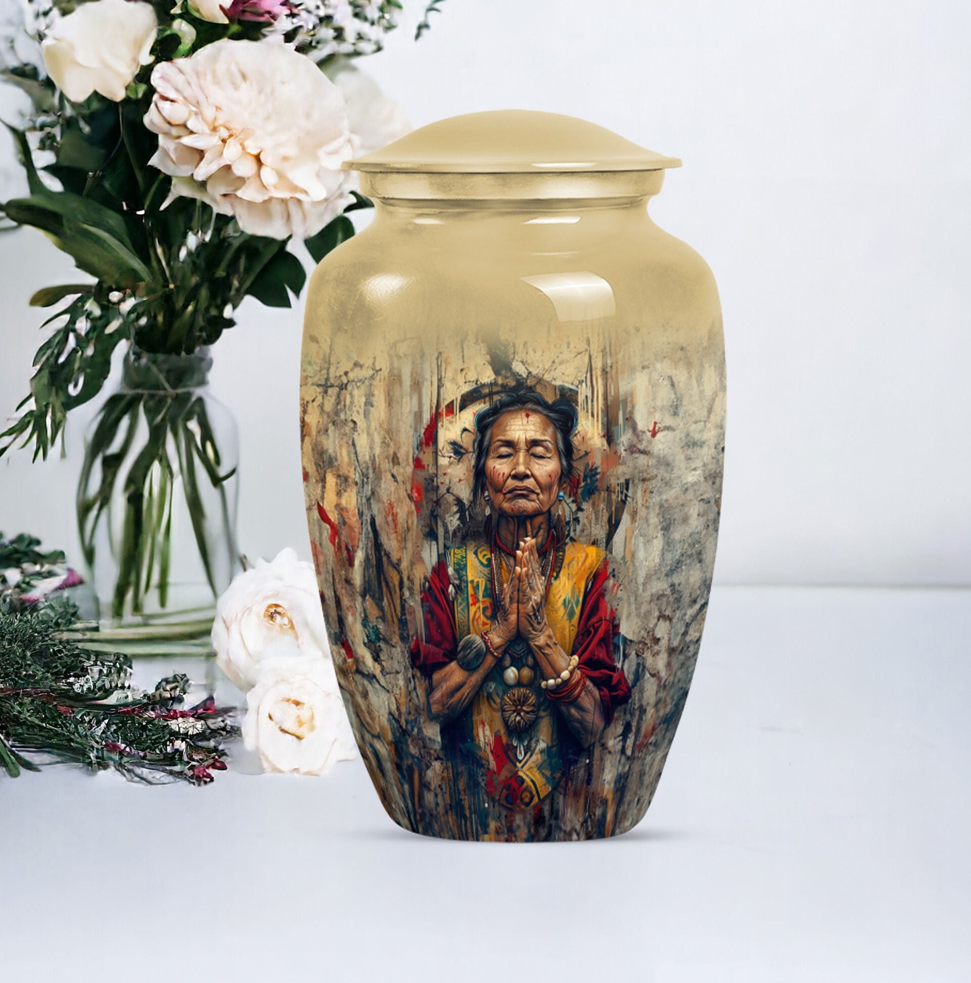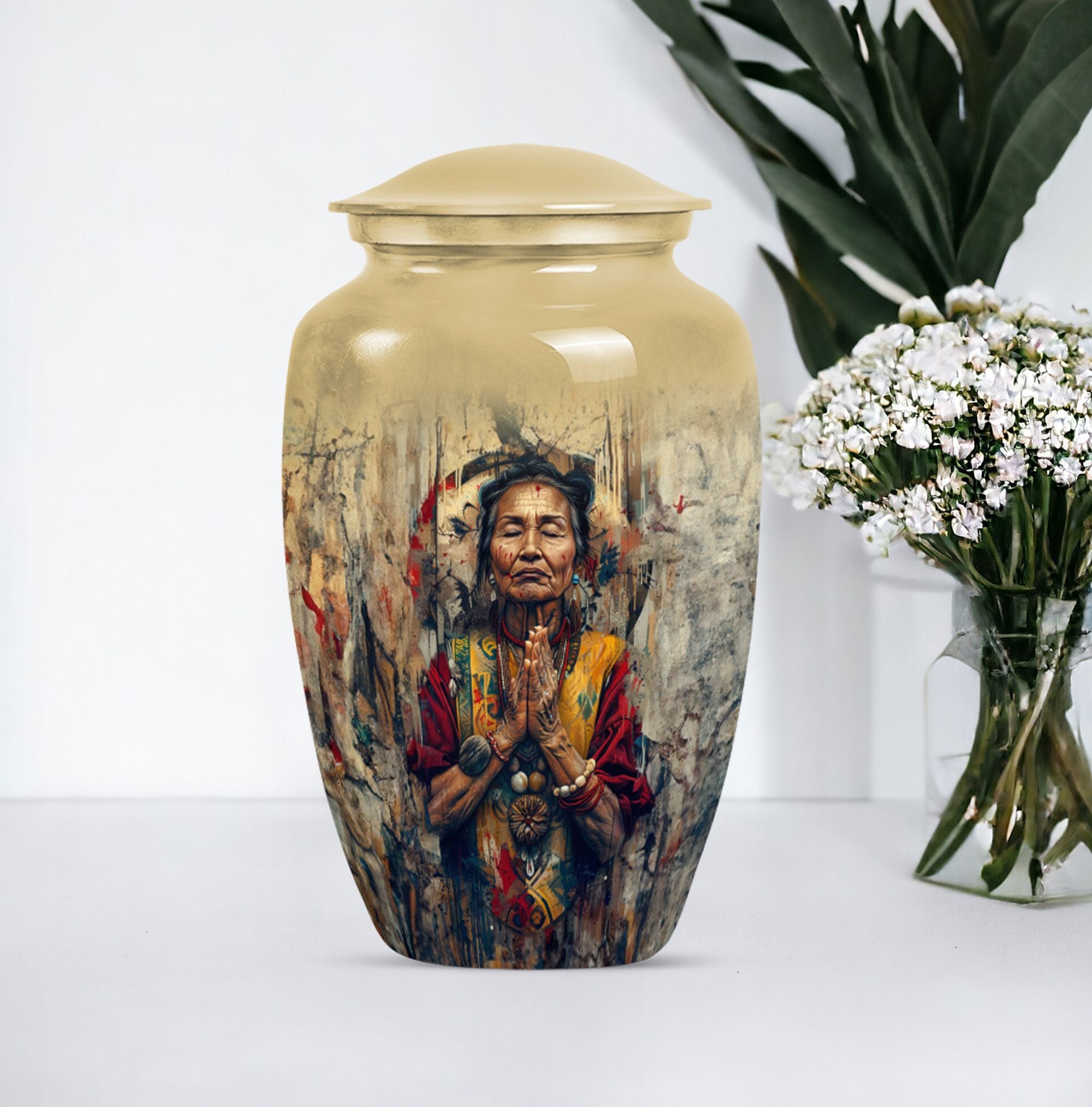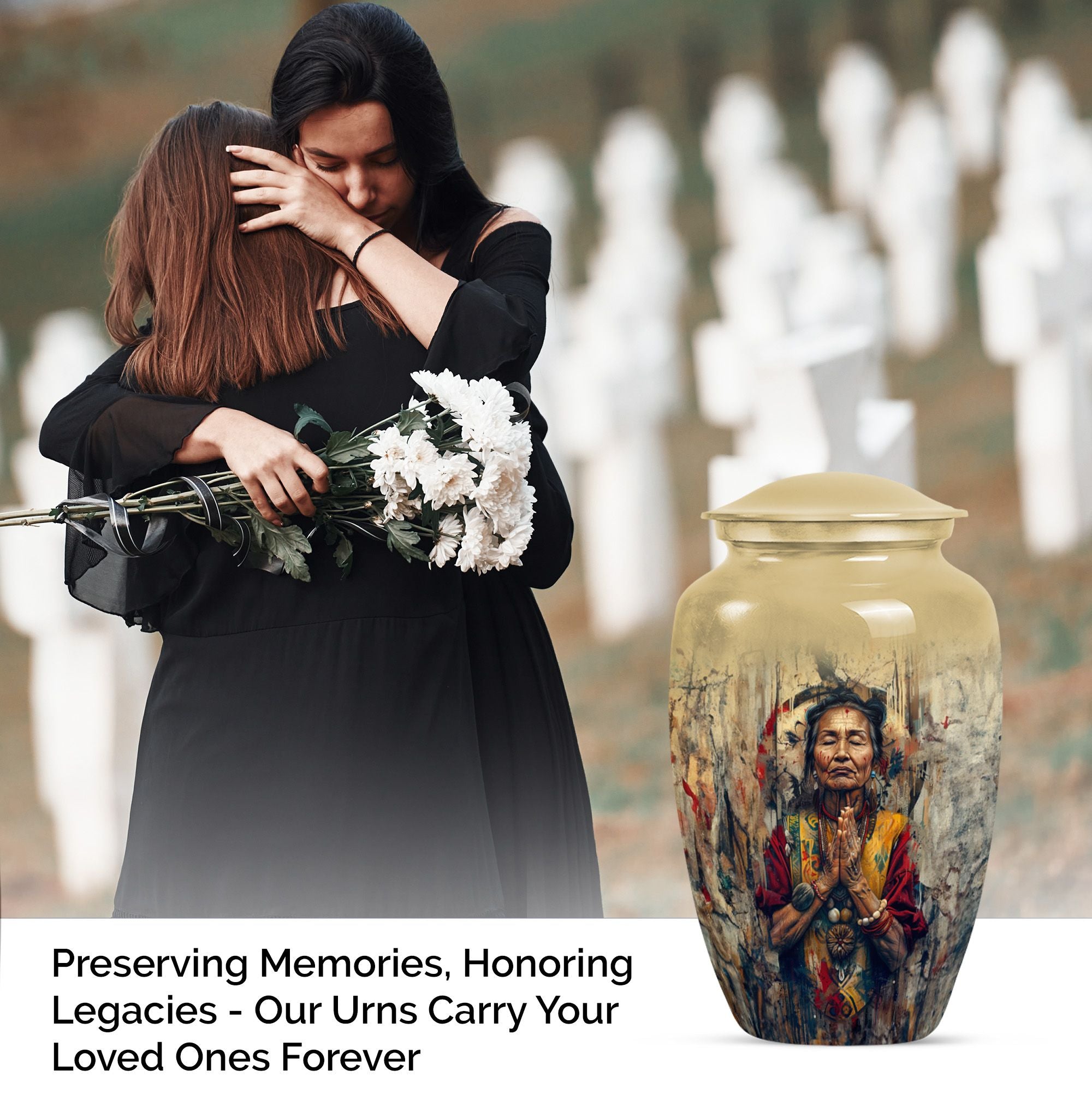 Honor your loved ones with a dignified final resting place with our Native American Urn. As part of our unique assortment of funeral adult urns for human ashes, it is a sculptural masterpiece that embodies an abstract theme. Crafted out of sturdy Aluminium, this Large Urn stands 10 inches tall and has a substantial weight of 3.3 pounds. Its substantial size allows it to hold 200 cubic inches of ashes. An exclusive addition to our offering of memorial urns, this urn retains a timeless charm with its classic urn silhouette. We provide you the option to personalize with engraved names to make it a cherished keepsake or an honorable tribute. Your purchase includes a luxurious velvet pouch for containment of ashes. Whether you're searching for 'memorial forever urns', 'urns for mom', or 'funeral urns for ashes', this classic piece delivers style and sentiment to your memories.