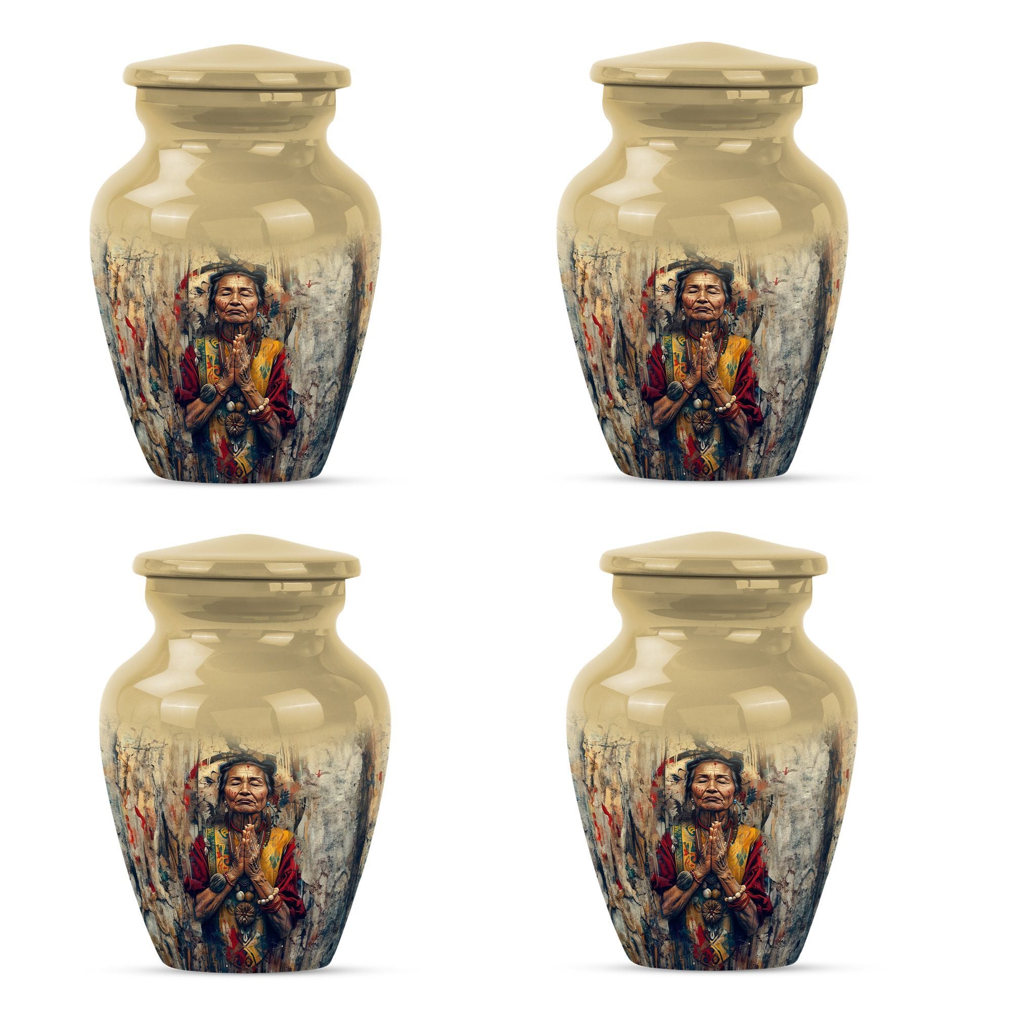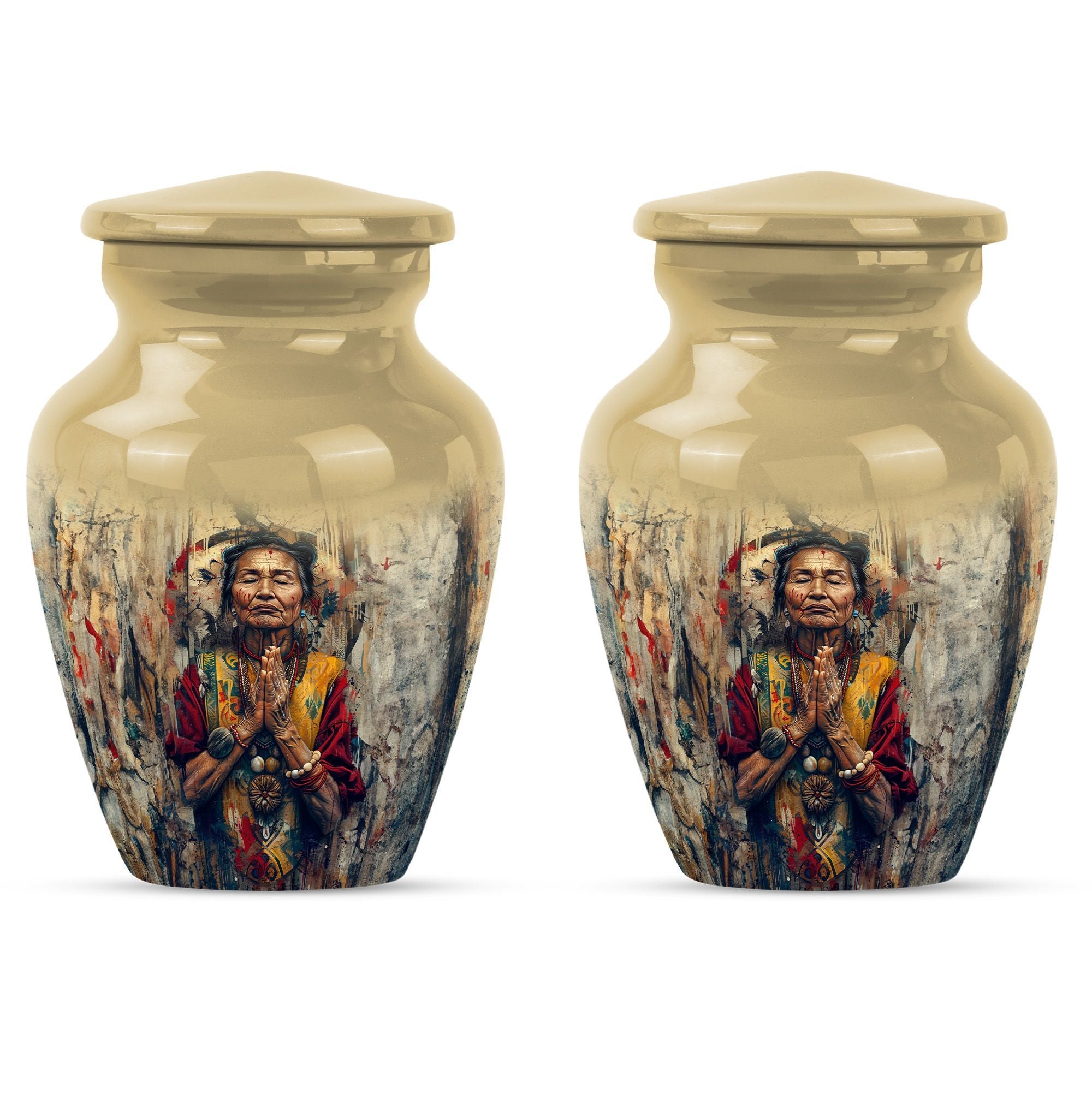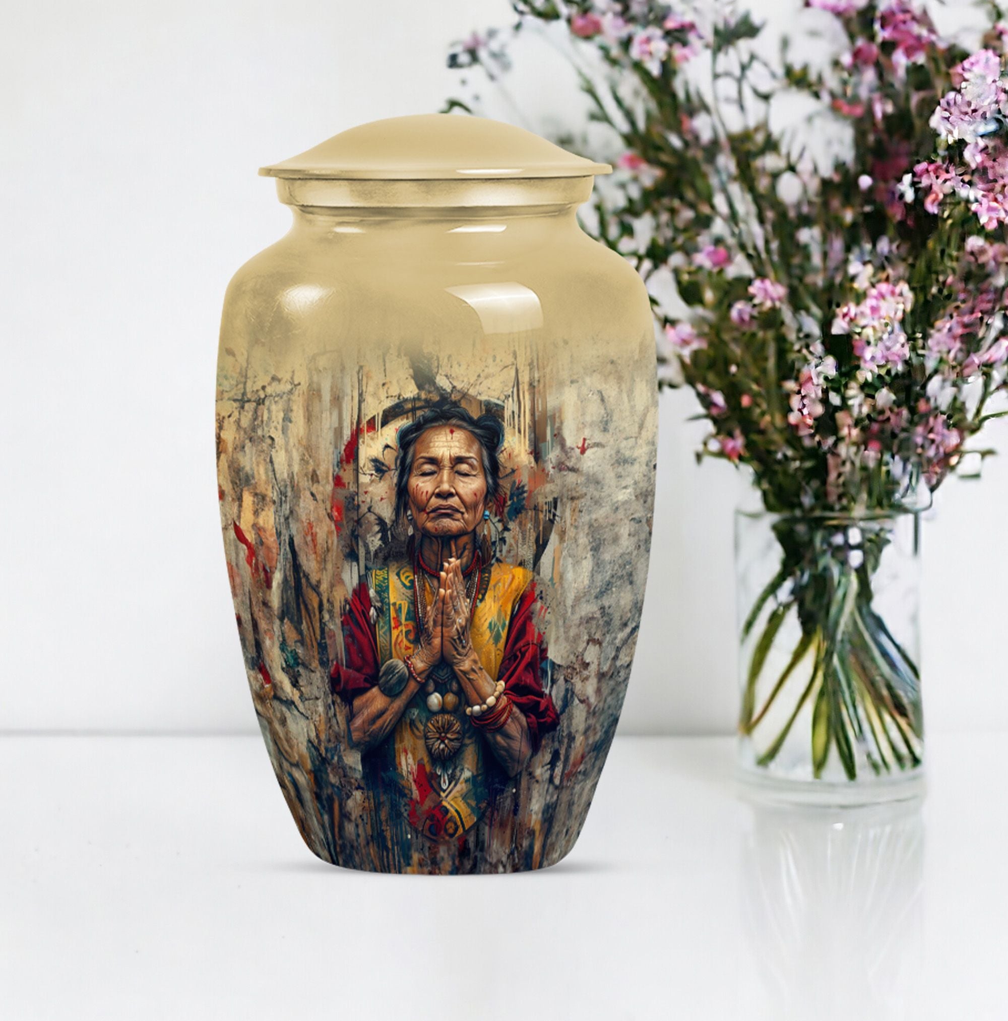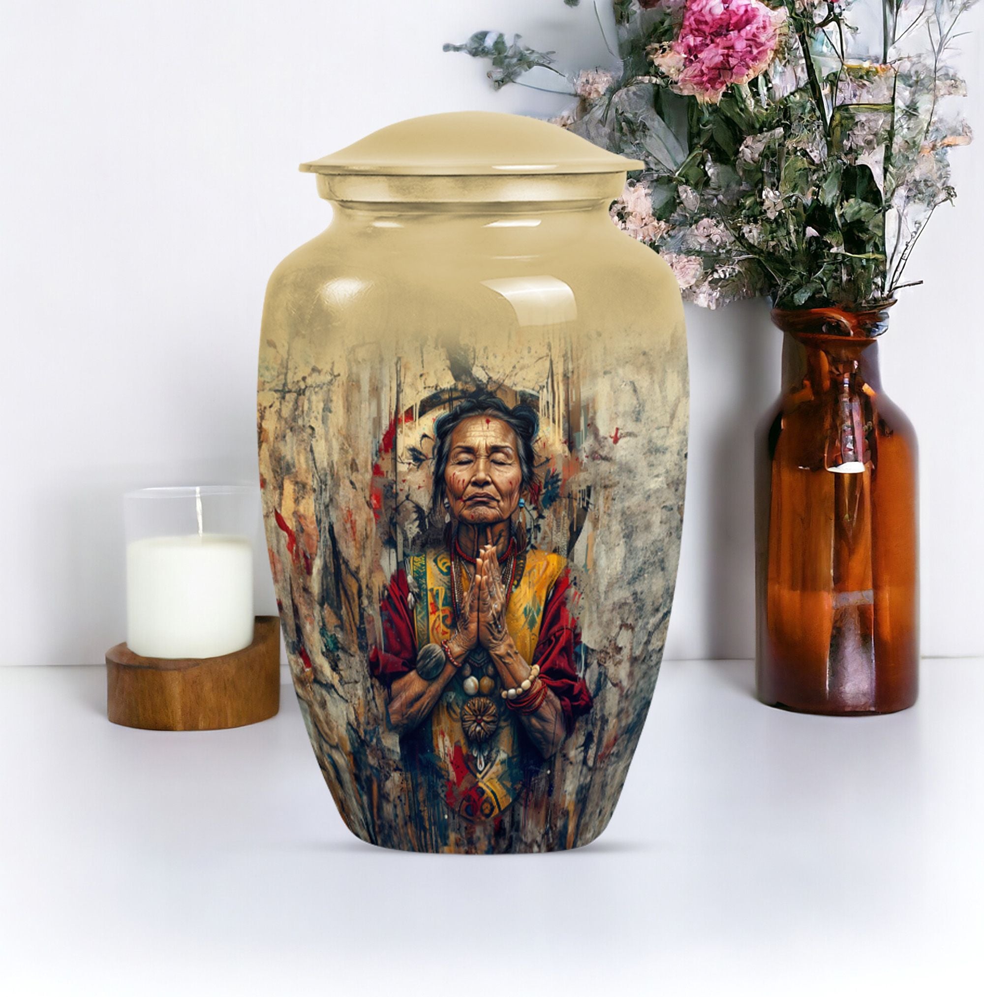 Honor your loved ones with a dignified final resting place with our Native American Urn. As part of our unique assortment of funeral adult urns for human ashes, it is a sculptural masterpiece that embodies an abstract theme. Crafted out of sturdy Aluminium, this Large Urn stands 10 inches tall and has a substantial weight of 3.3 pounds. Its substantial size allows it to hold 200 cubic inches of ashes. An exclusive addition to our offering of memorial urns, this urn retains a timeless charm with its classic urn silhouette. We provide you the option to personalize with engraved names to make it a cherished keepsake or an honorable tribute. Your purchase includes a luxurious velvet pouch for containment of ashes. Whether you're searching for 'memorial forever urns', 'urns for mom', or 'funeral urns for ashes', this classic piece delivers style and sentiment to your memories.