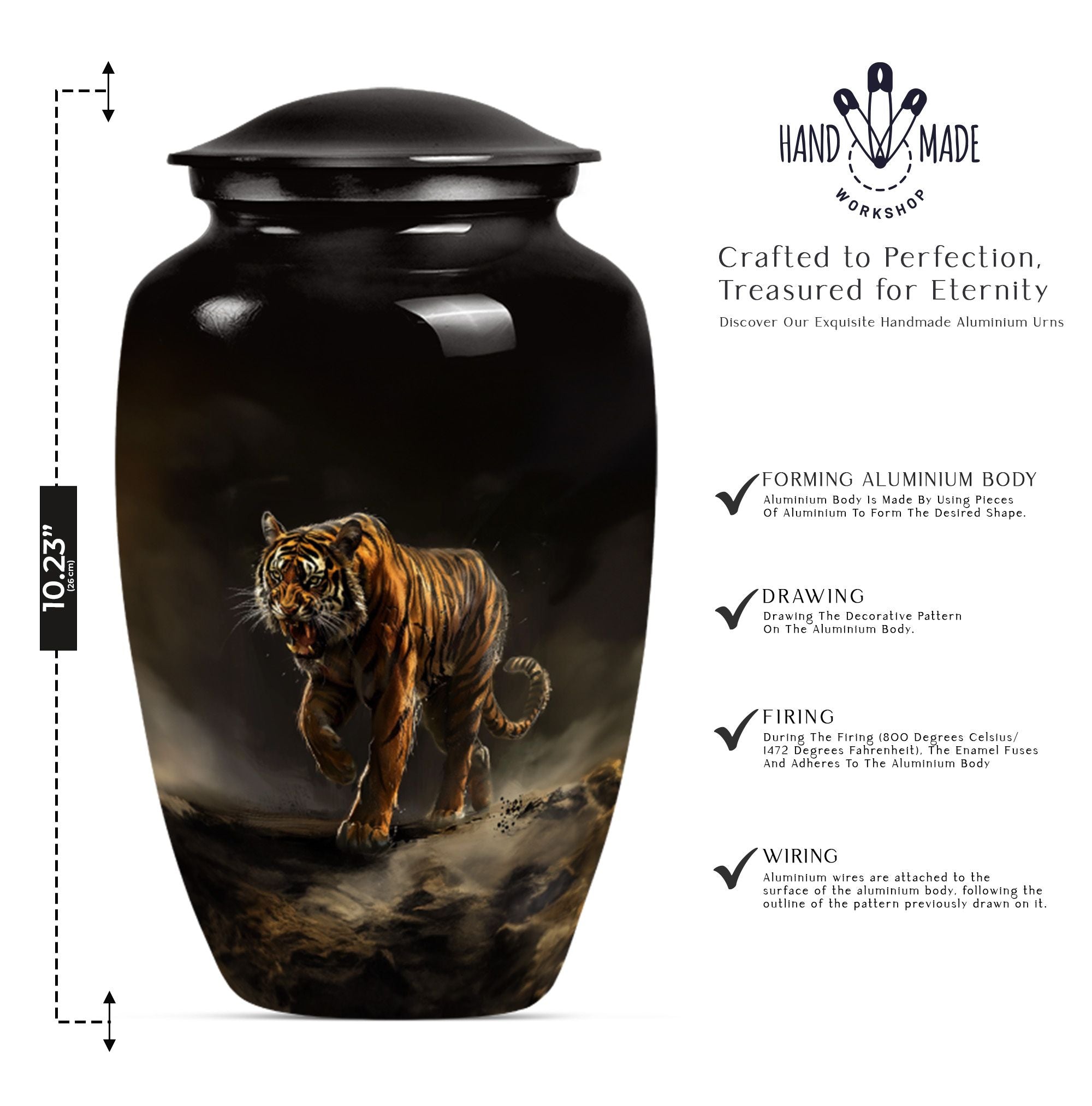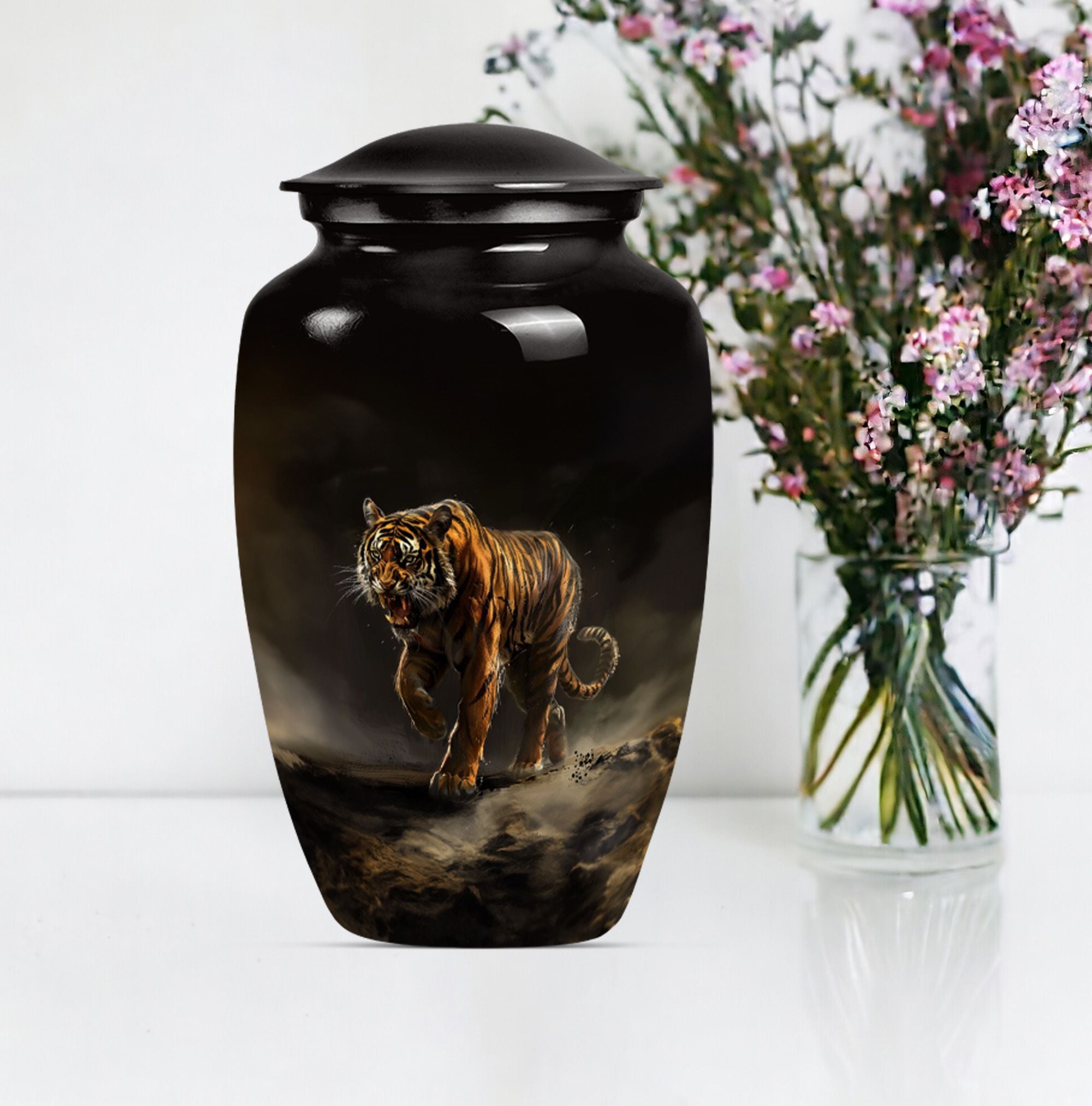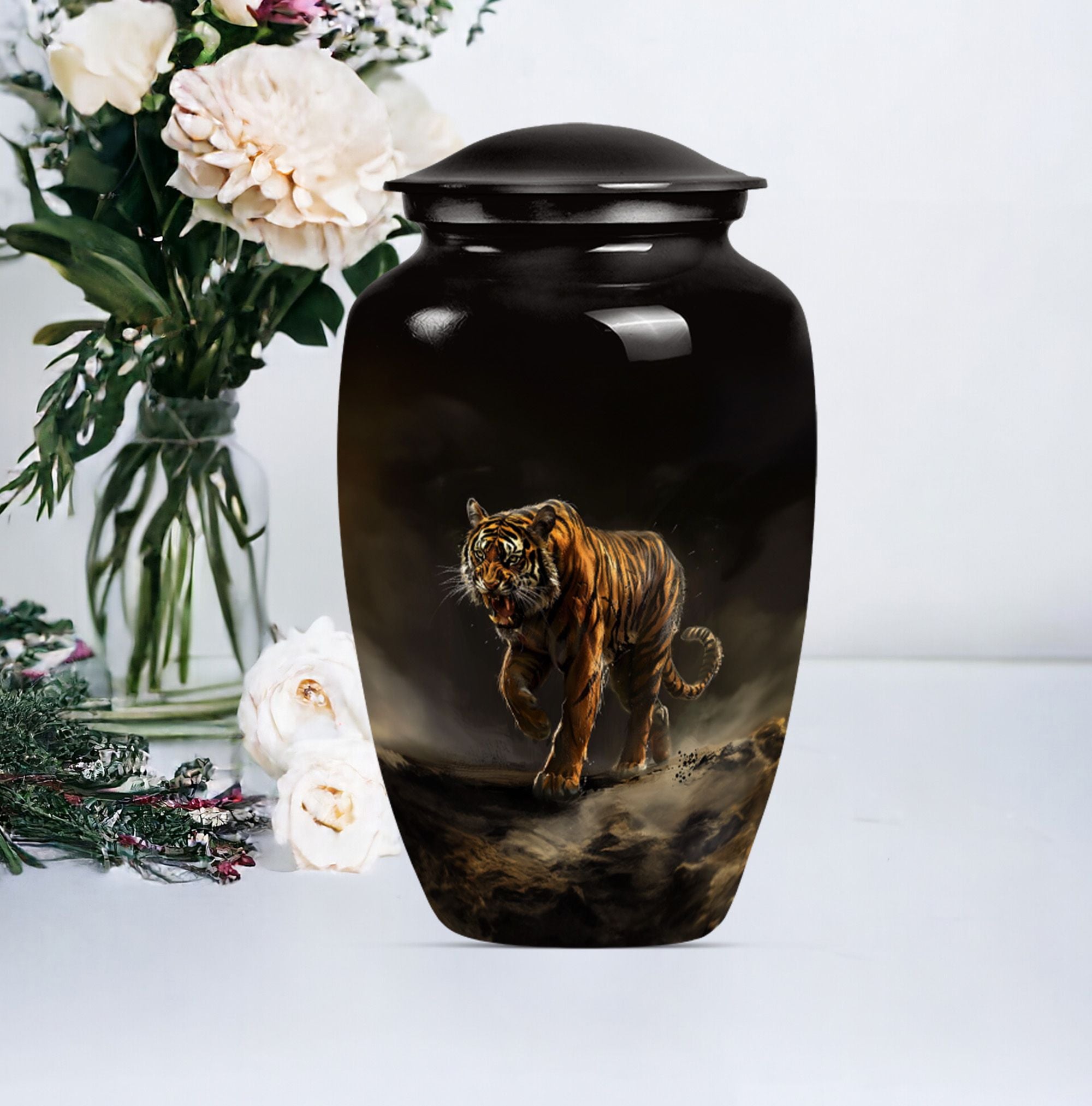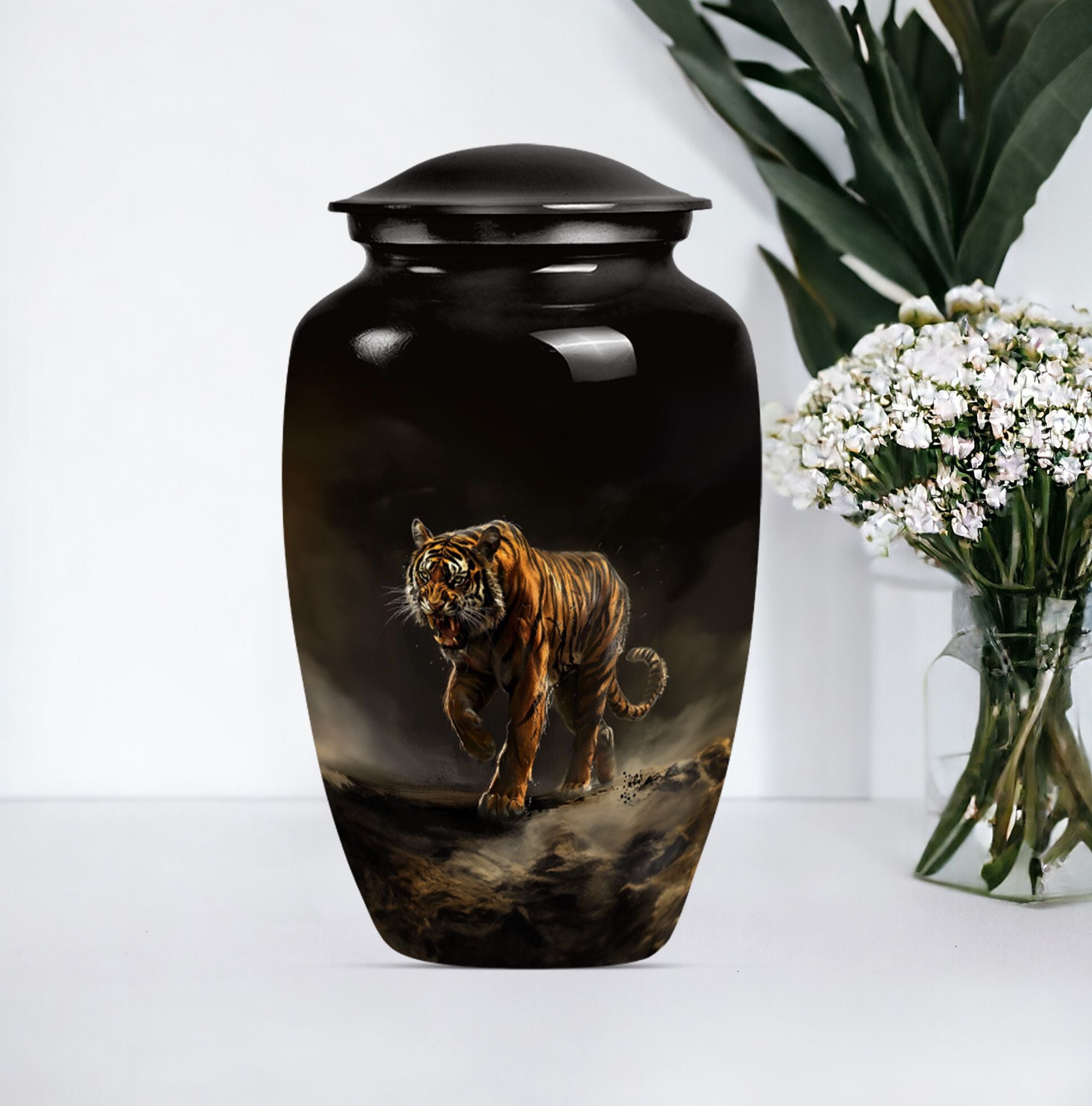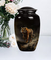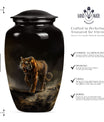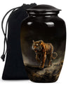Presenting our breathtaking 'Tiger Urn,' distinctive in the assortment of funeral cremation urns for women, specially designed for those in search of subtle elegance. Fashioned from high-quality aluminium, this Classic Urn exhibits a Flower Theme, capturing a sense of tranquility. Standing tall at 10 inches and weighing 3.3 pounds, this large urn for ashes can conveniently hold up to 200 cubic inches of ashes. The urn's size and capacity make it a perfect memorial urn for your beloved. It comes with a velvet pouch to provide dignified containment of the ashes. To make your urn truly unique, we offer the option to Personalize with engraved names, adding an additional layer of intimacy to this already special piece. Garb this sophisticated urn and let your cherished memories live on forever. Ideal search terms include memorial large urns for ashes, ash urn, urn shaped, and funeral urns for adult ashes.