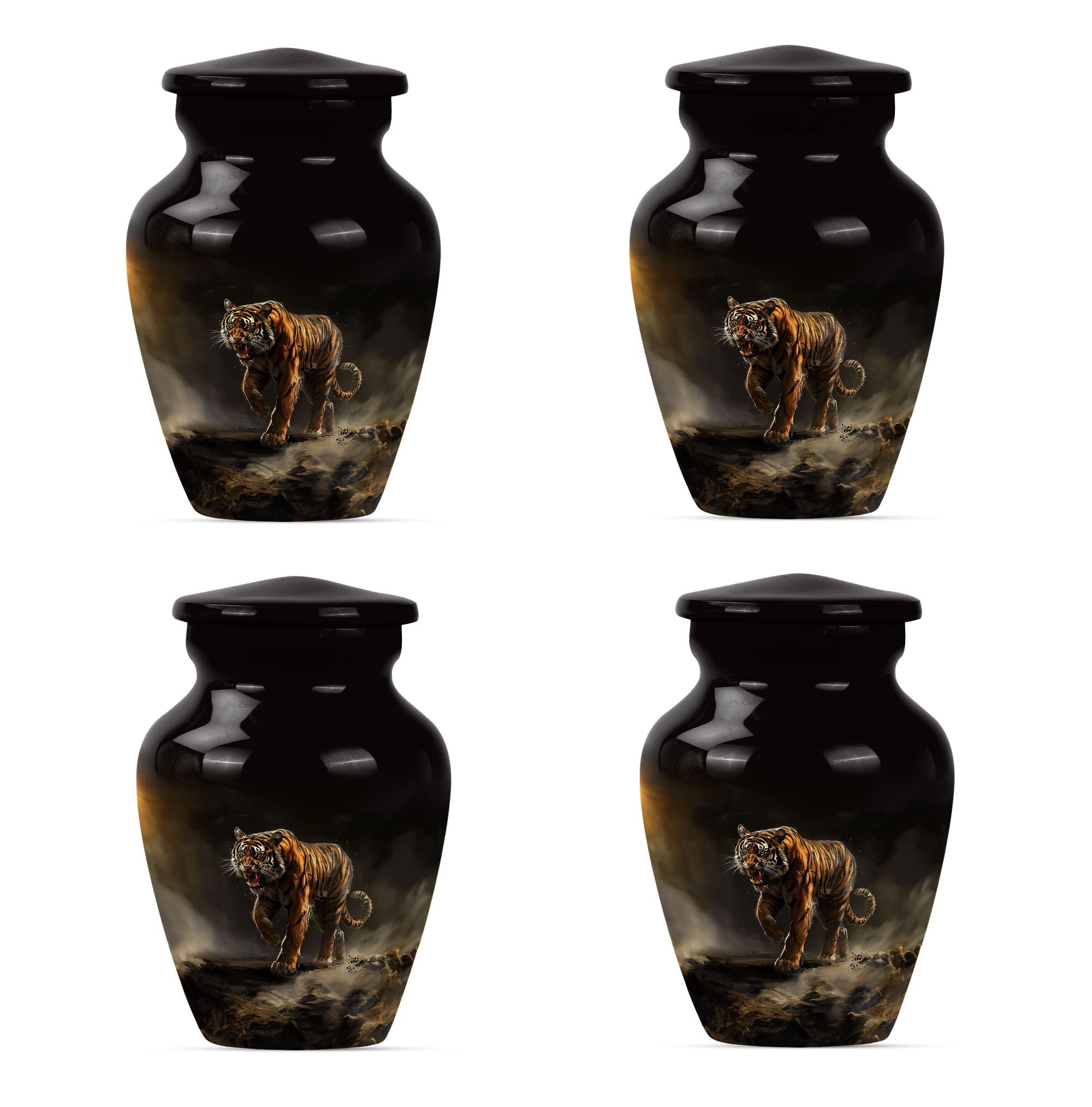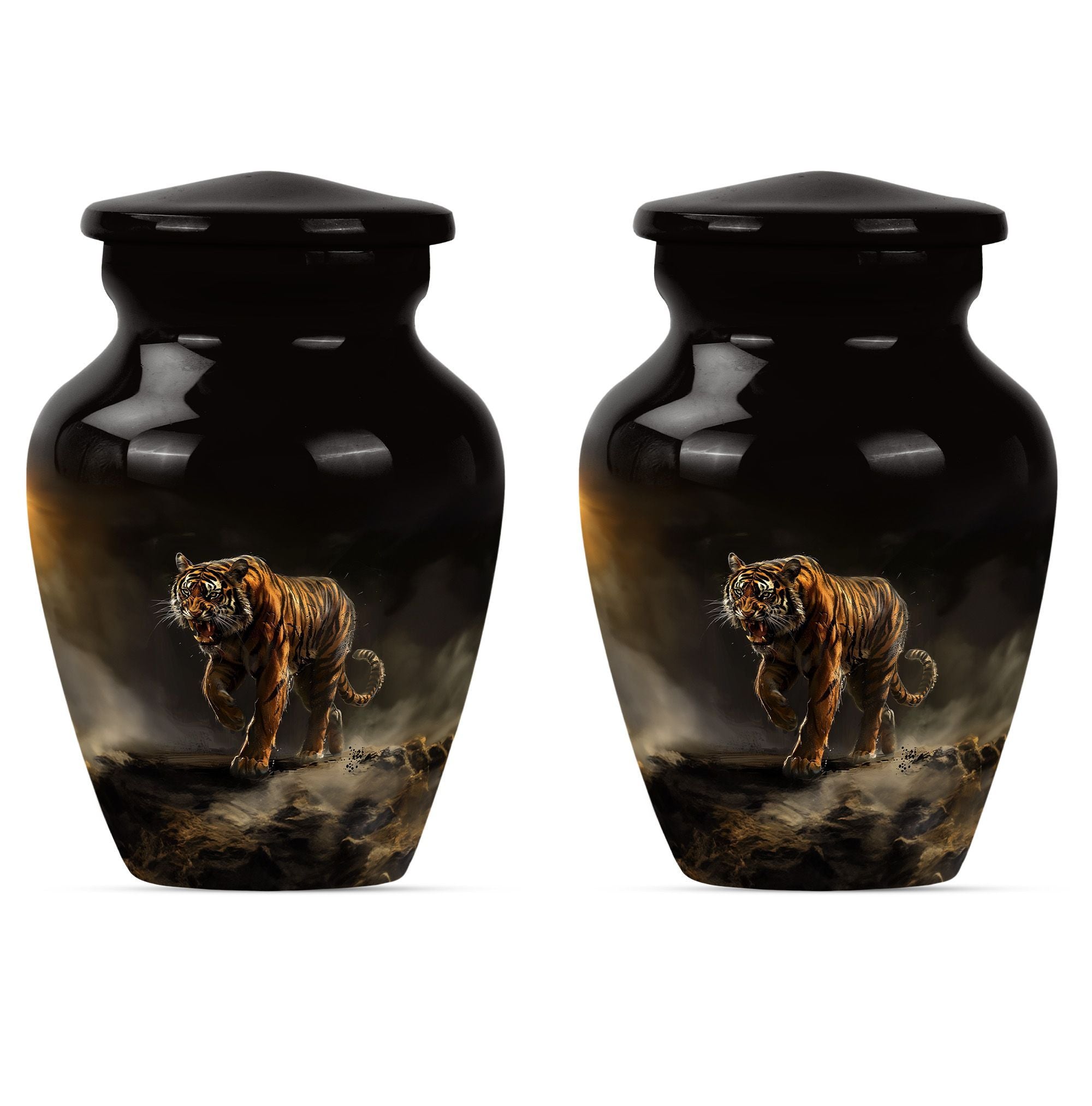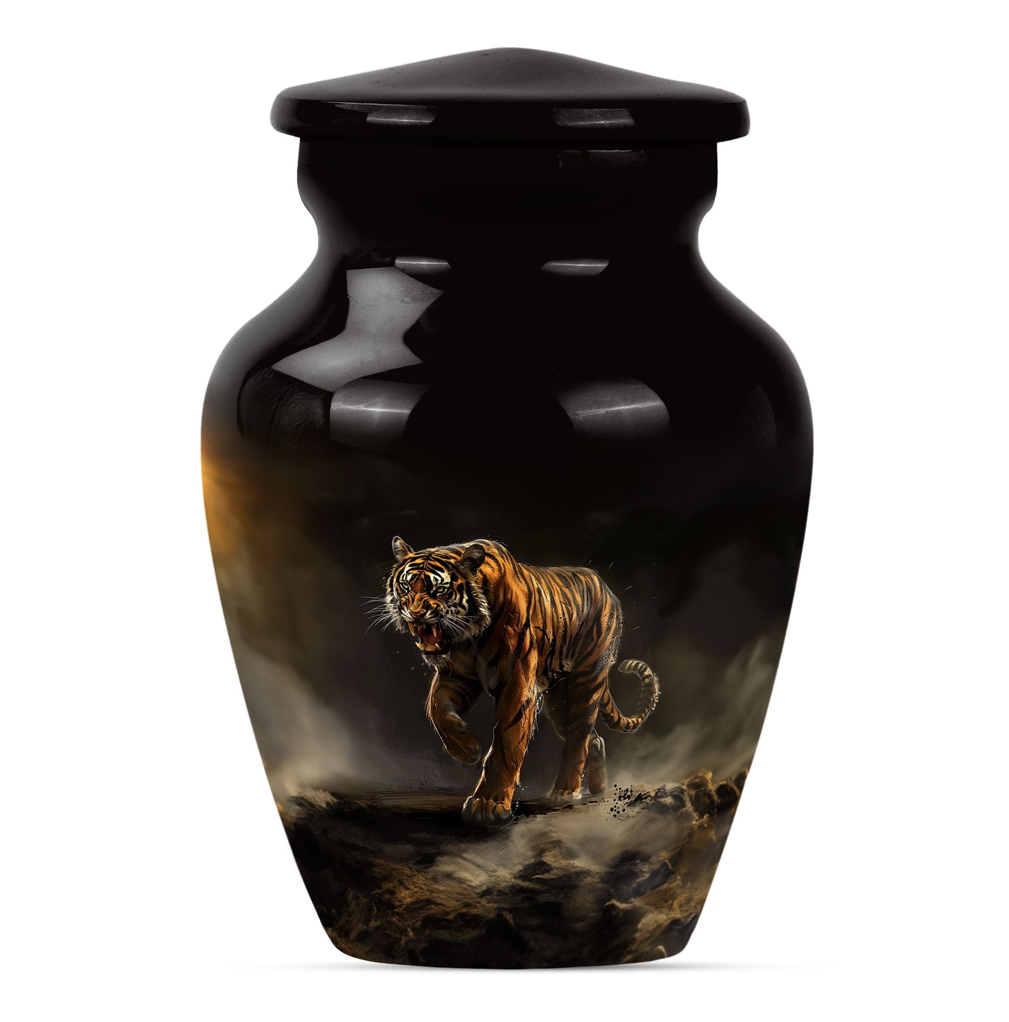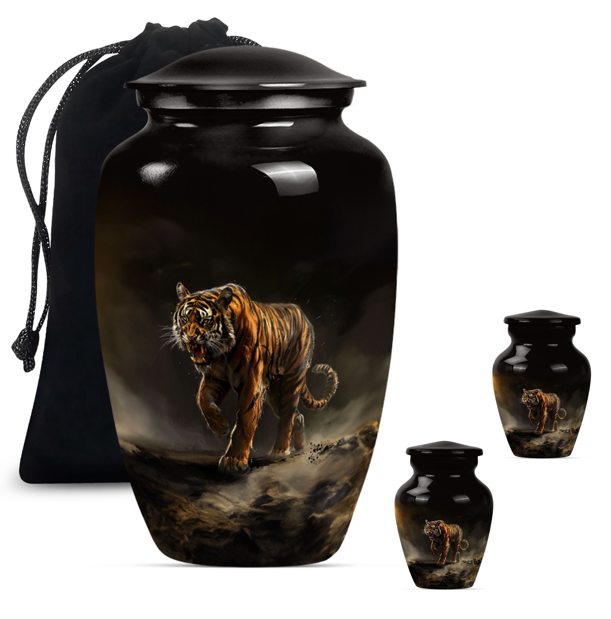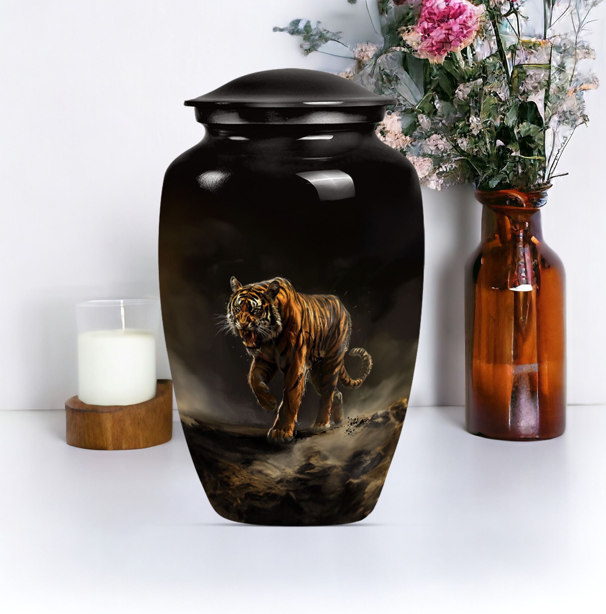 Presenting our breathtaking 'Tiger Urn,' distinctive in the assortment of funeral cremation urns for women, specially designed for those in search of subtle elegance. Fashioned from high-quality aluminium, this Classic Urn exhibits a Flower Theme, capturing a sense of tranquility. Standing tall at 10 inches and weighing 3.3 pounds, this large urn for ashes can conveniently hold up to 200 cubic inches of ashes. The urn's size and capacity make it a perfect memorial urn for your beloved. It comes with a velvet pouch to provide dignified containment of the ashes. To make your urn truly unique, we offer the option to Personalize with engraved names, adding an additional layer of intimacy to this already special piece. Garb this sophisticated urn and let your cherished memories live on forever. Ideal search terms include memorial large urns for ashes, ash urn, urn shaped, and funeral urns for adult ashes.