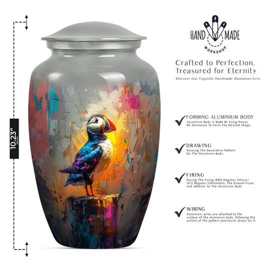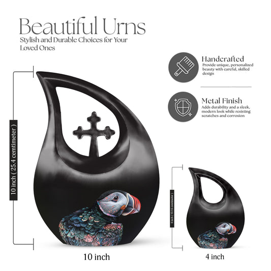 Our collection of puffin-themed cremation urns features artistic renderings of puffins perched on cliffs, in flight, or gazing calmly into the distance. Each urn is handcrafted from premium aluminum, ensuring durability and a respectful resting place for ashes. These bird cremation urns are ideal for families seeking a memorial that blends gentle symbolism with lasting strength.