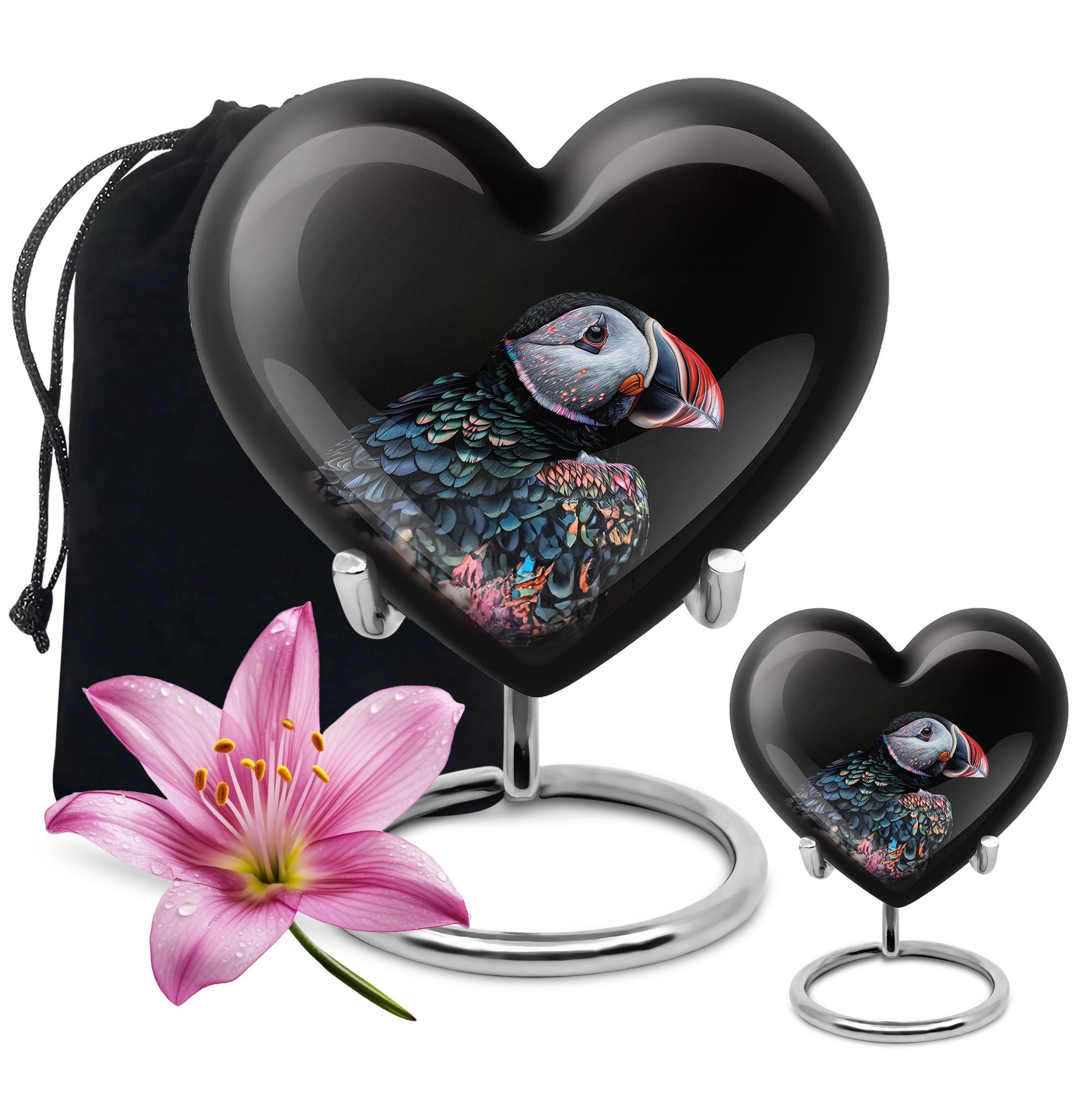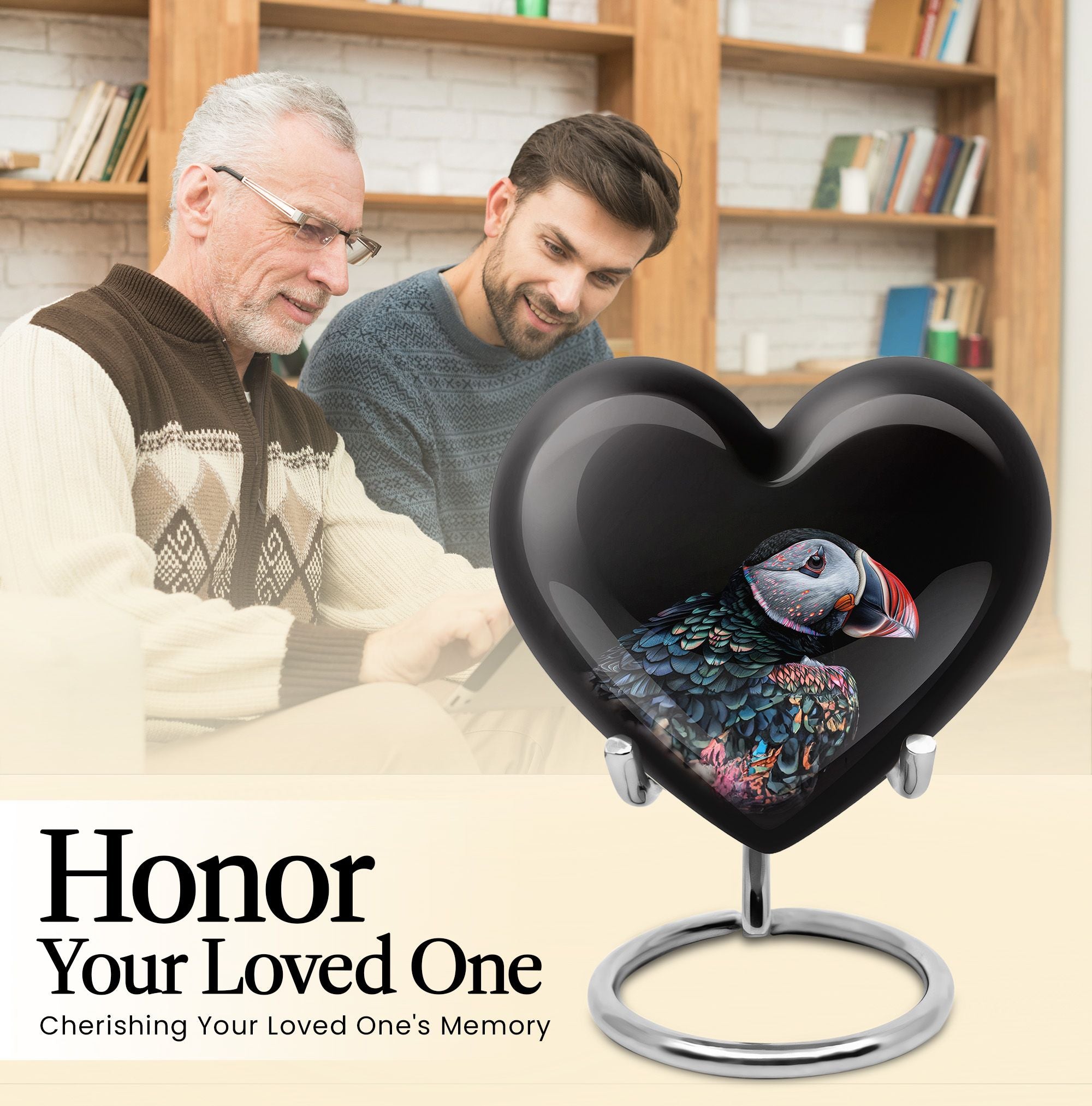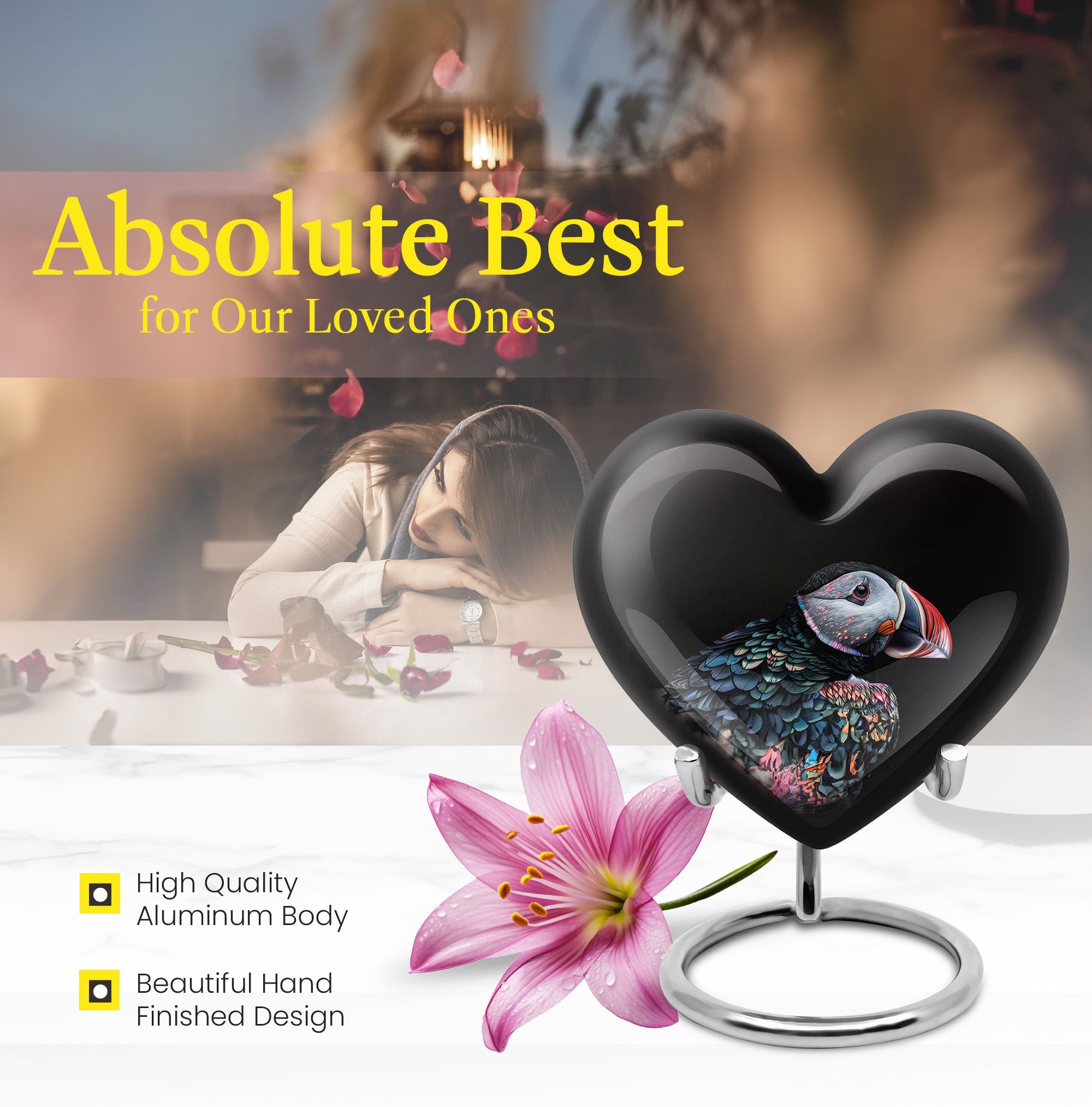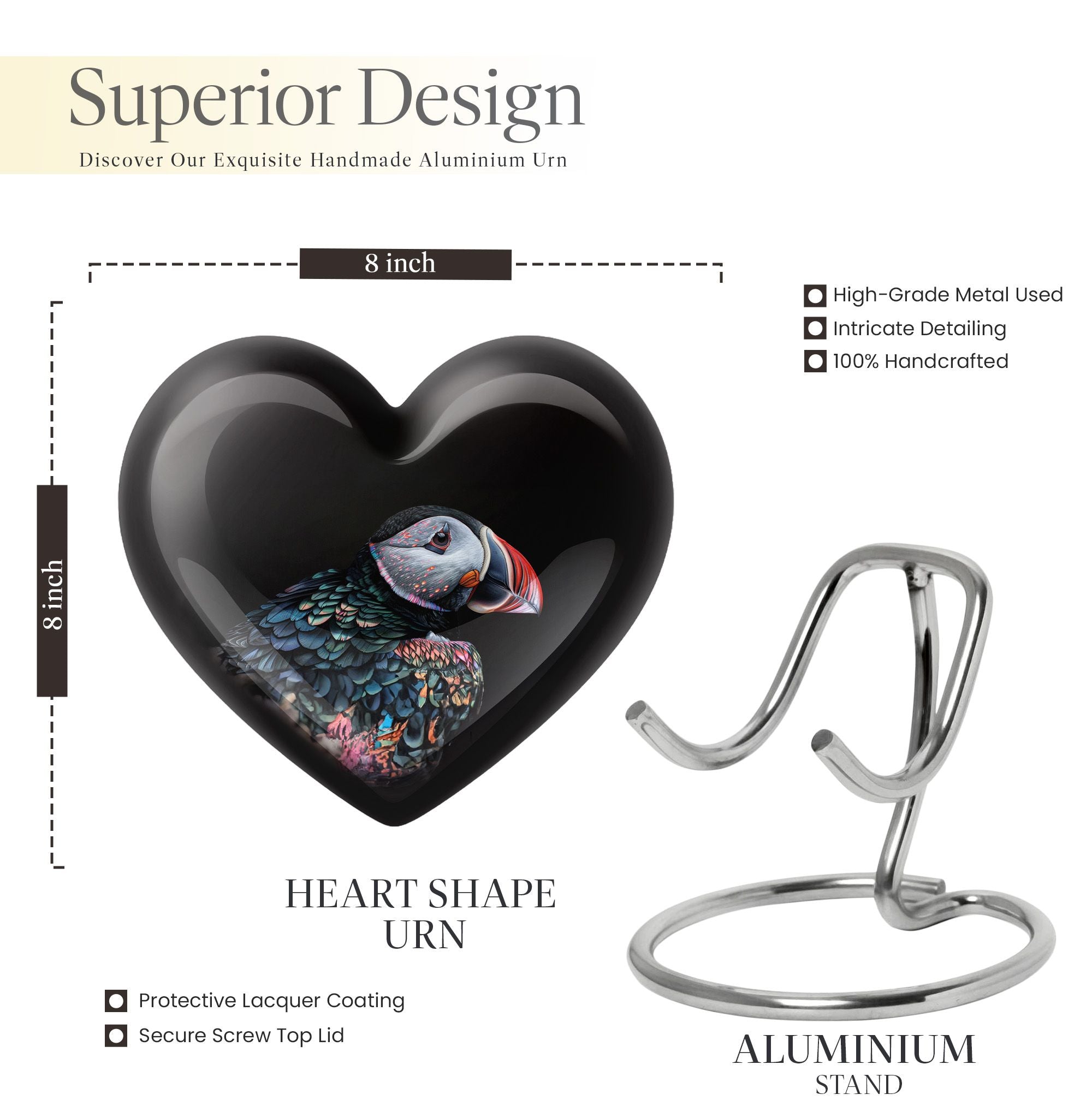 Presenting the Puffin Bird Urn, an exceptional choice for adults and seniors desiring a heartfelt, dignified vessel as a funeral urn for mom or loved ones. Defined by its Puffin Bird theme and heart shape, it perfectly embodies love and affection. This 10-inch large urn, crafted from robust aluminium, is timeless, enduring, and weighs just 3.3 pounds for comfortable handling. It can accommodate up to 200 cubic inches of ash, ensuring the memories of the departed peacefully rest. The urn comes packaged with a velvet pouch, adding an extra layer of reverence while containing the ashes. Benefit from the optional customization feature to make it personal. Personalize it by adding engraved names of the departed, adding a distinctive, commemorative touch to this cremation urn. Avoiding clichéd jargon, this urn reflects the softness yet strength of a puffin bird, simultaneously grand and touching. For memorial adult urn choices, this human urn for ash adult subtly bridges the gap between tribute and art, making it more than just earns for ashes but a symbol of remembrance. Consider these custom cremation urns, and you'll add a unique, loving testament to your loved one's life.