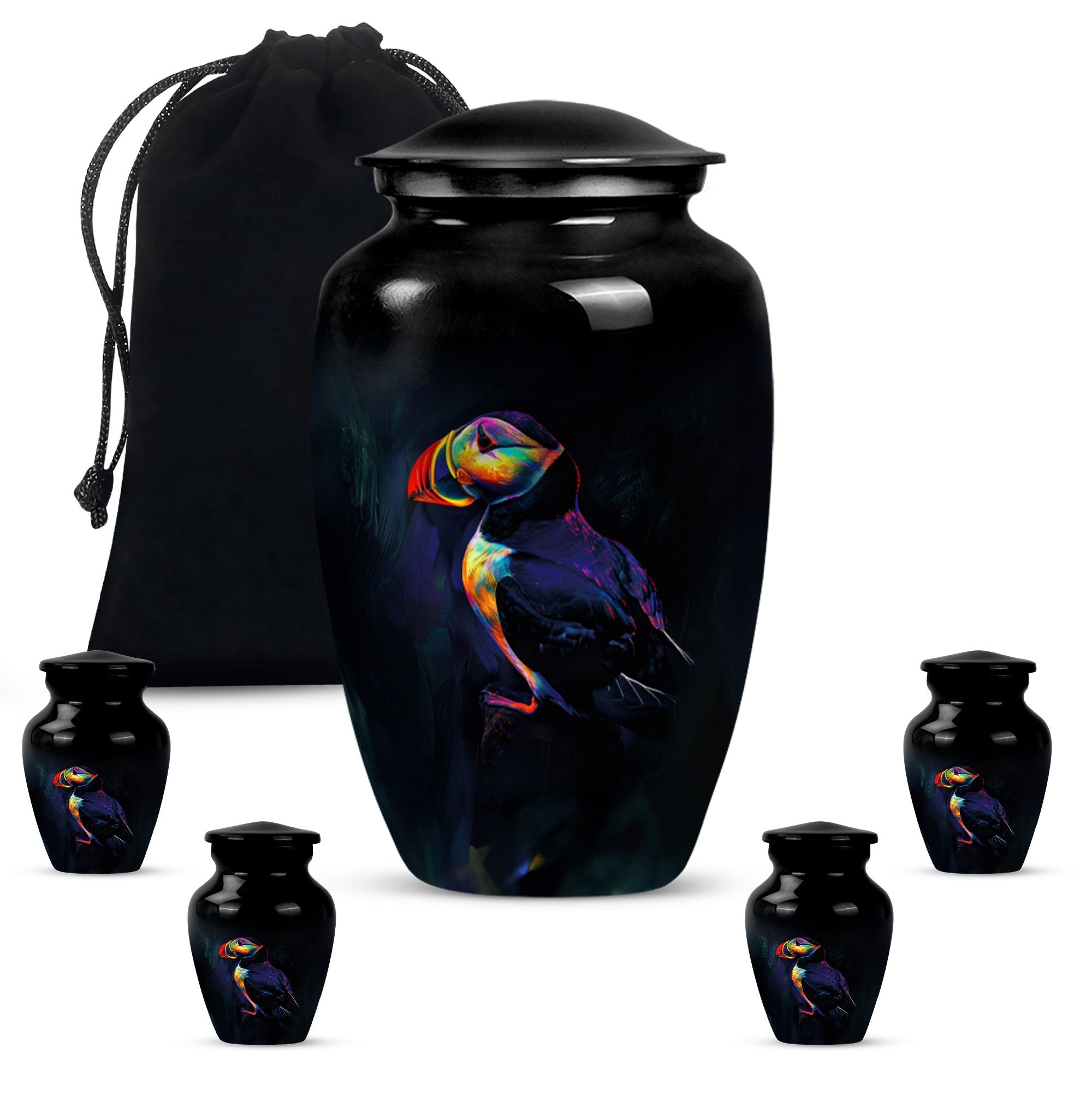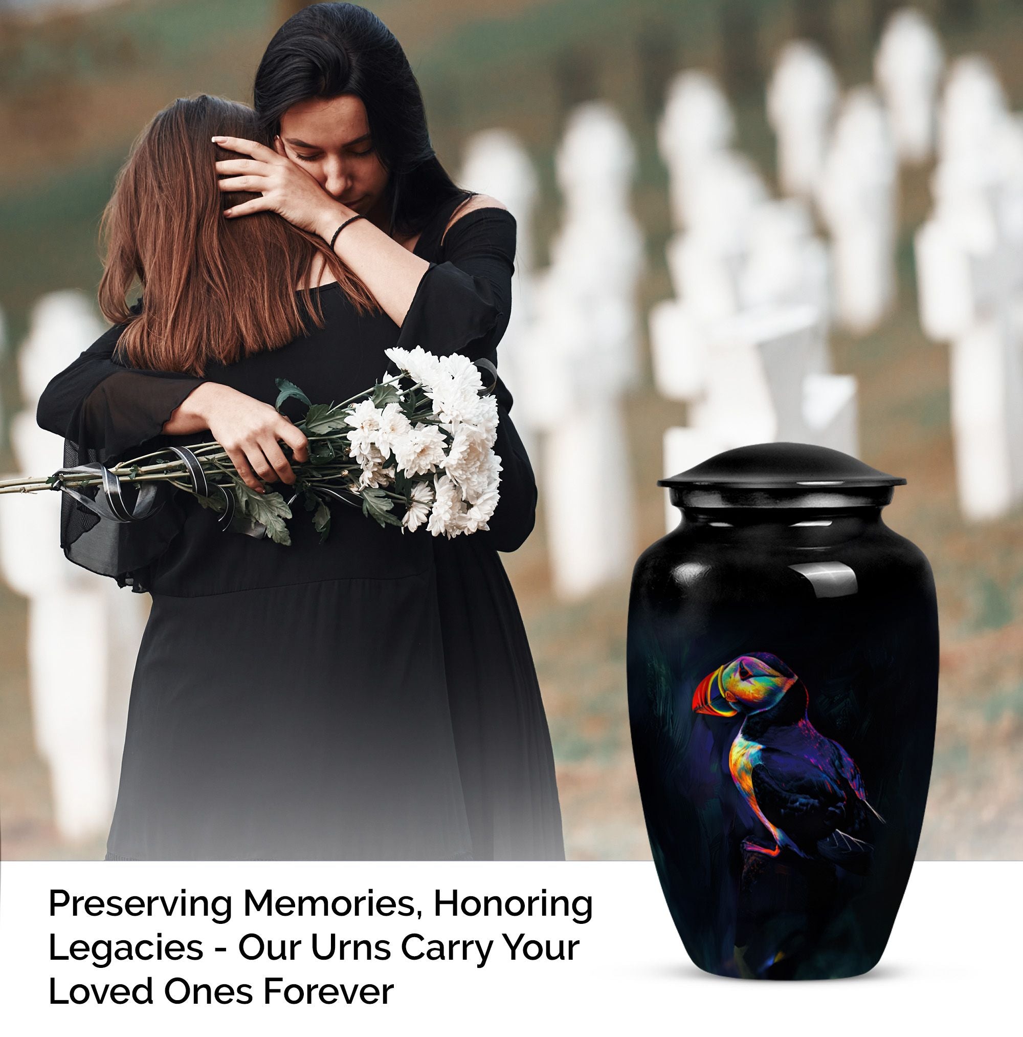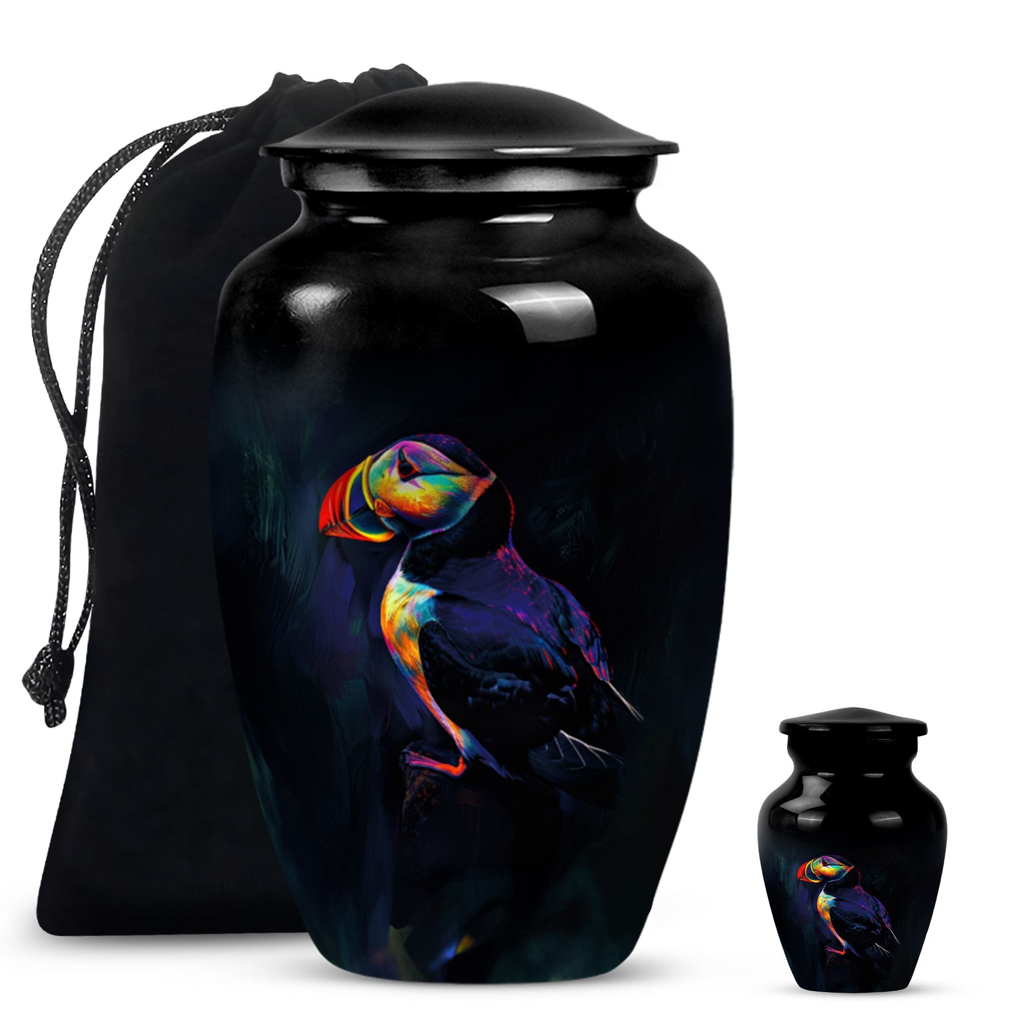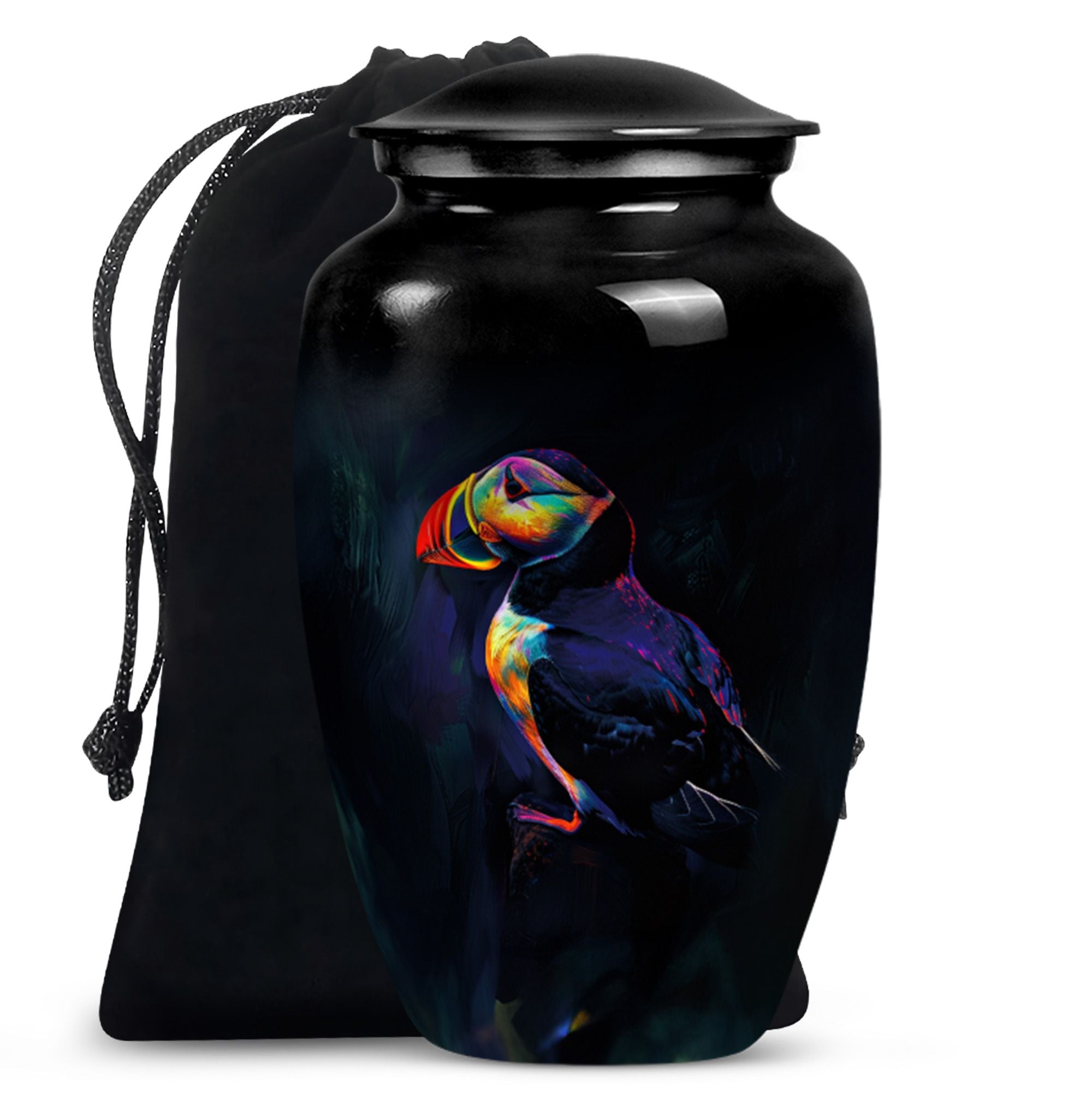 Masterfully designed and exquisitely handcrafted, this Puffin bird Urn pays tribute to the indomitable spirit of your loved ones and enables you to keep their treasured ashes close. Crafted from robust aluminum, this 10-inch, weighing 3.3 pounds, cremation urn is not your ordinary memorial large urn; it brings a unique abstract appeal that artful souls will appreciate. With a capacity of 200 cubic inches, it's a fitting memorial urn for the women who've shaped your life. Make it personal by adding engraved names, a tribute that stands the test of time. Our package comes complete with a velvet pouch for the containment of ashes - because we understand the immense value of gentle care in this time of remembrance. From Puffin bird Urn to Handcrafted Urns for Artistic Souls, make this an exemplary piece of your memorial ceremony supplies. Please note, ashes urn for adults may vary in appearance due to its handcrafted nature.