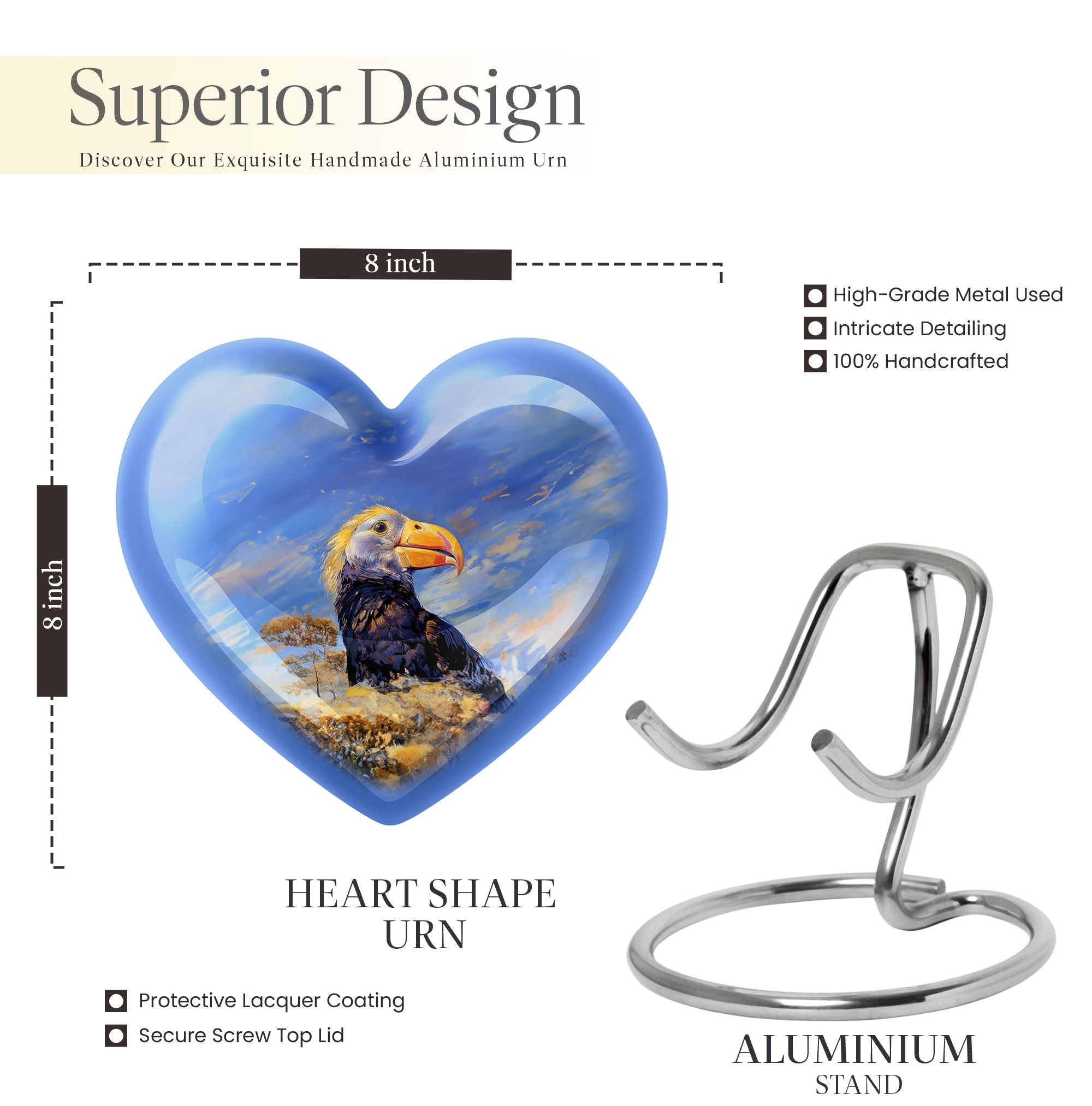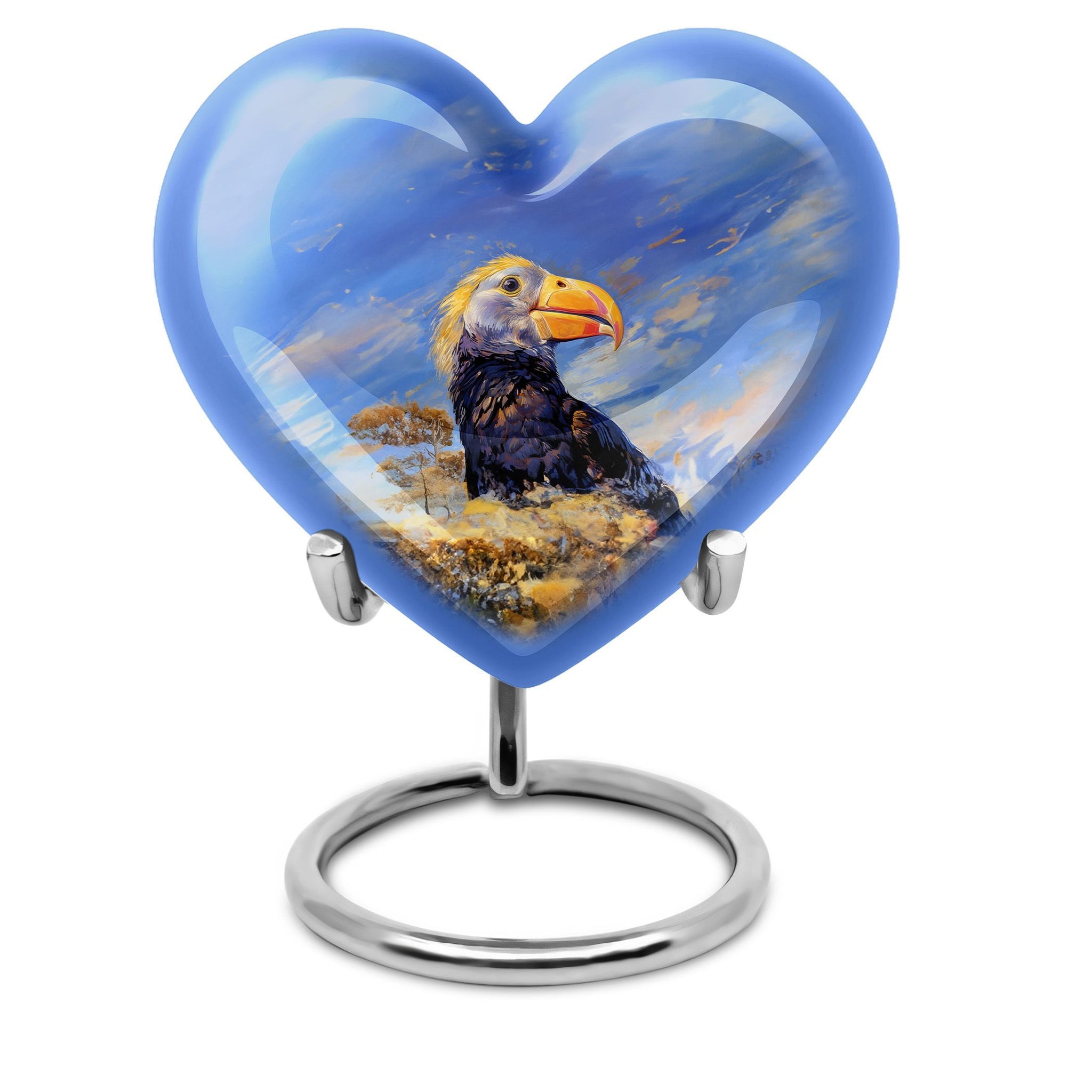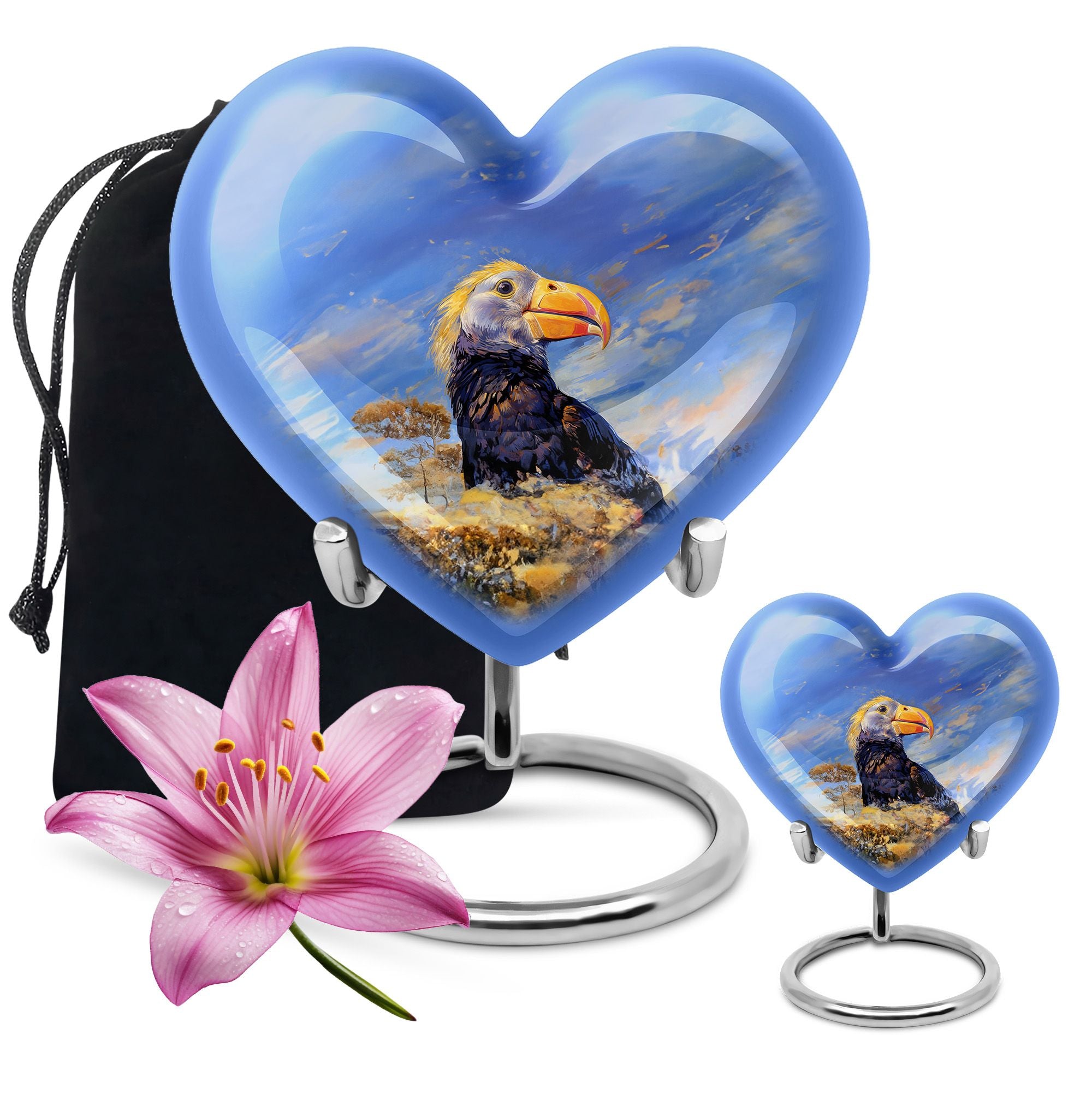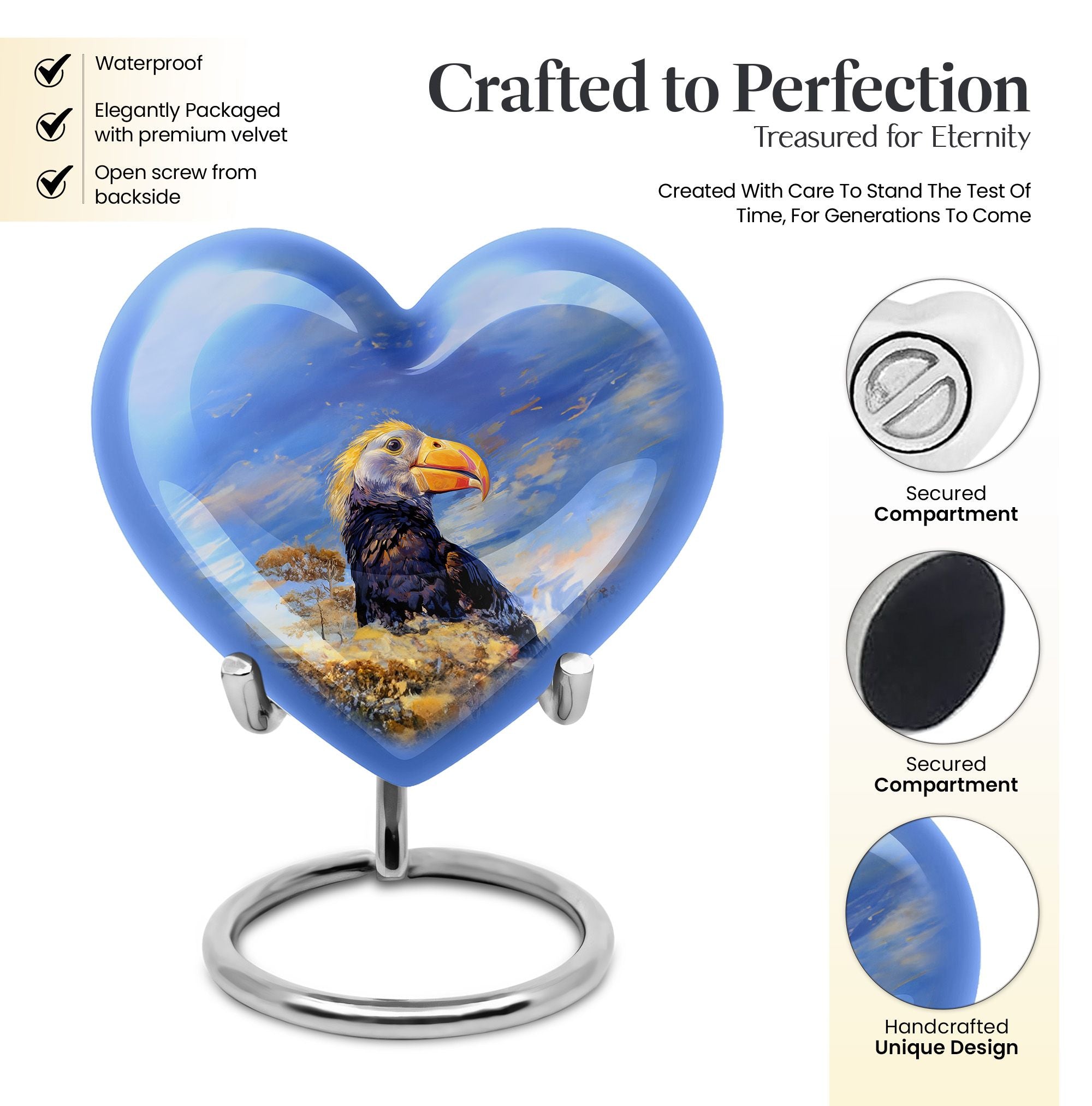 Discover a unique way to commemorate your loved ones with our Puffin Bird Urn, a remarkable choice in the category of memorial urns. Particularly designed for human ashes, it offers a thoughtful composition to hold the remnants of your dear ones. Crafted from high-grade Aluminium, it measures 10 inches in height, embodying an abstract theme in its heart-shape functionality. The urn's impressive capacity of 200 cubic inches comfortably accommodates the ashes, while the durable construction ensures long-lasting preservation. This 3.3-pound urn comes with a velvet pouch for the containment and safeguarding of ashes. One of the major highlights is the customization feature. This allows you to personalize the urn with engraved names, adding a touch of exclusivity. Regardless of being an adult or elder, if you are seeking large urns for cremation or burial purposes, our Puffin Bird Urn is an excellent choice. Notably, it doesn't just serve as an urn but a symbol of memory and love that endures time.