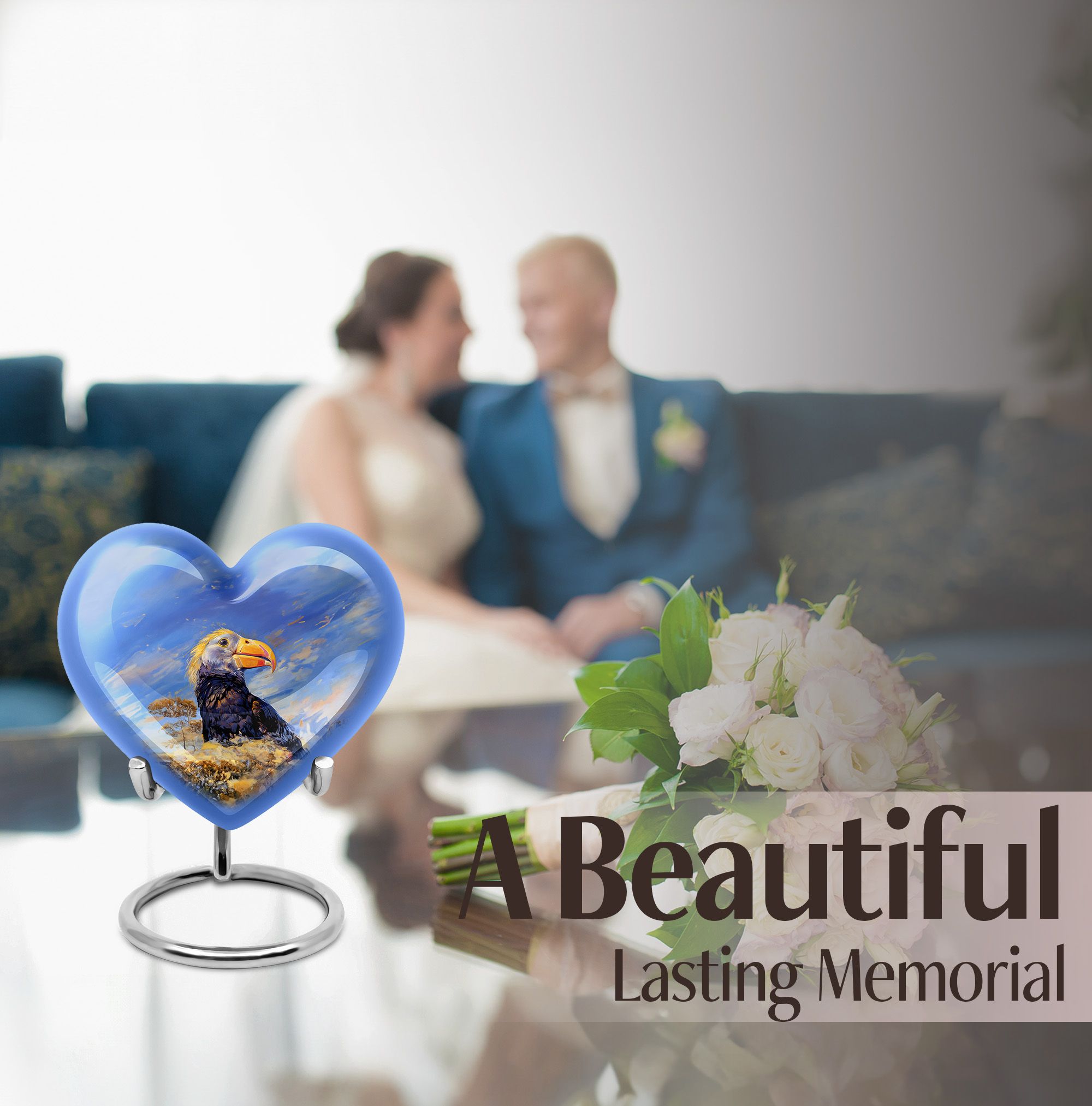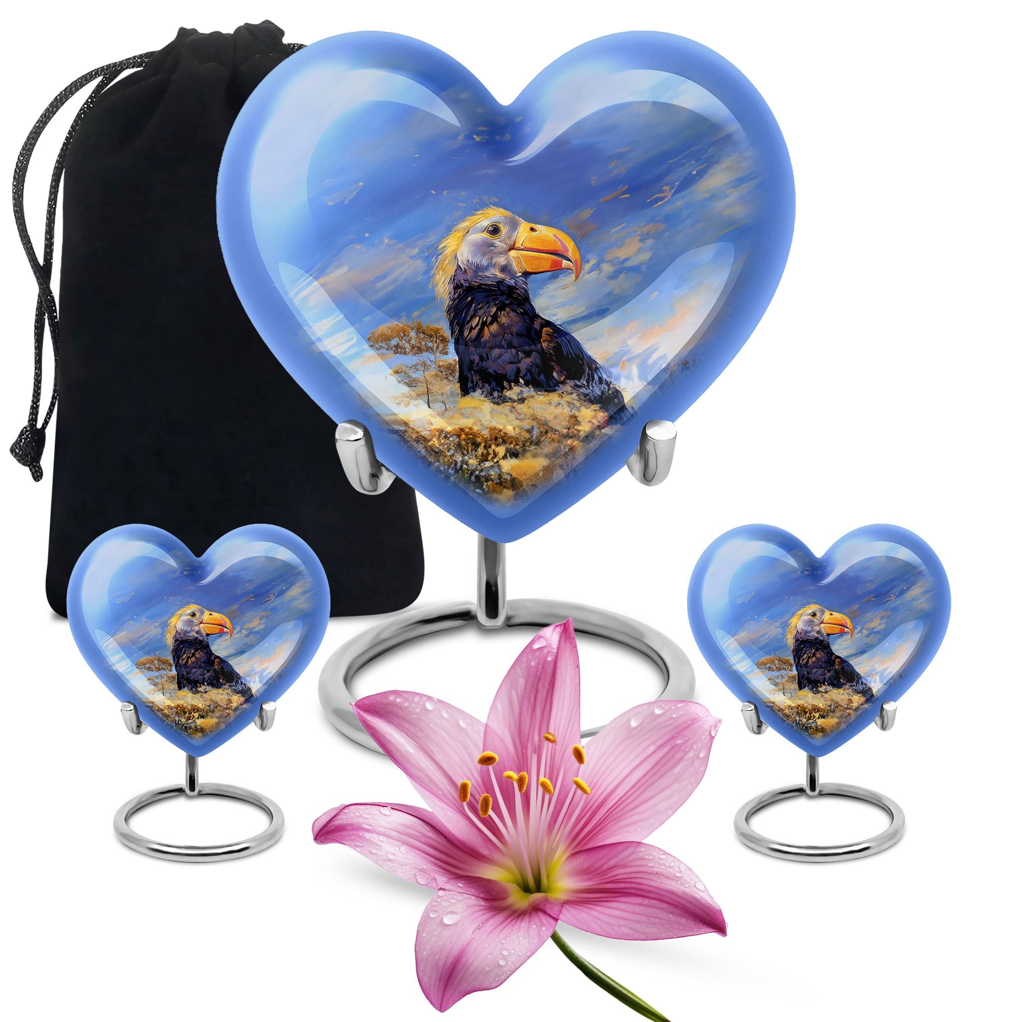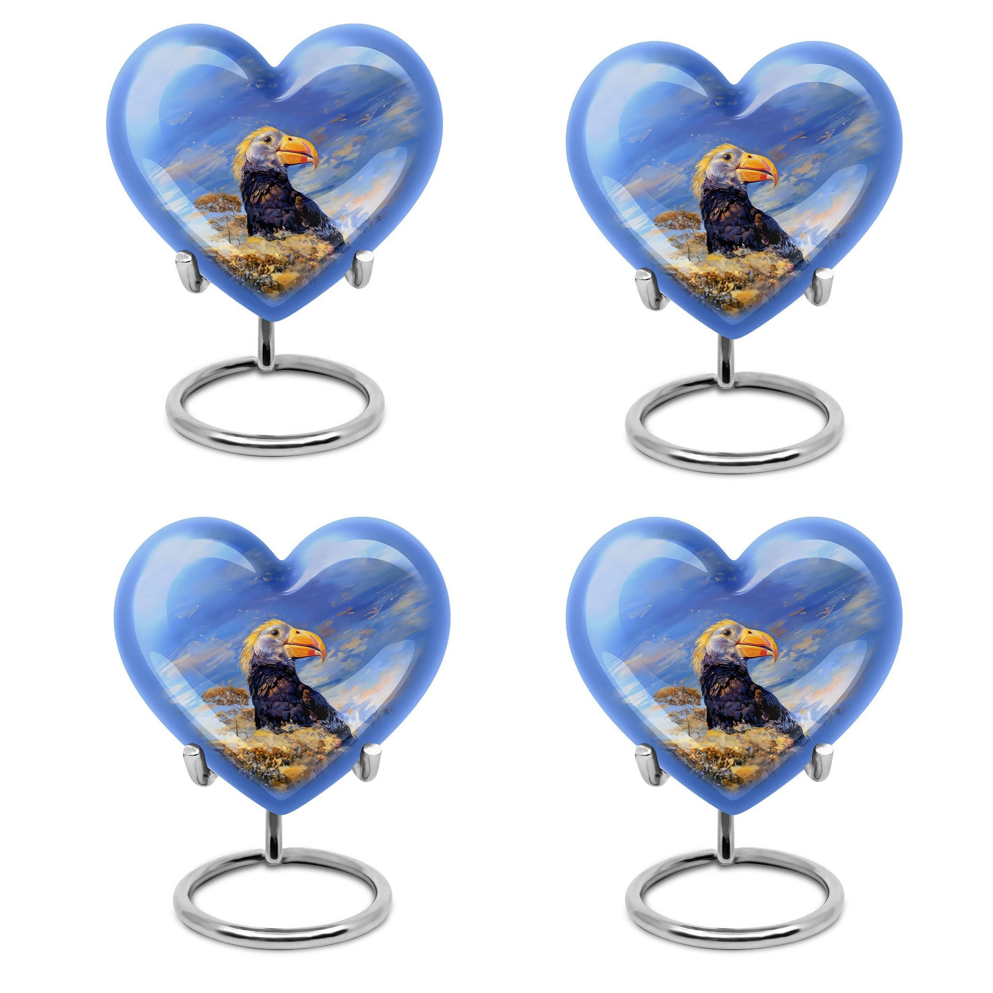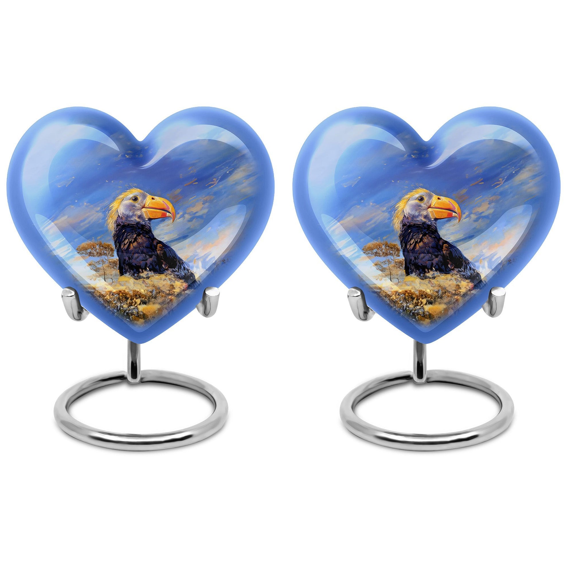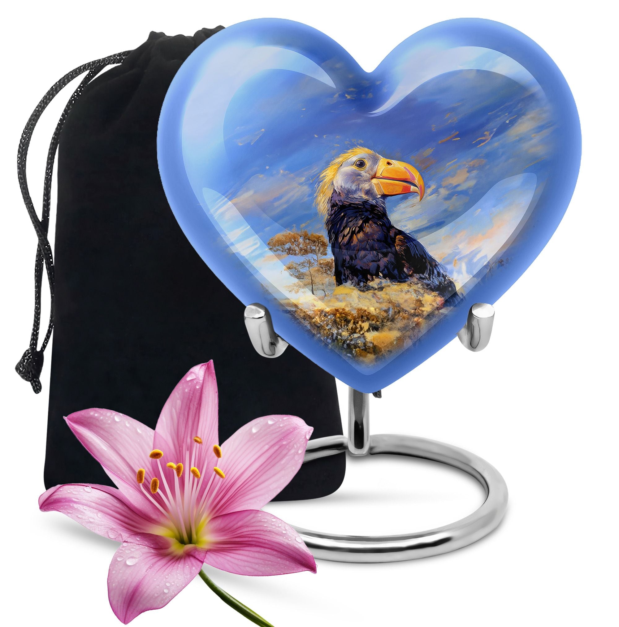 Discover a unique way to commemorate your loved ones with our Puffin Bird Urn, a remarkable choice in the category of memorial urns. Particularly designed for human ashes, it offers a thoughtful composition to hold the remnants of your dear ones. Crafted from high-grade Aluminium, it measures 10 inches in height, embodying an abstract theme in its heart-shape functionality. The urn's impressive capacity of 200 cubic inches comfortably accommodates the ashes, while the durable construction ensures long-lasting preservation. This 3.3-pound urn comes with a velvet pouch for the containment and safeguarding of ashes. One of the major highlights is the customization feature. This allows you to personalize the urn with engraved names, adding a touch of exclusivity. Regardless of being an adult or elder, if you are seeking large urns for cremation or burial purposes, our Puffin Bird Urn is an excellent choice. Notably, it doesn't just serve as an urn but a symbol of memory and love that endures time.