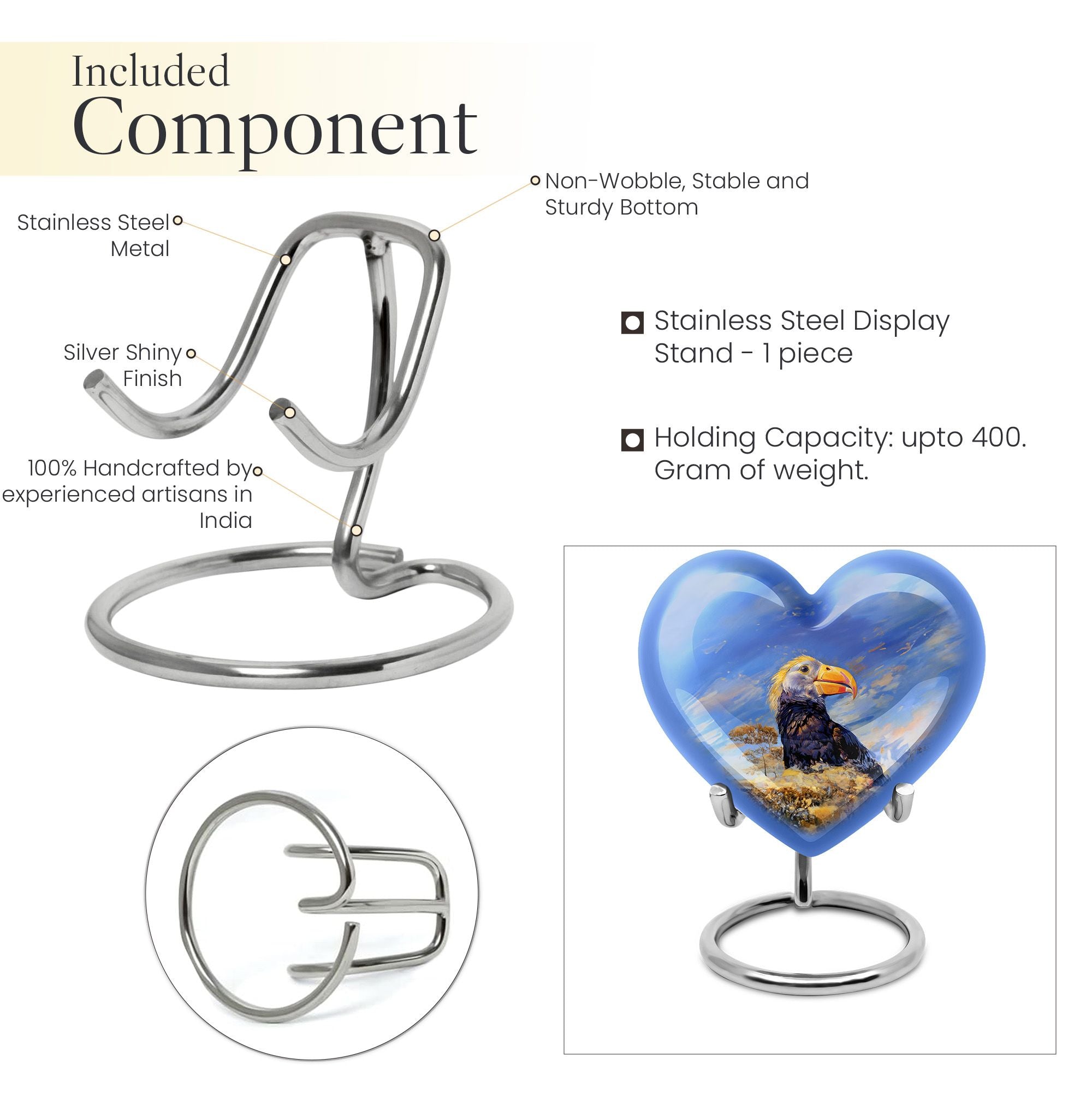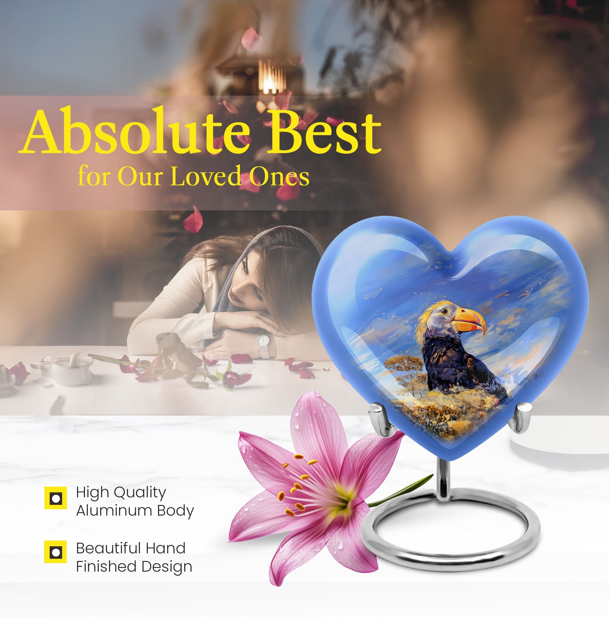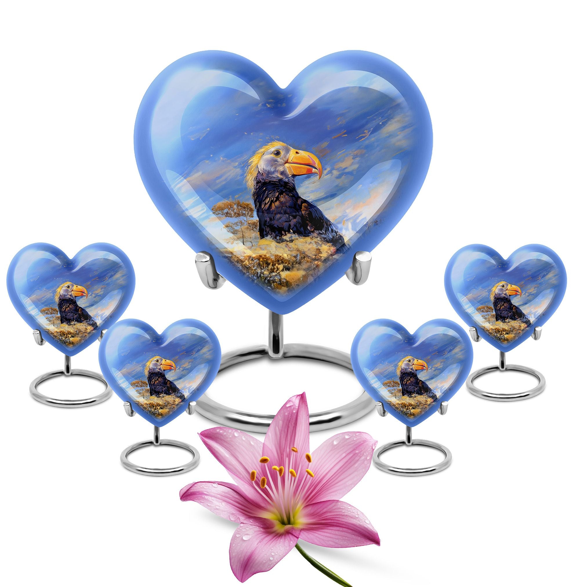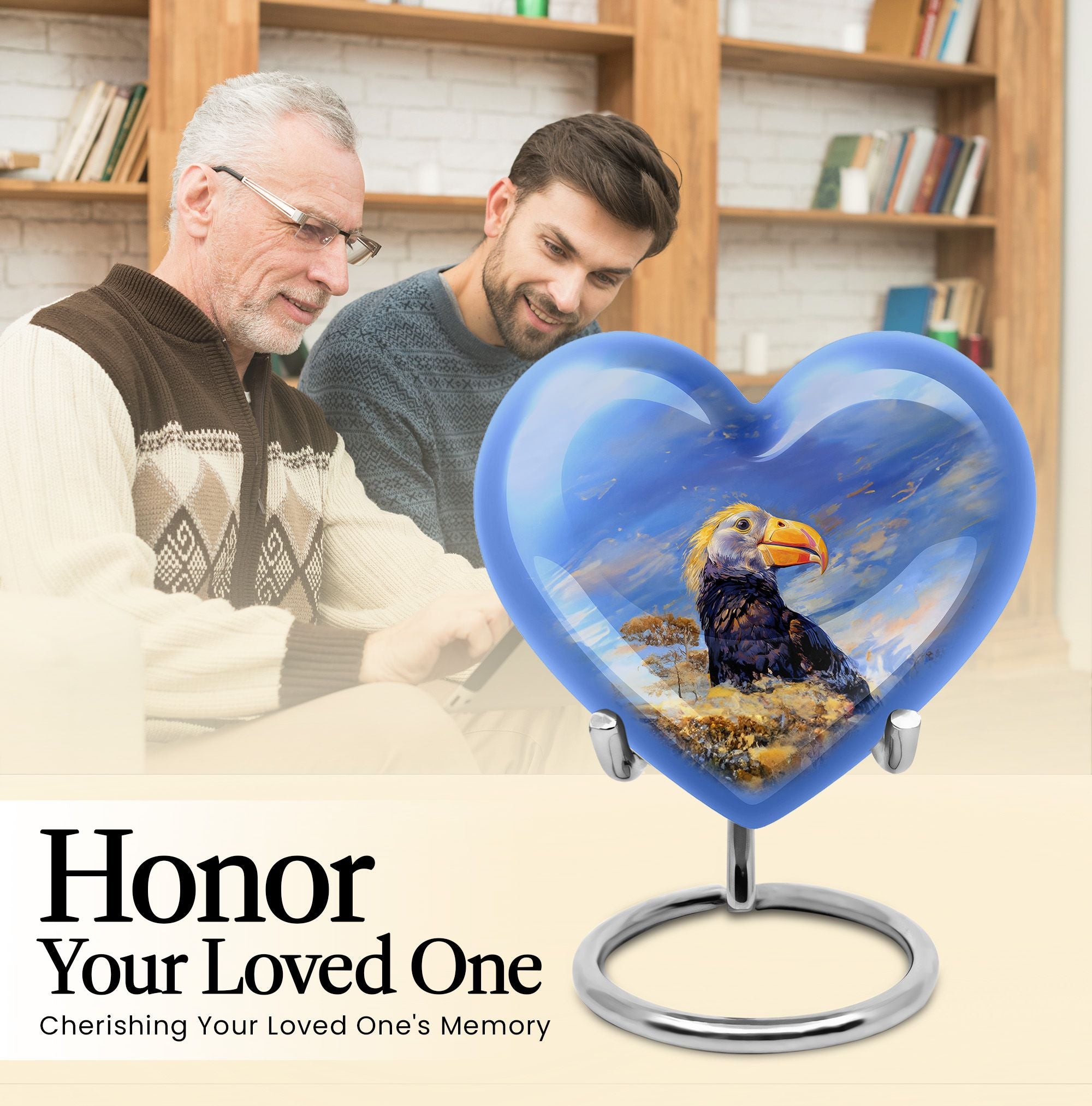 Discover a unique way to commemorate your loved ones with our Puffin Bird Urn, a remarkable choice in the category of memorial urns. Particularly designed for human ashes, it offers a thoughtful composition to hold the remnants of your dear ones. Crafted from high-grade Aluminium, it measures 10 inches in height, embodying an abstract theme in its heart-shape functionality. The urn's impressive capacity of 200 cubic inches comfortably accommodates the ashes, while the durable construction ensures long-lasting preservation. This 3.3-pound urn comes with a velvet pouch for the containment and safeguarding of ashes. One of the major highlights is the customization feature. This allows you to personalize the urn with engraved names, adding a touch of exclusivity. Regardless of being an adult or elder, if you are seeking large urns for cremation or burial purposes, our Puffin Bird Urn is an excellent choice. Notably, it doesn't just serve as an urn but a symbol of memory and love that endures time.
