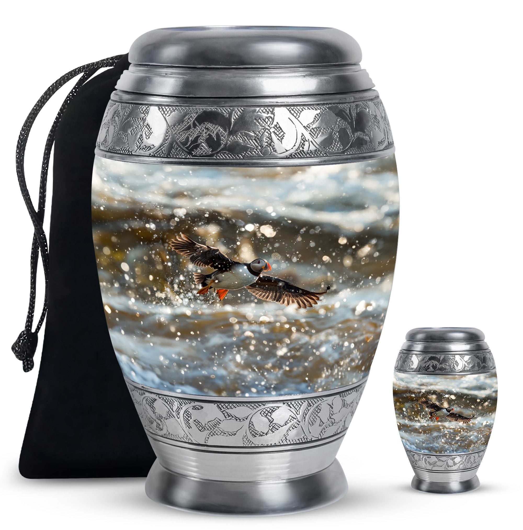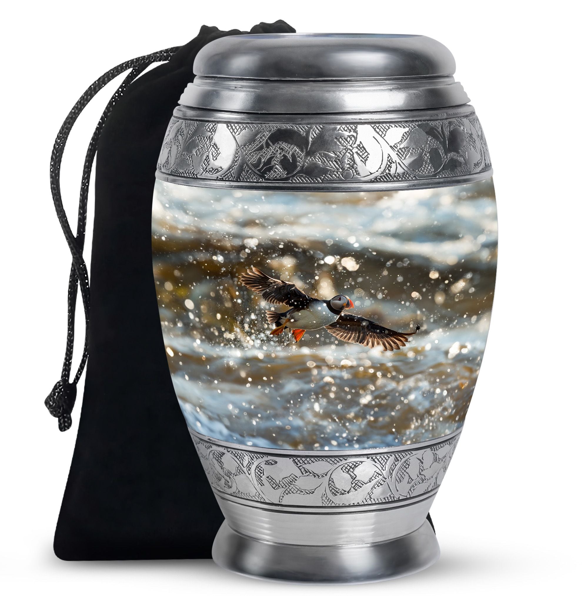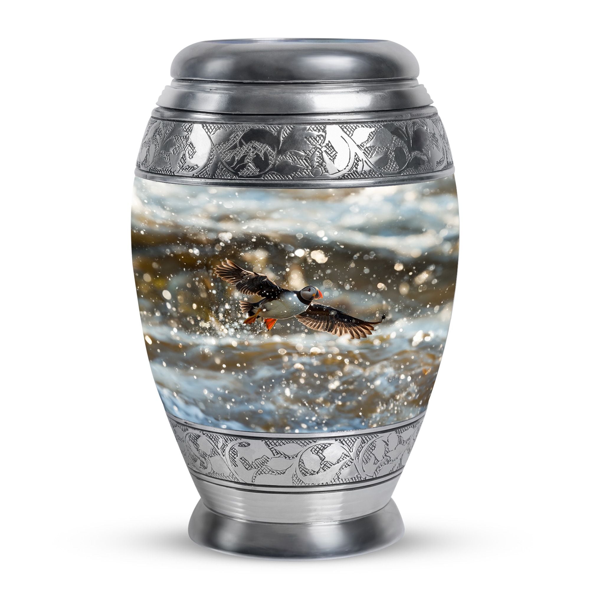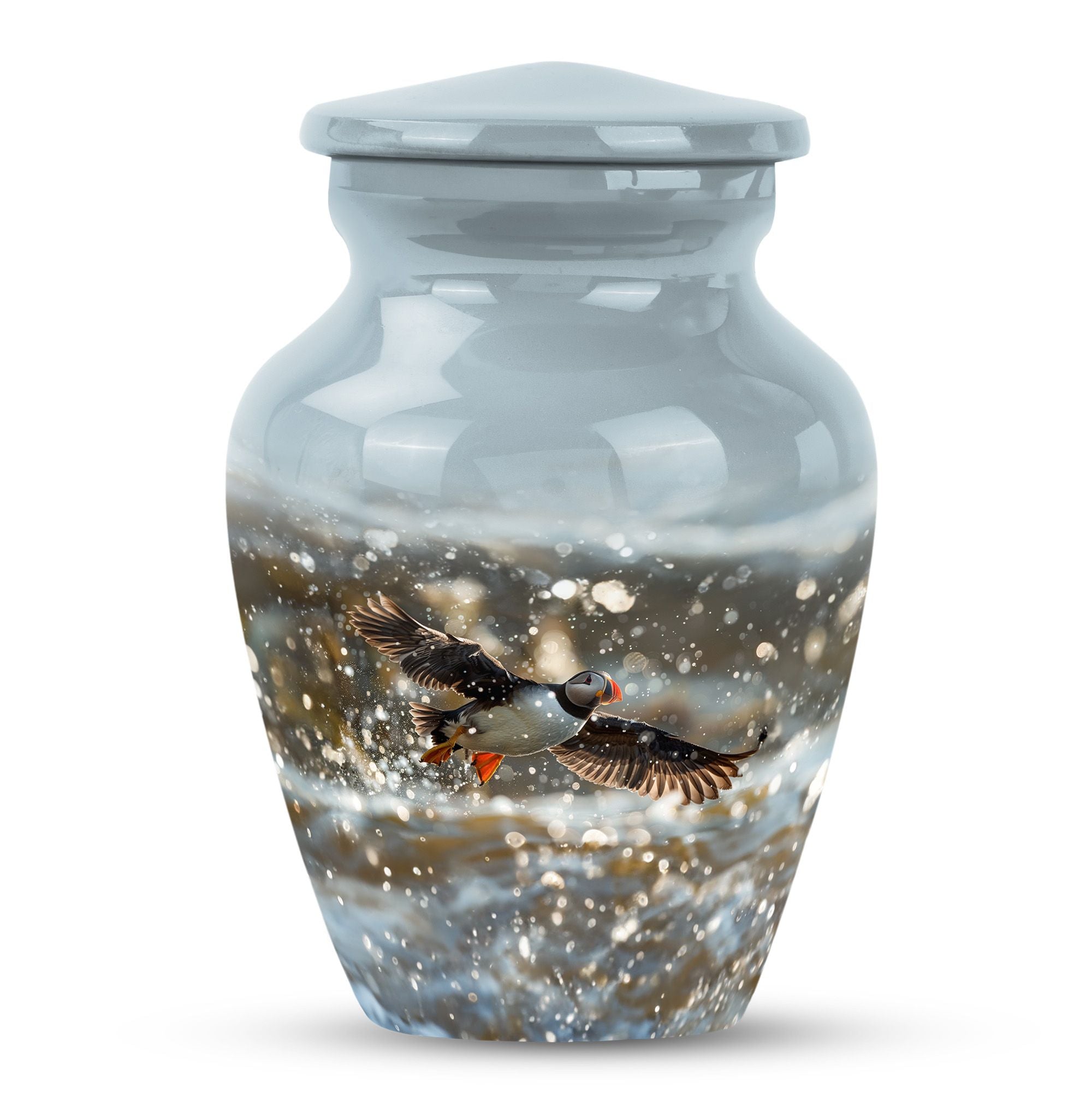 Expertly crafted from durable aluminium, this urn features a delicate puffin bird motif, combining gentle artistry with sturdy construction. Its secure screw-top lid and 10-inch height with 200-cubic-inch capacity make it suitable as a urn human ash adult male, urns ashes adult female, or even urn adult female ashes, blending practicality with symbolic beauty. Compact yet dignified, it also serves well as urns adult male small or urns ashes male.