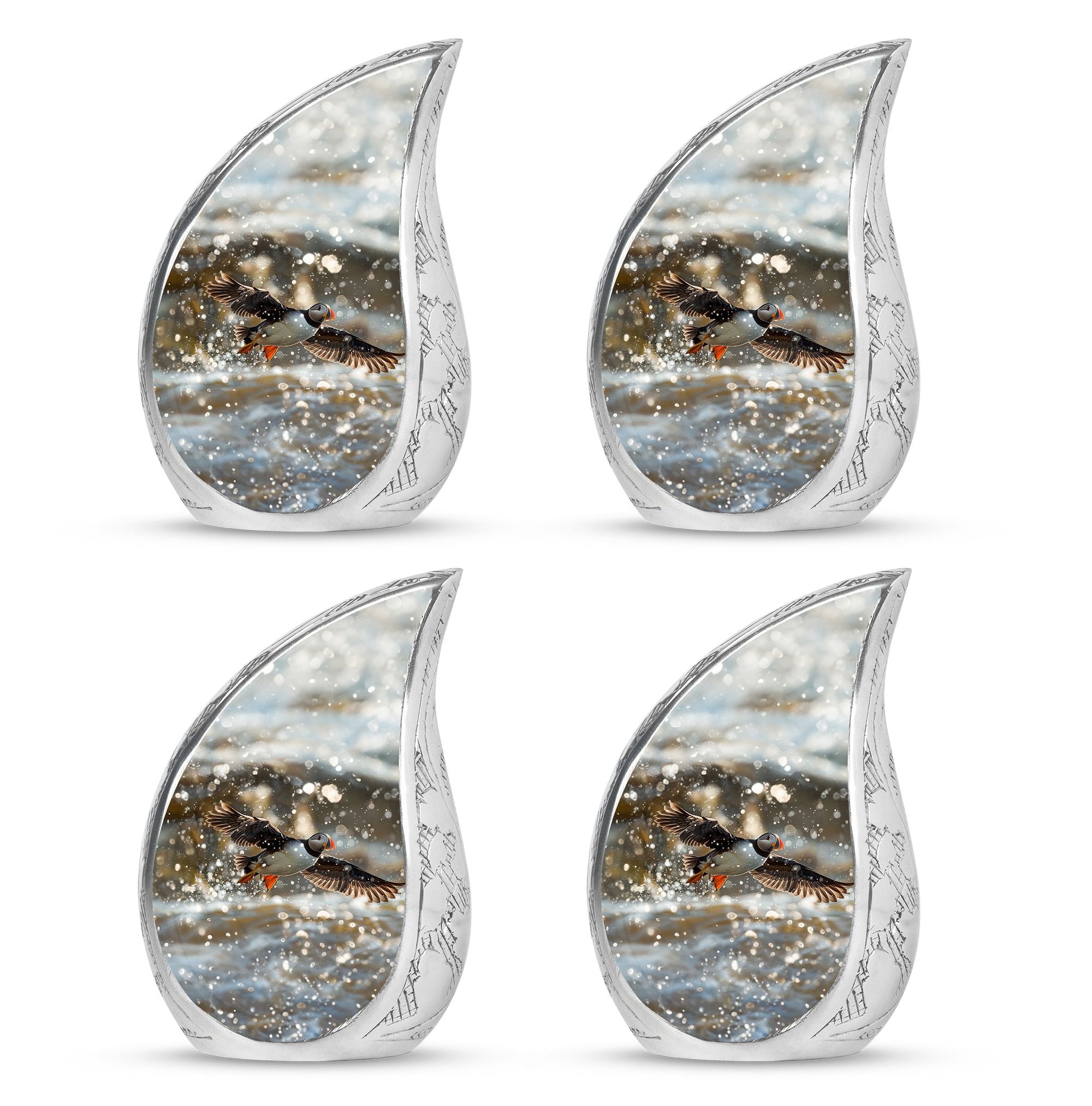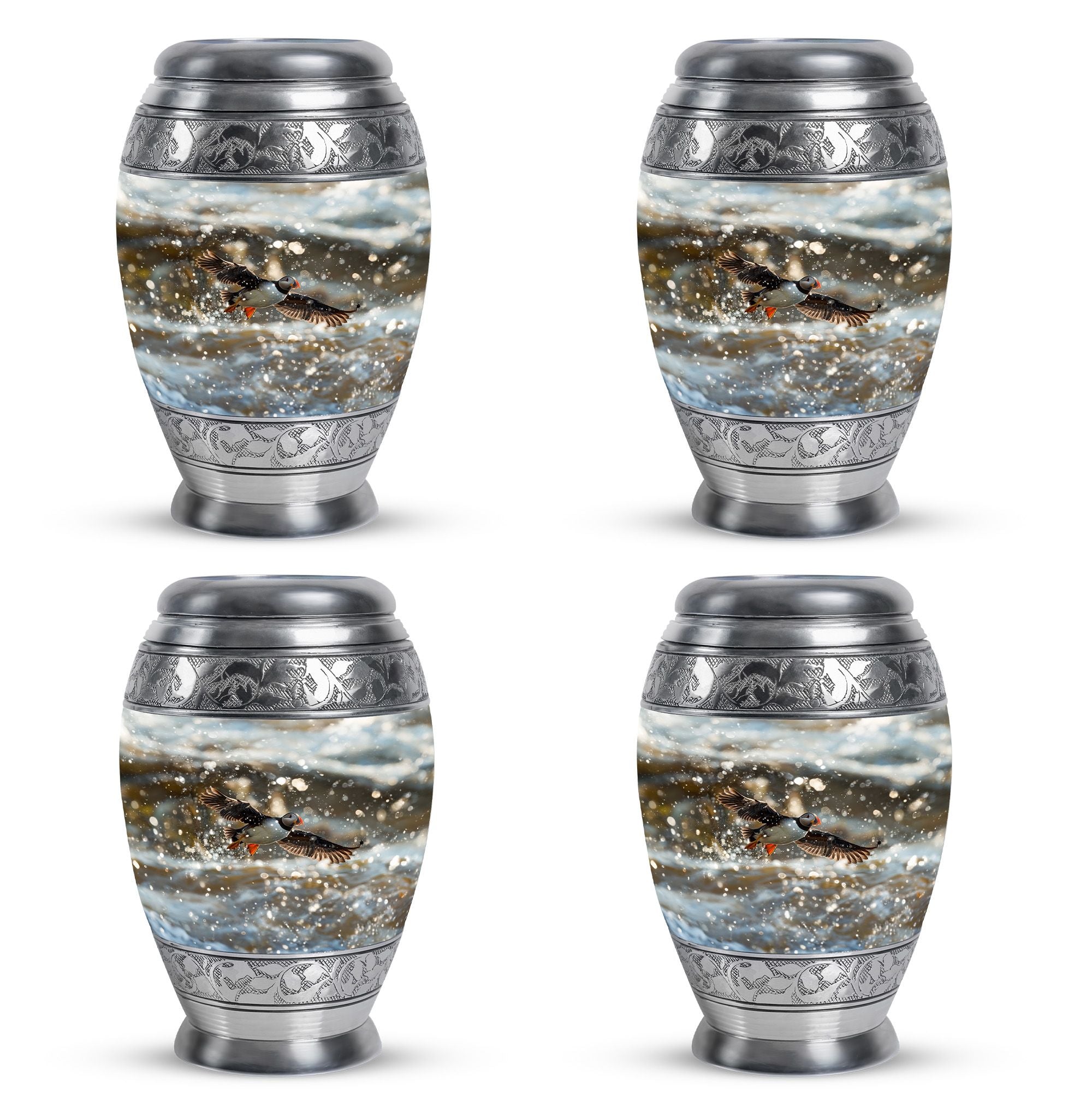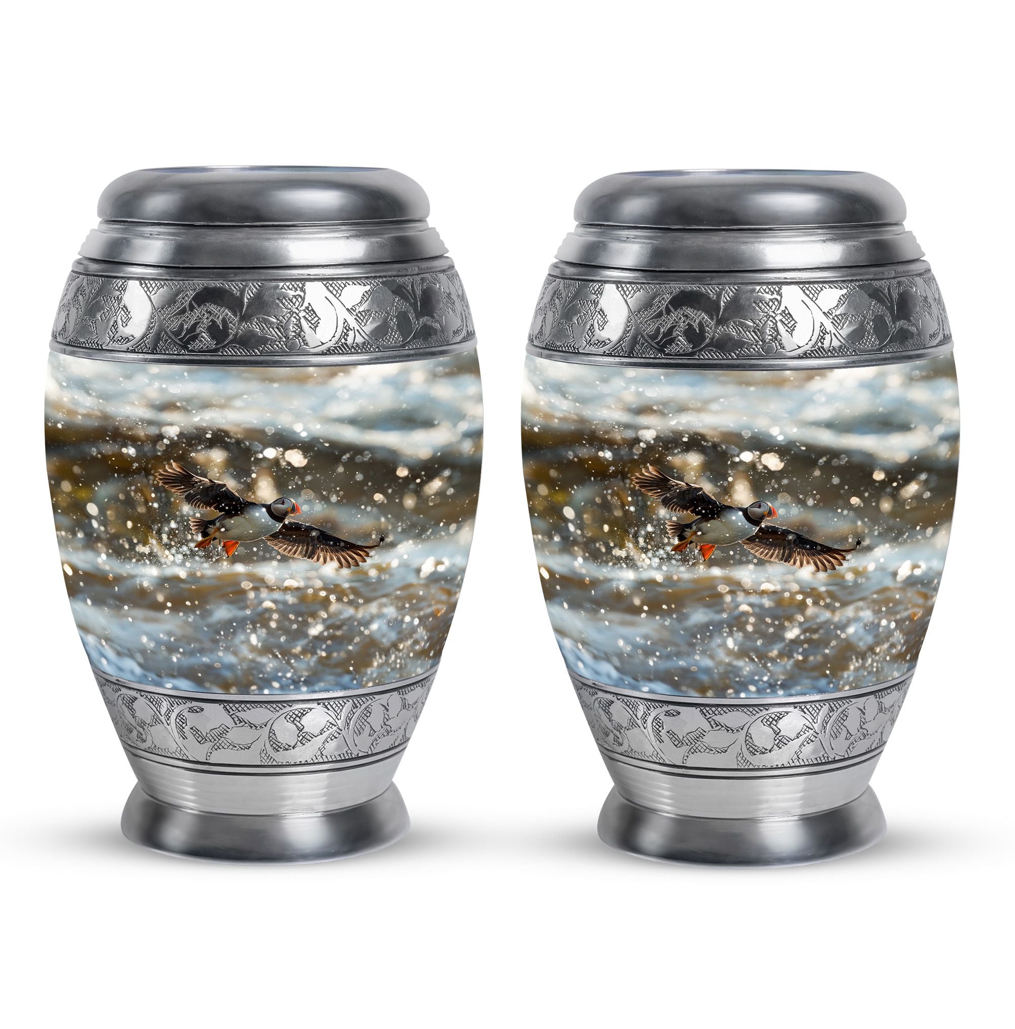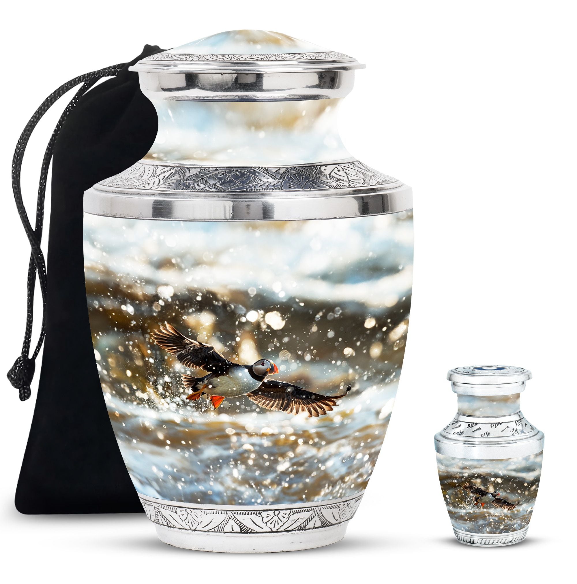 Expertly crafted from durable aluminium, this urn features a delicate puffin bird motif, combining gentle artistry with sturdy construction. Its secure screw-top lid and 10-inch height with 200-cubic-inch capacity make it suitable as a urn human ash adult male, urns ashes adult female, or even urn adult female ashes, blending practicality with symbolic beauty. Compact yet dignified, it also serves well as urns adult male small or urns ashes male.