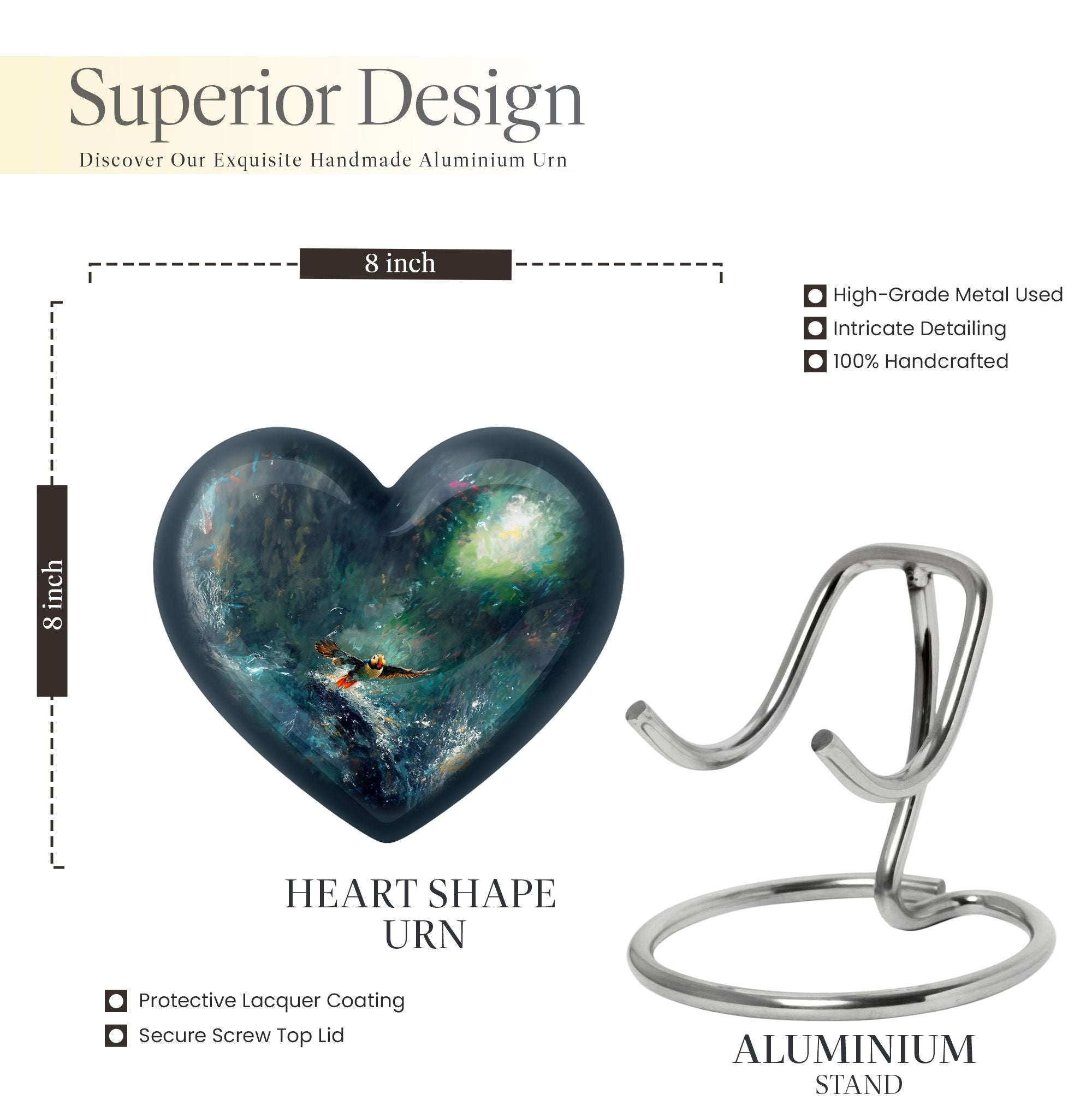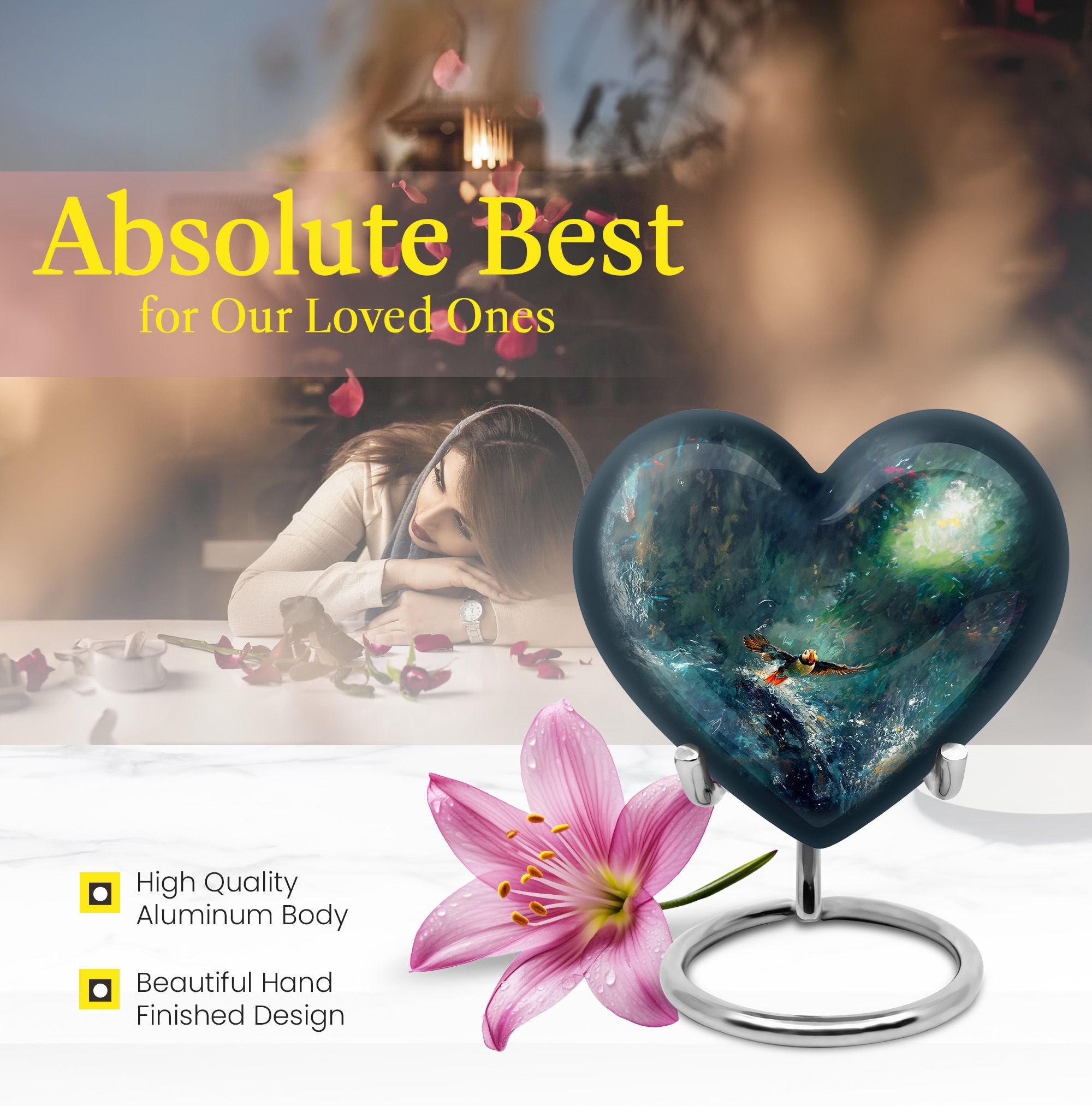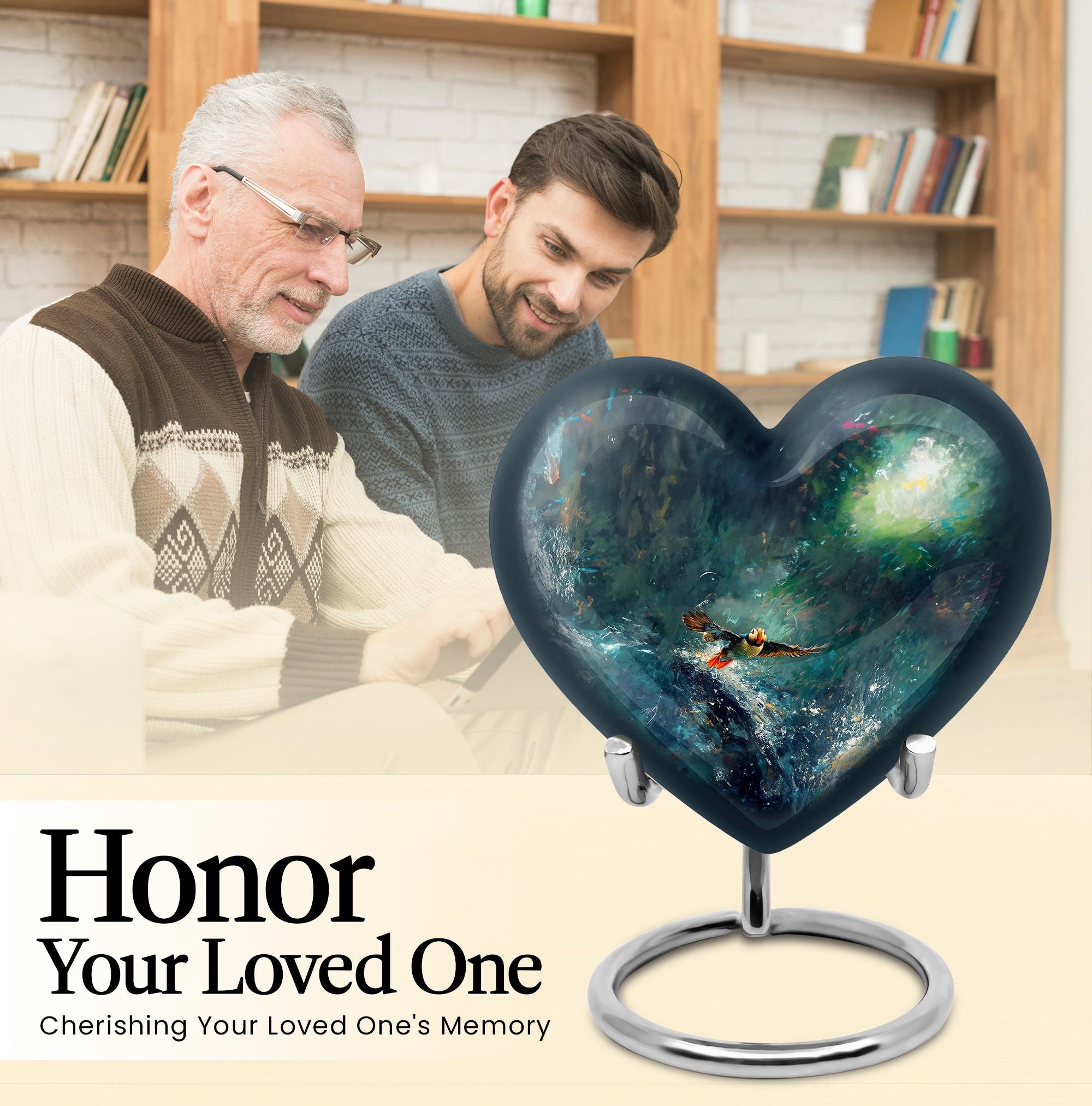 Honour the memory of your departed loved ones with our Puffin Bird Urn - a piece as unique as the person you're missing. This large urn is crafted lovingly from premium aluminium, ensuring durability and a dignified final resting place. The urn stands at 10 inches in height and has the capacity to hold up to 200 cubic inches of ashes, specifically designed as medium-sized funeral urns for human ashes. We know the importance of personal touch. Therefore, this urn offers the service of engraving names onto it, making it a personalized emblem of your love. This urn weighs a sturdy 3.3 pounds, ensuring it's not easily toppled, providing a peaceful spot for your treasured memories. The theme of the Puffin Bird adds a touch of nature's serenity to your loss. Moreover, the urn arrives with a velvet pouch for containment, adding a layer of protection and luxury. When considering cremation urns, view our elegantly designed Puffin Bird Urn, carrying the essence of love and respect forward.