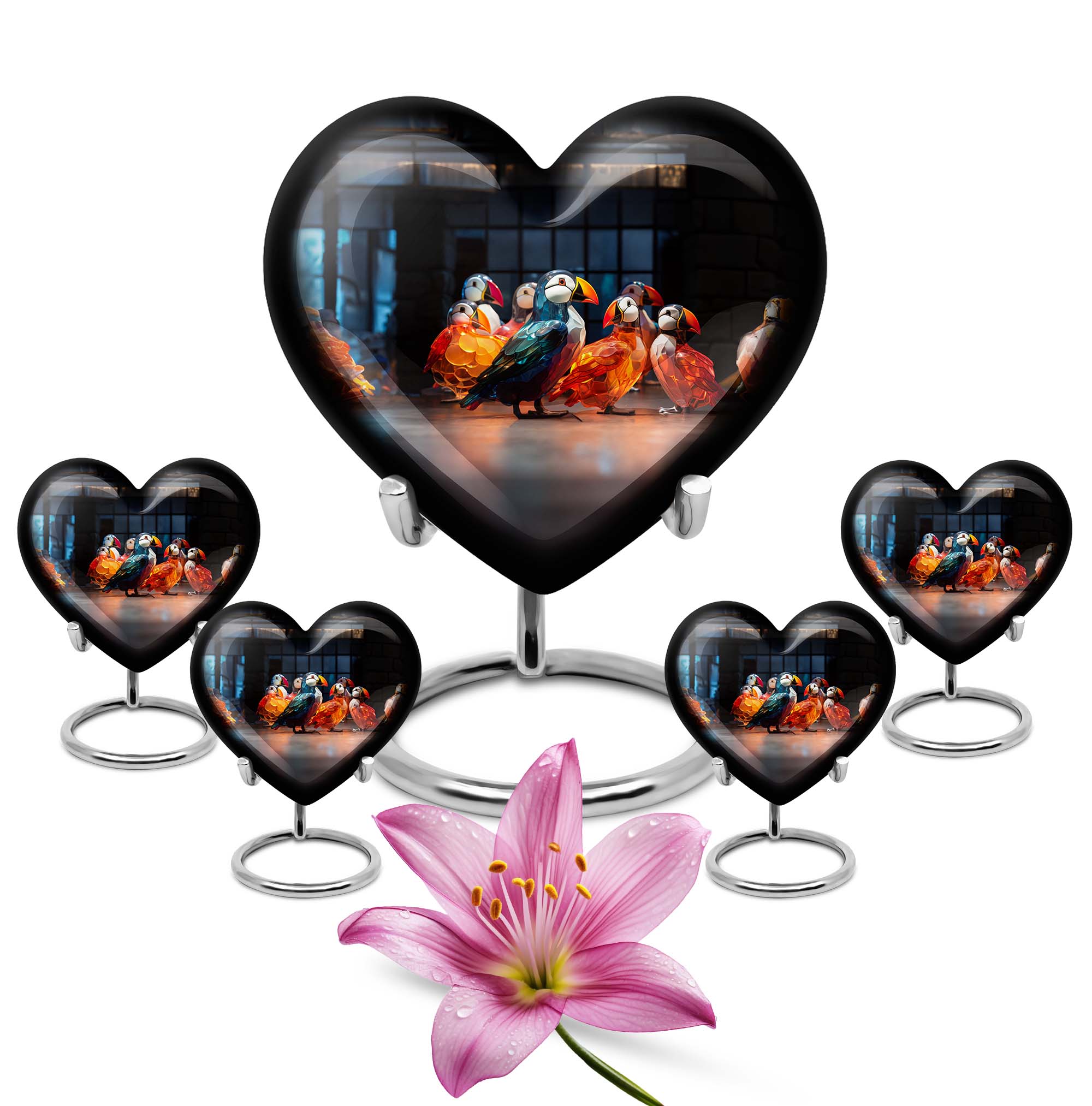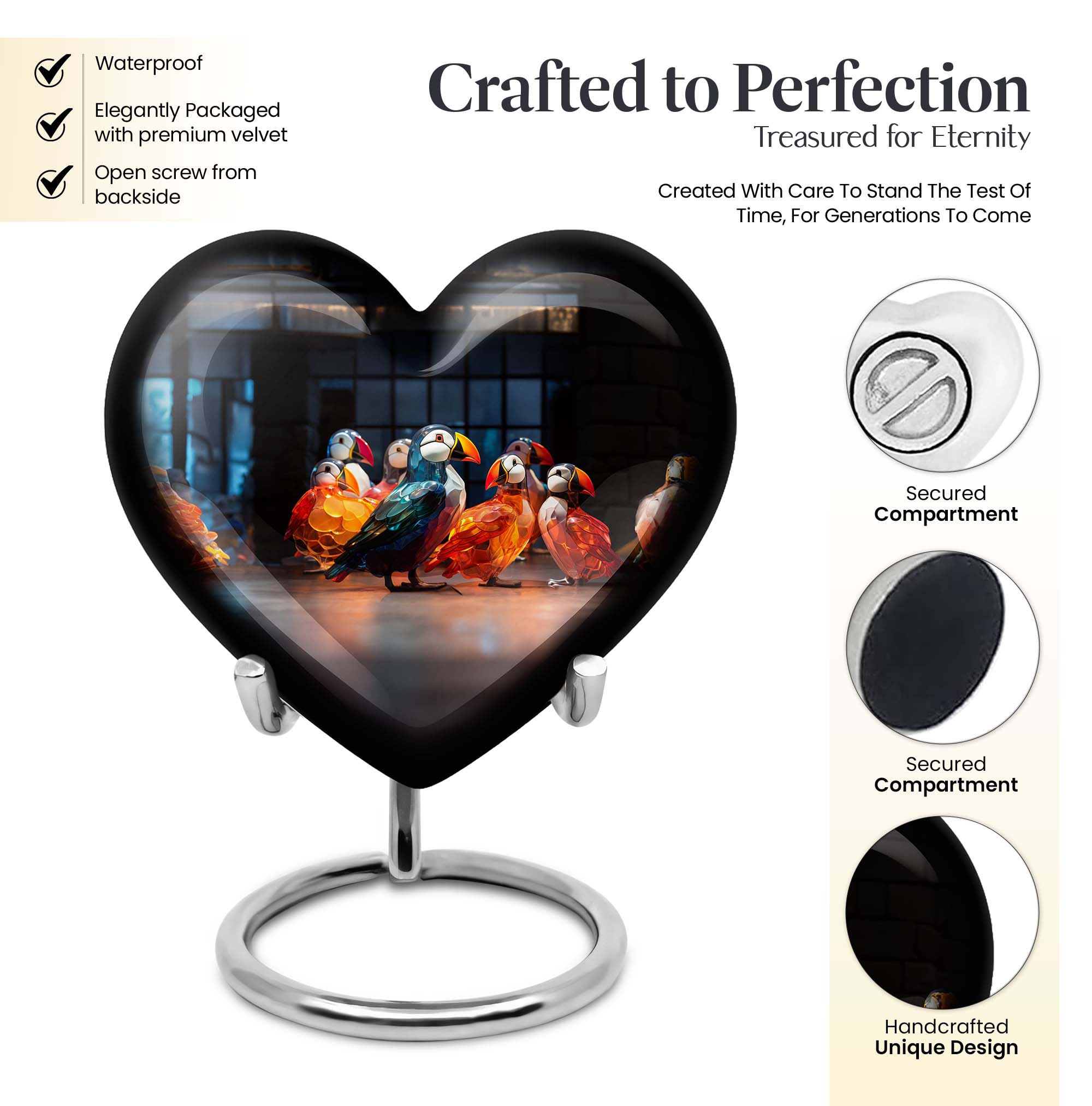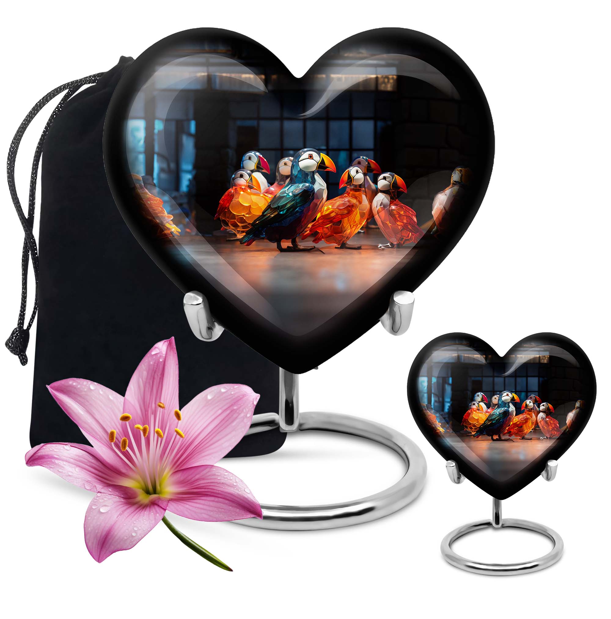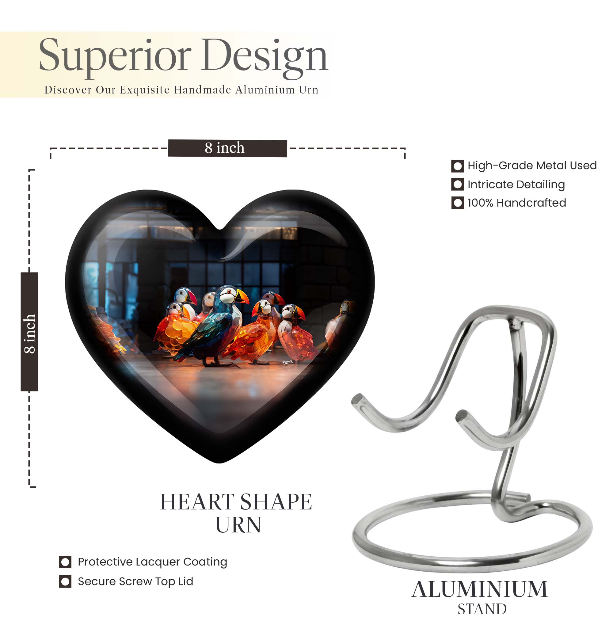 Embrace the final resting place of your cherished ones with the large, abstract-themed Puffin bird Urn, an ideal choice in memorial urns for ashes. Handcrafted from quality aluminium, these large urns for burial bear a striking essence of durability and longevity. Performance garners top priority as these funeral metal urns can hold up to 200 cubic inches of ashes, crediting to its 10-inch stature. Embodying a profound amount of love, the urn shines forth with its unique heart design, offering not merely containment but a fitting tribute. The urn weighs a sturdy 3.3 pounds and comes with a velvet pouch for added convenience. Personalize this shaped ashes urn with engraved names, adding a gentle touch of remembrance. Perfectly suitable for adults and seniors, these eco-friendly urns go beyond just storing ashes; they initiate a tangible memorial. Each Puffin bird urn represents a sealing tribute of love, reflecting priceless moments and profound bonds.