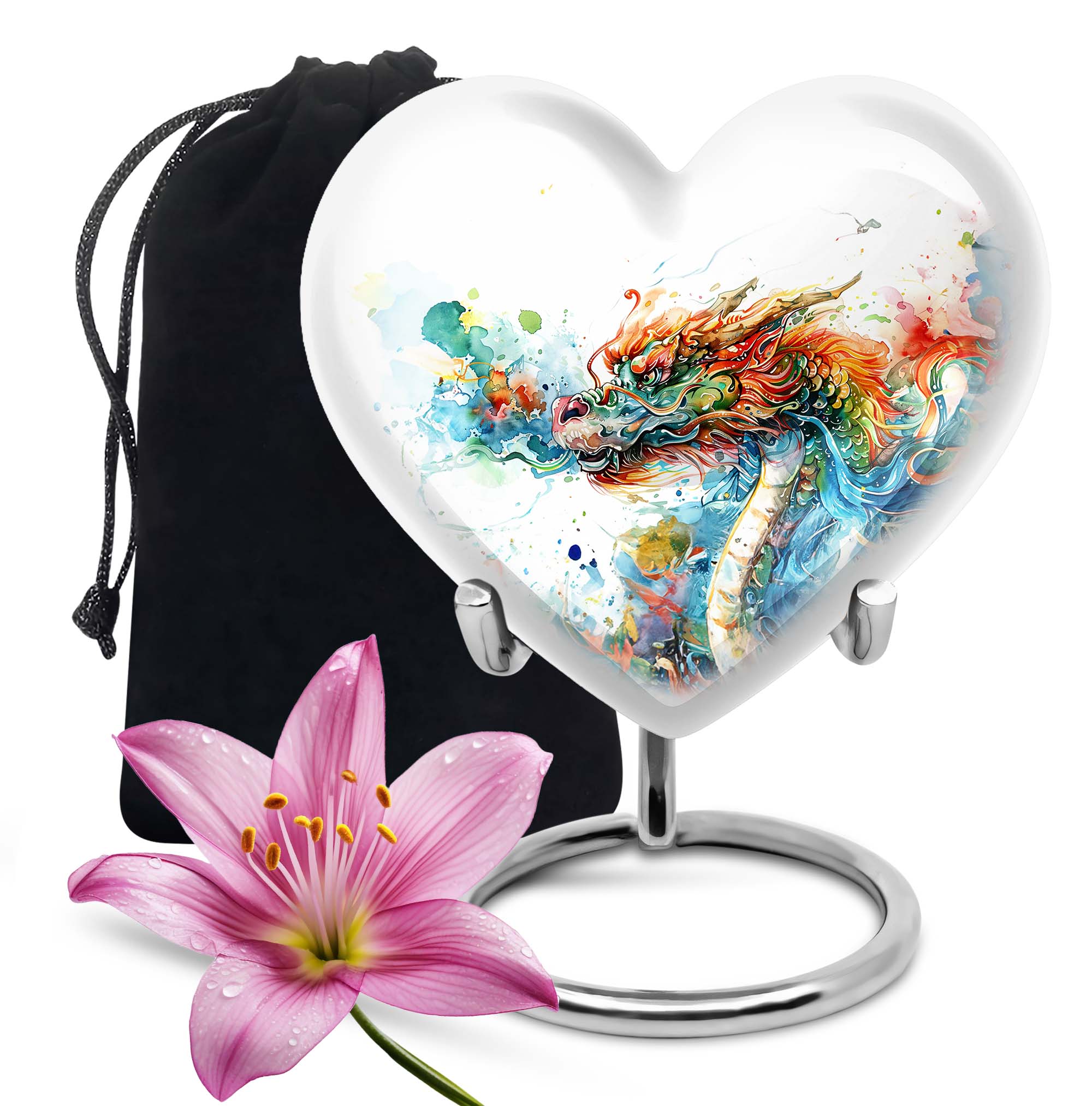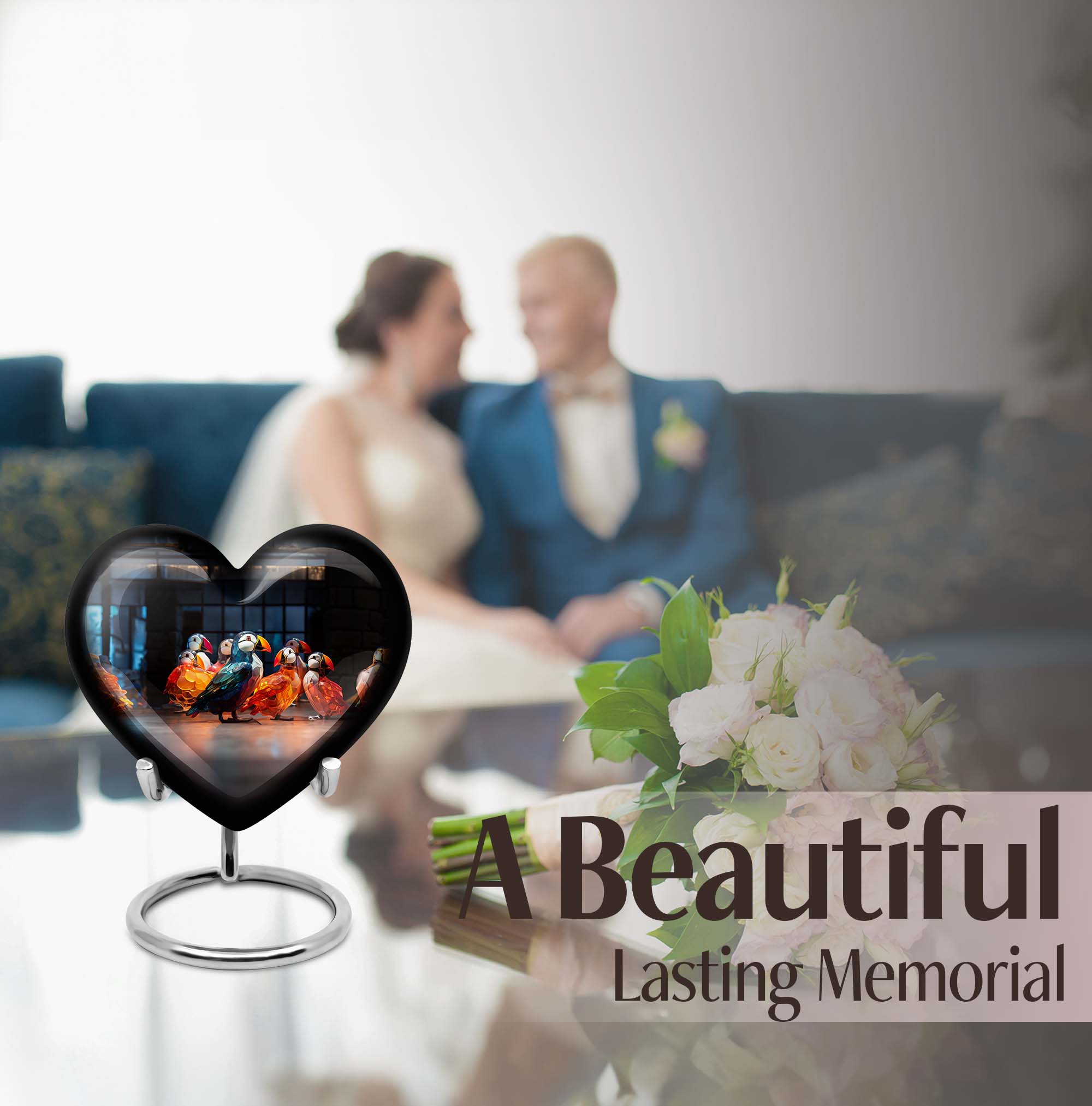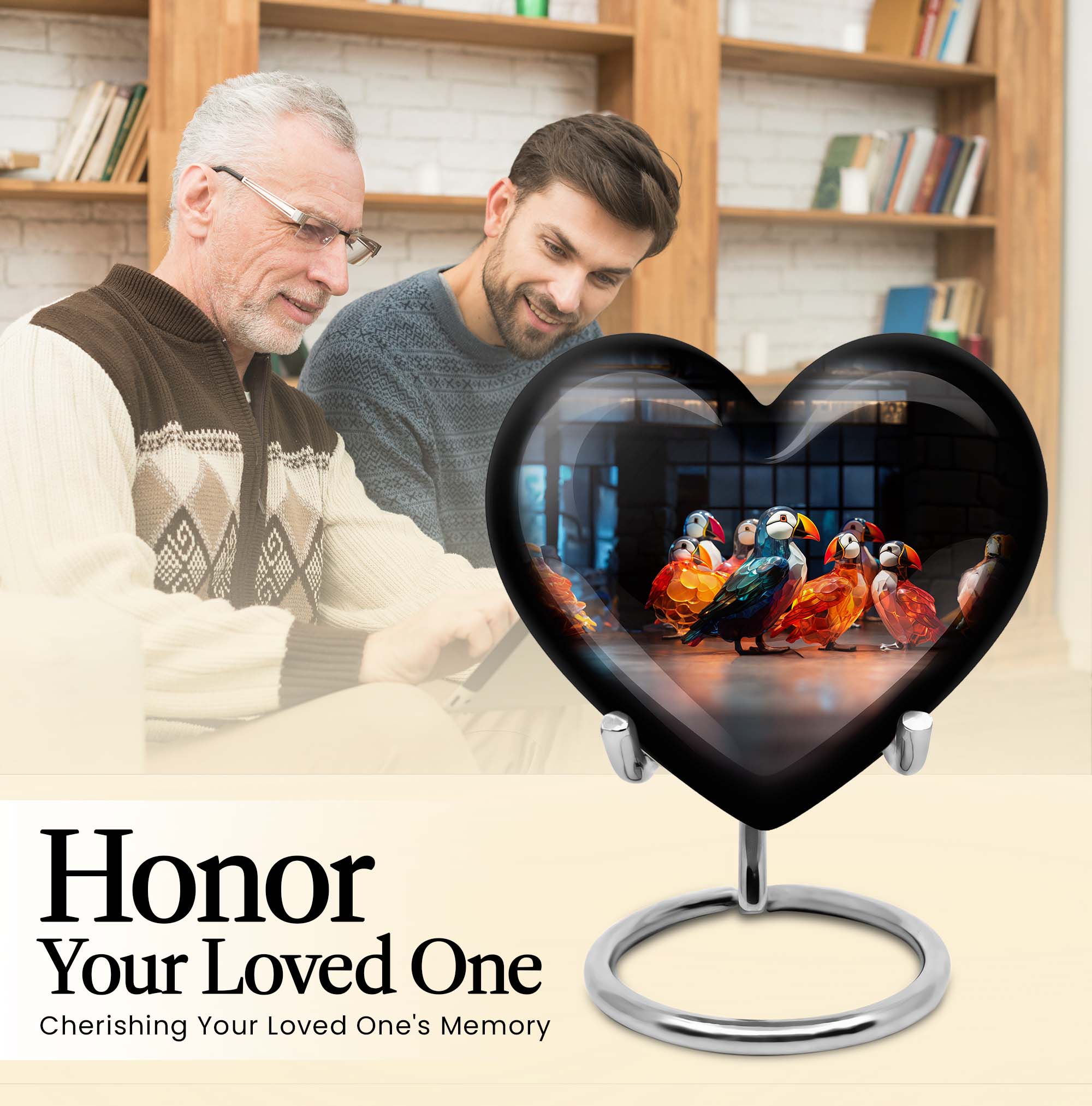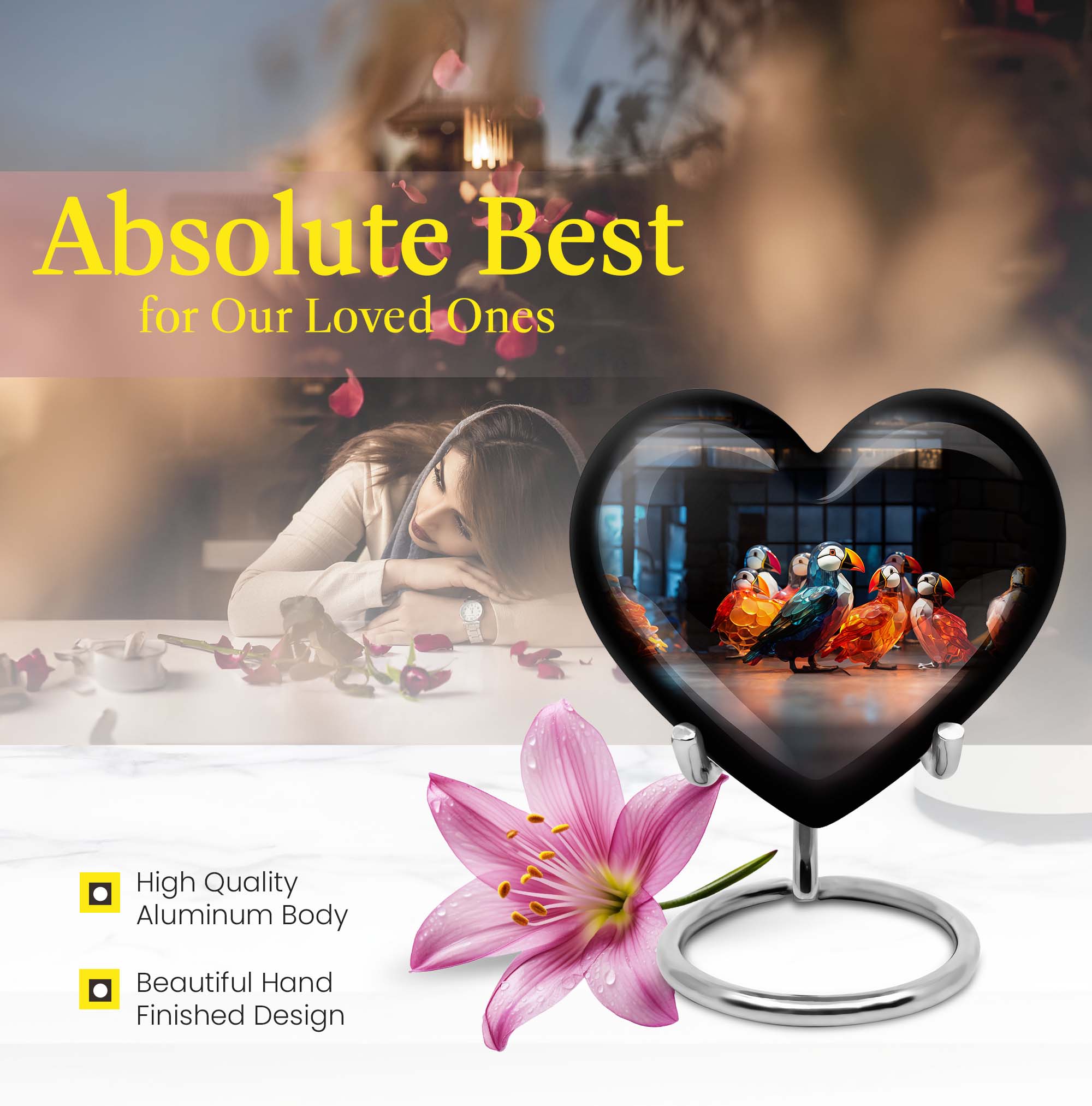 Embrace the final resting place of your cherished ones with the large, abstract-themed Puffin bird Urn, an ideal choice in memorial urns for ashes. Handcrafted from quality aluminium, these large urns for burial bear a striking essence of durability and longevity. Performance garners top priority as these funeral metal urns can hold up to 200 cubic inches of ashes, crediting to its 10-inch stature. Embodying a profound amount of love, the urn shines forth with its unique heart design, offering not merely containment but a fitting tribute. The urn weighs a sturdy 3.3 pounds and comes with a velvet pouch for added convenience. Personalize this shaped ashes urn with engraved names, adding a gentle touch of remembrance. Perfectly suitable for adults and seniors, these eco-friendly urns go beyond just storing ashes; they initiate a tangible memorial. Each Puffin bird urn represents a sealing tribute of love, reflecting priceless moments and profound bonds.