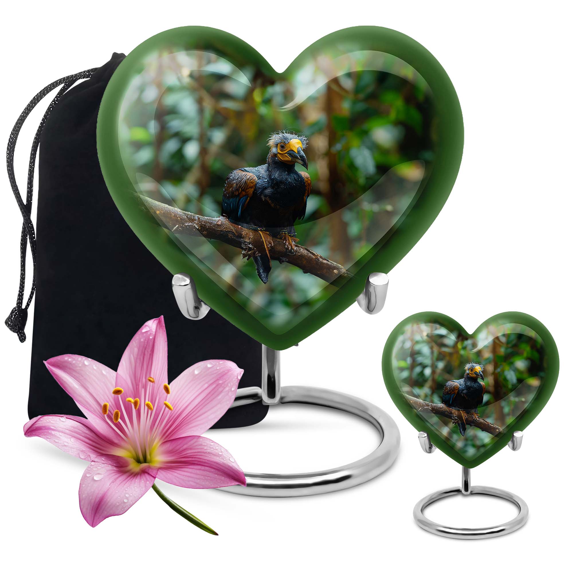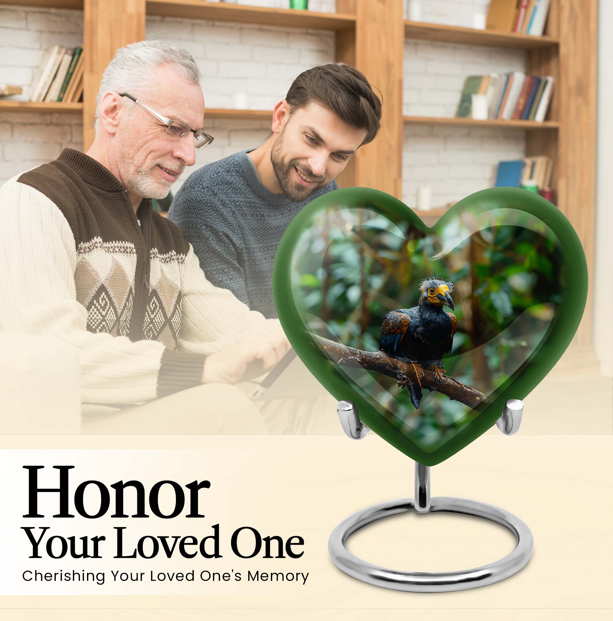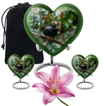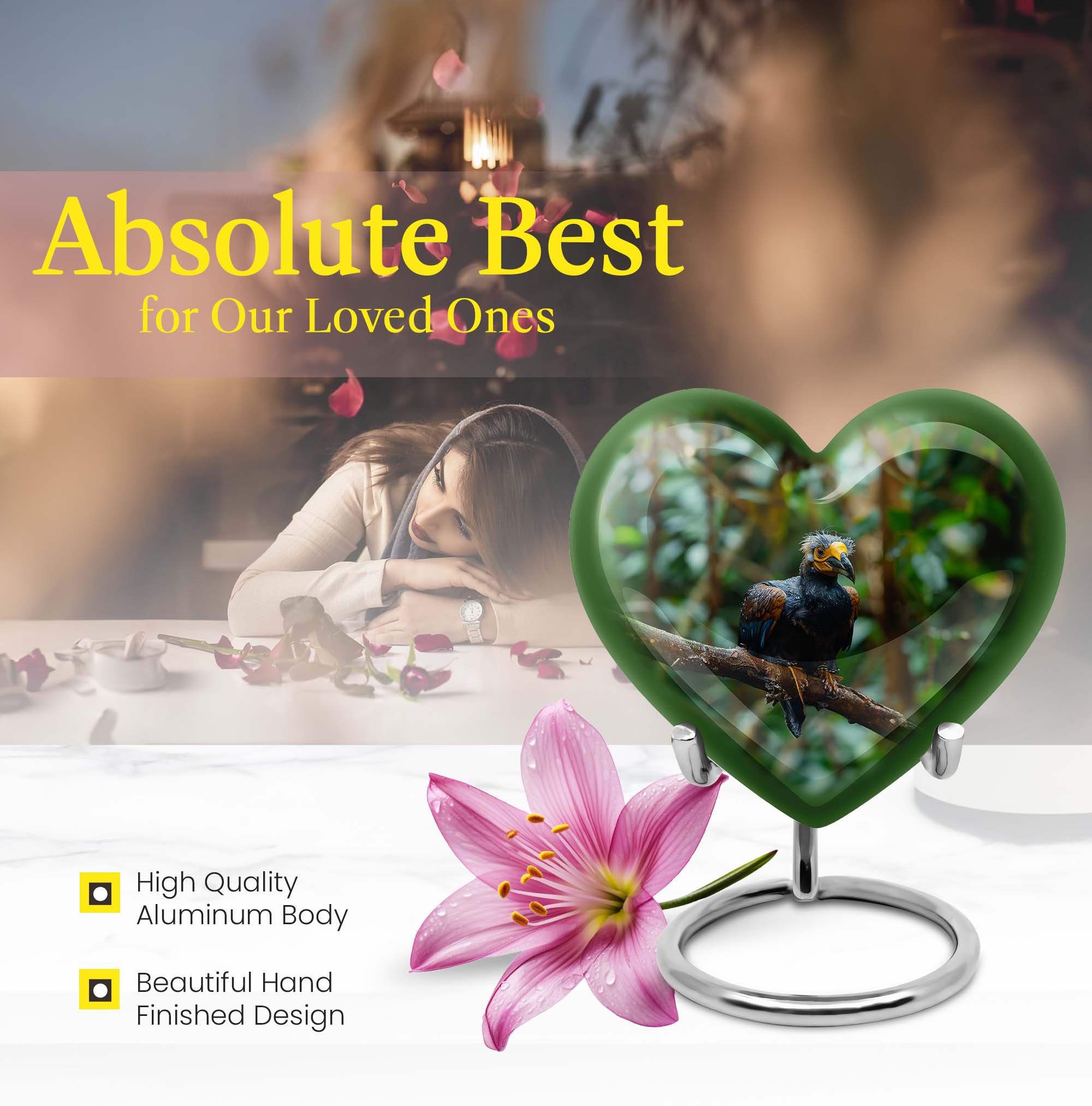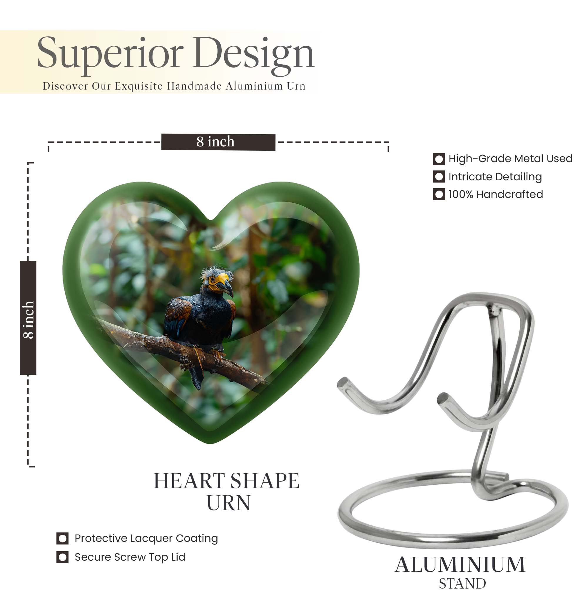 Cherish your loved ones with our exclusively crafted Puffin bird urn, an ideal choice among burial cremation urns for adults and seniors. This unique piece is not just a cremation urn but a work of art, boasting a graceful heart urn shape that is abstract in theme. With a generous size of 10 inches and a weight of 3.3 pounds, this large urn is created with optimum finish and precision. The urn is made from high-quality aluminum, promising a sturdy and enduring tribute.Furthermore, it has the capacity of 200 cubic inches to securely hold the precious ashes of your beloved. Each urn comes with a velvet pouch for safe containment of ashes, ensuring proper respect and dignity. The urn also offers an option for personalization with engraved names for a more intimate touch. Our Puffin bird Urn is the perfect memorial ceremony supply for those who appreciate beauty and elegance during a time of loss. Remember, our loved ones deserve nothing but the best memorial. Keywords: adult female elegant urn in porcelain, metal urn for burial, funeral urns for human ashes adult.