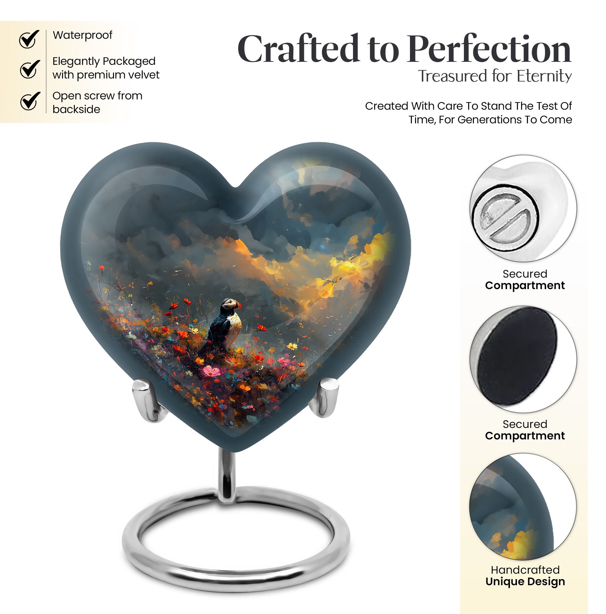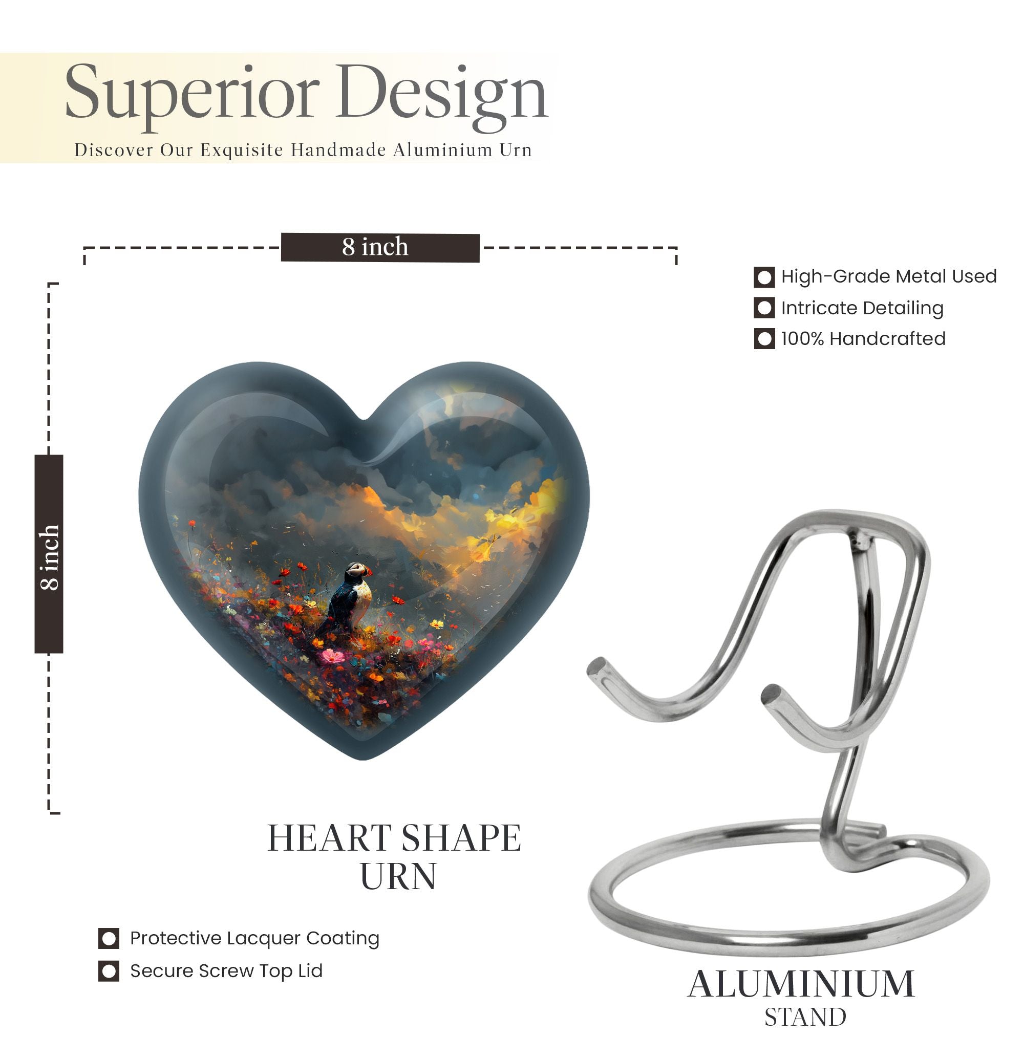 Introducing our Puffin Bird Urn, a distinctive choice in memorial urns dedicated to honoring cherished individuals. Crafted from robust aluminum, its origins are evident in its potent 3.3 pound weight. Measuring 10 inches in height, it showcases an inspiring Puffin bird theme that effortlessly captures the heart. With a capacity of 200 cubic inches, this large urn comfortably accommodates the ashes of an adult female, making it a uniquely apt choice when searching for 'cremation urn for ashes adult female' or 'cremation ashes containers'. Each order includes a velvet pouch adding an extra layer of care. Customize this cremation urn with personalized engraved names to make it even more special. This piece stands out in the realm of 'burial large urns' and 'urn ash adult urn human ash' categories for its deep meaning and distinct design. Experience the comfort and peace that comes from selecting a truly fitting tribute with our Puffin Bird Urn.