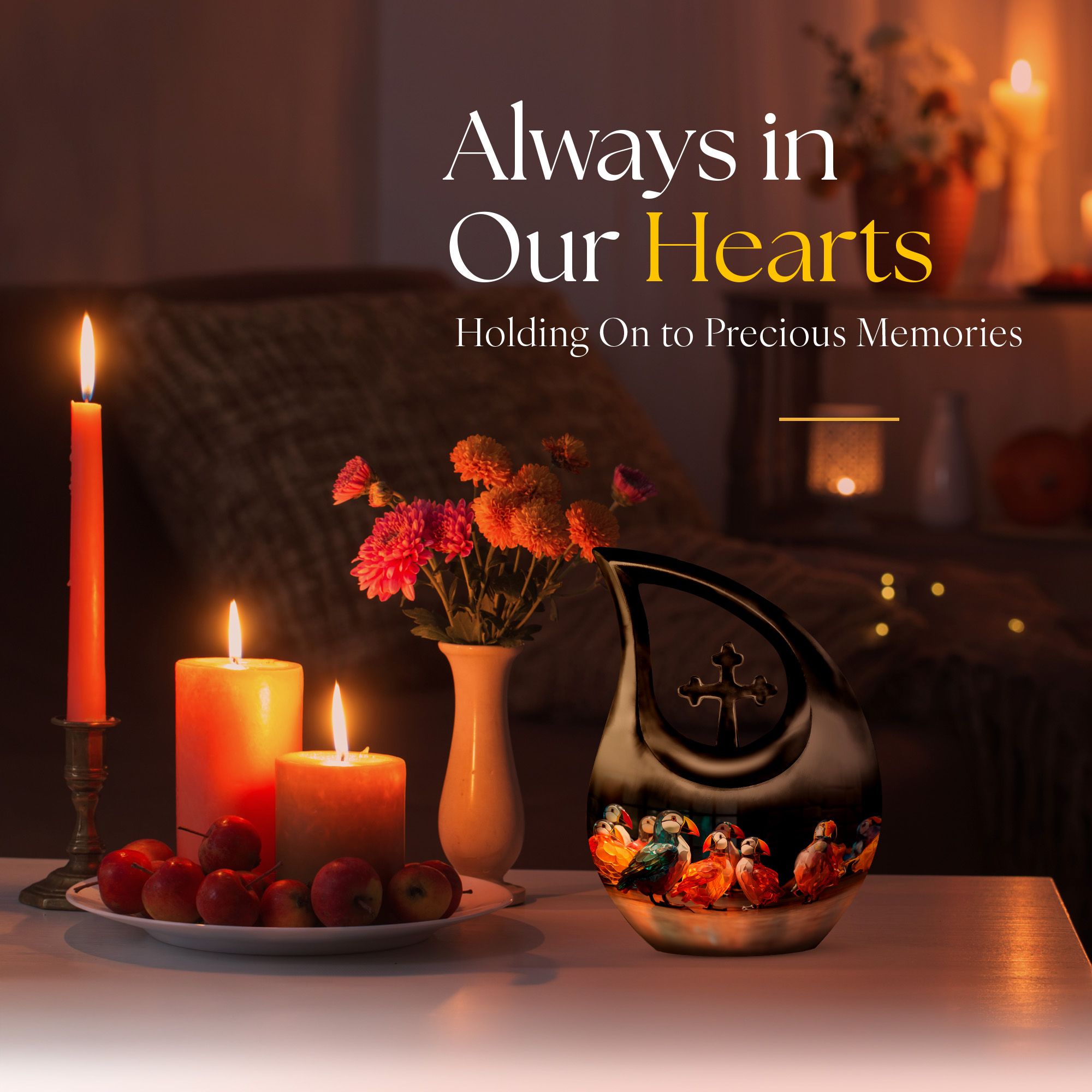 Honor your loved ones with our sublime Puffin Bird Urn, thoughtfully designed to perpetuate the tangible remembrances of your bond. This 10-inch Funeral Urn, cast from quality Aluminium, foregrounds a delicate 'Cross Drop' theme, a design that carries much sentiment in its simplicity. The Urn weighs 3.3 pounds with a holding capacity of 200 cubic inches, meticulously detailed to preserve cherished memories. Complementing its remarkable design, the urn comes with a velvet pouch for secure containment of ashes. Yet, its distinctiveness does not end here. To make it more personal, you can customize it by engraving names, thus making our urn a distinctive reliquary for the one you cherish. This outstanding memorial urn, harmoniously manifesting the themes of peace and love, stands as a visible symbol of remembrance, designed to resonate with those seeking meaningful 'memorial urns.' Adorn your space with our Large urns and remember your beloved in a special manner, keeping their memories forever engrained.