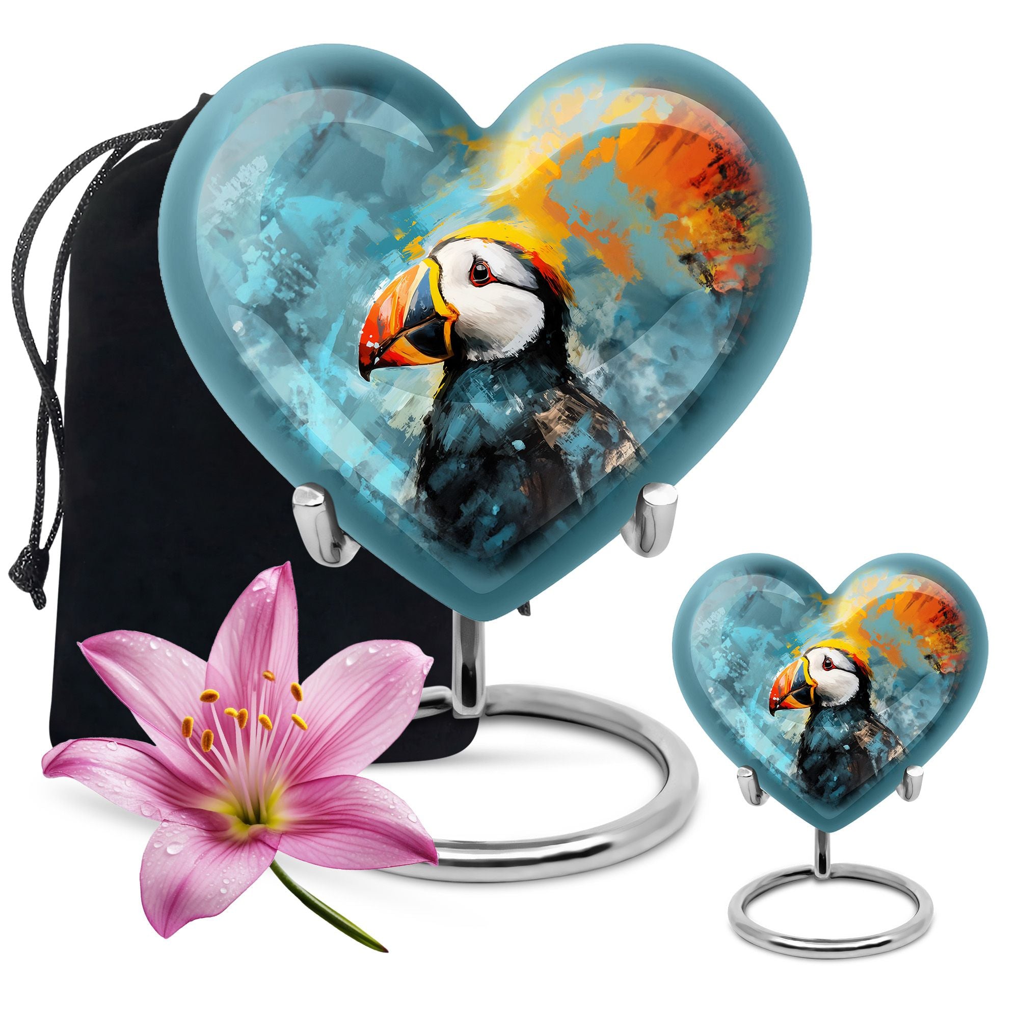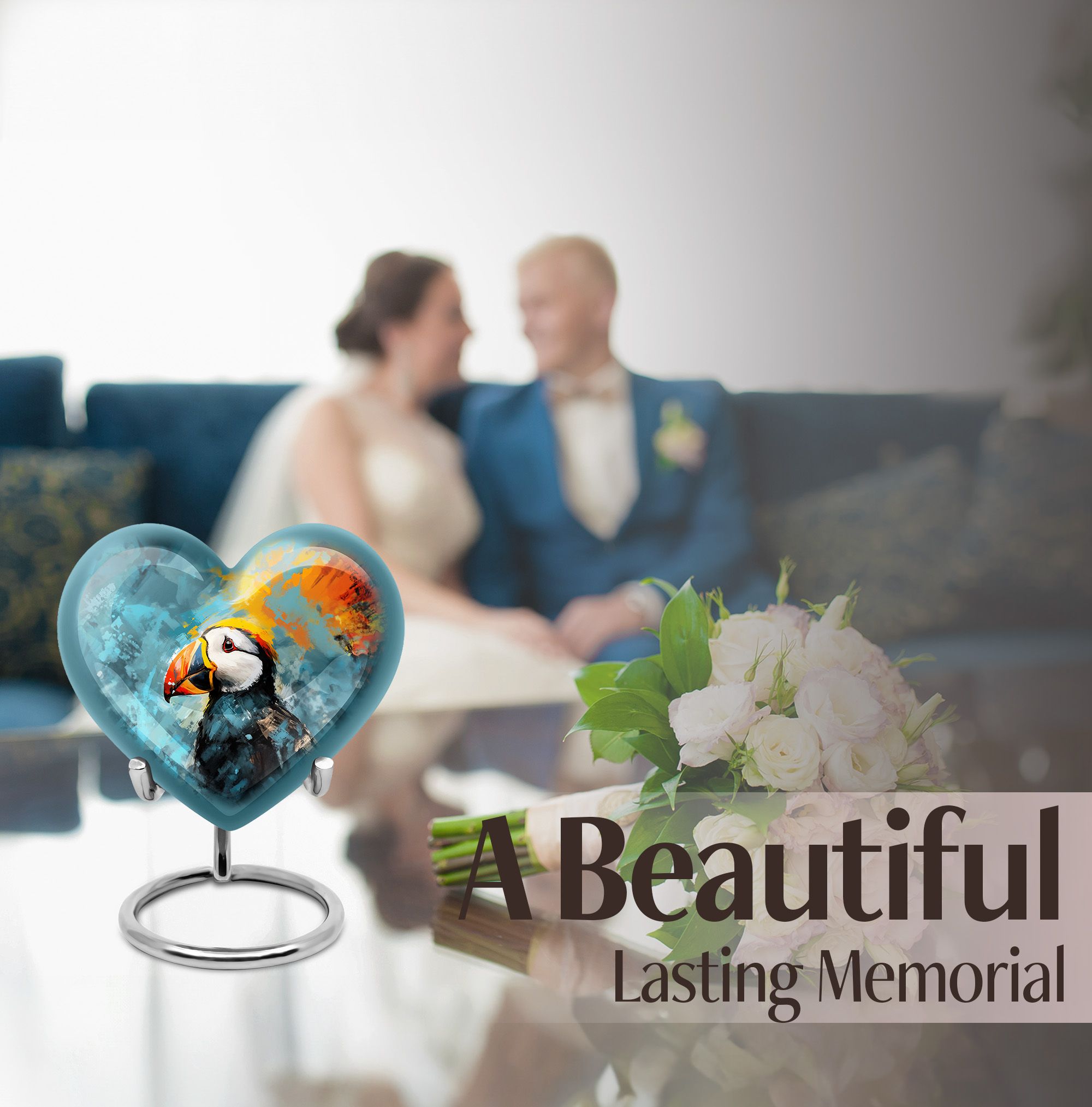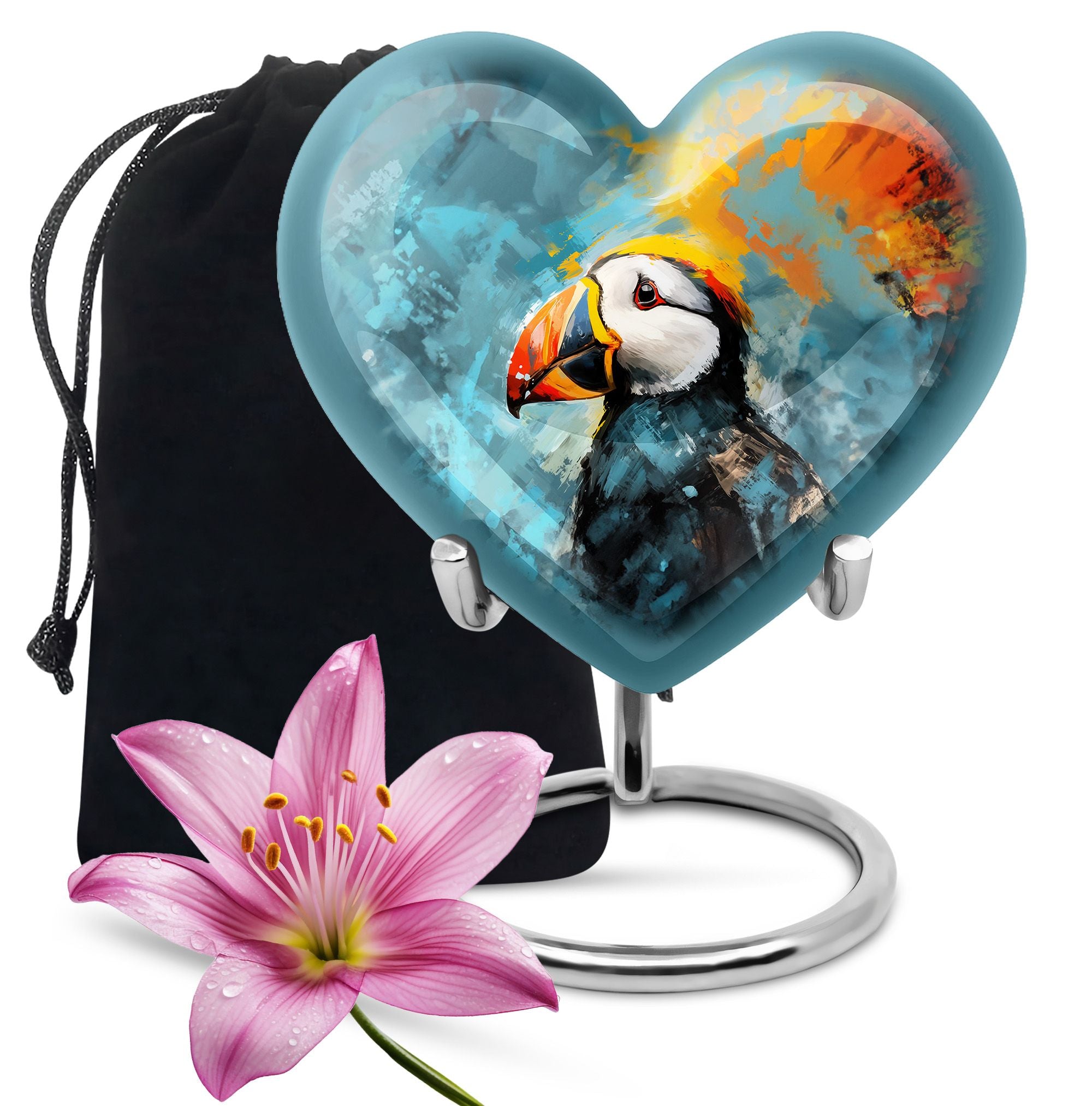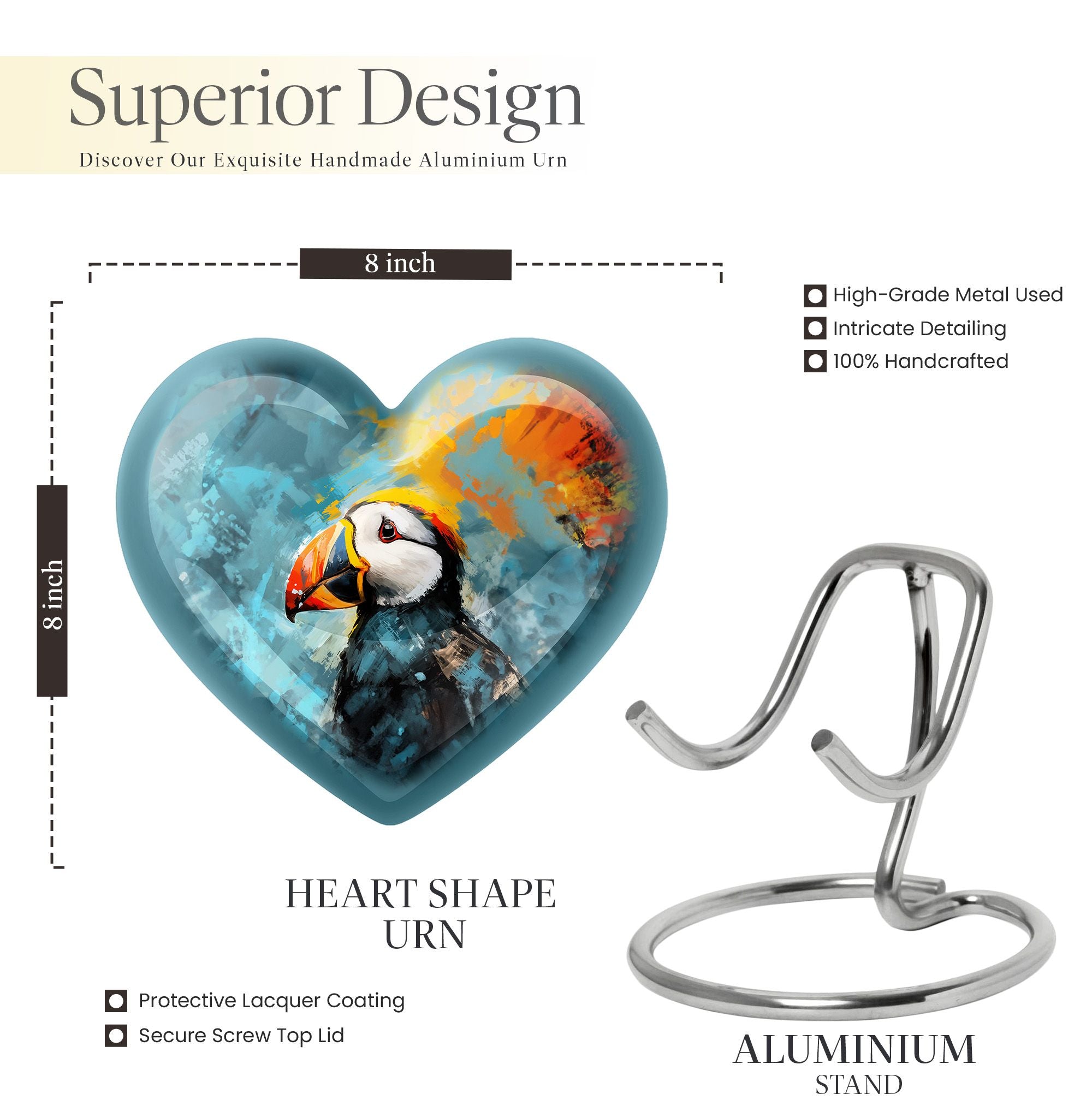 Elevate your remembrance ceremonies with the Puffin Bird Urn, a tasteful choice in the realm of memorial adult urns. Expertly crafted from a high-grade aluminium, this 10-inch heart urn stands out with an appealing size and profound dignity. Enclosed within its generous 200 cubic inches of capacity, your cherished one's ashes will be respectfully contained in a velvet pouch, a notable attribute of this thoughtful product. Weighing 3.3 pounds, it embodies significant stability as part of its design. Recognizing the importance of individual sentiment, this urn offers the facility to customize and personalize with engraved names, adding a heartfelt touch. Navigating through your grieve, the Puffin Bird Urn, seamlessly blends functionality and profound symbolism in its form. Particularly aimed at adults and seniors, it offers an Abstract themed touch to the mourning process. This product is part of a broader range of cremation containers for human ashes and funeral burial urns and has been created with sensitivity and respect in mind. Consider the Puffin Bird Urn for a dignified, poignant, and personal memorial ceremony.