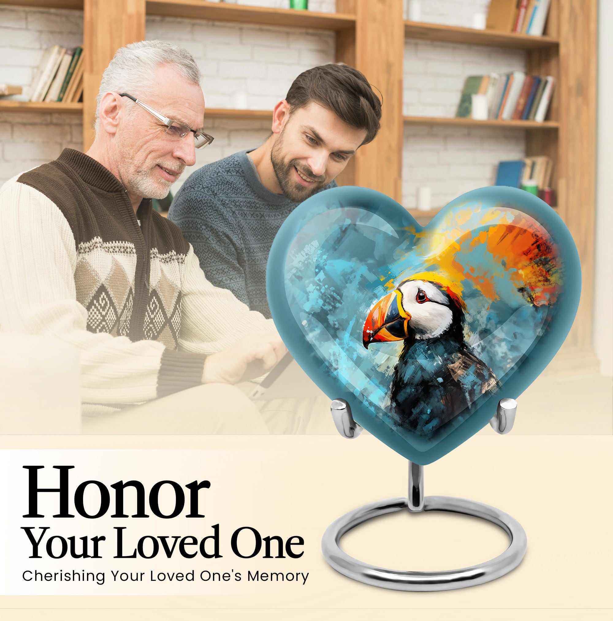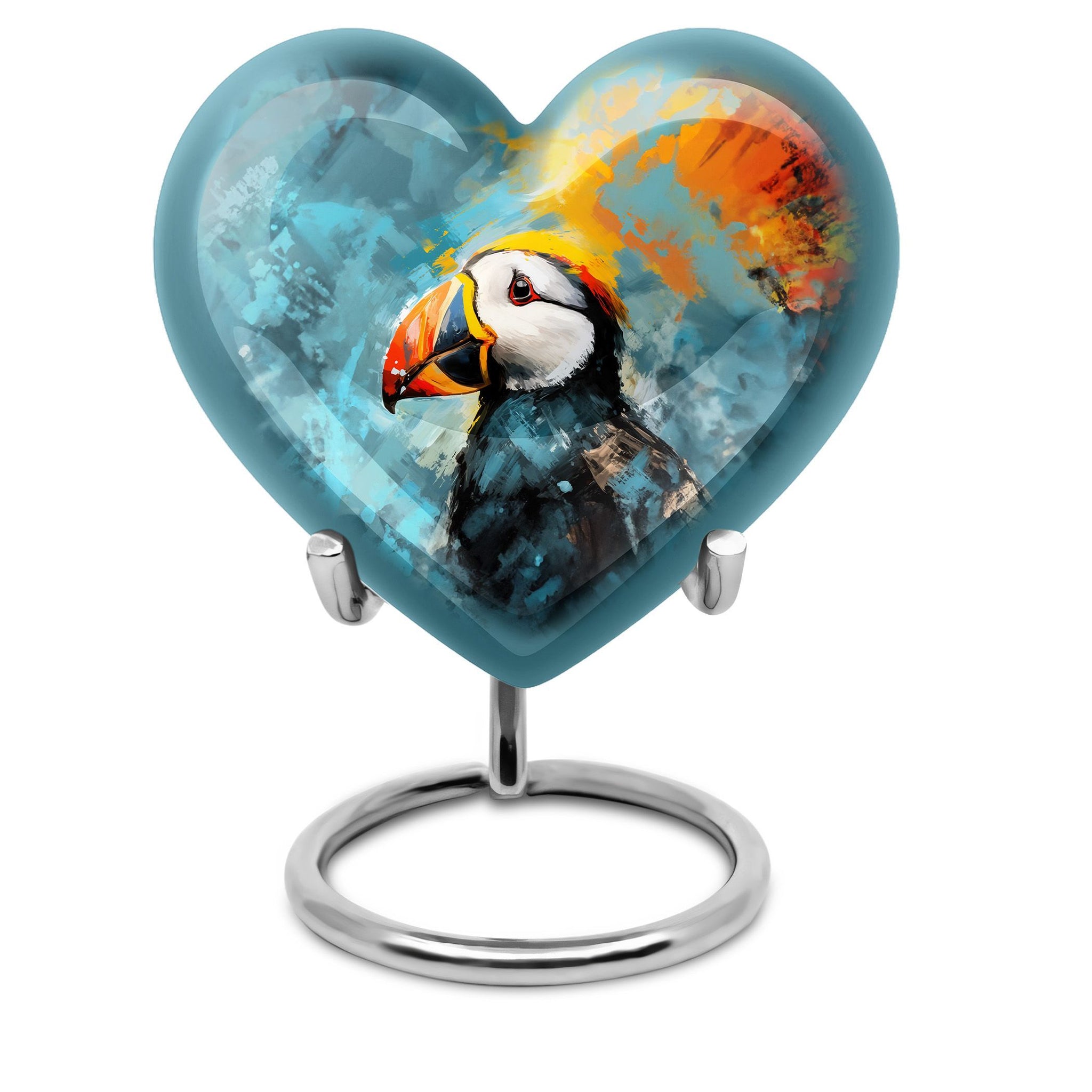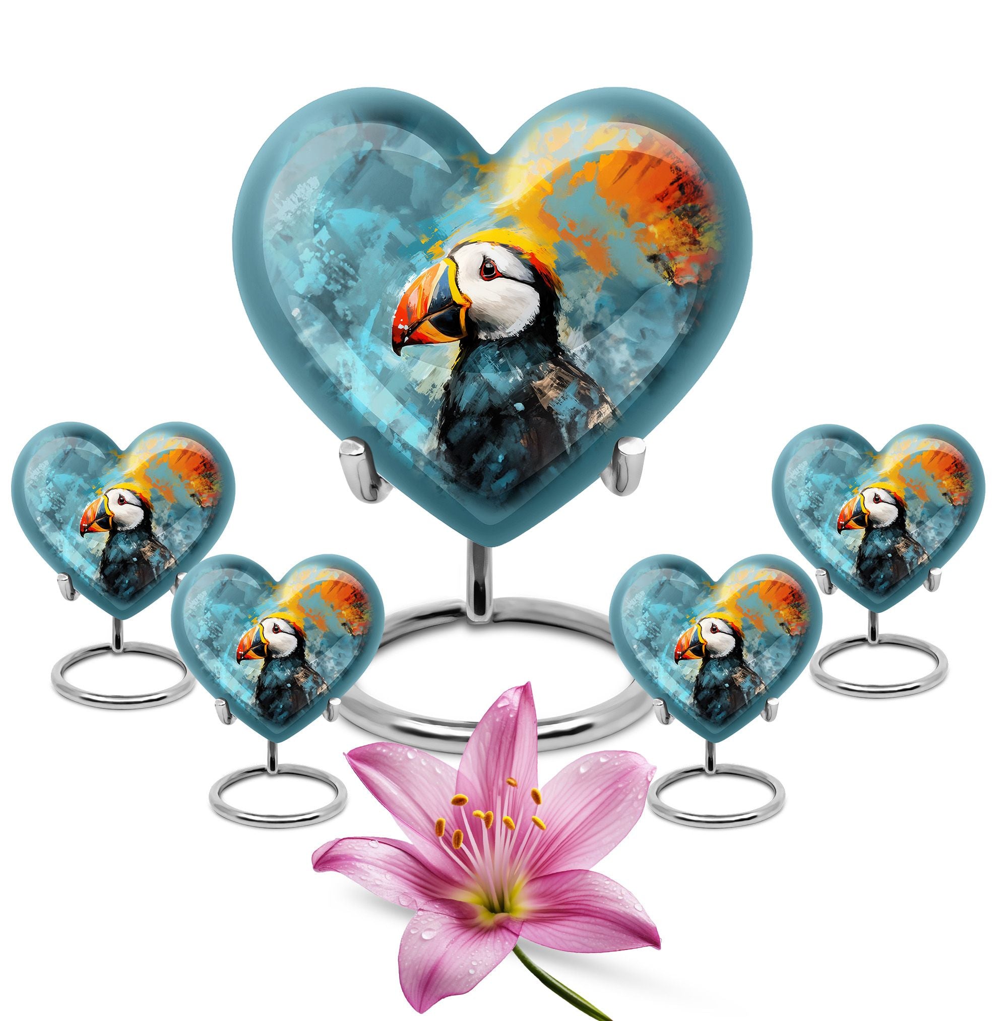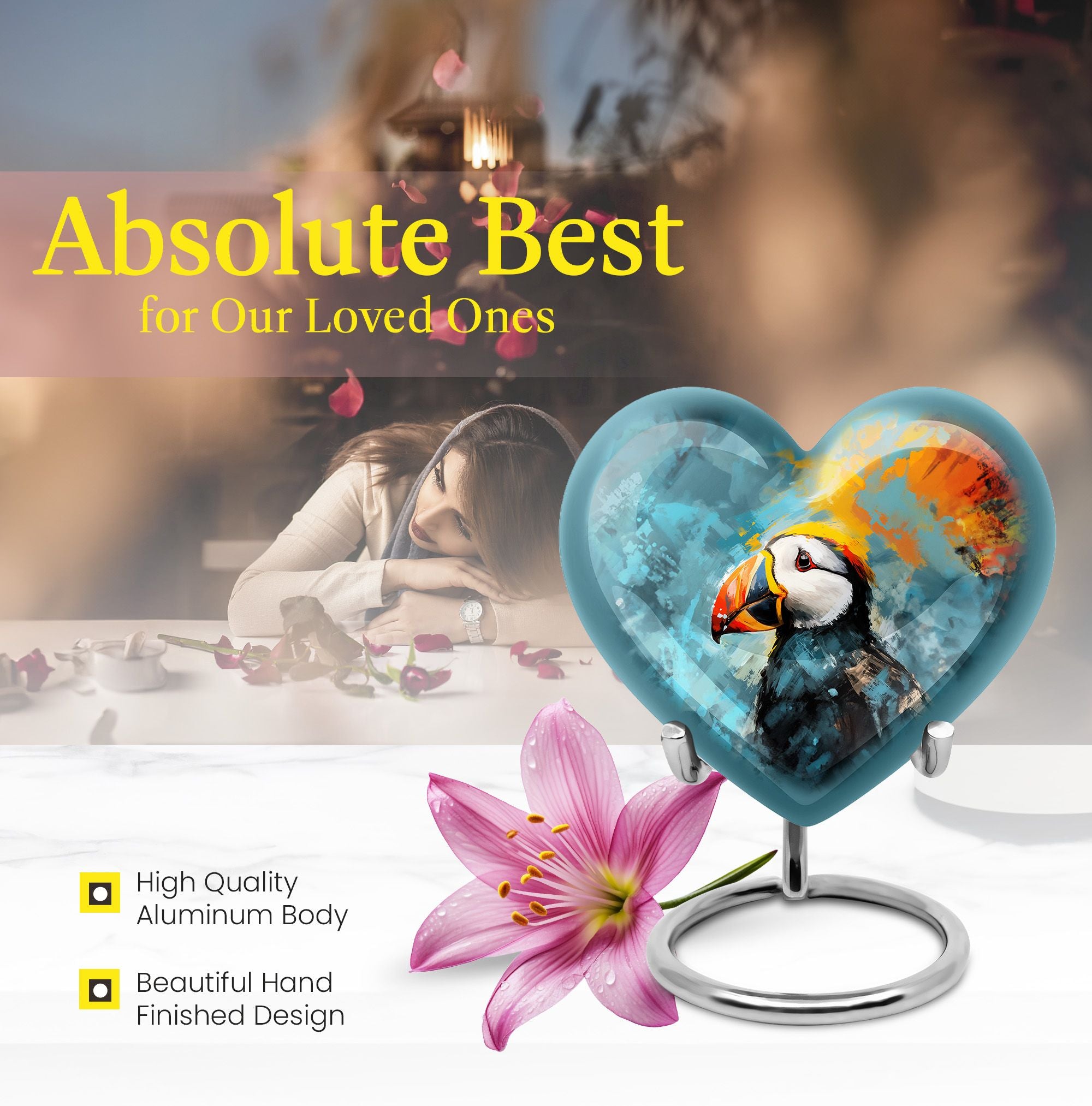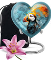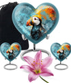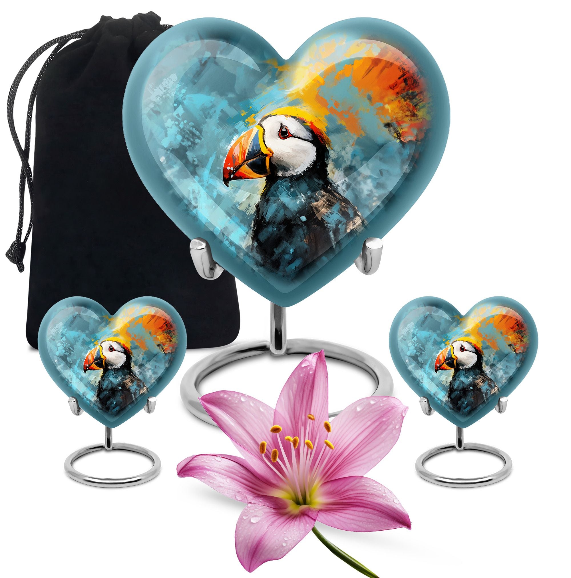 Elevate your remembrance ceremonies with the Puffin Bird Urn, a tasteful choice in the realm of memorial adult urns. Expertly crafted from a high-grade aluminium, this 10-inch heart urn stands out with an appealing size and profound dignity. Enclosed within its generous 200 cubic inches of capacity, your cherished one's ashes will be respectfully contained in a velvet pouch, a notable attribute of this thoughtful product. Weighing 3.3 pounds, it embodies significant stability as part of its design. Recognizing the importance of individual sentiment, this urn offers the facility to customize and personalize with engraved names, adding a heartfelt touch. Navigating through your grieve, the Puffin Bird Urn, seamlessly blends functionality and profound symbolism in its form. Particularly aimed at adults and seniors, it offers an Abstract themed touch to the mourning process. This product is part of a broader range of cremation containers for human ashes and funeral burial urns and has been created with sensitivity and respect in mind. Consider the Puffin Bird Urn for a dignified, poignant, and personal memorial ceremony.