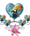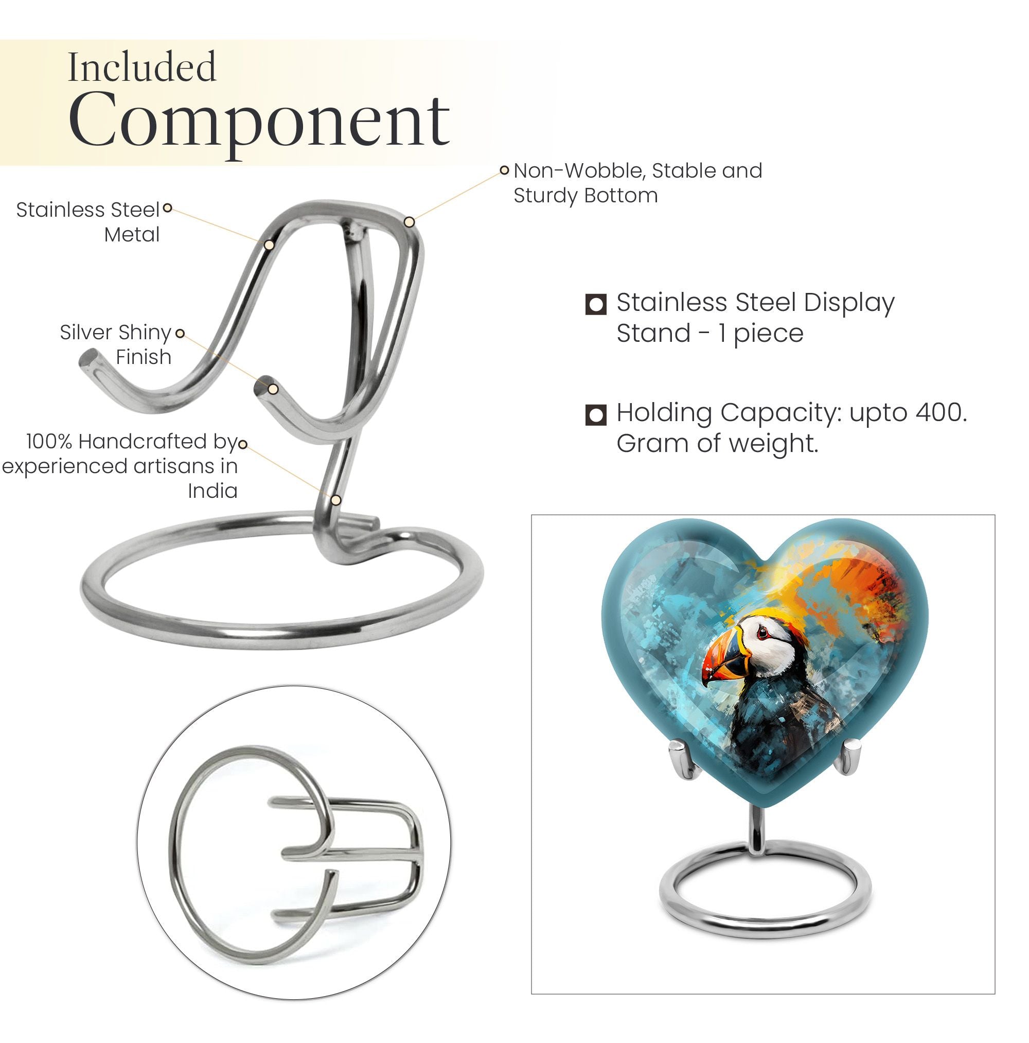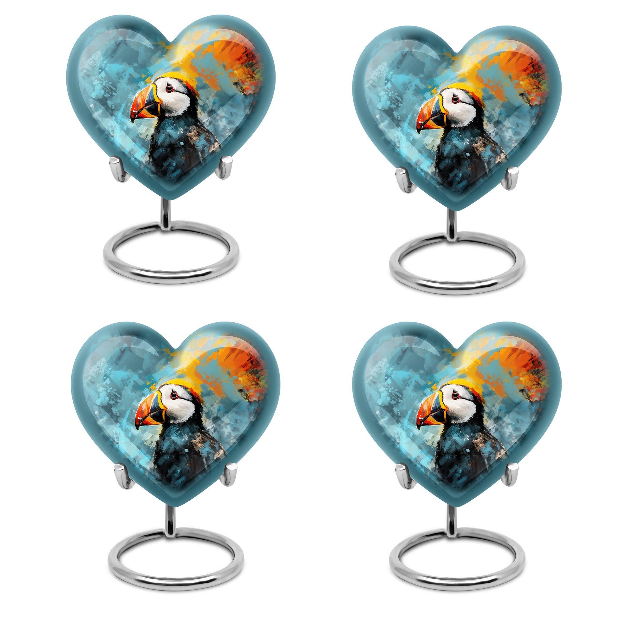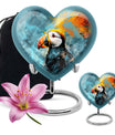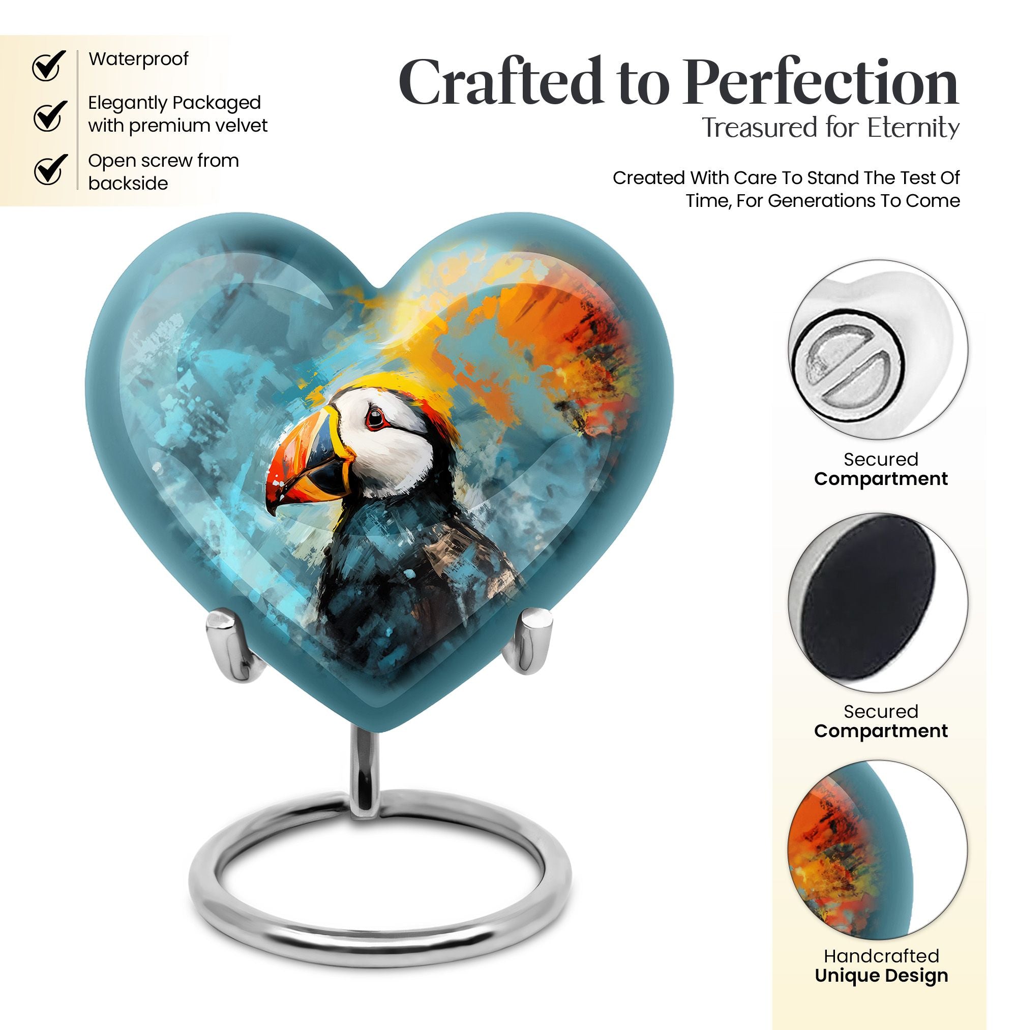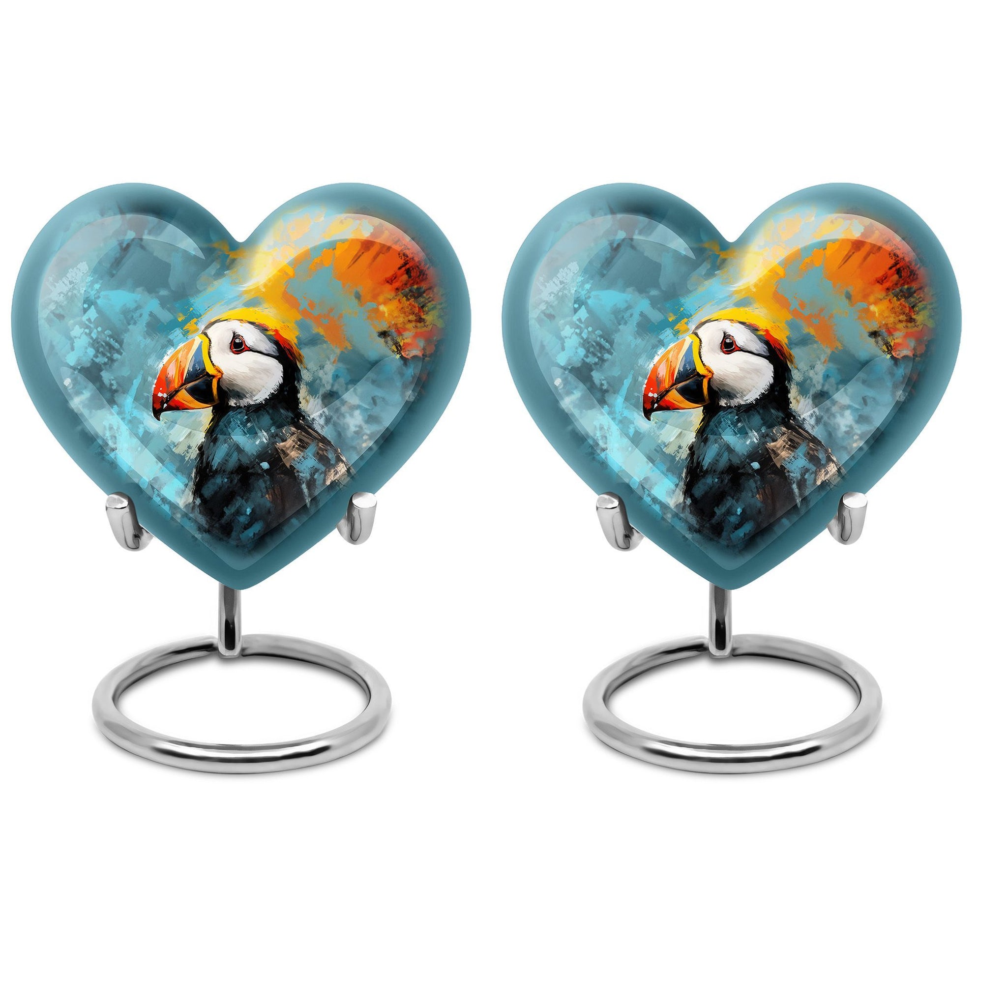 Elevate your remembrance ceremonies with the Puffin Bird Urn, a tasteful choice in the realm of memorial adult urns. Expertly crafted from a high-grade aluminium, this 10-inch heart urn stands out with an appealing size and profound dignity. Enclosed within its generous 200 cubic inches of capacity, your cherished one's ashes will be respectfully contained in a velvet pouch, a notable attribute of this thoughtful product. Weighing 3.3 pounds, it embodies significant stability as part of its design. Recognizing the importance of individual sentiment, this urn offers the facility to customize and personalize with engraved names, adding a heartfelt touch. Navigating through your grieve, the Puffin Bird Urn, seamlessly blends functionality and profound symbolism in its form. Particularly aimed at adults and seniors, it offers an Abstract themed touch to the mourning process. This product is part of a broader range of cremation containers for human ashes and funeral burial urns and has been created with sensitivity and respect in mind. Consider the Puffin Bird Urn for a dignified, poignant, and personal memorial ceremony.
