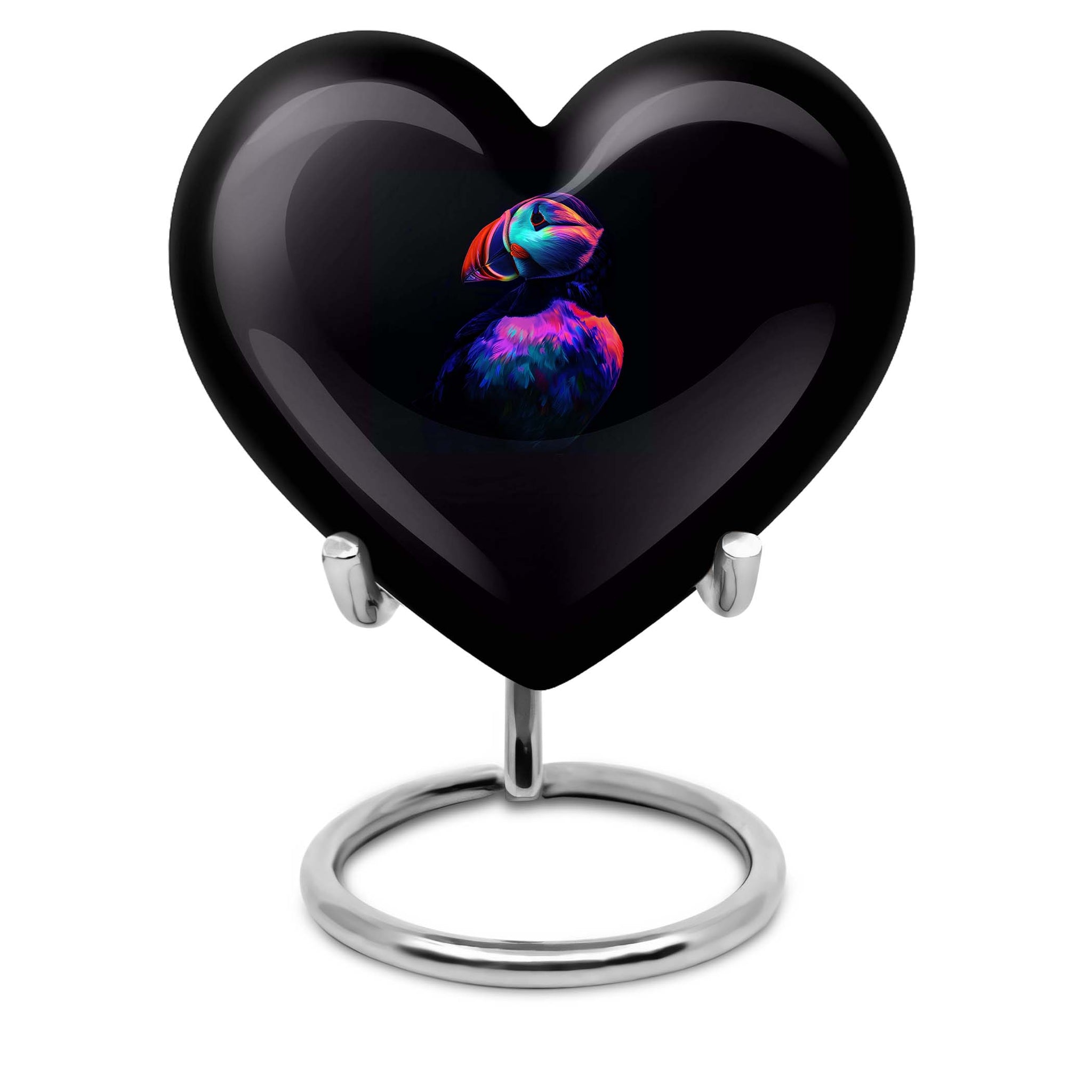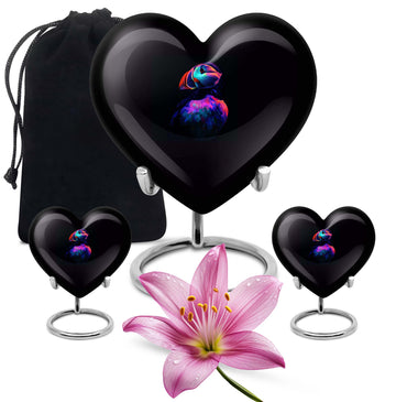 Seek solace in the thought of eternal peace for your loved one with the unique Puffin Bird Urn. Resembling the heart's undying love, this memorial urn is crafted from resilient aluminium, ensuring long-lastingness. It sports an abstract theme that transcends traditional bounds, adding a touch of enigma and interest to this resting place for cremation ashes. Digitized at a size of 10 inches, it comfortably holds up to 200 cubic inches of ashes, making it a practicable choice for adult male ashes. The convenient weight of 3.3 pounds adds stability, while the heart urn doesn't fall back on style either. Customization facilities are readily available to personalize the urn with engraved names, creating an everlasting tribute. Be it for your mother or any loved one, this burial urn can aptly fit into urban homes acting as a subtle decor. It also comes with a velvet pouch for containment of ashes, ensuring careful preservation during these poignant times. So, entrust the memories of your cherished ones in this compact urn - a symbol of eternal love and respect.