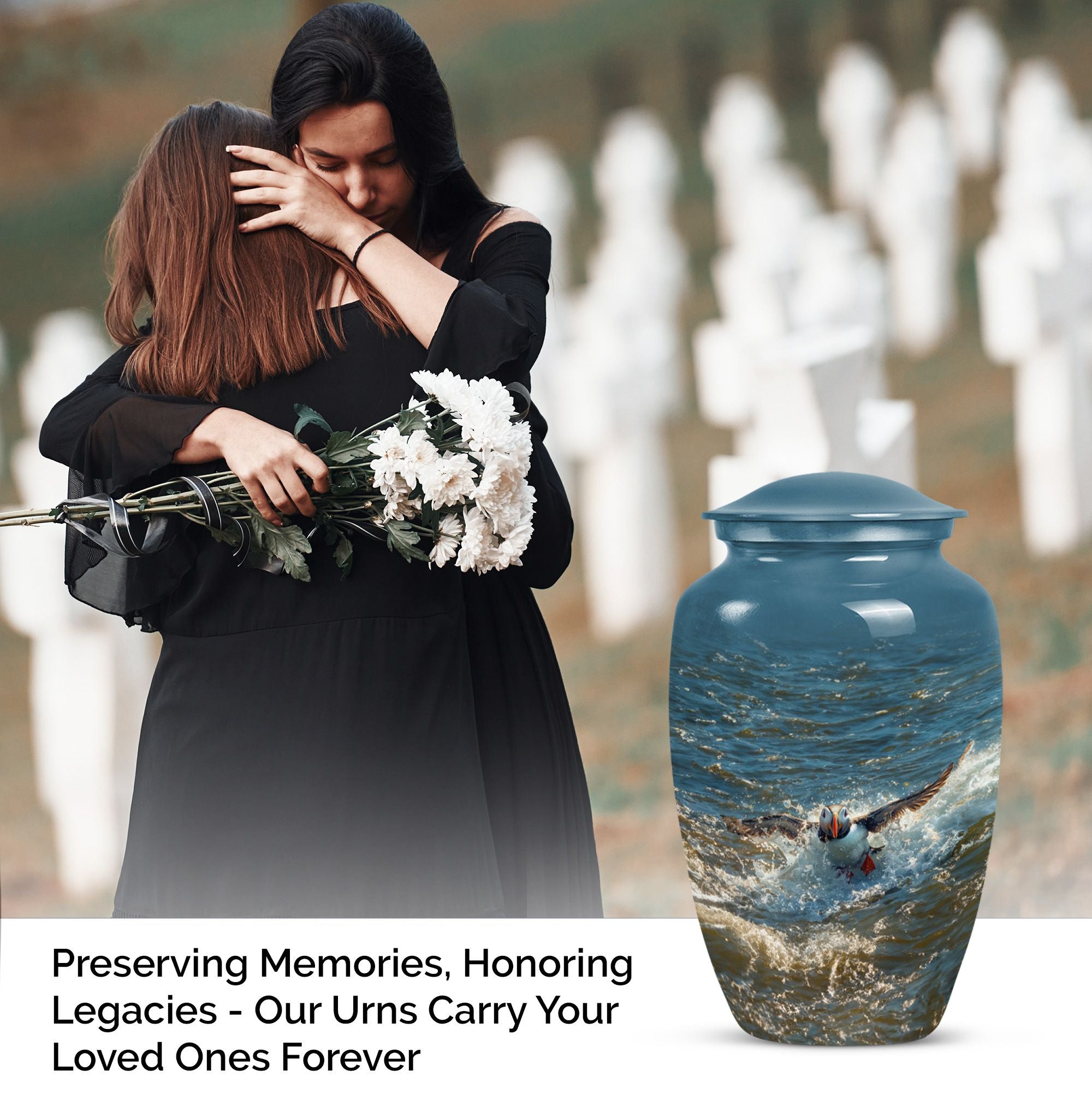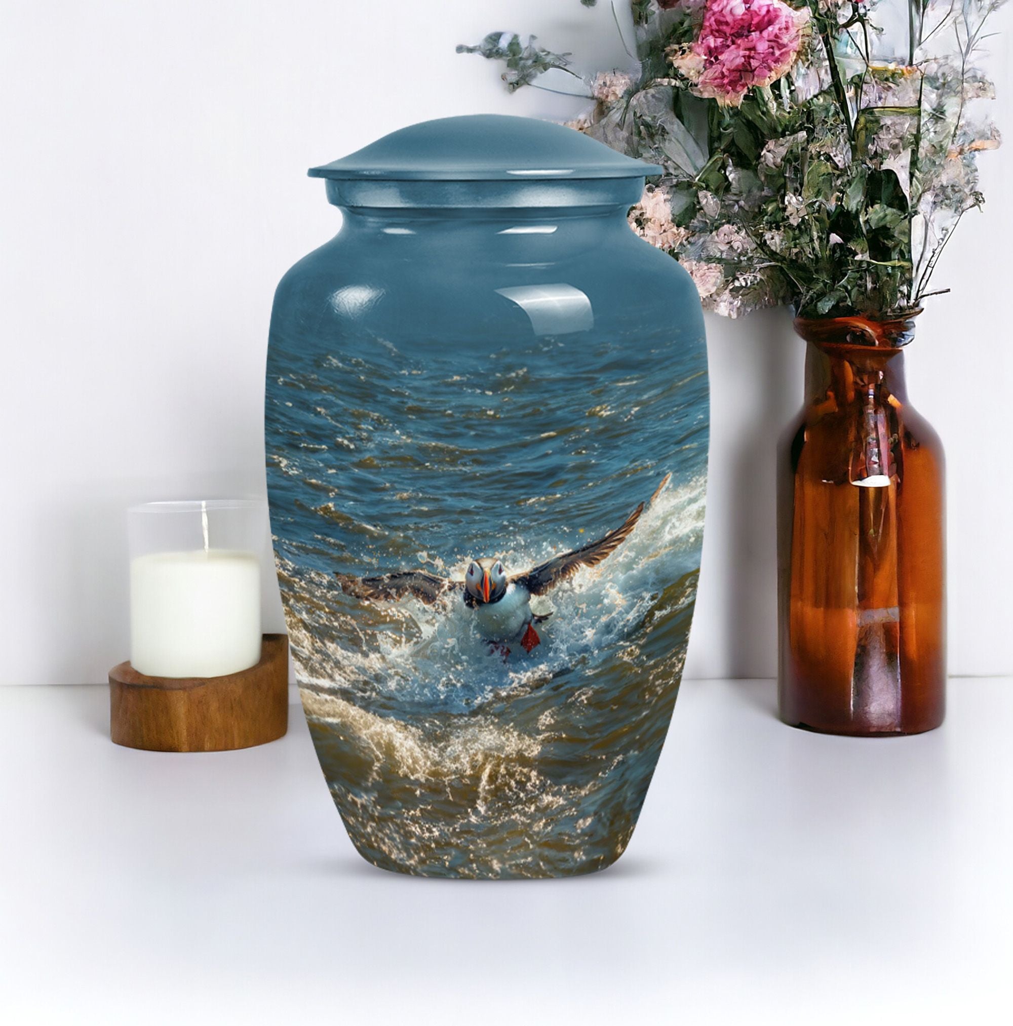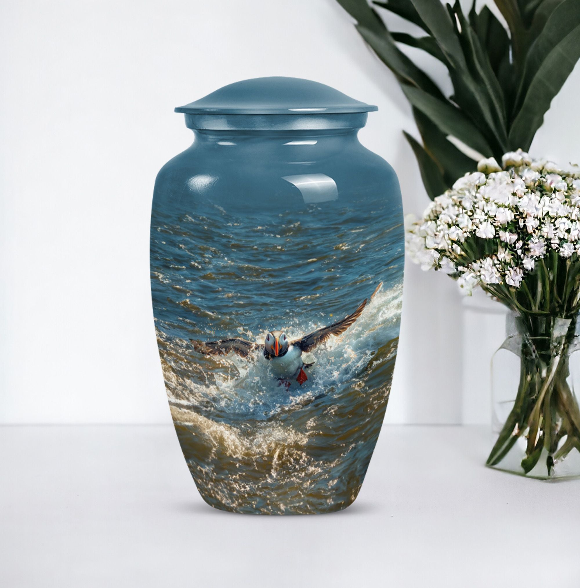 Discover serenity with our Puffin Bird Urn, a symbol of peace and beauty during a time of loss. This burial ash urn is designed for adults, skillfully crafted from quality aluminium to ensure durability. With a size of 10 inches and weight of 3.3 pounds, it exudes an undeniable presence. The capacity to hold up to 200 cubic inches of cremation ashes makes it an ideal choice for honoring your loved ones. Plus, you can make it more personal by engraving the names. This large urn comes with a velvet pouch for safe containment and respectful handling of the ashes. The choice of material and the elegant Puffin Bird theme adds to its grace. Whether you're searching for cremation urns for adult female ashes, urn for human ash adult male, or cremation urn for adult ashes men, this memorial urn is a lasting tribute to your beloved.