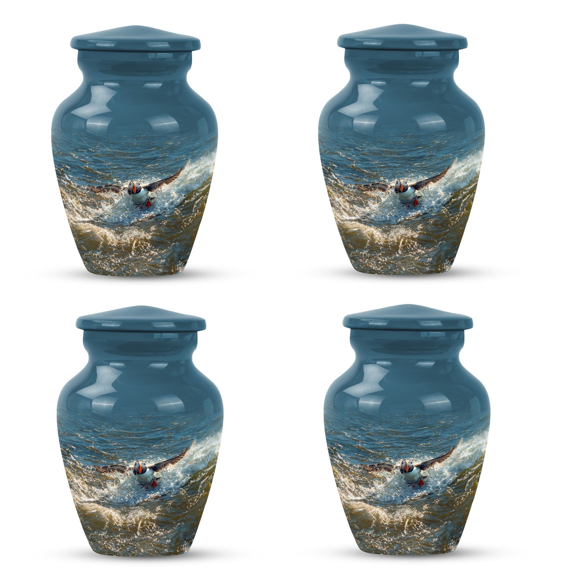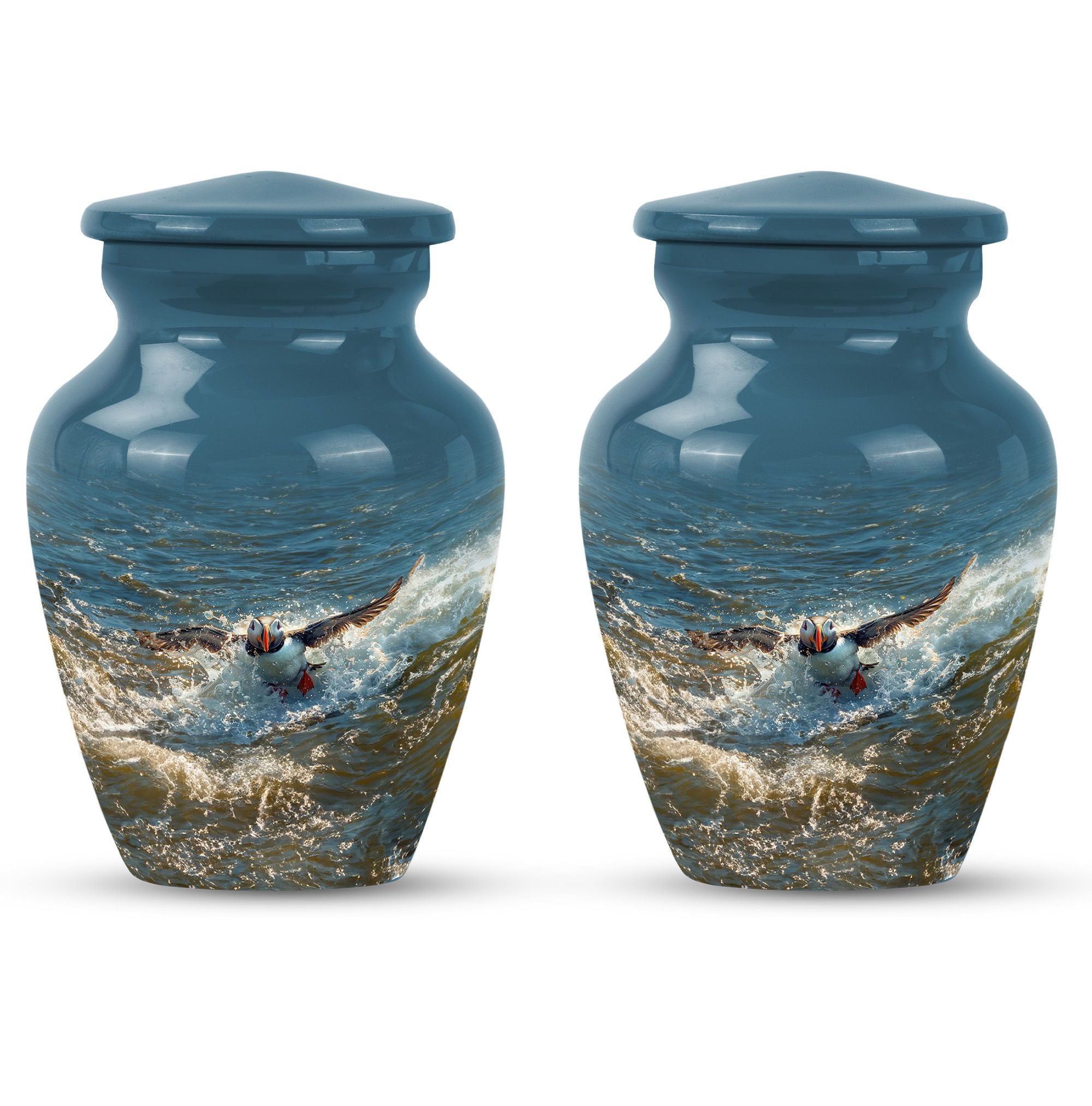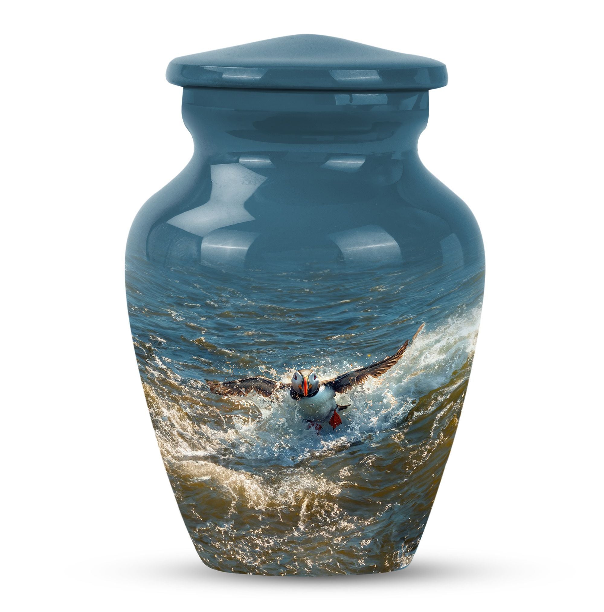 Discover serenity with our Puffin Bird Urn, a symbol of peace and beauty during a time of loss. This burial ash urn is designed for adults, skillfully crafted from quality aluminium to ensure durability. With a size of 10 inches and weight of 3.3 pounds, it exudes an undeniable presence. The capacity to hold up to 200 cubic inches of cremation ashes makes it an ideal choice for honoring your loved ones. Plus, you can make it more personal by engraving the names. This large urn comes with a velvet pouch for safe containment and respectful handling of the ashes. The choice of material and the elegant Puffin Bird theme adds to its grace. Whether you're searching for cremation urns for adult female ashes, urn for human ash adult male, or cremation urn for adult ashes men, this memorial urn is a lasting tribute to your beloved.