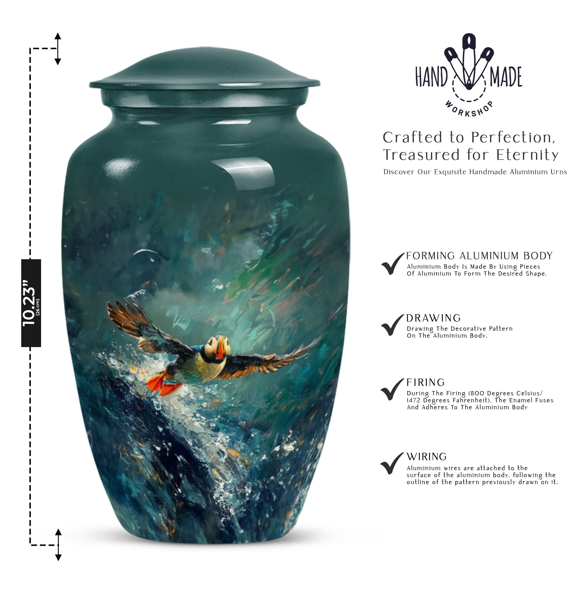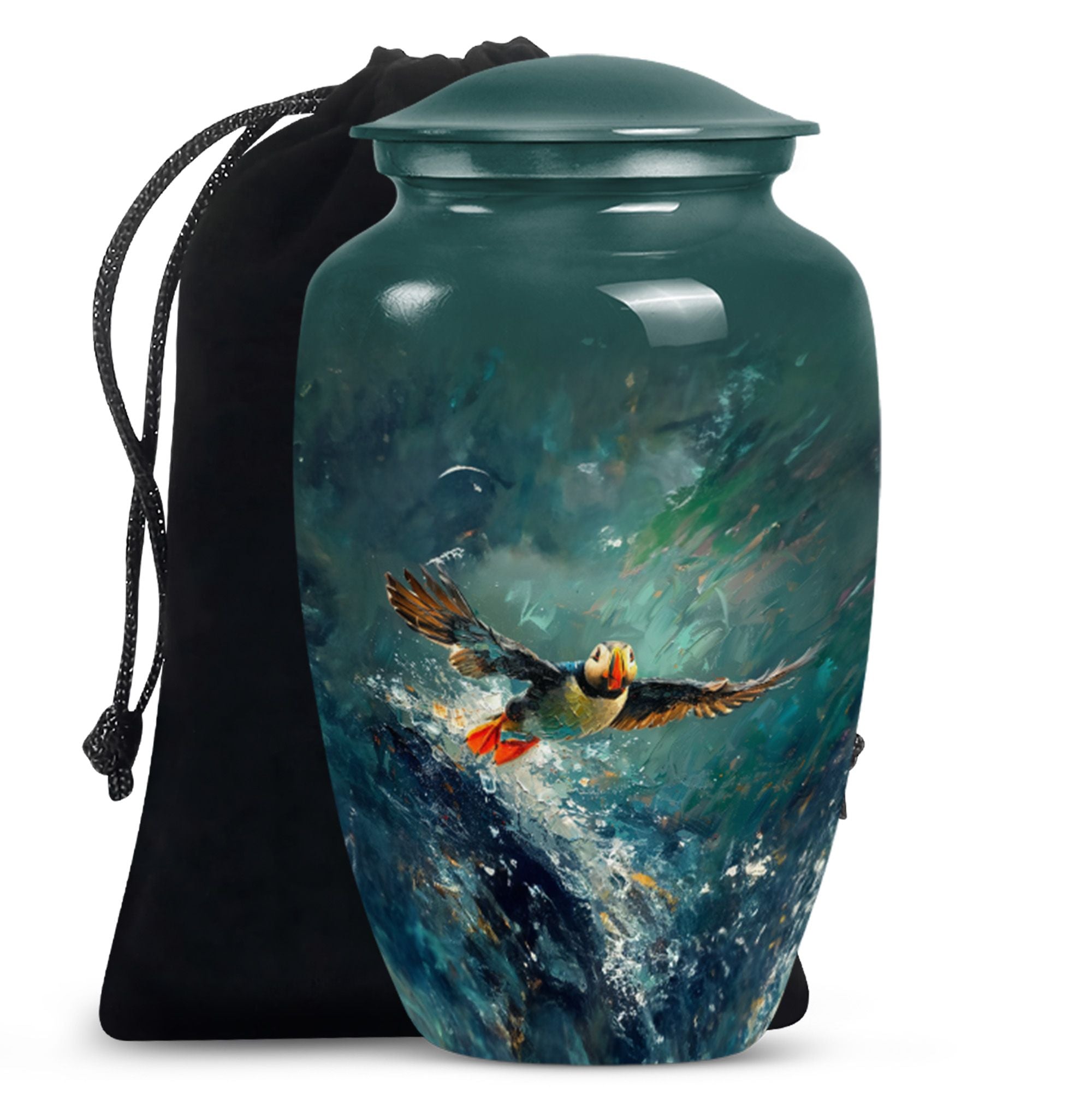 Remember and honor a loved one with our Puffin Bird Urn. This funeral medium size urn for human ashes is not just a burial vessel, but a beautifully wrought keepsake to cherish. Engineered with aluminium, it exhibits an impressive longevity and scale, showing exceptional dimensional properties at 10 inches in height and the weight at 3.3 pounds. This Urn can't help but stand out with its Puffin Bird theme that beautifully captures the essence of a well-lived life. Its capacity to harbor a substantial 200 cubic inches of ashes ensures versatility of use – ranging from an adult to a medium-sized capacity. The cremation urn comes packed in a charming velvet pouch, providing an elegant containment for your loved one's precious ashes. Add a final touch of personalization to this large urn by engraving names, making the memory of your dear one everlasting. This Puffin Bird Urn serves as a perfect selection meeting your need for Memorial medium urn, or urns for cremation.
