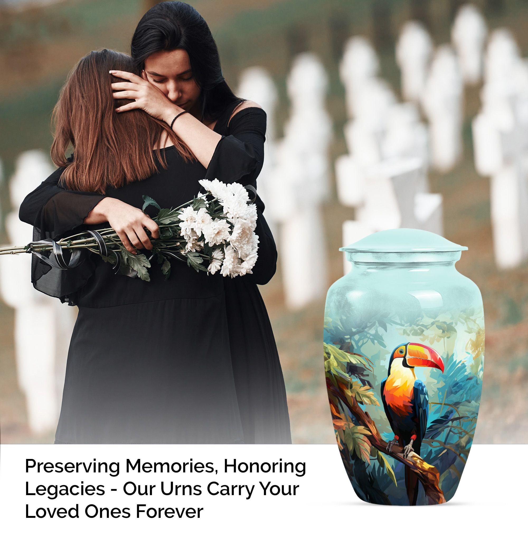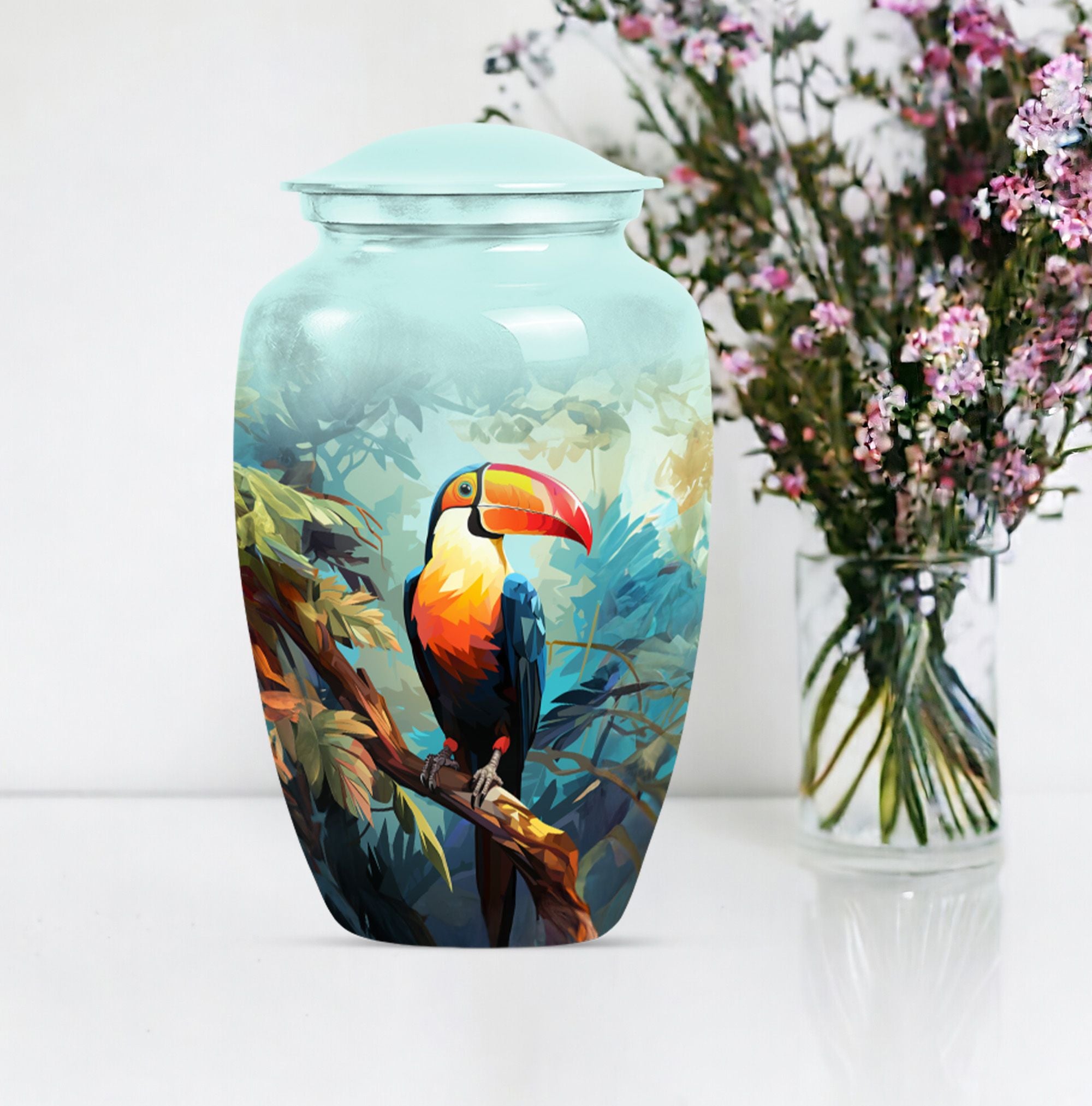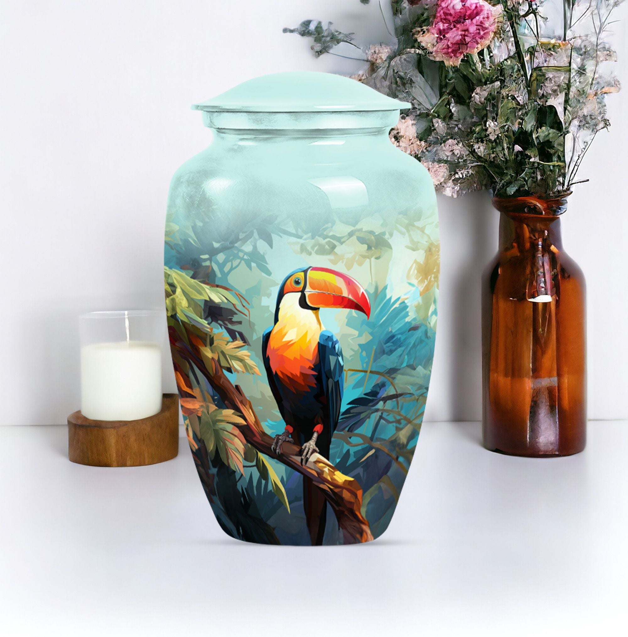 Honor your loved one's memory with the 'Puffin Bird Urn', a unique memorial adult urn fashioned from enduring aluminium. This funeral urn for mom, standing 10 inch tall, showcases a classic urn style, bathed in an abstract theme that echoes both elegance and resonance. With a capacity of 200 cubic inches, this cremation urn comfortably holds the ashes securely, with 3.3 pounds in weight, signifying its sturdy construction. Adding a touch of personal meaning, the urn allows for the engraving of names, creating a lasting homage for your loved one. Included with the large urn is a soft velvet pouch, designed for safe containment of ashes. From 'human urn ash adult' to 'custom cremation urns', its unique terminology reflects its distinct specialty. For those searching in the 'Memorial Ceremony Supplies' category, the 'Puffin Bird Urn' represents an enduring symbol of remembrance.