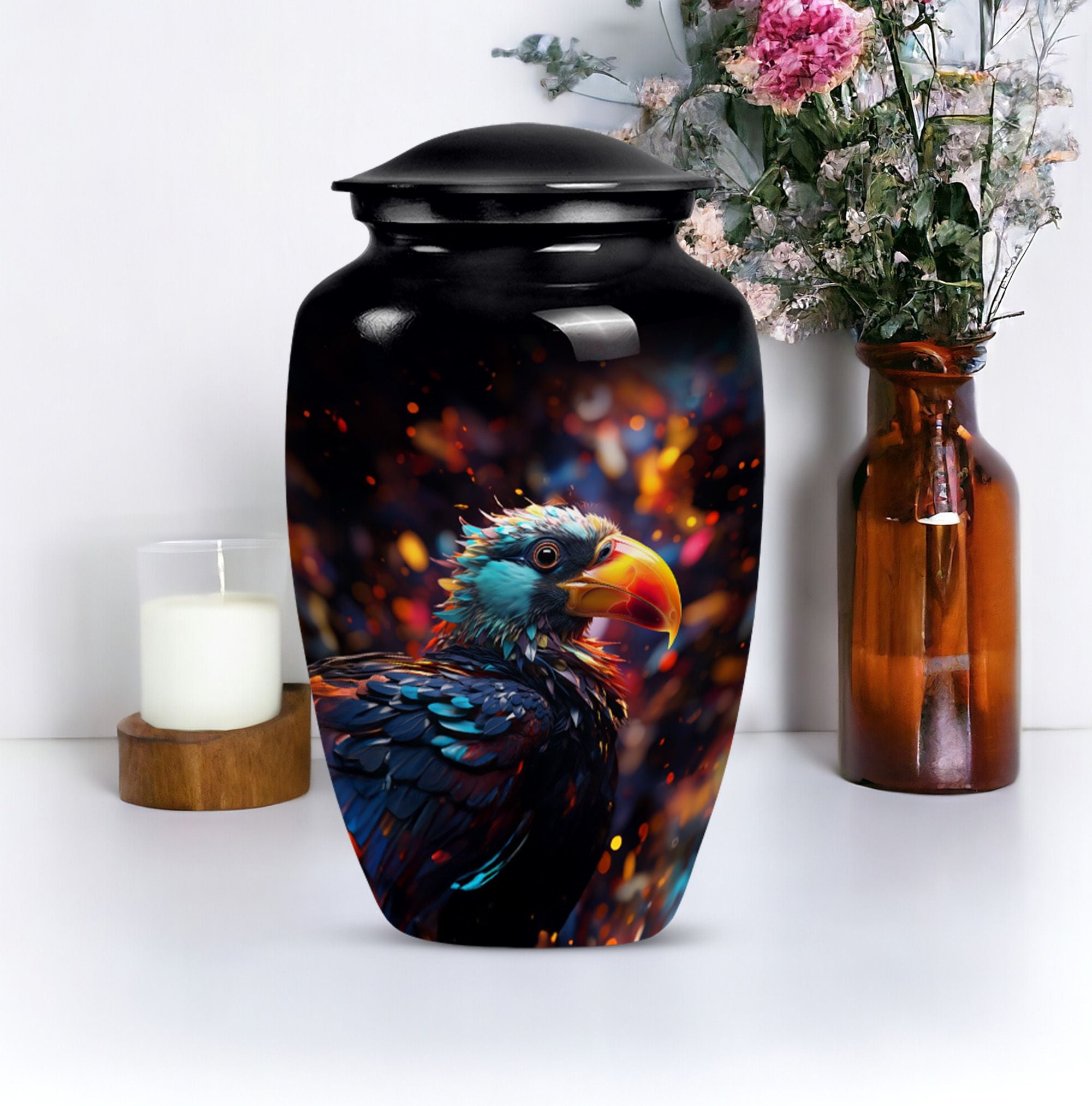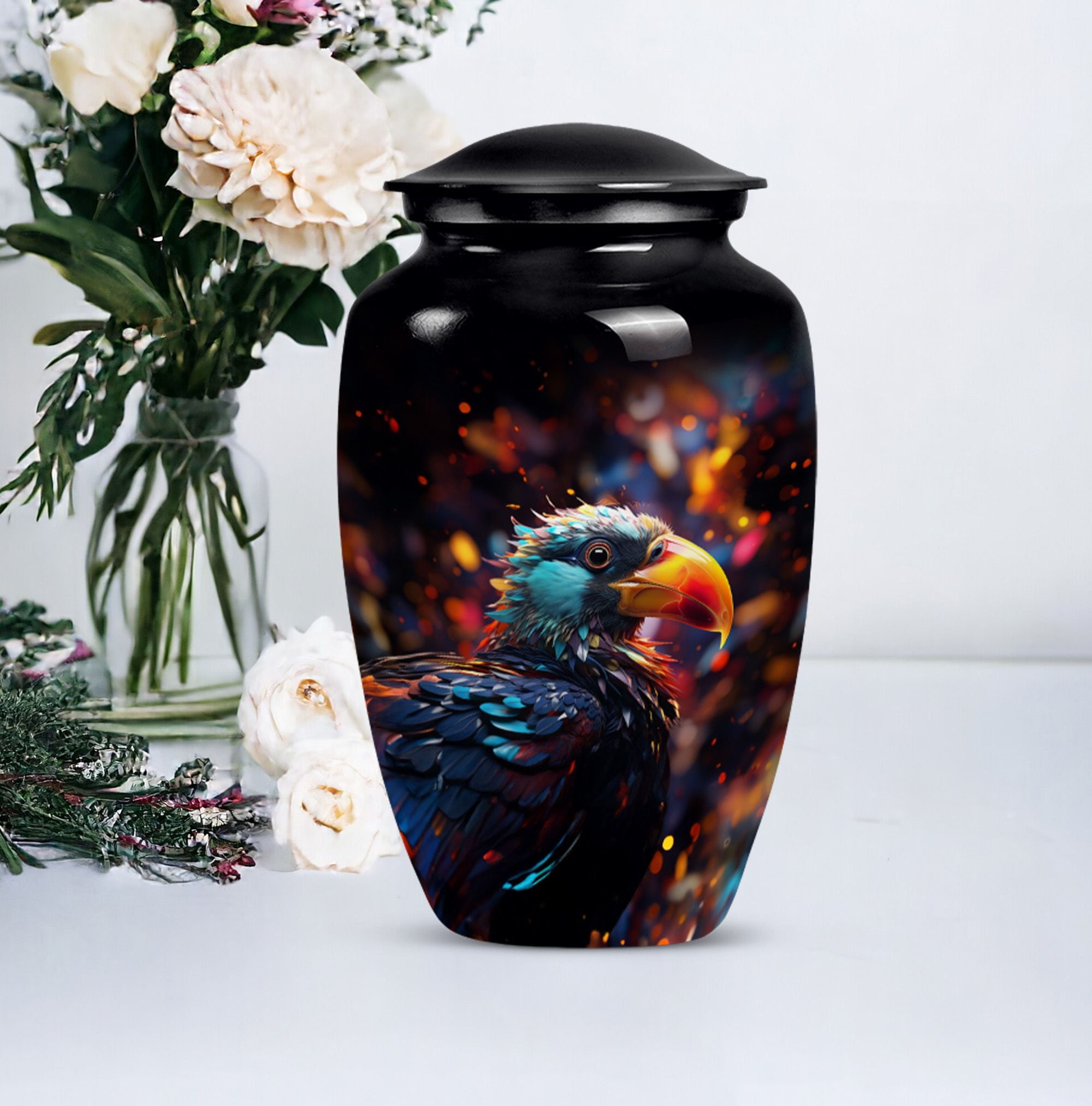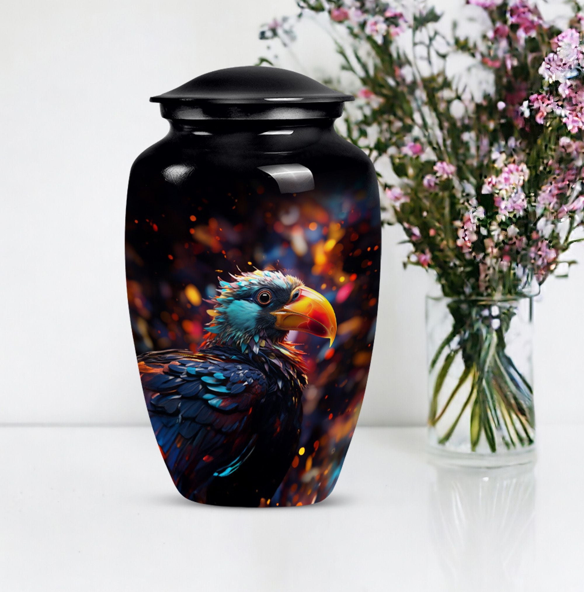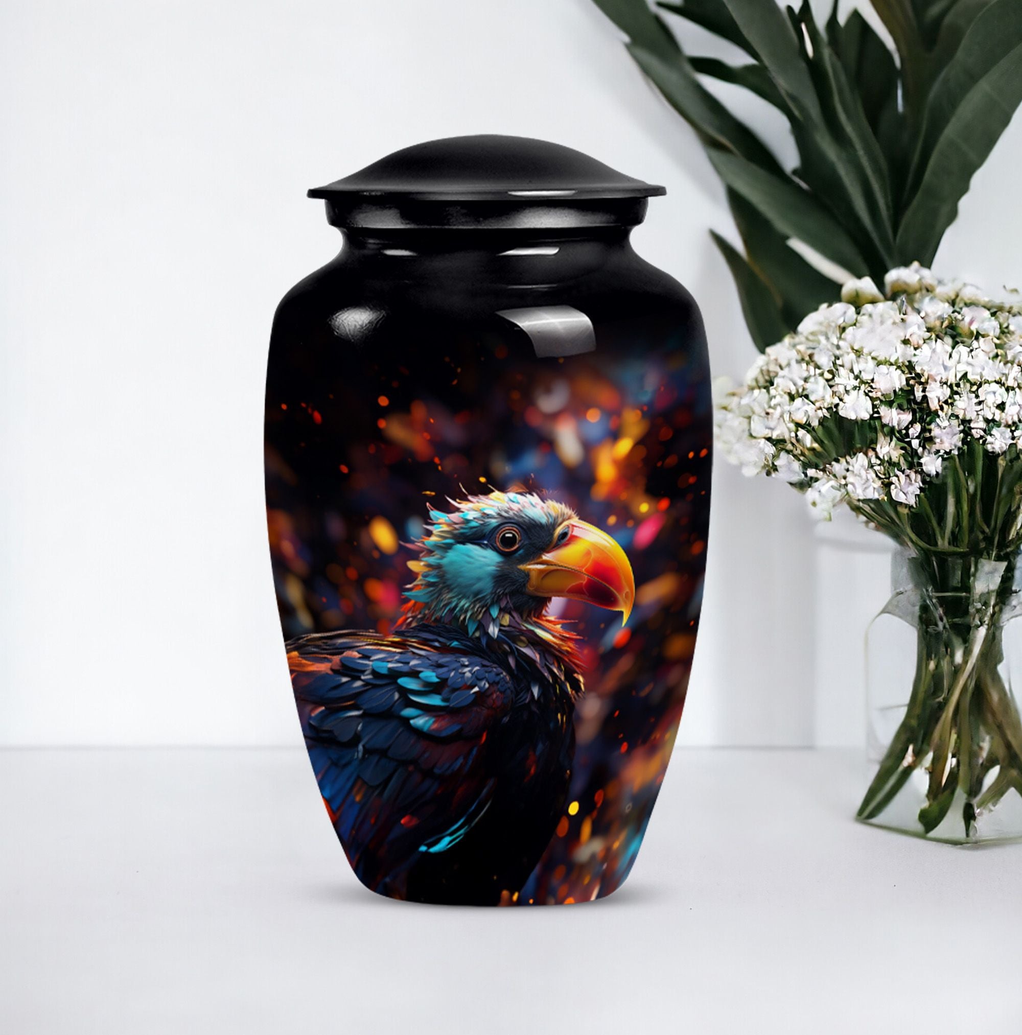 Immerse in the peace of loving remembrance with our Puffin Bird Urn, a one of a kind large urn excellently crafted from high-quality aluminium. With a size of 10 inches in height and a weight of 3.3 pounds, it offers a will-fit capacity of 200 cubic inches, making it the right choice as a cremation urn for your dad. The thoughtfully packaged velvet pouch contributes to the dignified containment of your loved one's ashes. To make the memorial even more poignant, our Puffin Bird Urn facilitates personalization with engraved names, bearing testament to your equally unique and enduring bond. With a classic urn theme, this product is not only an incredible piece of craftsmanship but also an object of serene beauty that speaks volumes about your special connection with the dearly departed. So, whether your need is burial ash urns for humans or urn for human ashes, our cremation urn is the lasting memory you seek. It's time to locate our memorial urns, and let the comforting embrace of remembrance touch your soul.