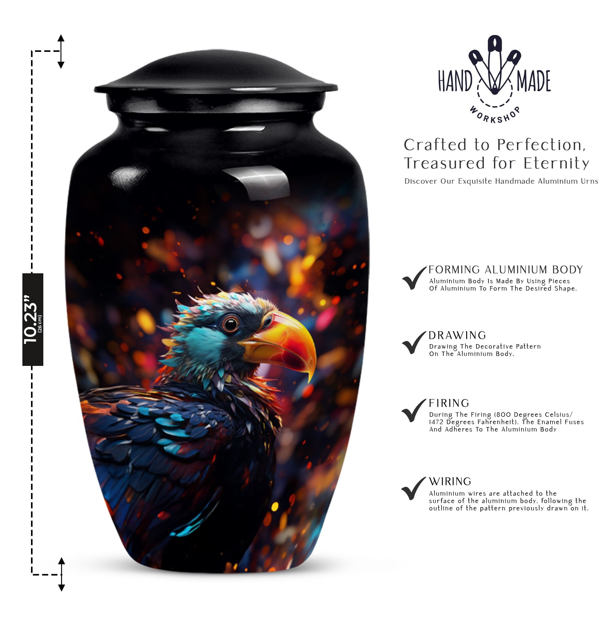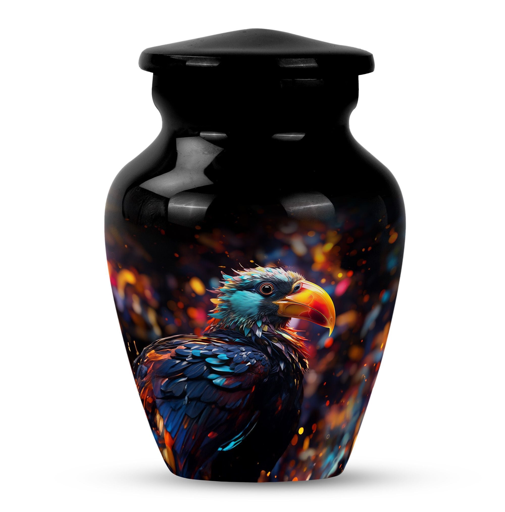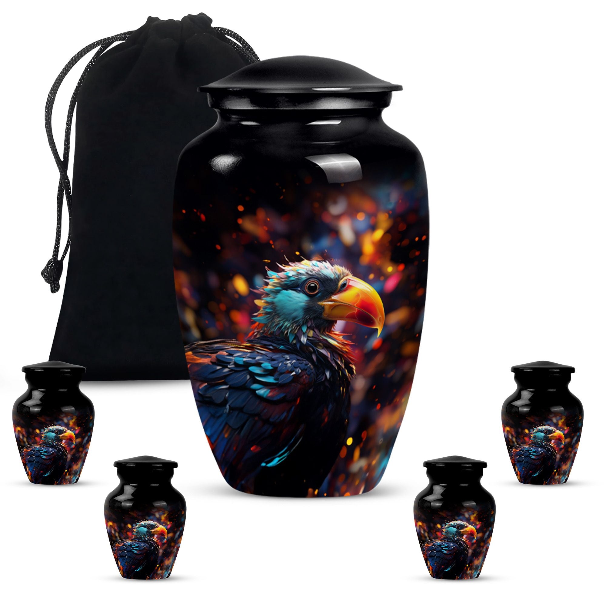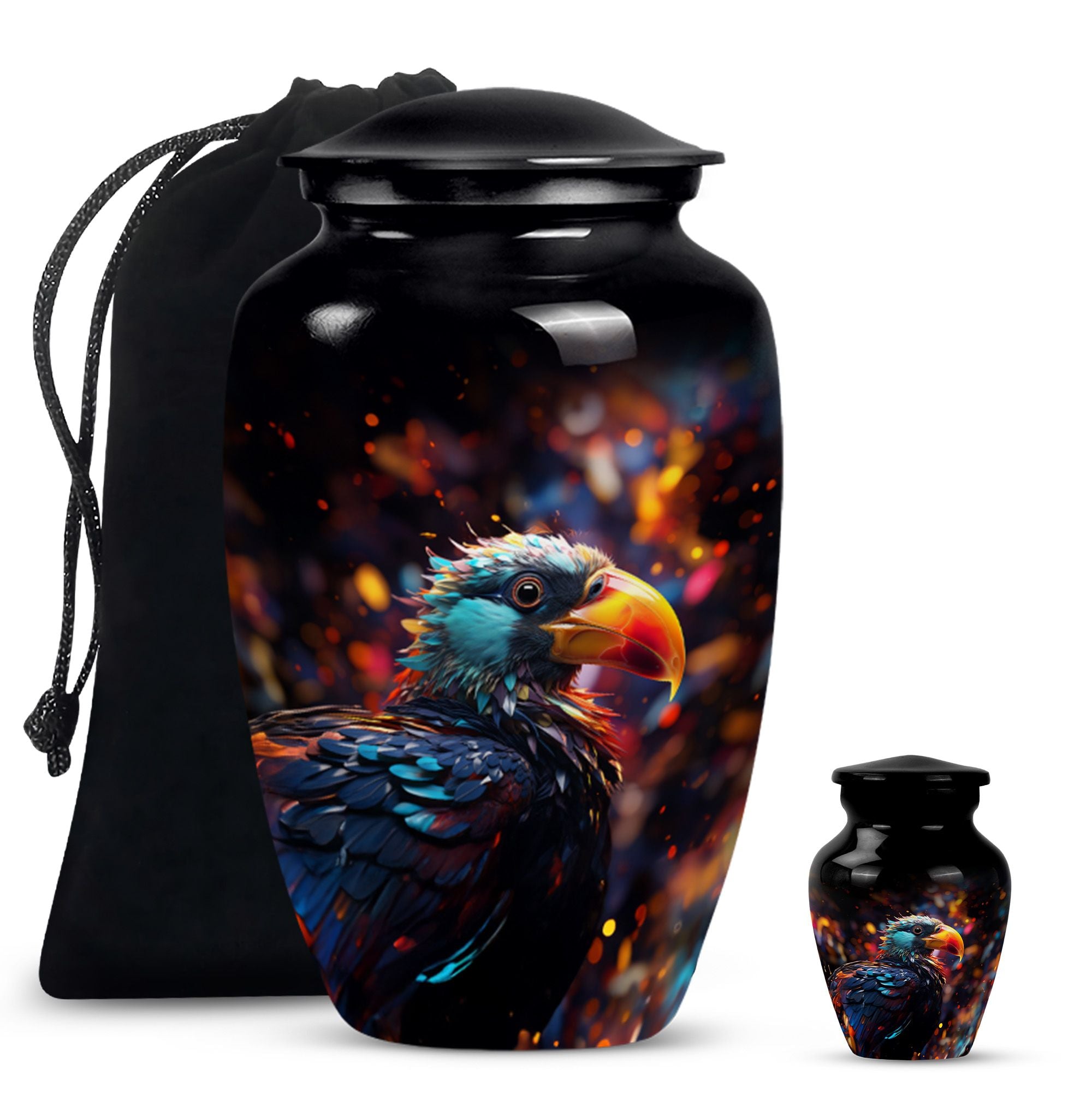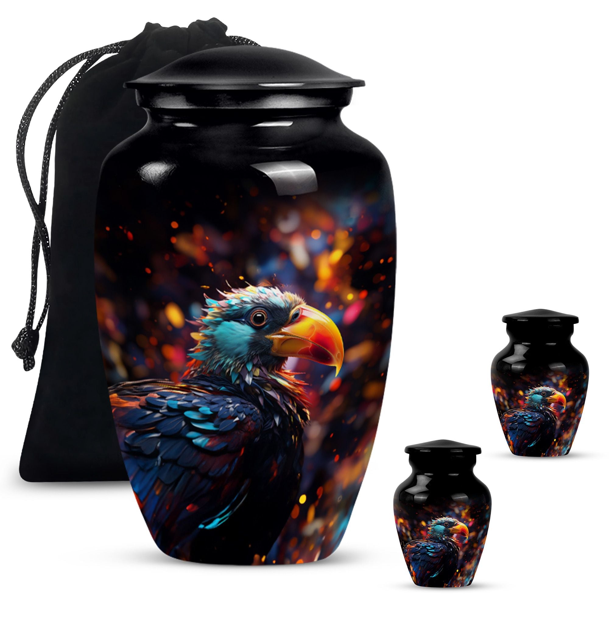 Immerse in the peace of loving remembrance with our Puffin Bird Urn, a one of a kind large urn excellently crafted from high-quality aluminium. With a size of 10 inches in height and a weight of 3.3 pounds, it offers a will-fit capacity of 200 cubic inches, making it the right choice as a cremation urn for your dad. The thoughtfully packaged velvet pouch contributes to the dignified containment of your loved one's ashes. To make the memorial even more poignant, our Puffin Bird Urn facilitates personalization with engraved names, bearing testament to your equally unique and enduring bond. With a classic urn theme, this product is not only an incredible piece of craftsmanship but also an object of serene beauty that speaks volumes about your special connection with the dearly departed. So, whether your need is burial ash urns for humans or urn for human ashes, our cremation urn is the lasting memory you seek. It's time to locate our memorial urns, and let the comforting embrace of remembrance touch your soul.