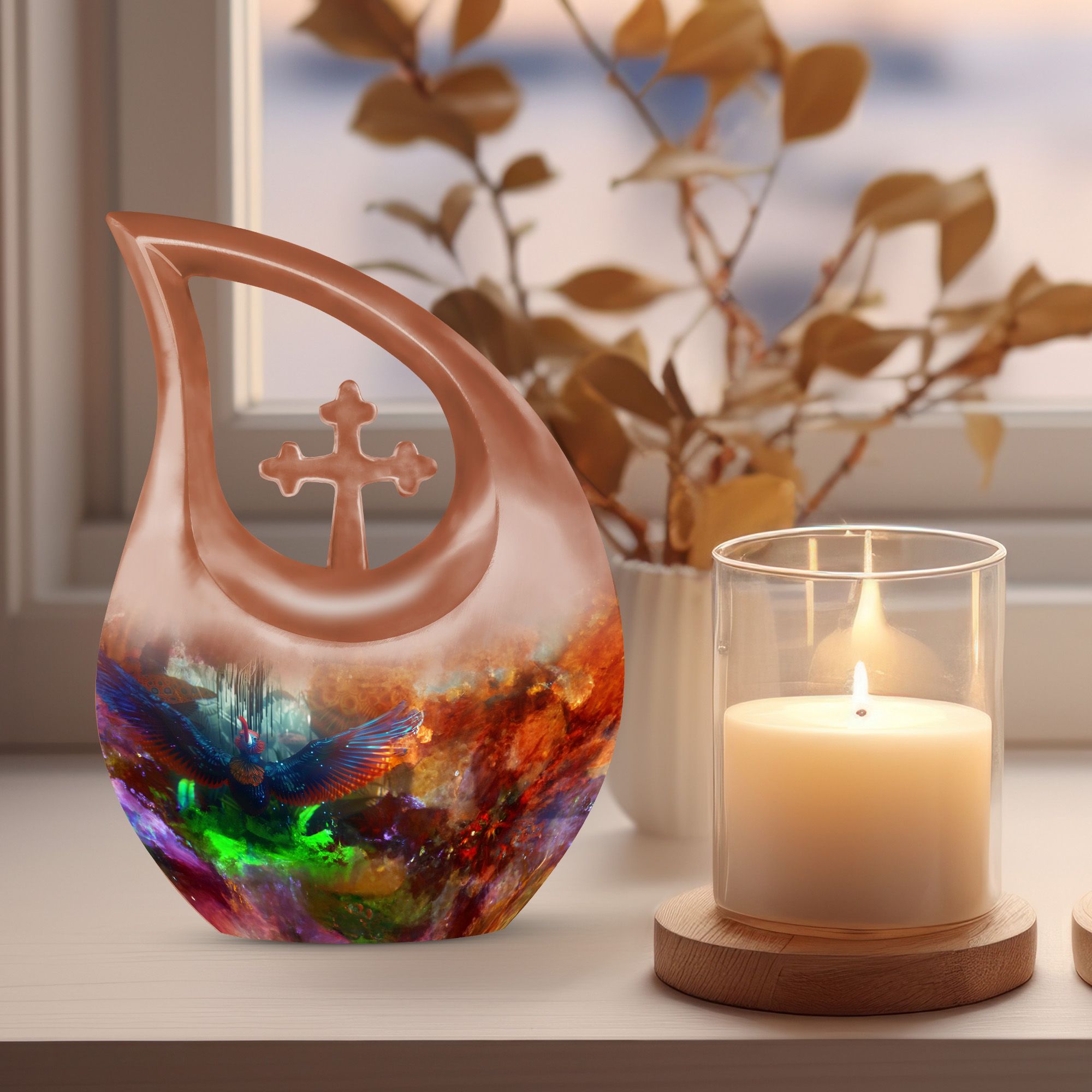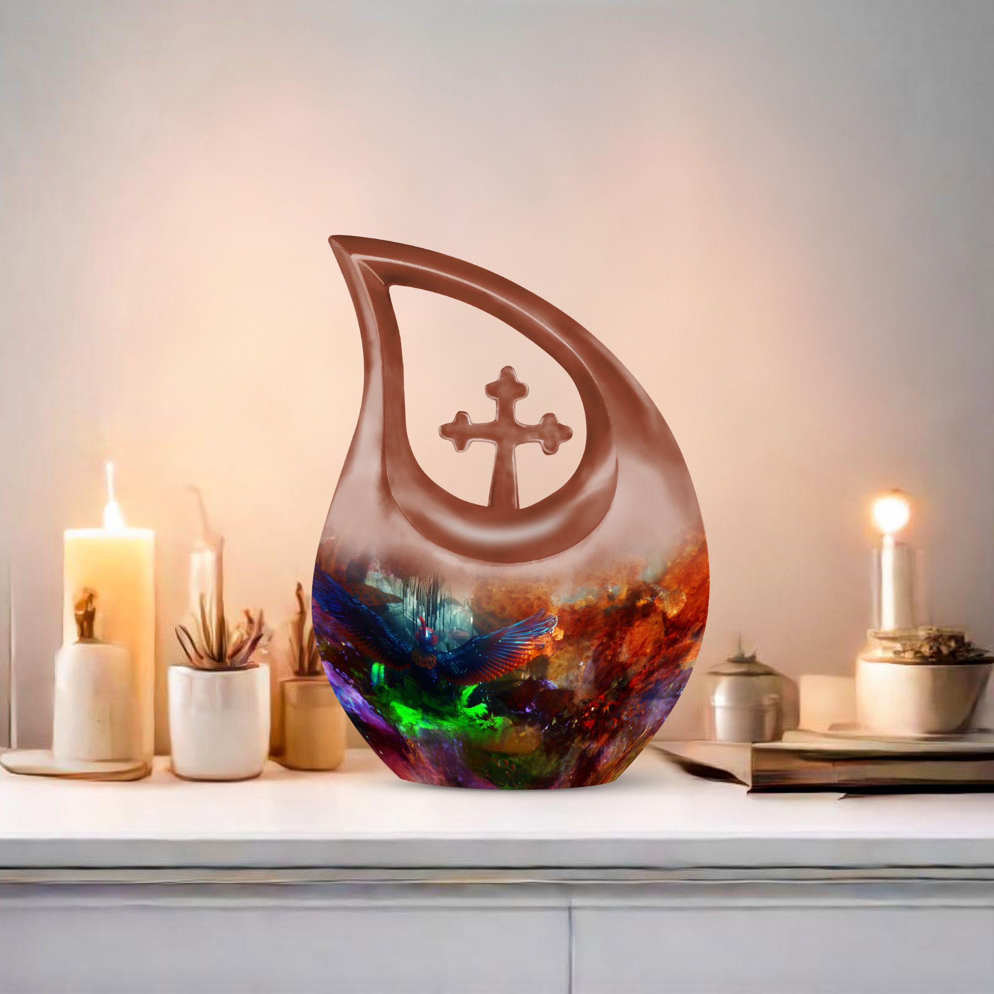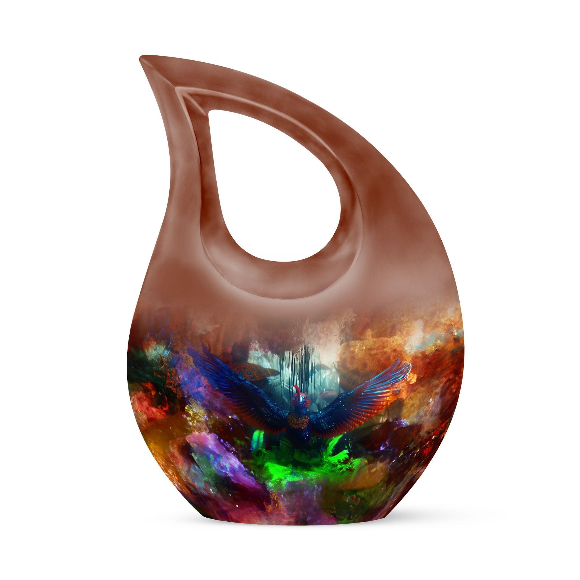 Honor your loved one with our beautifully crafted, 'Puffin Bird' themed Large Urn. Made from high-quality aluminium for long-lasting durability, this tastefully designed memorial urn has a respectable weight of 3.3 pounds and stands at a height of 10 inches. It features a classic 'Cross Drop' urn design that integrates the enchanting Puffin Bird theme, providing a serene final resting place. Its 200 cubic inches capacity ensures that it can comfortably hold a significant amount of ashes. Make it more special by personalizing it with engraved names. Each urn comes co-packaged with a velvet pouch, providing a dignified containment for the ashes. Widely recognized as one of the affordable cremation urn offerings, this Puffin Bird Urn is an excellent choice for those searching for cheap funeral urns, urns for ashes for adults, or urns for sale. Cherish memories and celebrate life with our distinct and tastefully designed memorial urns.