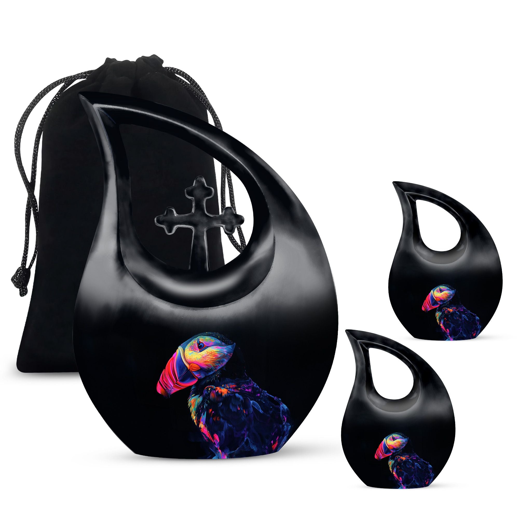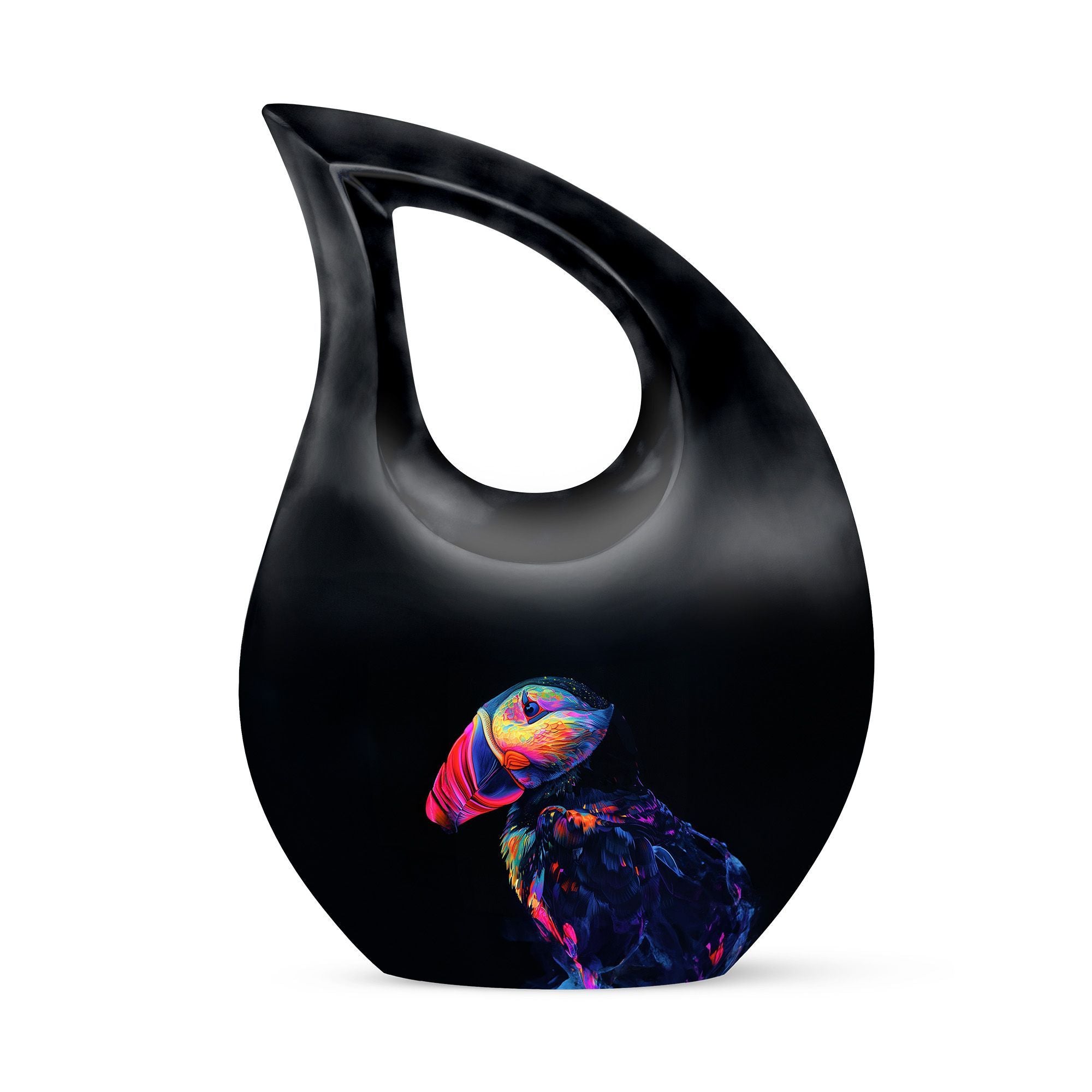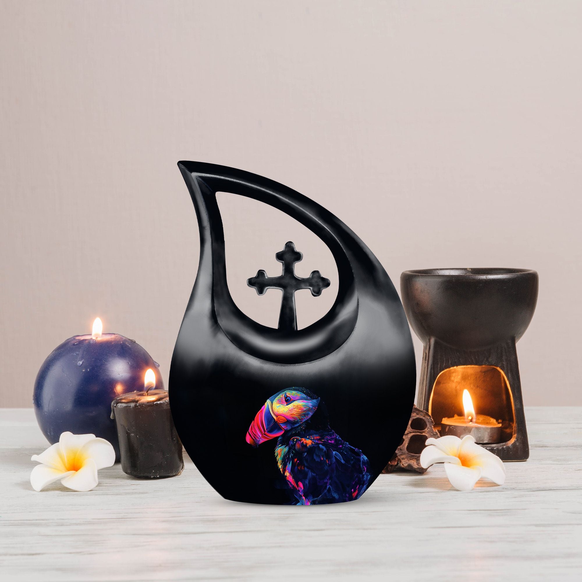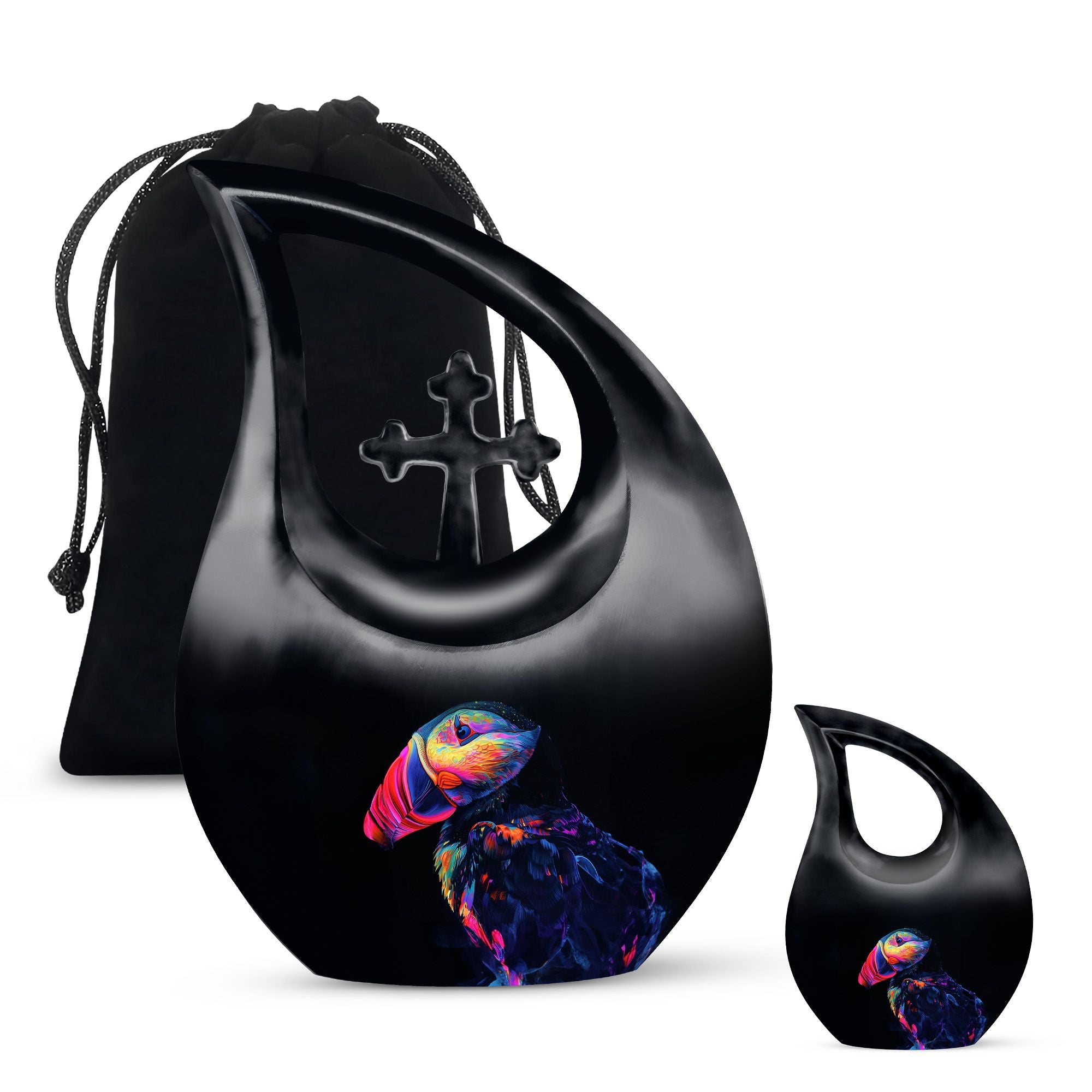 Our 'Puffin Bird Urn' captures your heart with its unique, Cross Drop design. This large 10-inch Memorial Urn, sculpted meticulously from durable Aluminium, can securely store around 200 cubic inches of resting ashes. The feather-light weight of just 3.3 pounds ensures effortless repositioning, should you wish to. This product comes with a velvet pouch for containment of ashes - a minimalistic yet elegant solution. For those who value a personal touch, we offer the option to embellish this Mini Urn with engraved names. Crafted with care and precision, every aspect of this Affordable Burial Urn resonates with the spirit of the Puffin Bird. Besides serves as a fitting memory, it alsostands as a testament to the resilience of life. Users looking for Keepsake Urns or Custom Urns For Ashes will find this product an excellent choice. An impressively streamlined Companion Urn, it blends in any space aesthetics while honouring your loved ones in a special way.