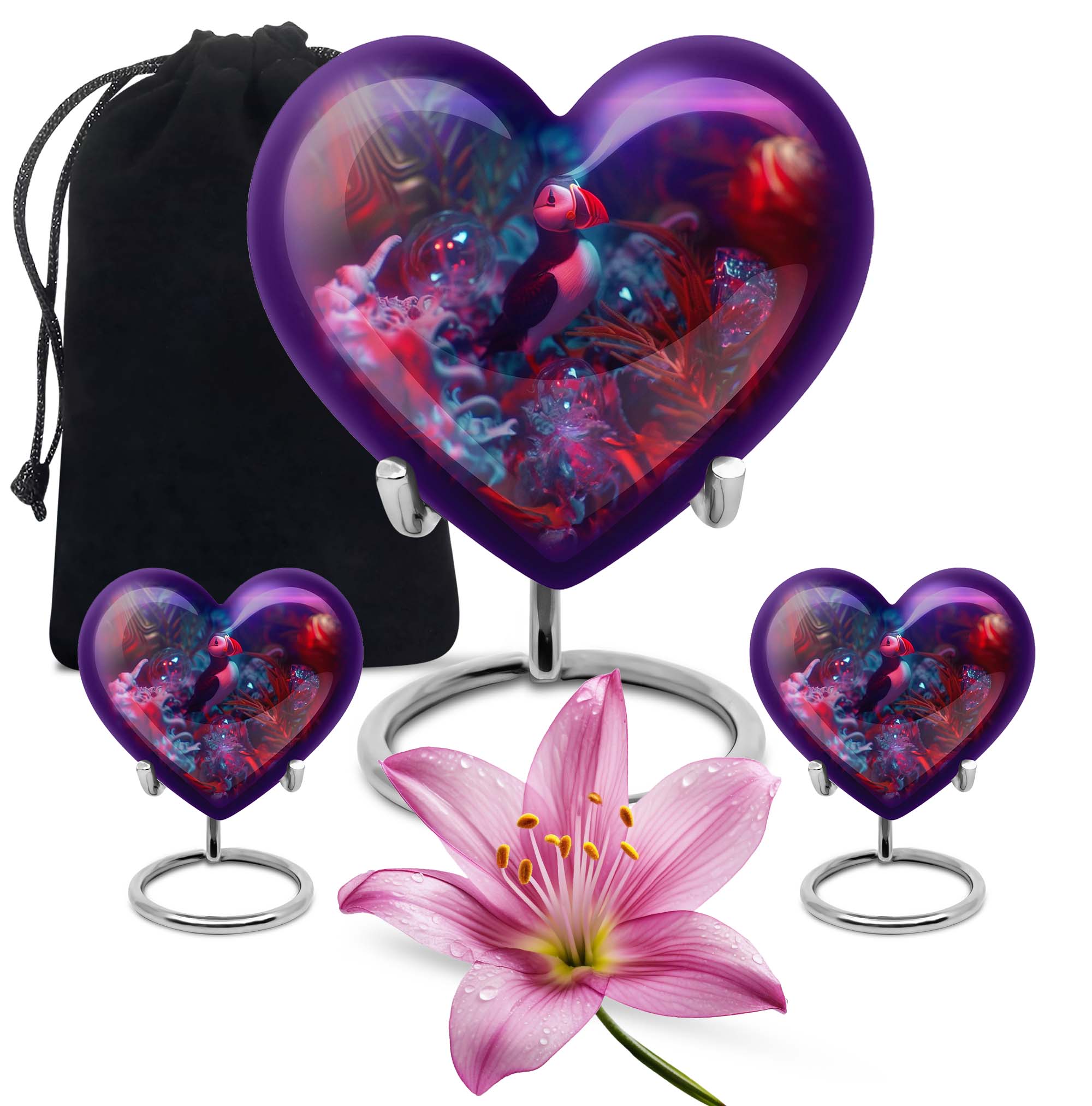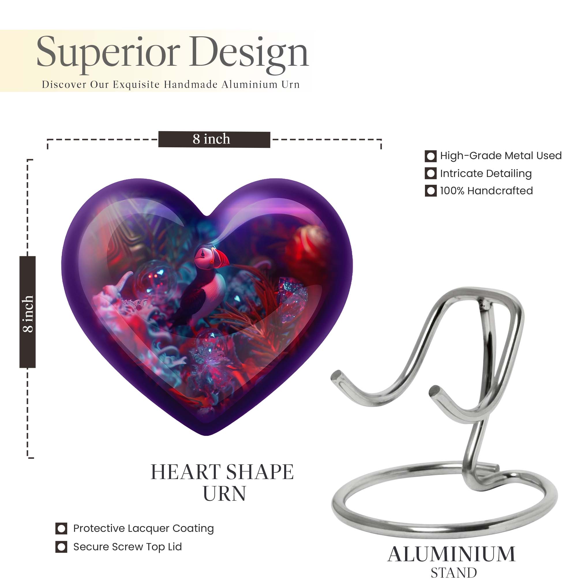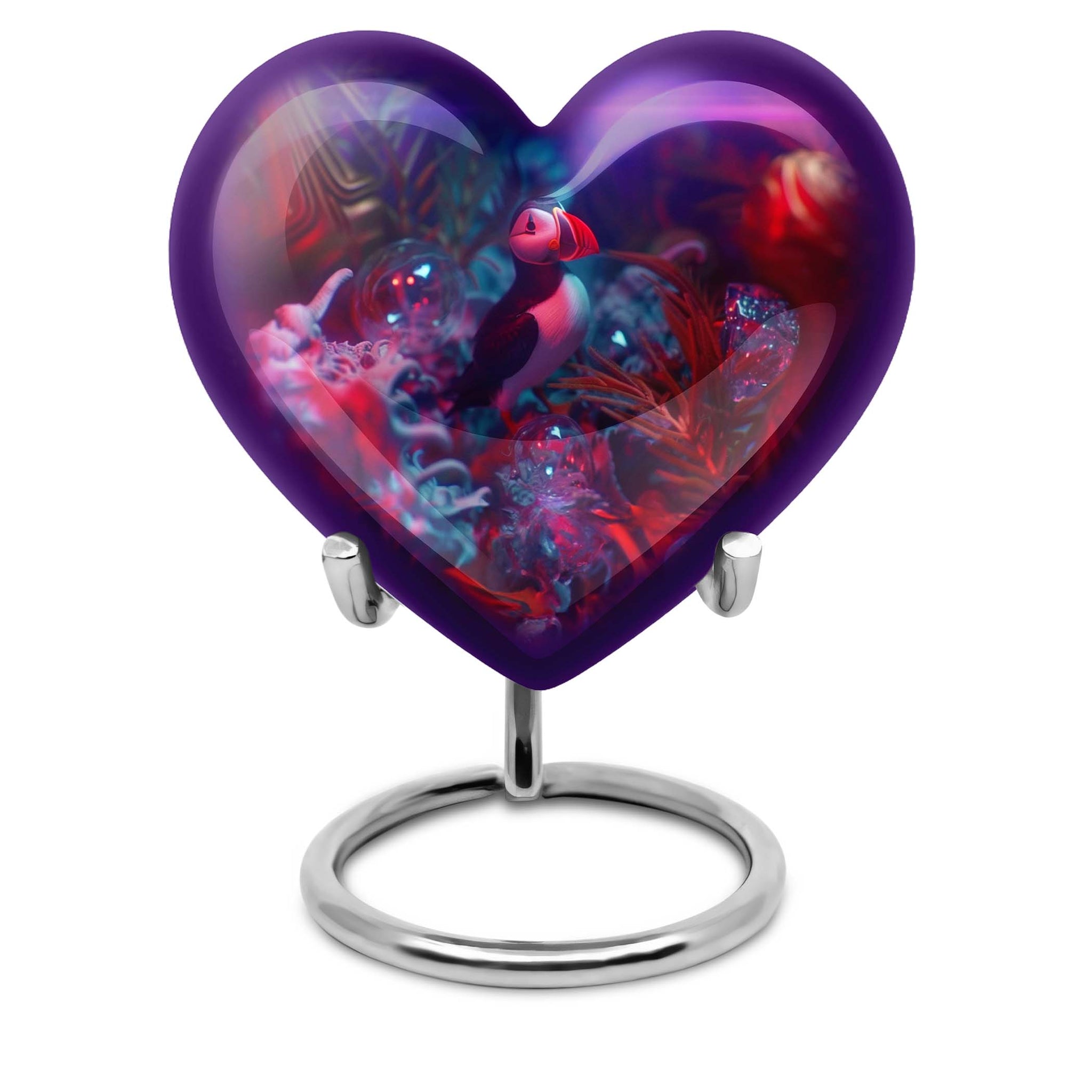Presenting our 10-inch Puffin Bird Urn, a majestic and touching way to commemorate a cherished life. This beautifully crafted burial urn elegantly combines functionality and art with an abstract theme. Its design is inspired by the poignant presence of a heart, symbolizing unending love and remembrance. Made from high-quality aluminium, this large urn offers durability and a substantial weight of 3.3 pounds, manifesting a profound sense of permanence. Its 200 cubic inch capacity ensures ample space to securely hold the ashes. Personalizing the urn with engraved names adds an intimate touch to this memorial item, making it that much more exceptional. Our package includes a velvet pouch to provide additional containment for ashes, adding an extra layer of protection and respect. Whether you're seeking urns for men, dual urns for adult male and female, or metal urns for in-ground burial, our Puffin Bird Urn is a dignified choice that leaves a lasting remembrance. Honour your loved ones with this epitome of enduring affection.