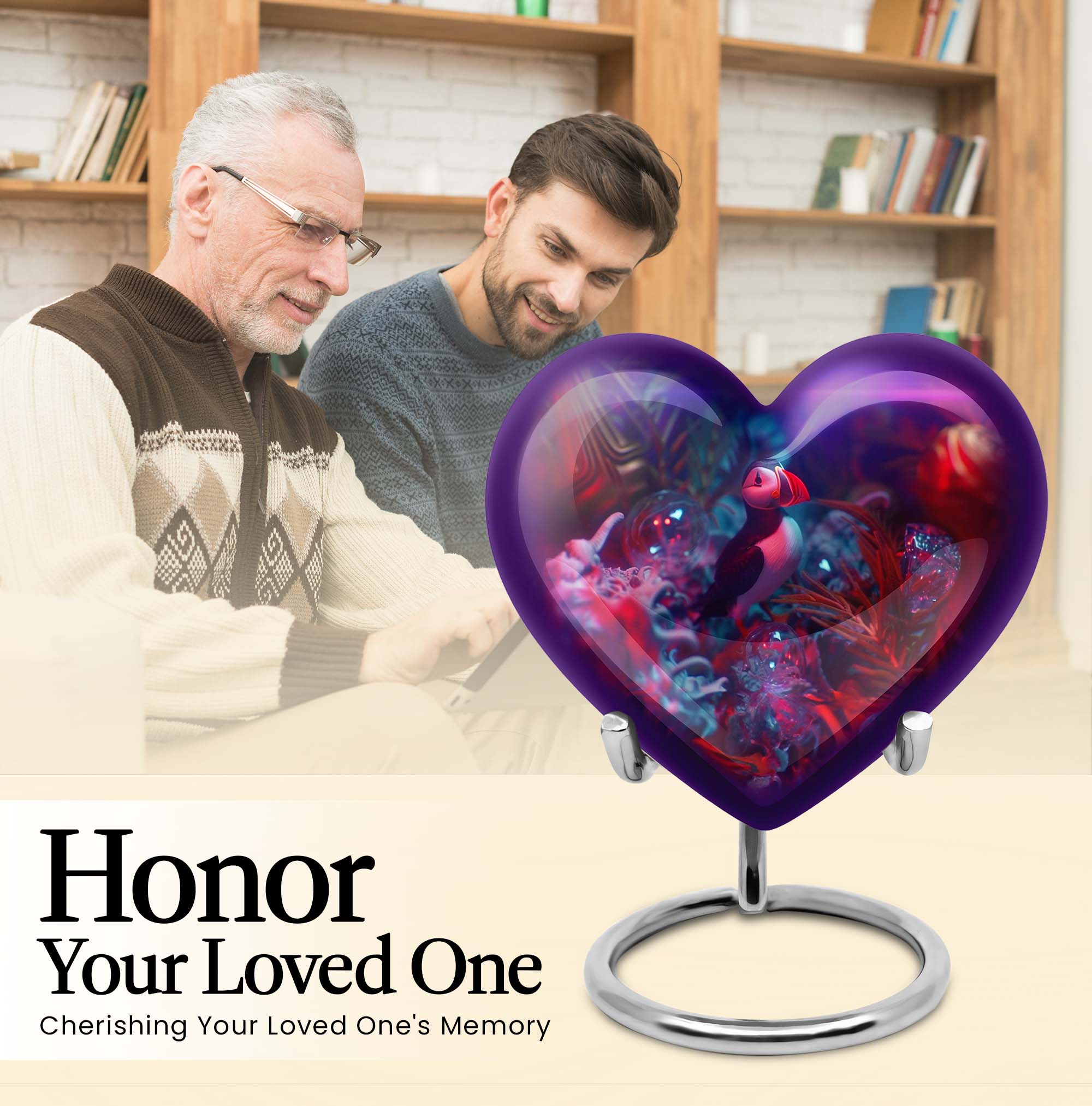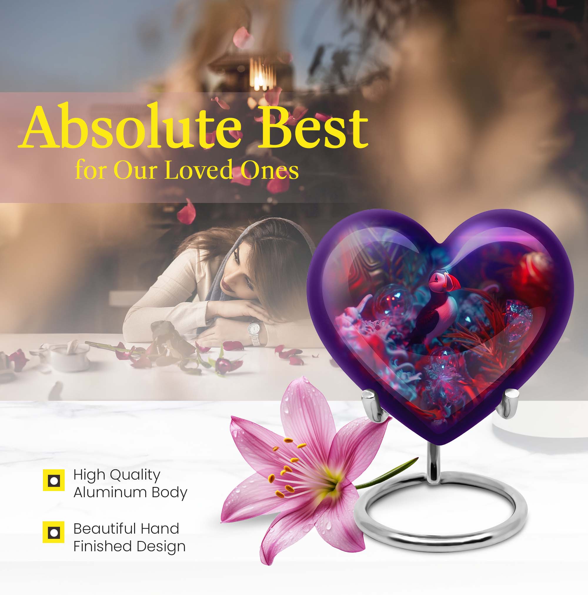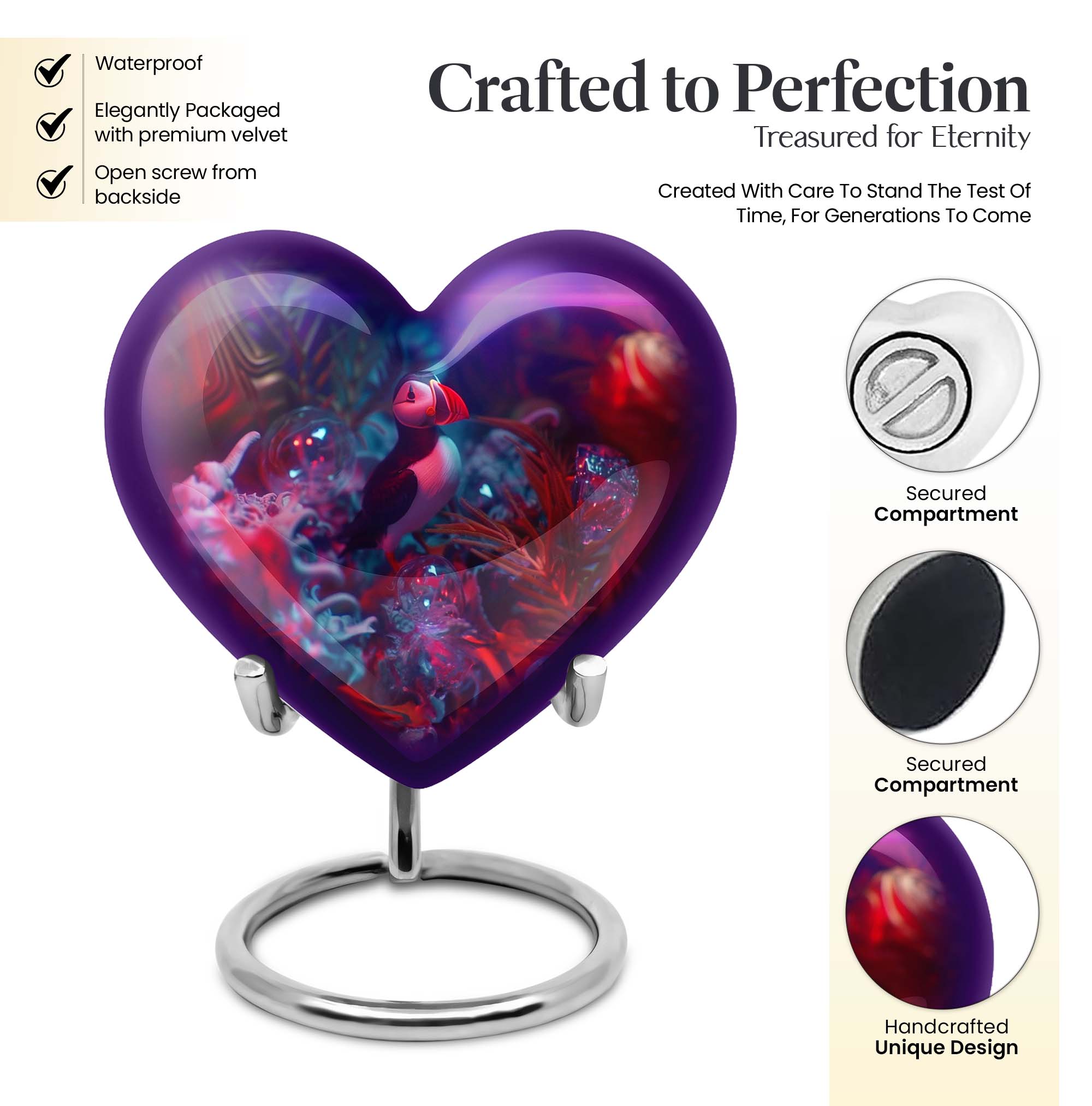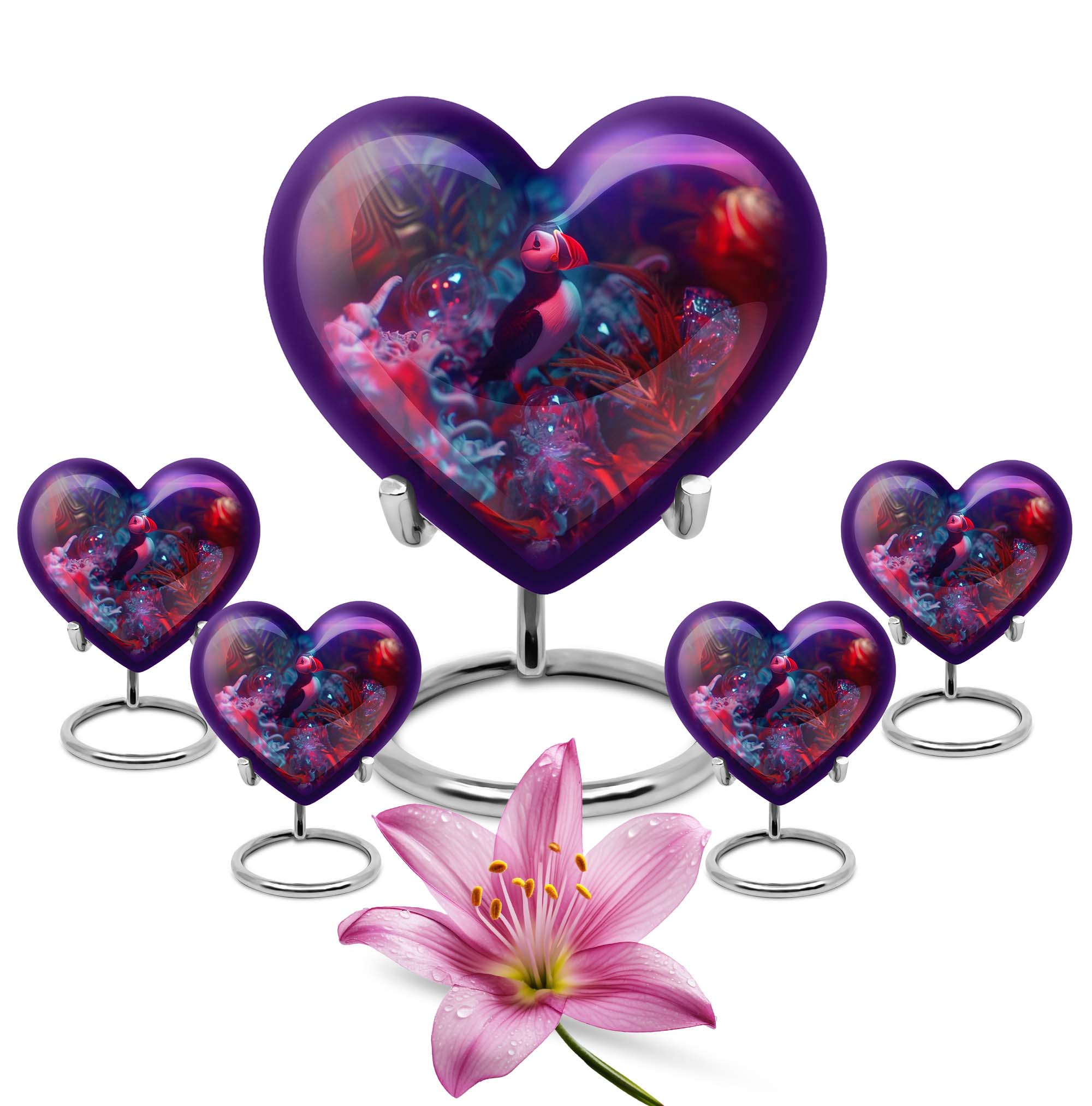 Presenting our 10-inch Puffin Bird Urn, a majestic and touching way to commemorate a cherished life. This beautifully crafted burial urn elegantly combines functionality and art with an abstract theme. Its design is inspired by the poignant presence of a heart, symbolizing unending love and remembrance. Made from high-quality aluminium, this large urn offers durability and a substantial weight of 3.3 pounds, manifesting a profound sense of permanence. Its 200 cubic inch capacity ensures ample space to securely hold the ashes. Personalizing the urn with engraved names adds an intimate touch to this memorial item, making it that much more exceptional. Our package includes a velvet pouch to provide additional containment for ashes, adding an extra layer of protection and respect. Whether you're seeking urns for men, dual urns for adult male and female, or metal urns for in-ground burial, our Puffin Bird Urn is a dignified choice that leaves a lasting remembrance. Honour your loved ones with this epitome of enduring affection.