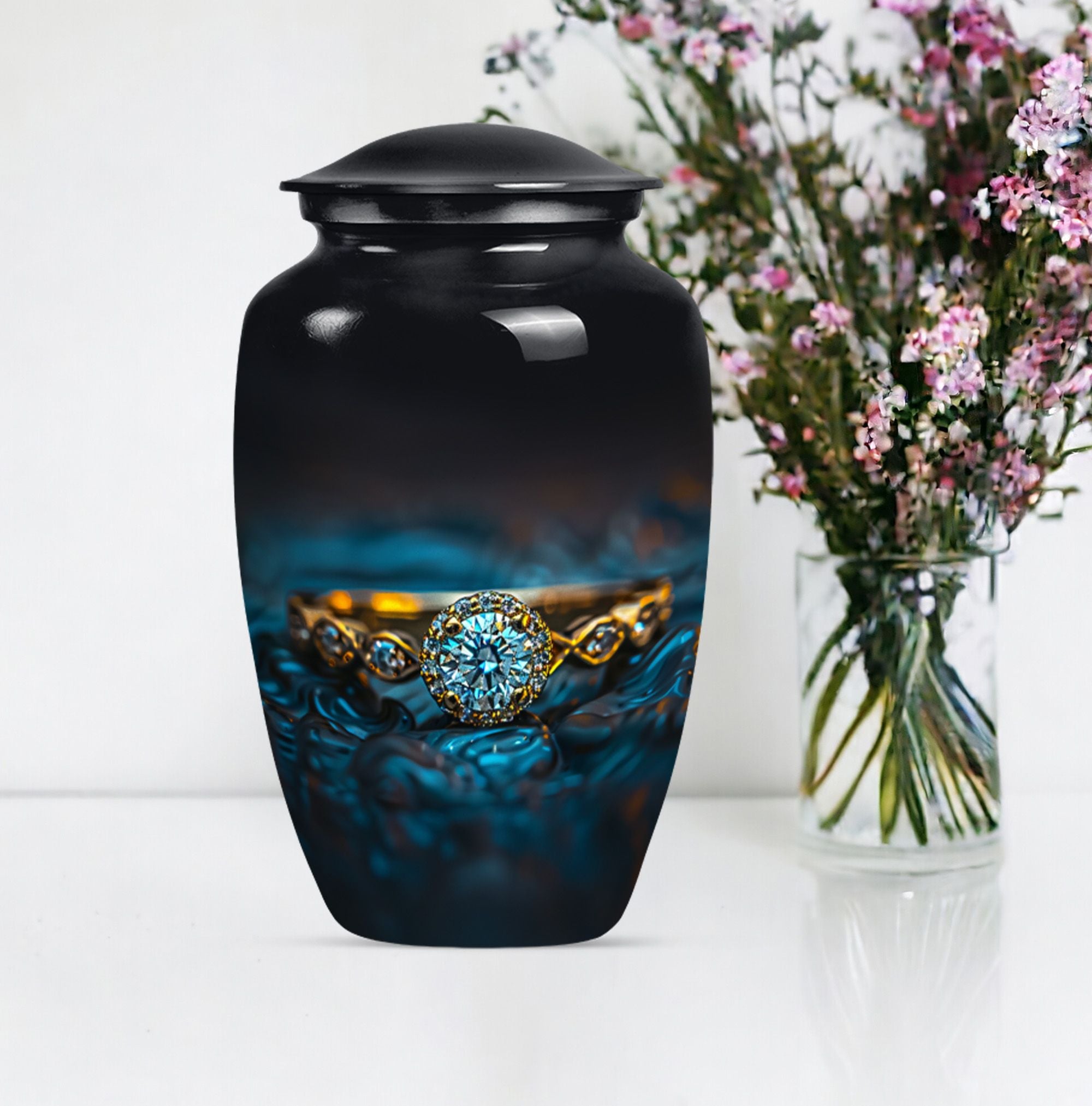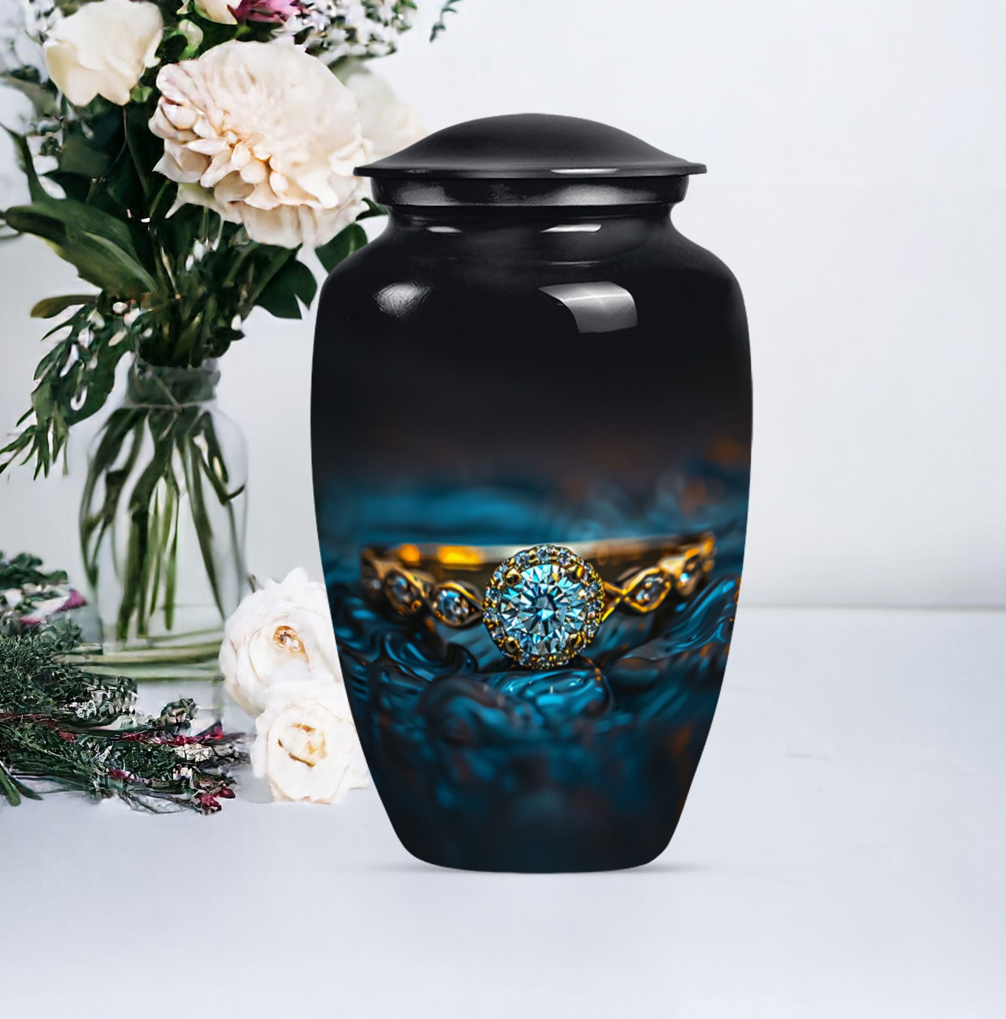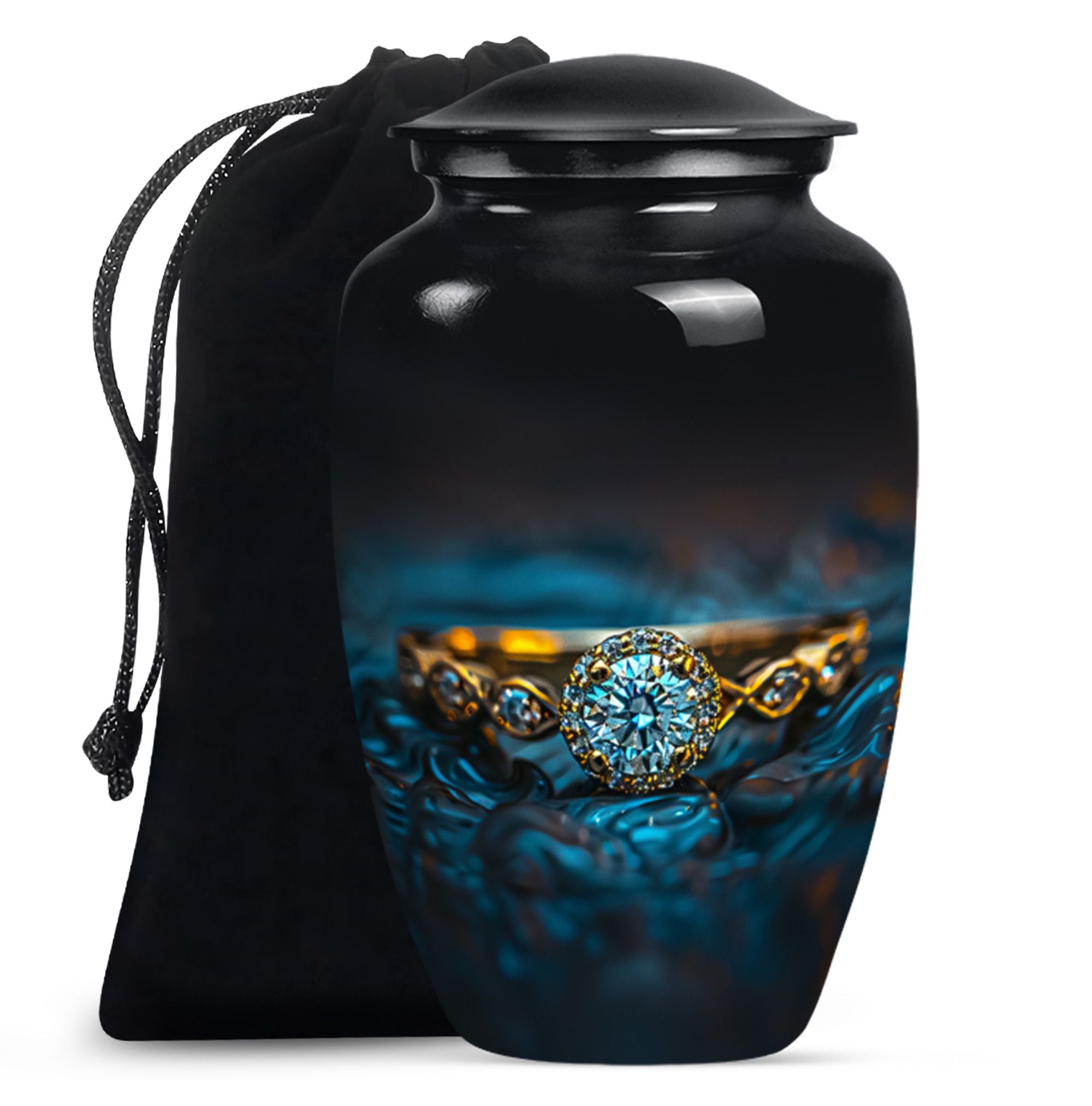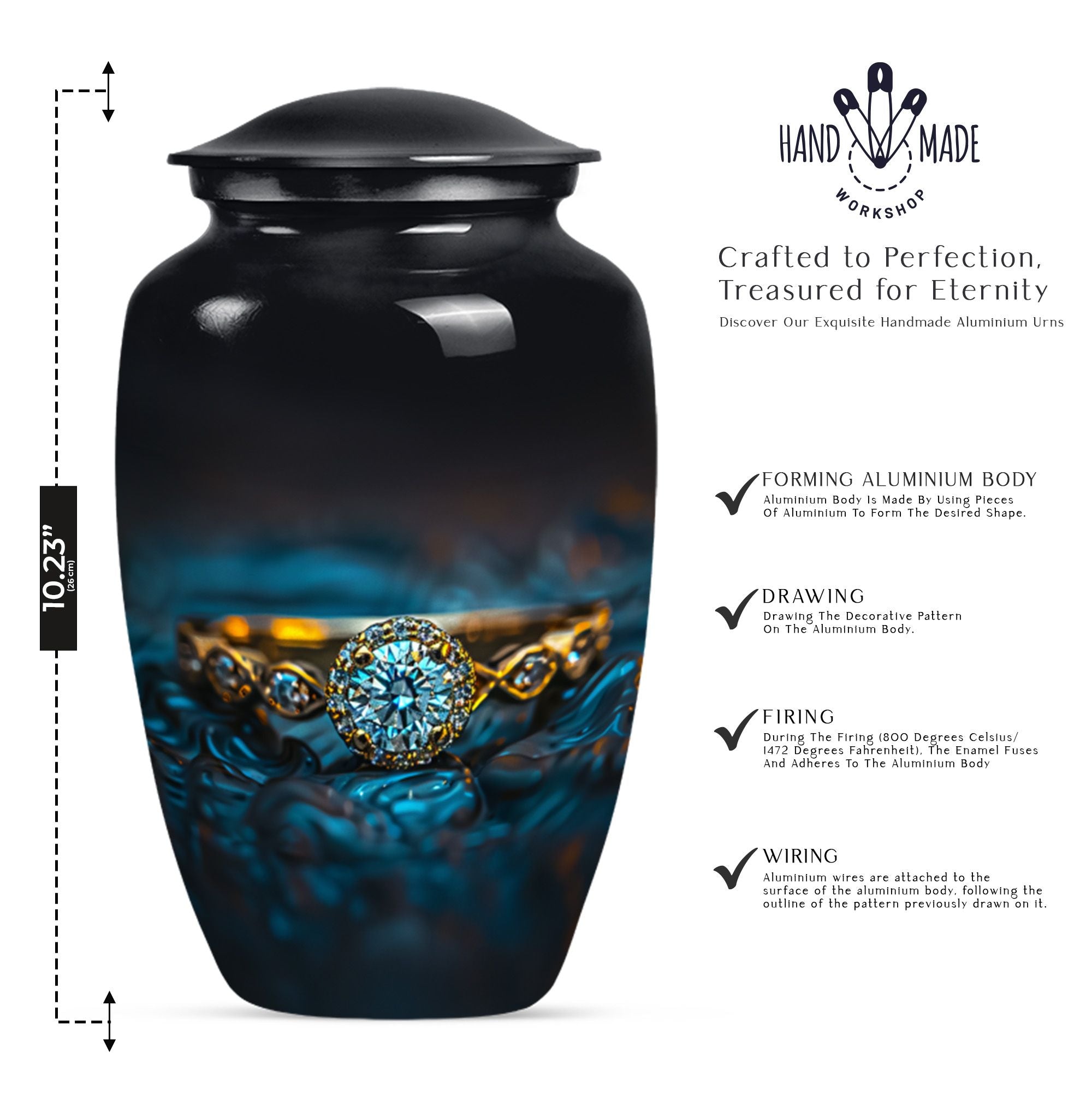 Cherish the physical memories of your cherished one with our 10-inch Classic Ring Urn, specifically crafted for women. This urn is fashioned using high-quality aluminium, renowned for its longevity and durability, creating a lasting honouring piece. Weighing at a solid 3.3 pounds, this urn stands at a respectable height of 10 inches, with a generous capacity of 200 cubic inches, ensuring ample space for preservation. Our cremation urns come with an elegant velvet pouch for secure containment and respectful handling of the cremated remains. The design explores an abstract theme, which brings a touch of uniqueness and personal connection to the piece. To deepen the bond, we allow for personalization where you can engrave names, embedding an emotional touch to your tangible memories. This large urn makes an ideal pick for adults or seniors looking for unique unisex gifts or memorial ceremony supplies. Its classic style makes it a fitting selection for burial urns or funeral urns for women's ashes. The ‘Ring Urn’ stands as a symbol of enduring love, a physical representation of unfading memories, making it an ideal cremation urn for women.