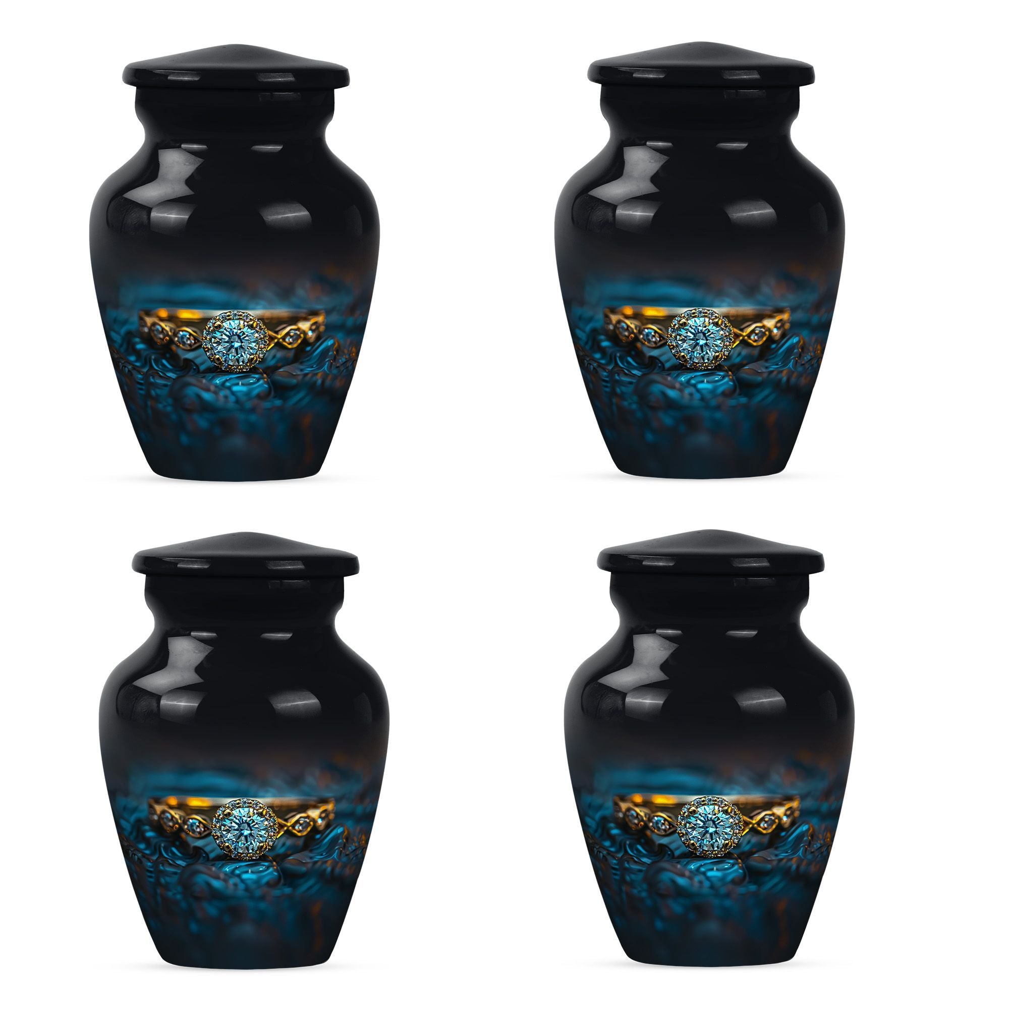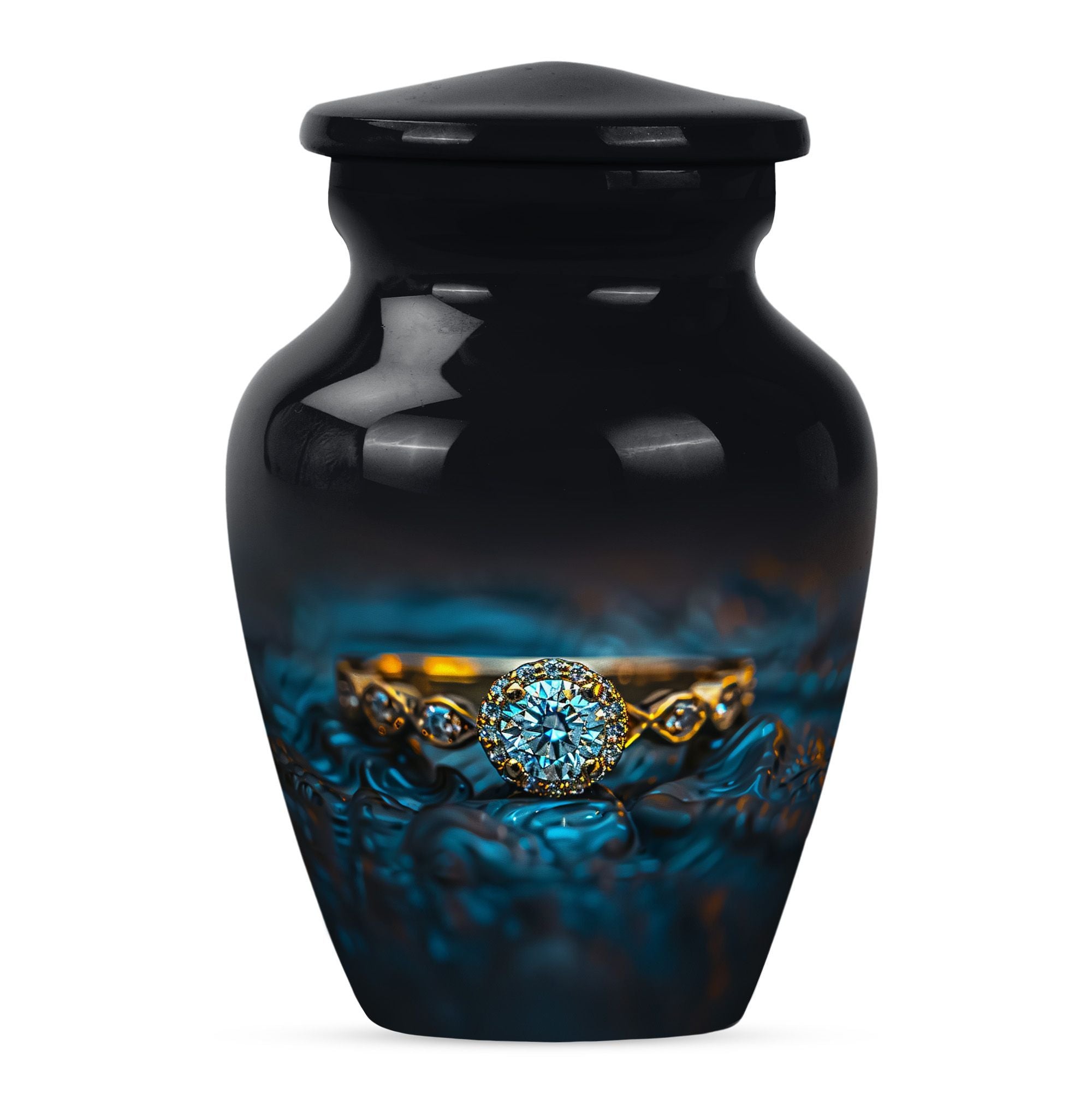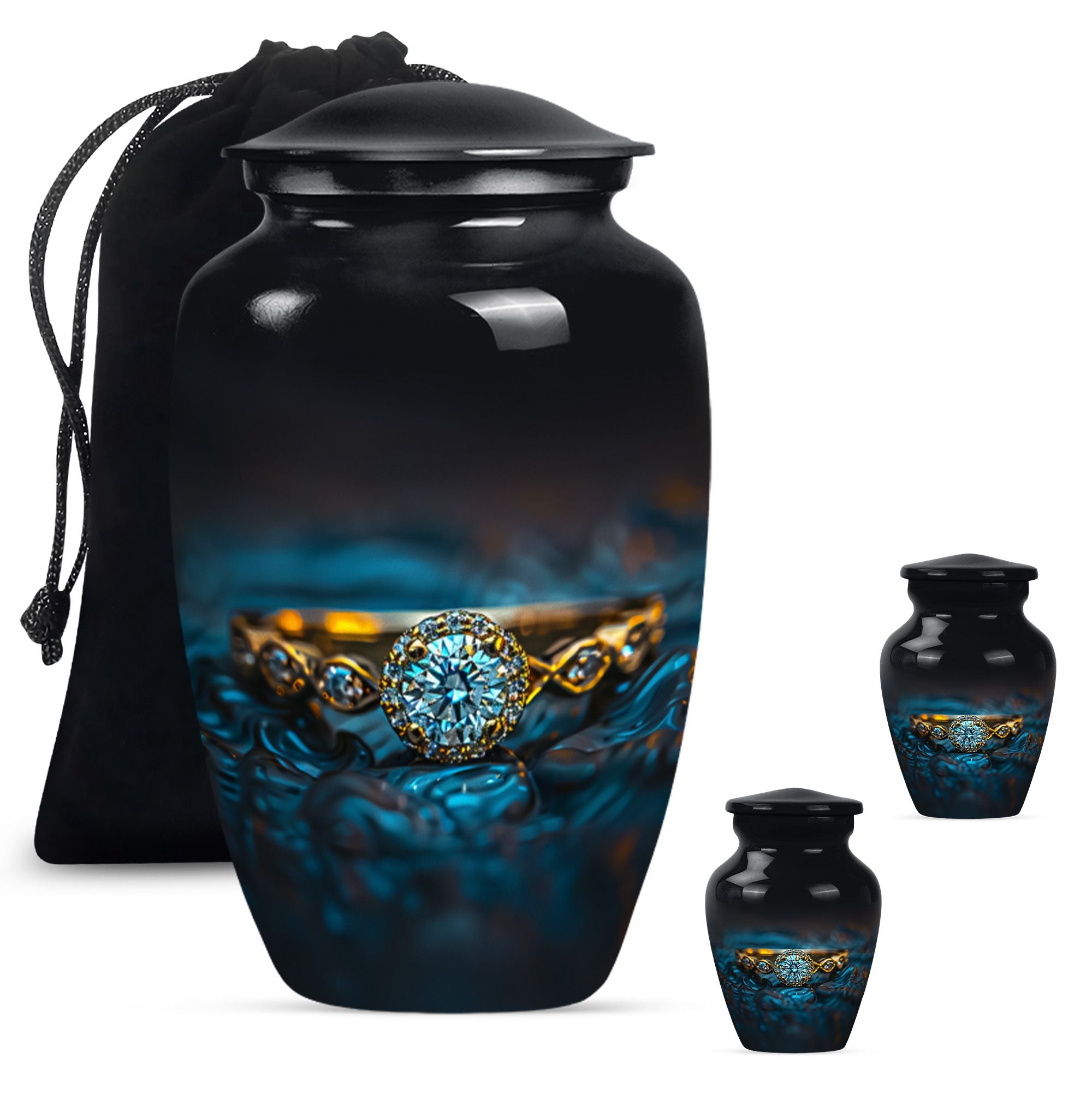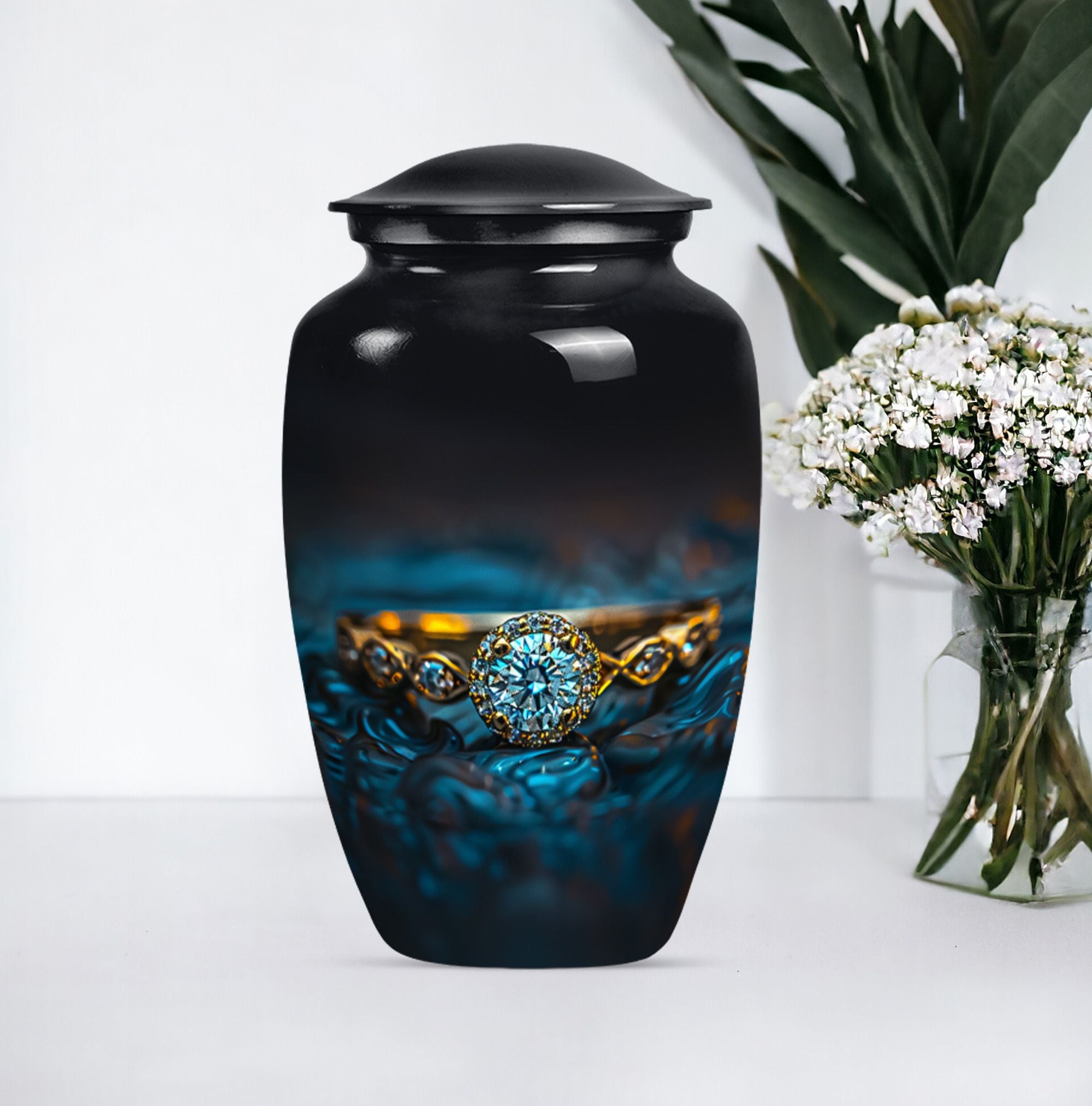 Cherish the physical memories of your cherished one with our 10-inch Classic Ring Urn, specifically crafted for women. This urn is fashioned using high-quality aluminium, renowned for its longevity and durability, creating a lasting honouring piece. Weighing at a solid 3.3 pounds, this urn stands at a respectable height of 10 inches, with a generous capacity of 200 cubic inches, ensuring ample space for preservation. Our cremation urns come with an elegant velvet pouch for secure containment and respectful handling of the cremated remains. The design explores an abstract theme, which brings a touch of uniqueness and personal connection to the piece. To deepen the bond, we allow for personalization where you can engrave names, embedding an emotional touch to your tangible memories. This large urn makes an ideal pick for adults or seniors looking for unique unisex gifts or memorial ceremony supplies. Its classic style makes it a fitting selection for burial urns or funeral urns for women's ashes. The ‘Ring Urn’ stands as a symbol of enduring love, a physical representation of unfading memories, making it an ideal cremation urn for women.