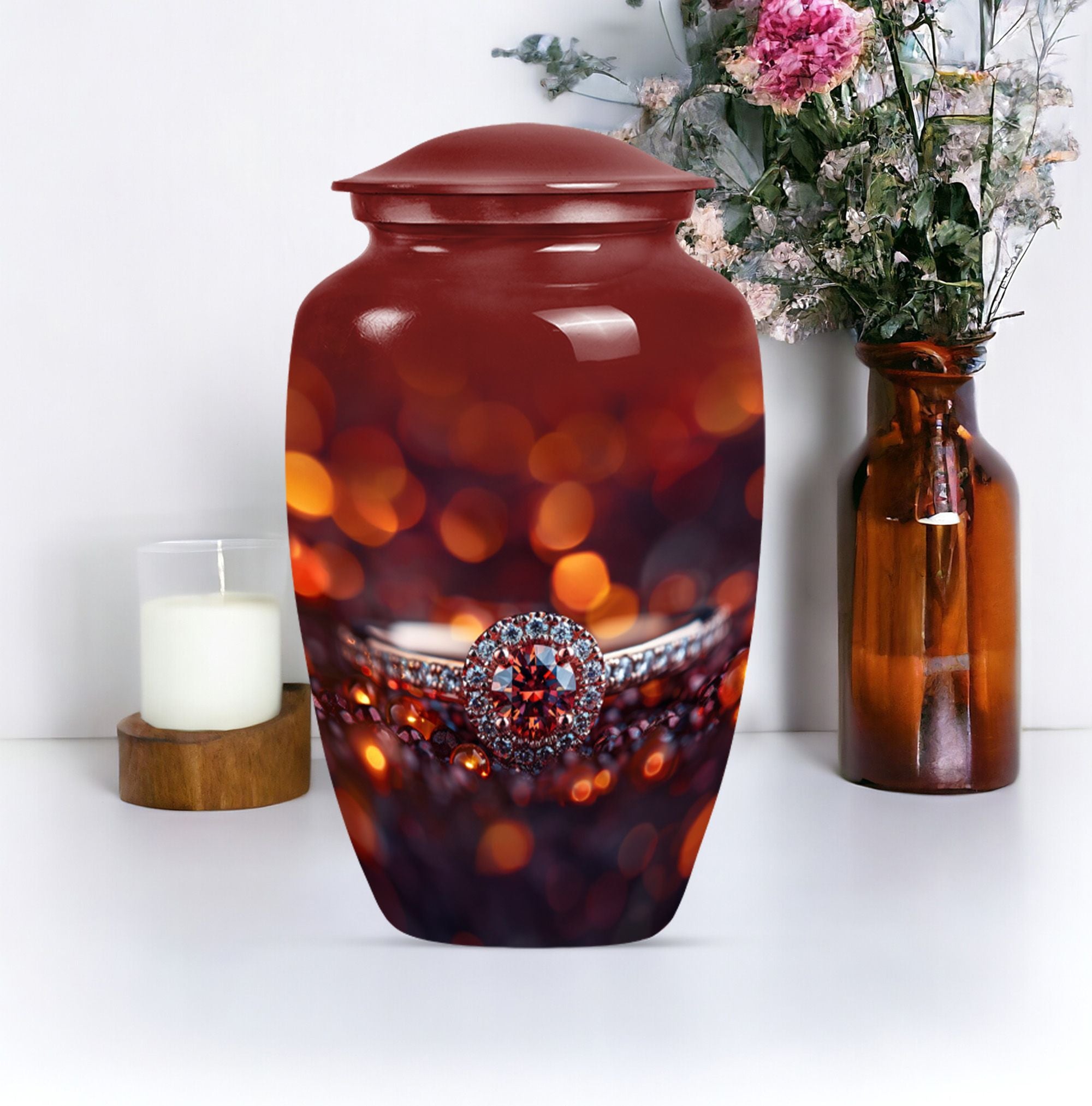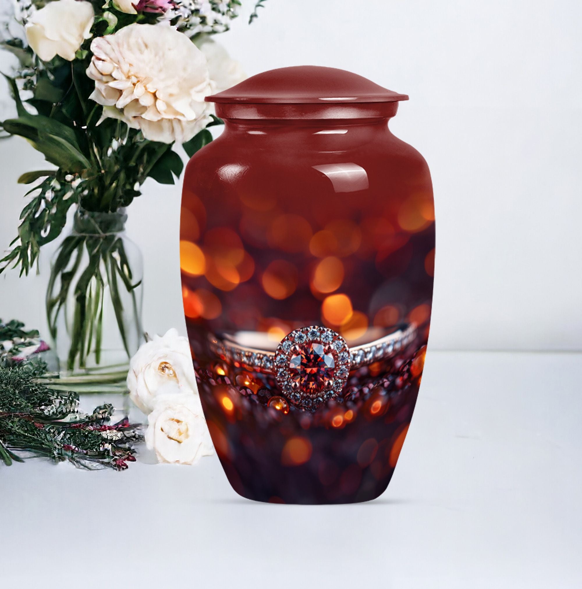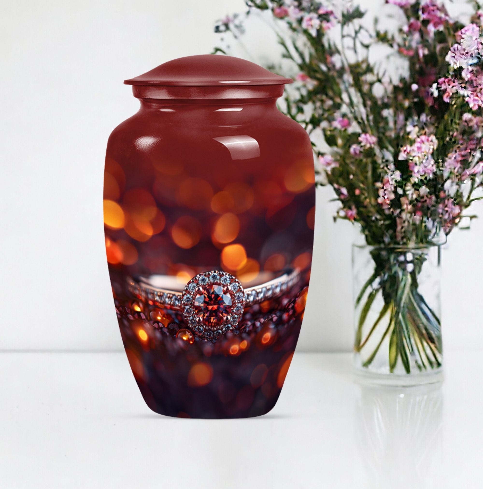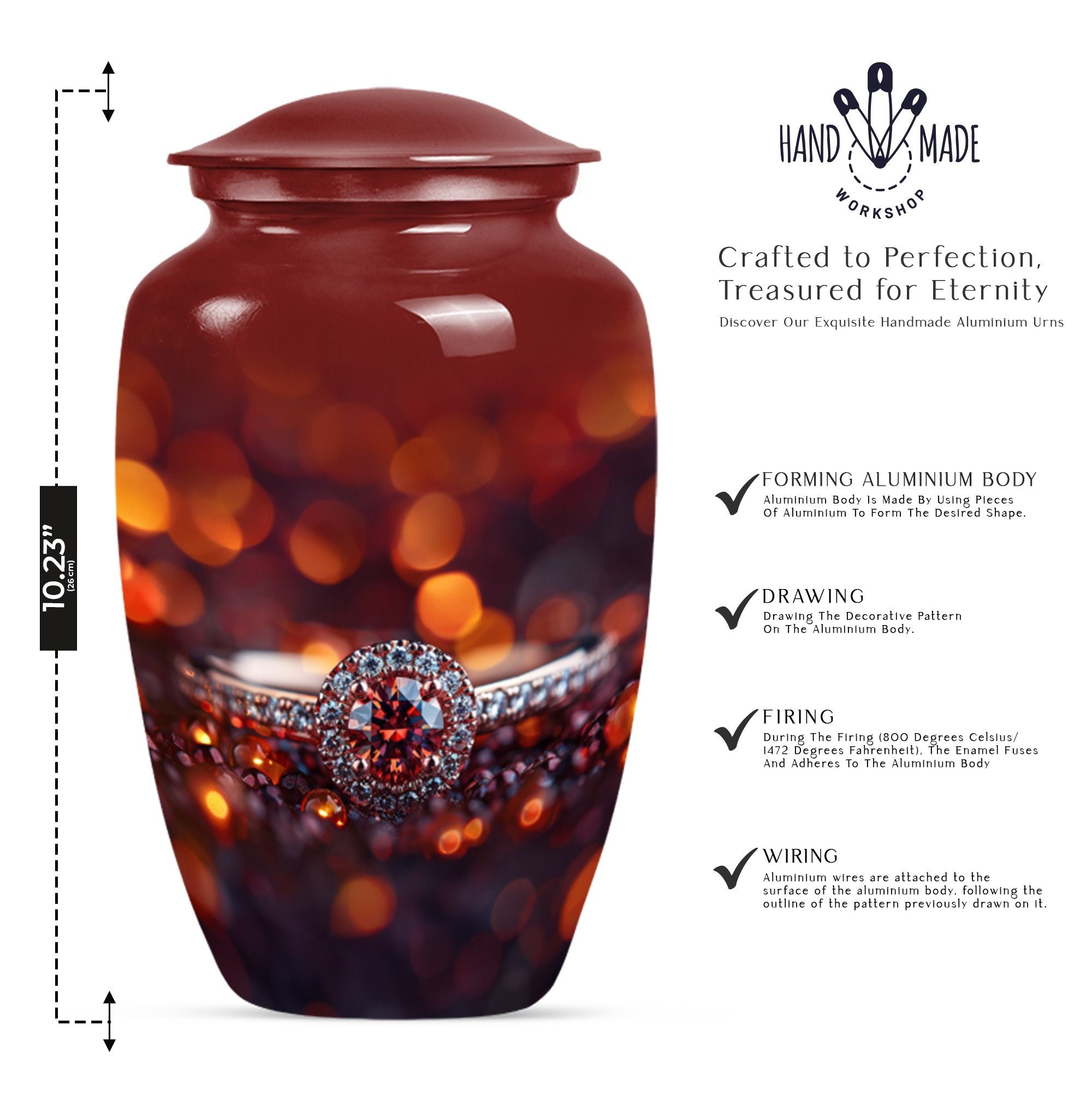 Experience and share an everlasting memory of your loved ones with our 10-inch Ring Urn. Crafted meticulously from sturdy aluminium, this large classic urn bestows a poignant tribute catered towards adults and senior citizens. Its abstract theme creates a unique aesthetic, subtly embodying the essence of those it honors. With an encompassing capacity of 200 cubic inches and a respectable weight of 3.3 pounds, our urn substantiates its remarkable solemnity and solidity not only in design but also in character. This 10-inch Urn is more than a funeral adult urn for human ashes; it can also be personalized with engraved names, giving a special touch of commemoration for your loved ones. The package comes with a velvet pouch, adding an extra layer of protection to the contained ashes. Commonly referred as 'memorial urns', 'memorial forever urns', 'urn human women', 'urns for mom', and 'funeral urns for ashes', this product can carry profound emotional significance and create a memorial for lifetime, undeniable in its cultural and personal undertaking.
