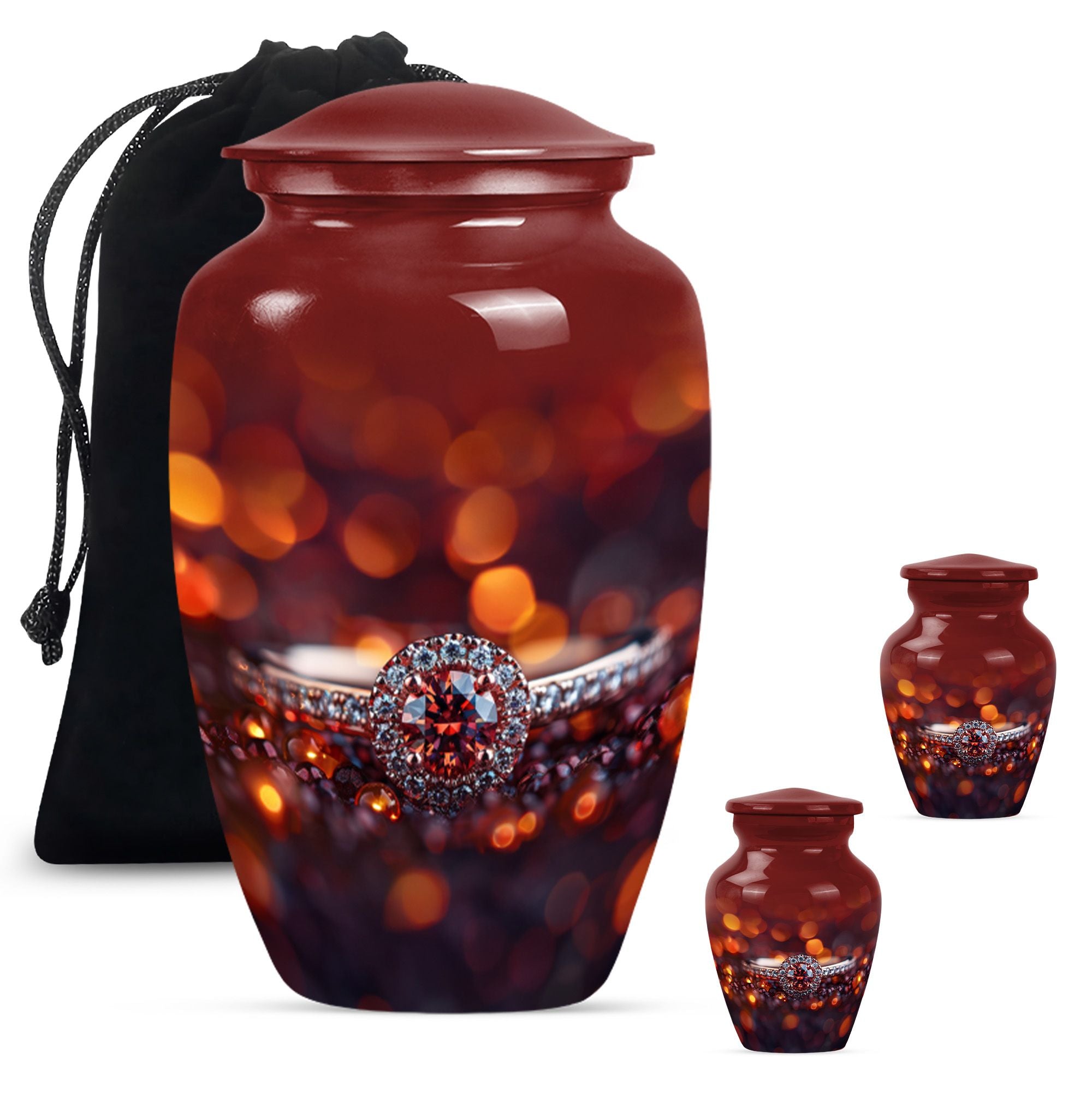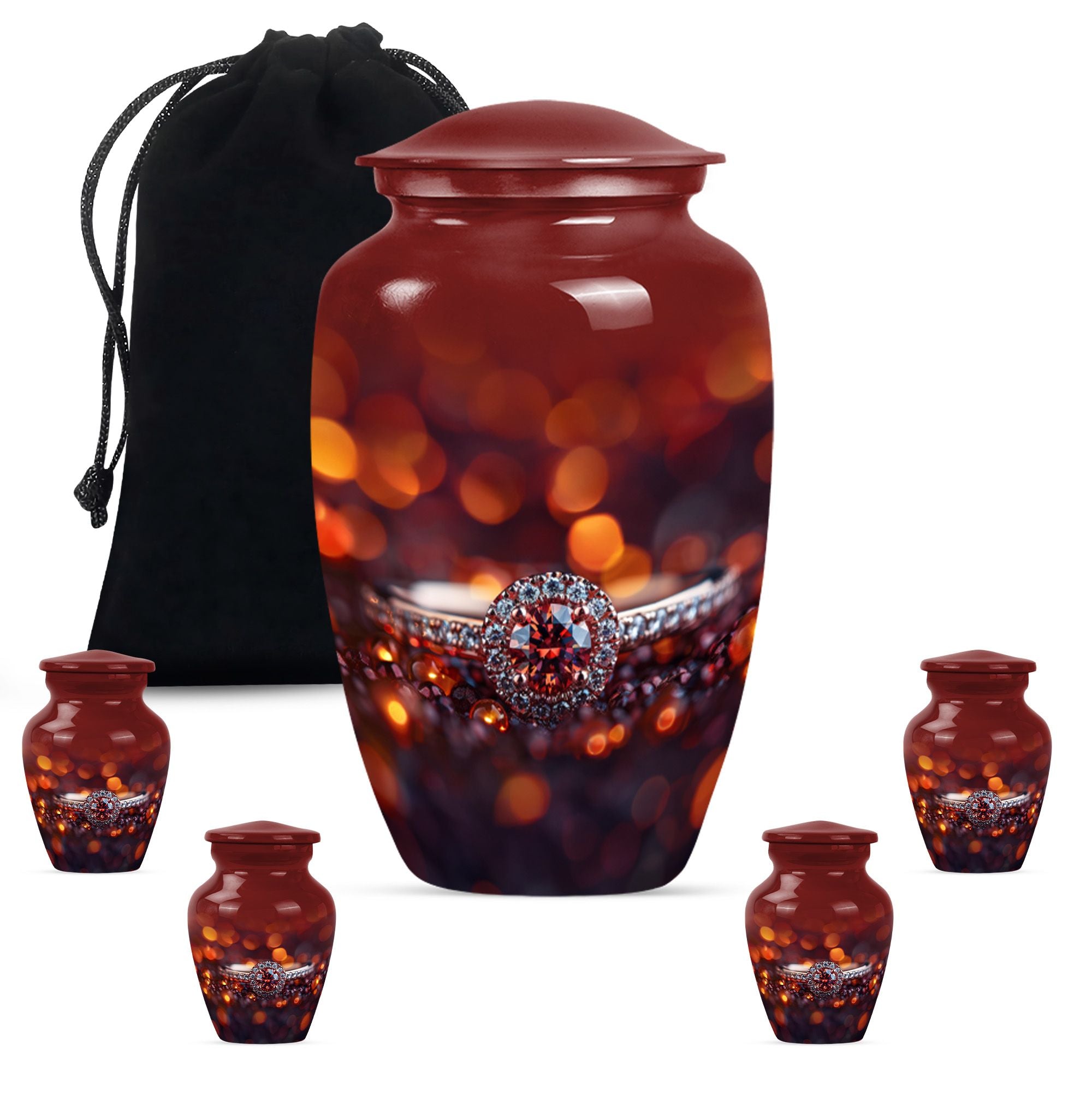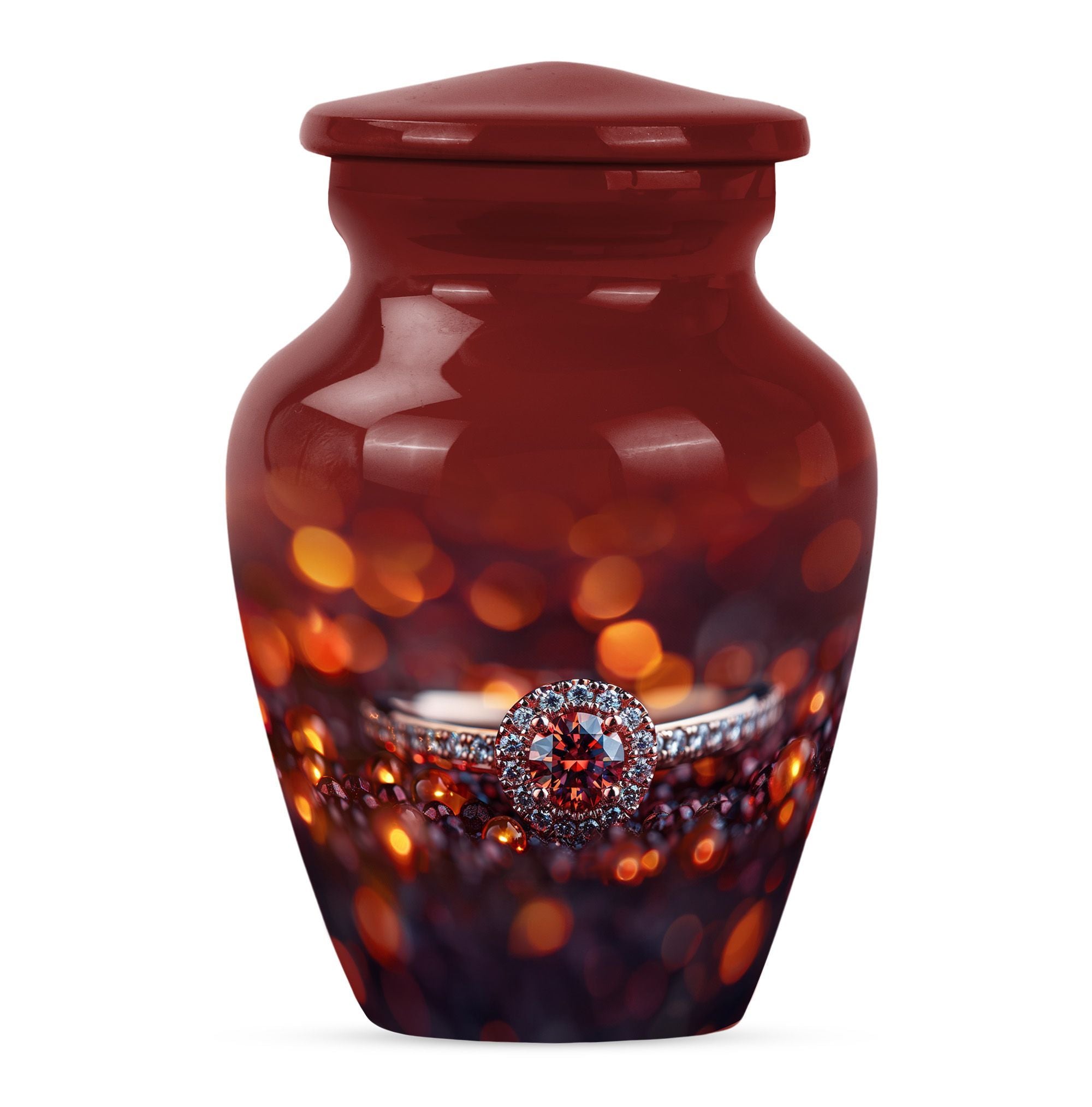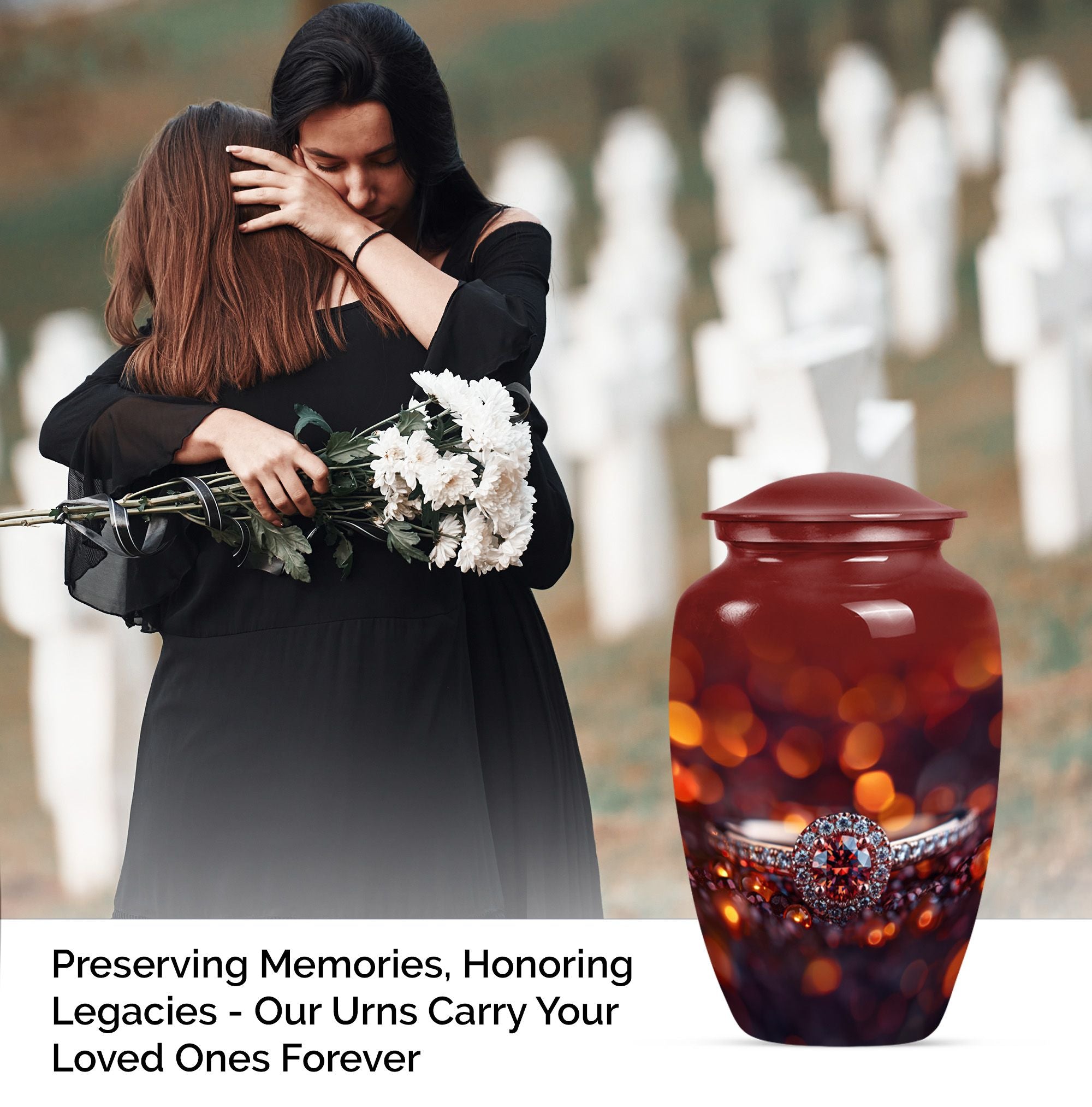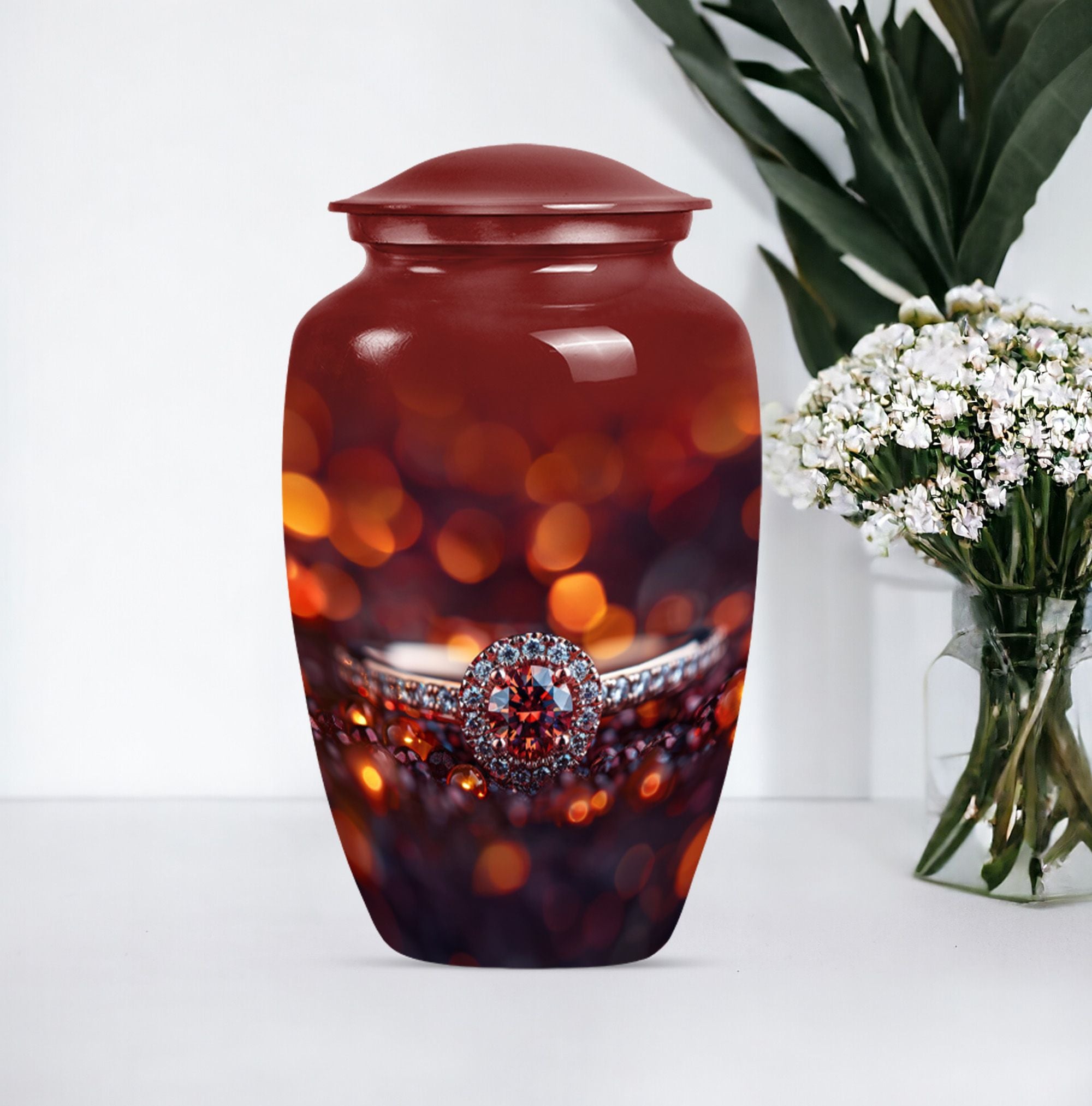 Experience and share an everlasting memory of your loved ones with our 10-inch Ring Urn. Crafted meticulously from sturdy aluminium, this large classic urn bestows a poignant tribute catered towards adults and senior citizens. Its abstract theme creates a unique aesthetic, subtly embodying the essence of those it honors. With an encompassing capacity of 200 cubic inches and a respectable weight of 3.3 pounds, our urn substantiates its remarkable solemnity and solidity not only in design but also in character. This 10-inch Urn is more than a funeral adult urn for human ashes; it can also be personalized with engraved names, giving a special touch of commemoration for your loved ones. The package comes with a velvet pouch, adding an extra layer of protection to the contained ashes. Commonly referred as 'memorial urns', 'memorial forever urns', 'urn human women', 'urns for mom', and 'funeral urns for ashes', this product can carry profound emotional significance and create a memorial for lifetime, undeniable in its cultural and personal undertaking.