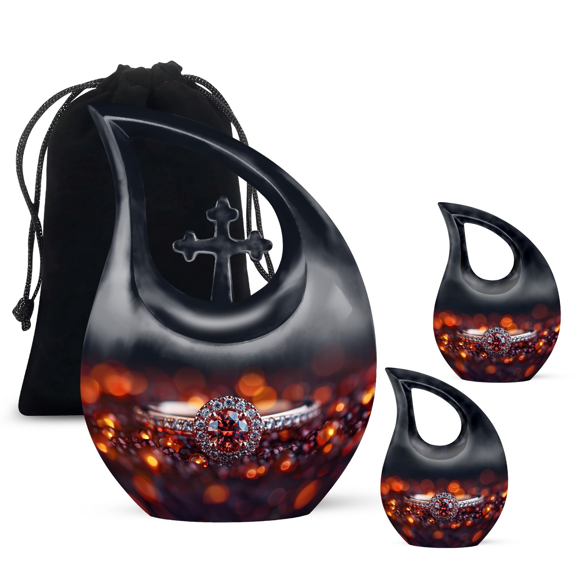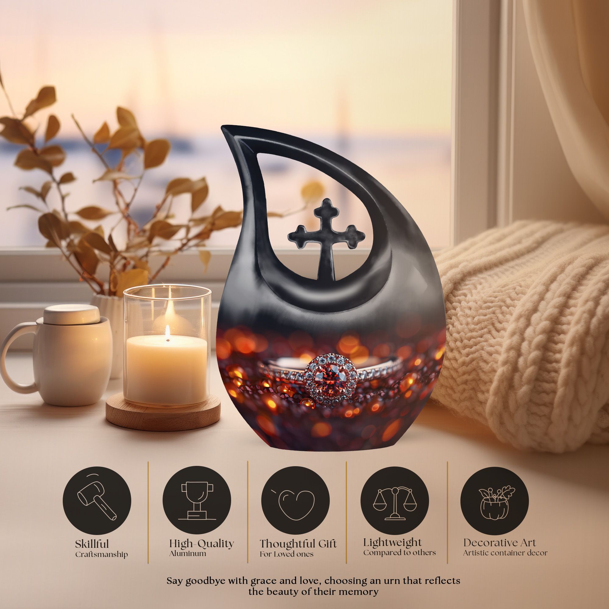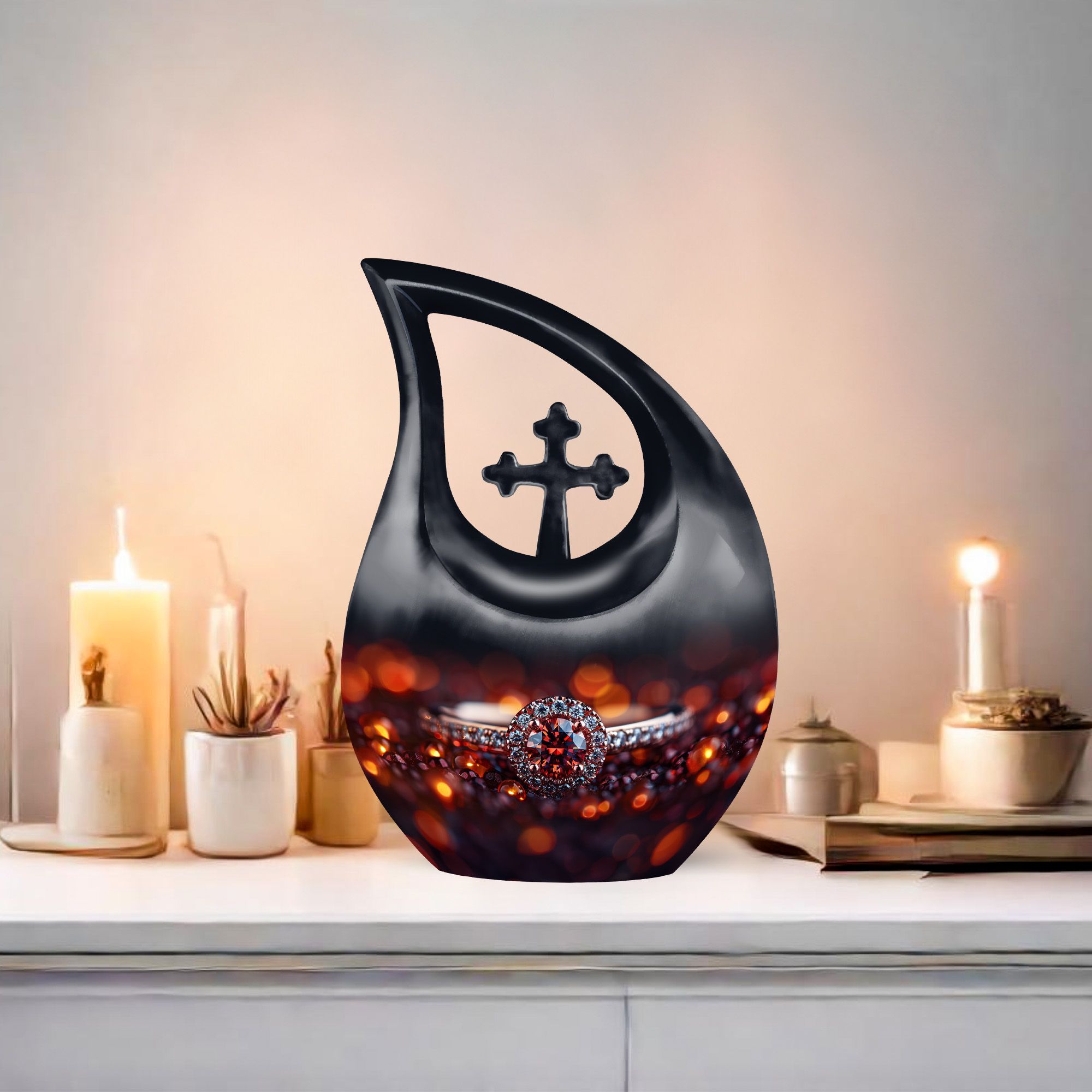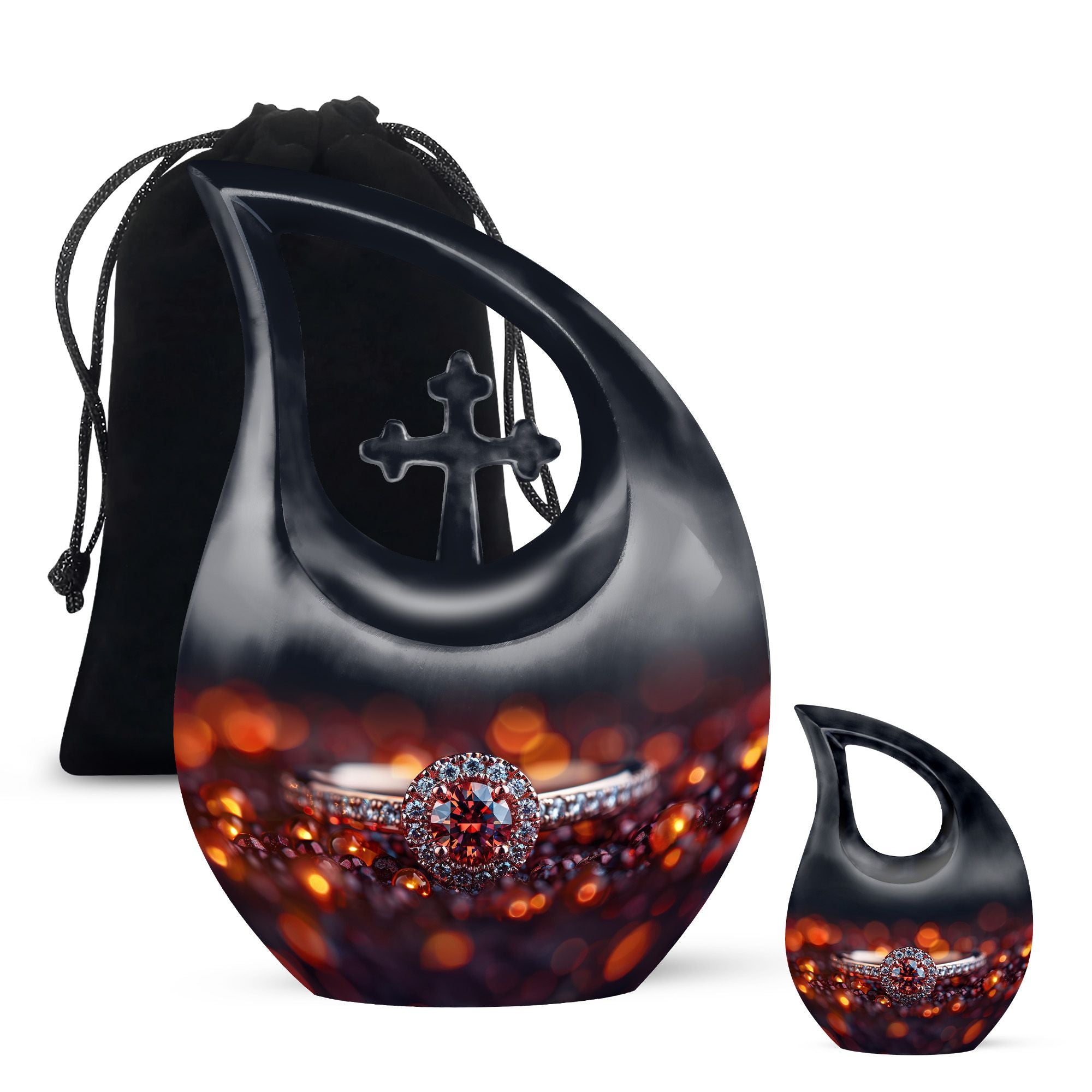 Step into the realm of tranquility and peace with our majestic Ring Urn also known as our 'Large urn'. Carefully crafted with high quality aluminium, this cremation container boasts an impressive capacity of 200 cubic inches, making it ideal for preserving the ashes of your loved ones. Our cremation containers reflect a minimalist aesthetic, embodied in a Cross Drop motif that transcends time and tradition. Experience a seamless blend of grace and functionality with this 10-inch tall urn weighing at 3.3 pounds. To enhance its uniqueness, we offer the option to personalize it with engraved names, imbuing it with a strong sense of belonging. Your urn comes nestled in a velvet pouch acting as a dignified containment for ashes. A perfect way to pay tribute, our Ring Urn proves to be an ideal Memorial urn. This product widely caters to keywords such as 'Urn For Dad', 'Custom Cremation Urns', 'Large Urns For Ashes', and 'Small Urn'.