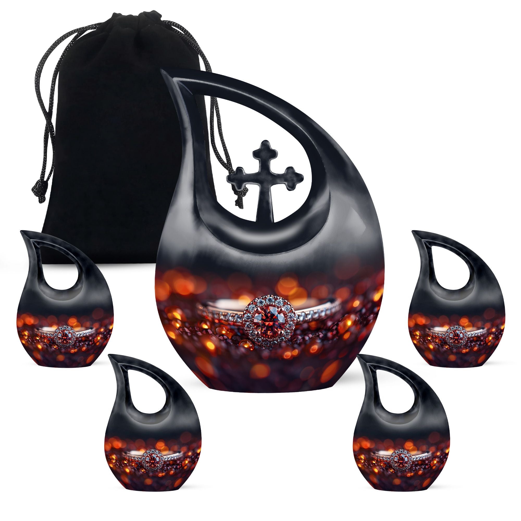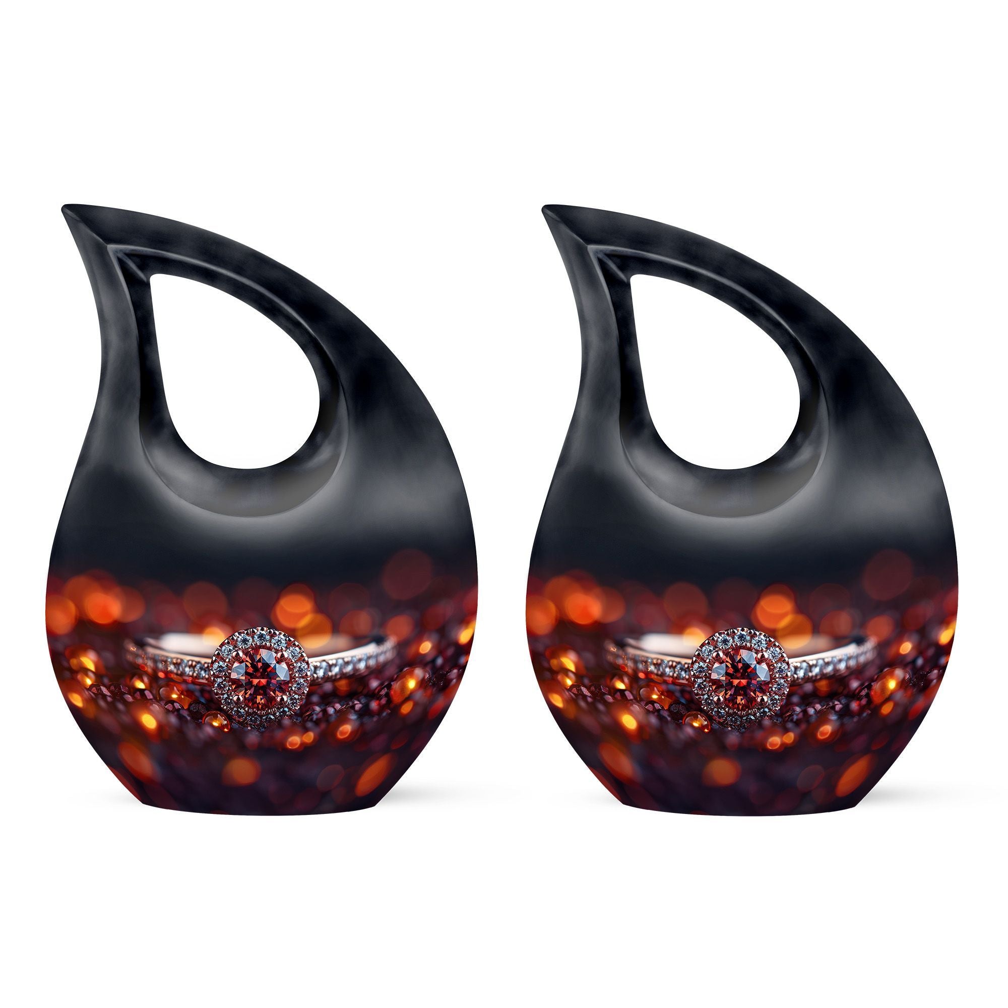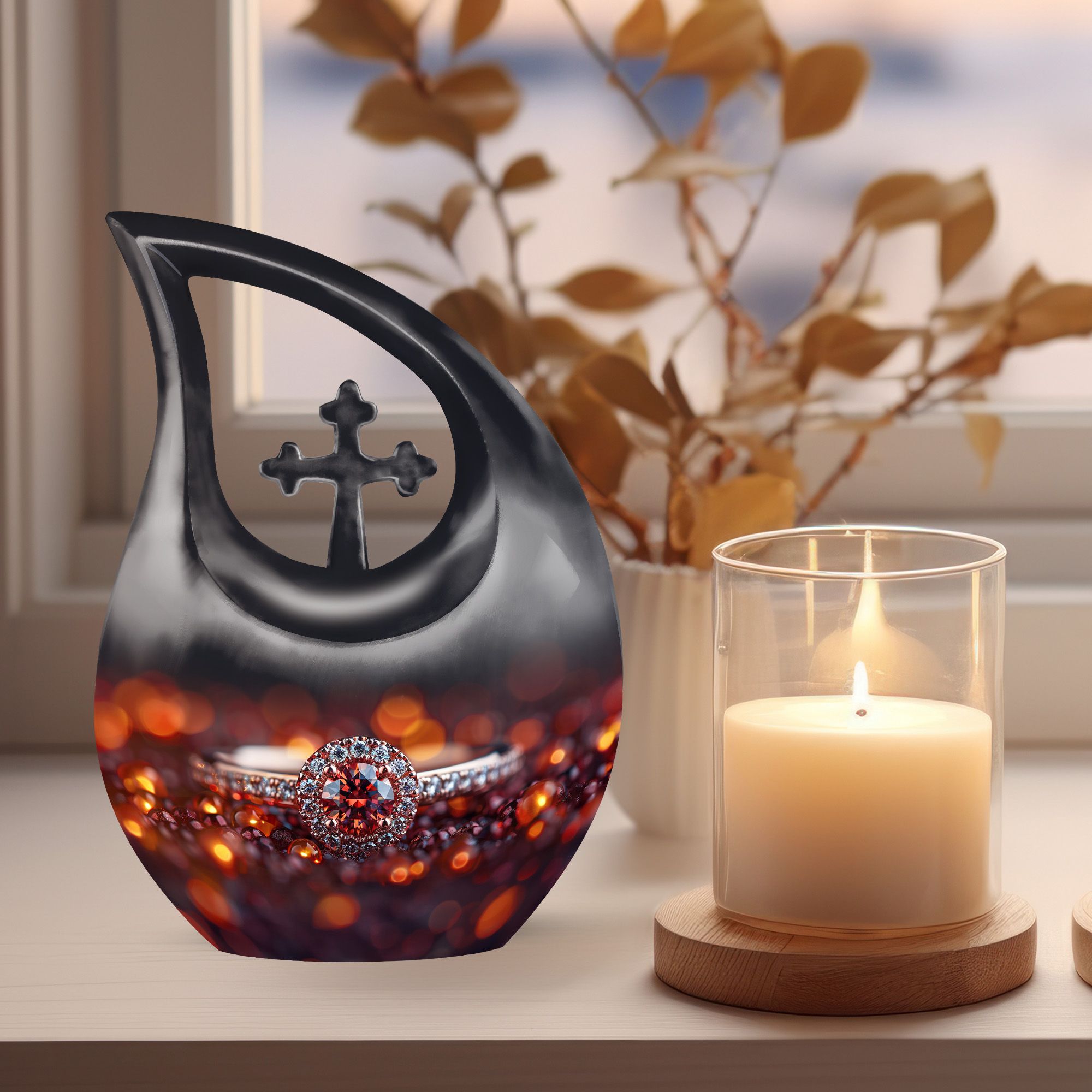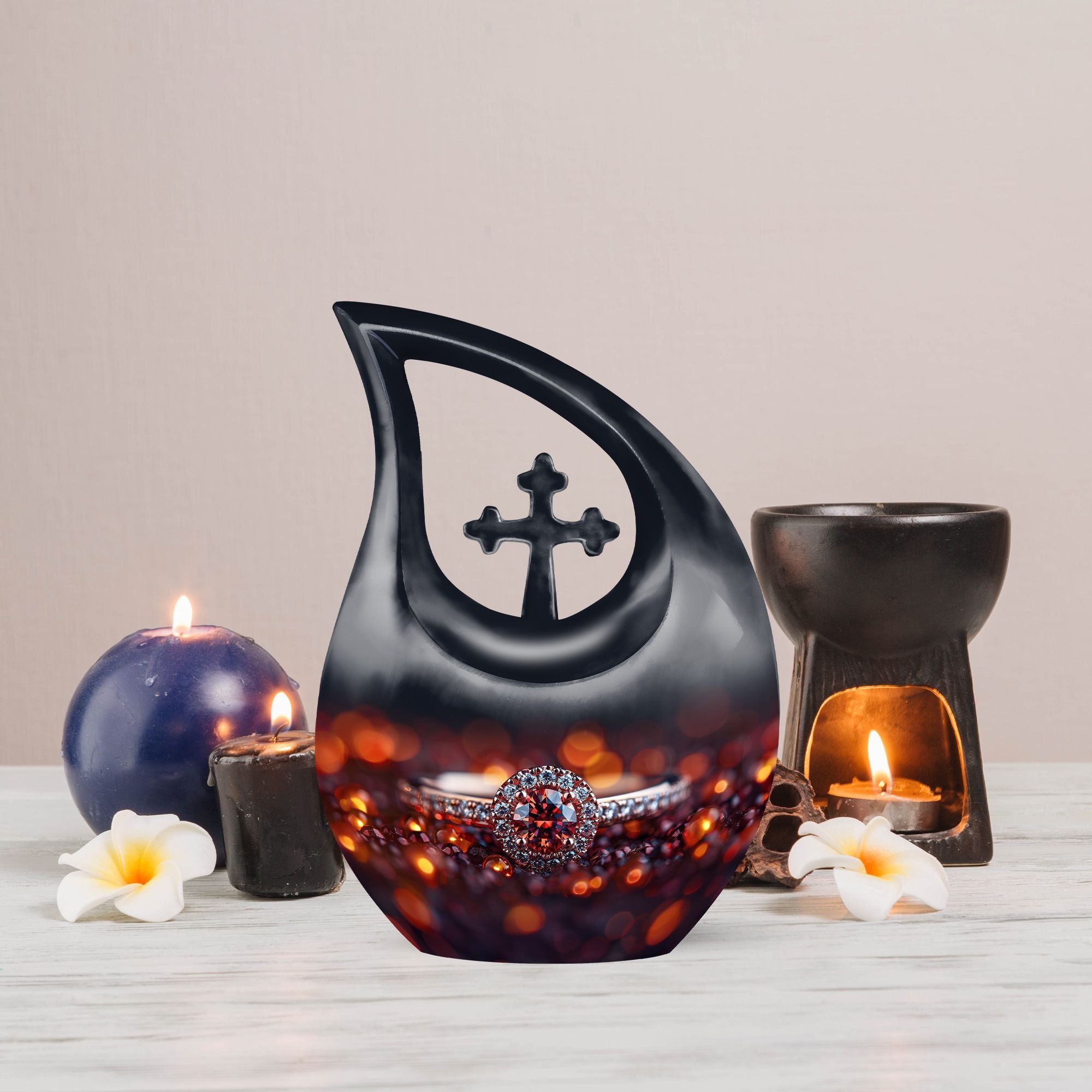 Step into the realm of tranquility and peace with our majestic Ring Urn also known as our 'Large urn'. Carefully crafted with high quality aluminium, this cremation container boasts an impressive capacity of 200 cubic inches, making it ideal for preserving the ashes of your loved ones. Our cremation containers reflect a minimalist aesthetic, embodied in a Cross Drop motif that transcends time and tradition. Experience a seamless blend of grace and functionality with this 10-inch tall urn weighing at 3.3 pounds. To enhance its uniqueness, we offer the option to personalize it with engraved names, imbuing it with a strong sense of belonging. Your urn comes nestled in a velvet pouch acting as a dignified containment for ashes. A perfect way to pay tribute, our Ring Urn proves to be an ideal Memorial urn. This product widely caters to keywords such as 'Urn For Dad', 'Custom Cremation Urns', 'Large Urns For Ashes', and 'Small Urn'.