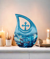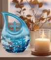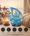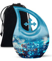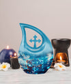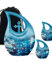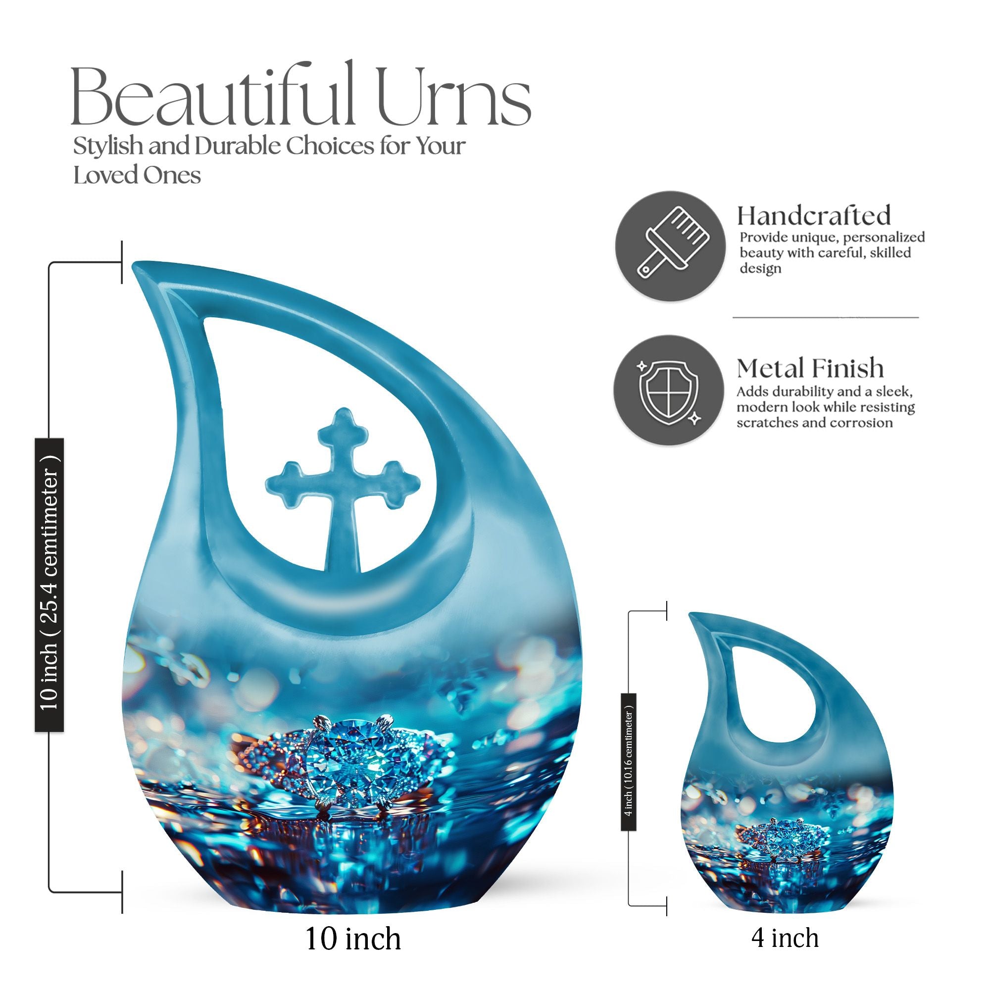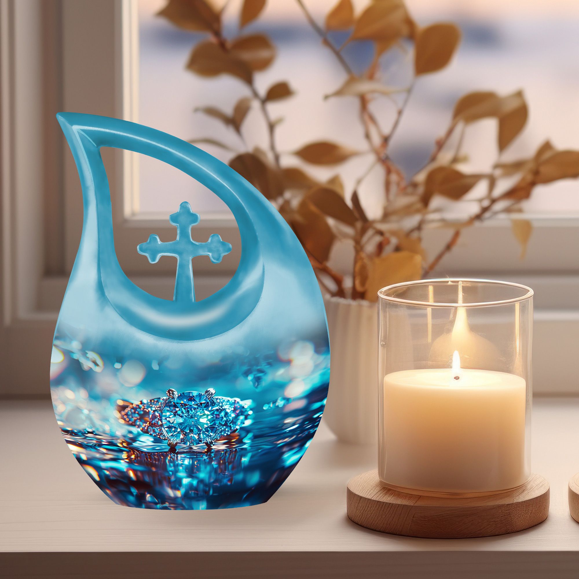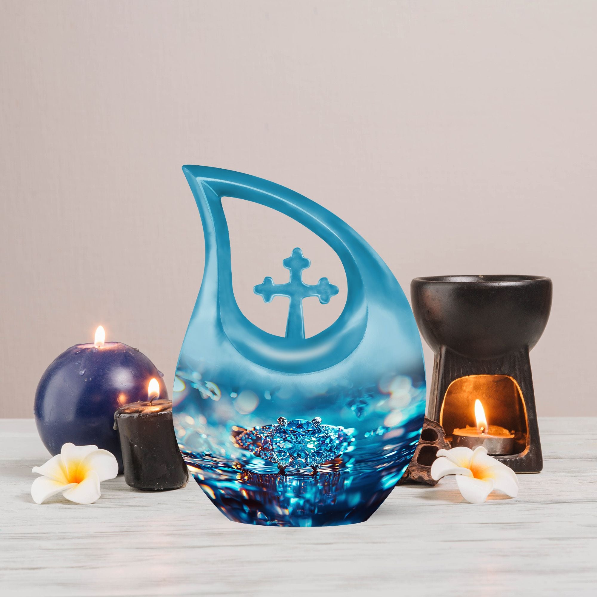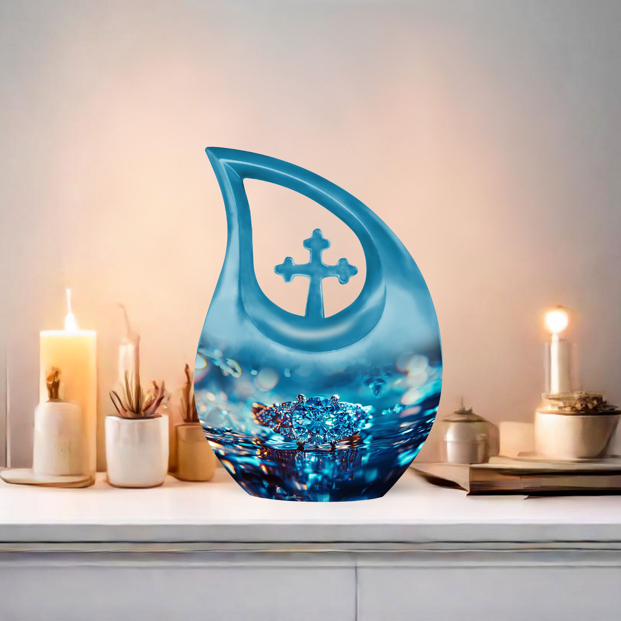 Cherish the memory of your dear ones with this exquisite Ring Urn. Crafted from robust and long-lasting aluminium, our Unusual Urns for Ashes stand 10 inches tall with a capacity generous enough to hold 200 cubic inches. Ideal for both adults and seniors, the Large Urn weighs 3.3 pounds, embodying a sober yet touching 'Cross Drop' symbol. The Memorial Urn’s central theme is the 'Ring' and it arrives neatly packaged in a velvet pouch for respectful containment of ashes. To make this Beautiful Urn truly unique, avail yourself of our customization service and have it inscribed with your loved one's names. Whether you are seeking a decorative urn to honor the memory of a mother (Custom Mom Urn) or looking for a dignified Ashes Keepsake for a man, our product promises to meet your emotional and aesthetic requirements. Equally worthy of consideration as a solemn tribute or a tasteful piece of decor, our distinct Ring Urn offers a meaningful choice amid Memorial Ceremony Supplies.