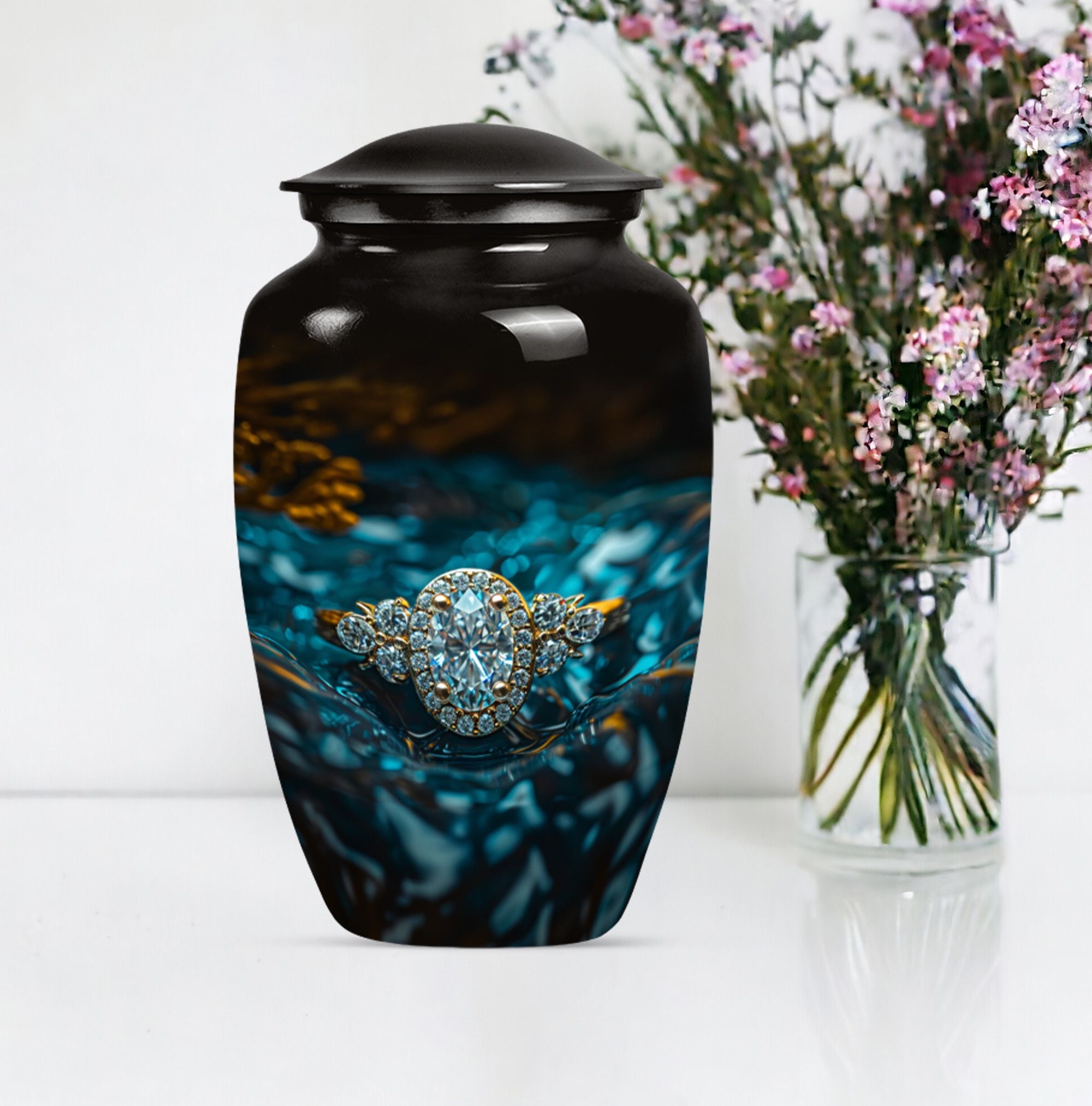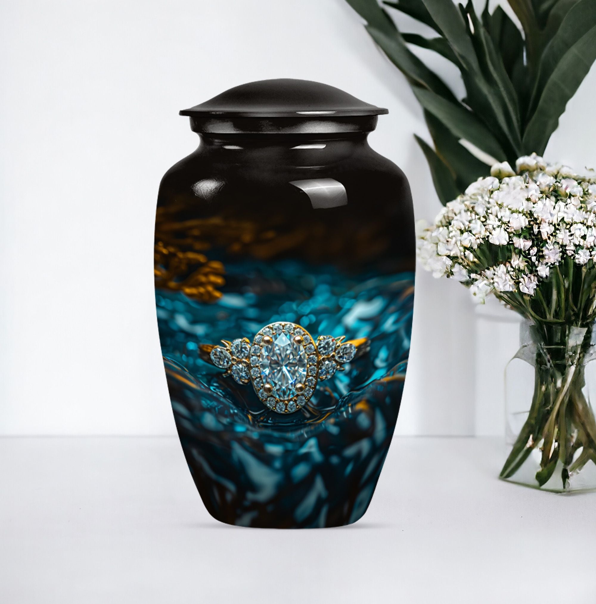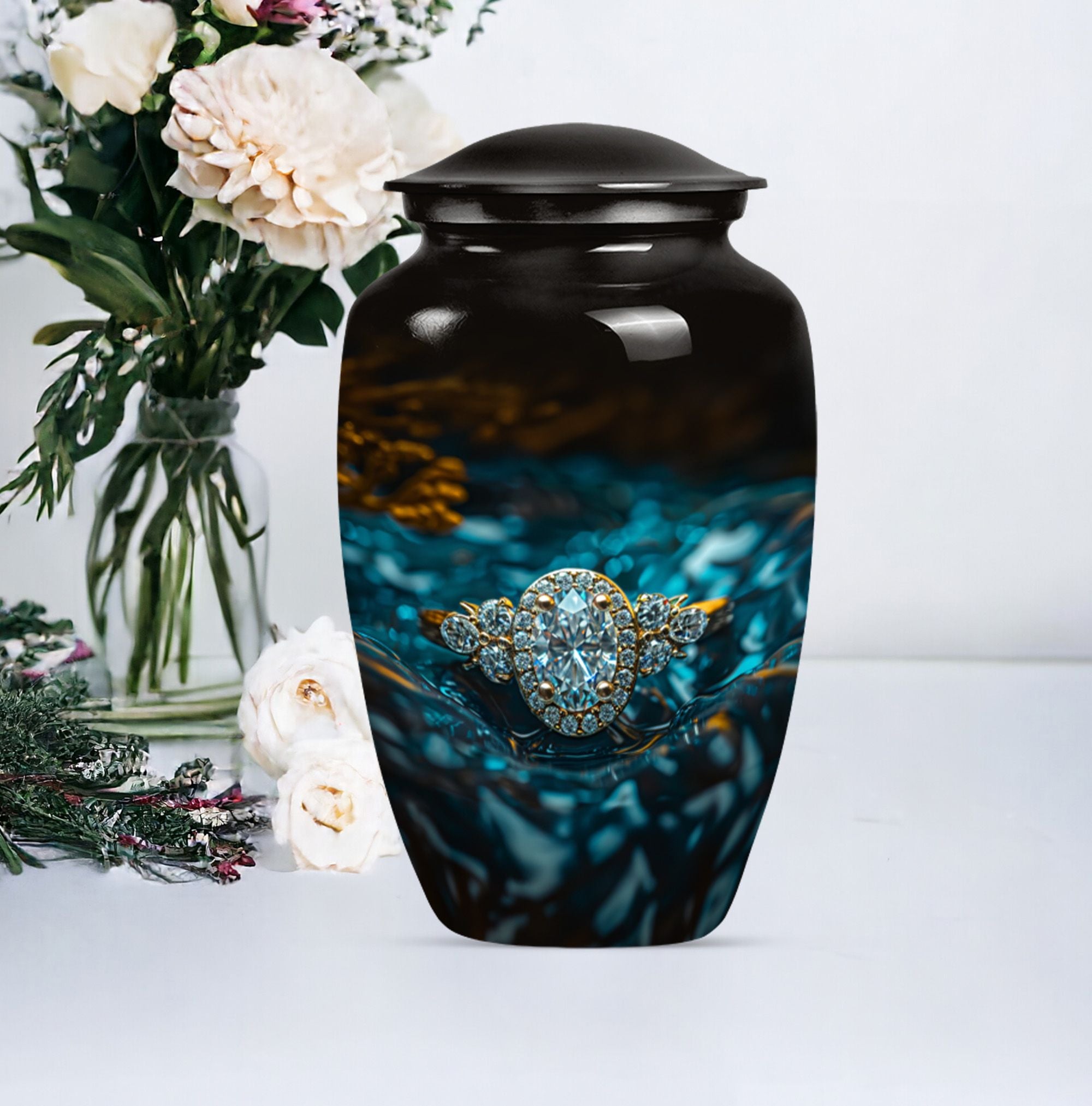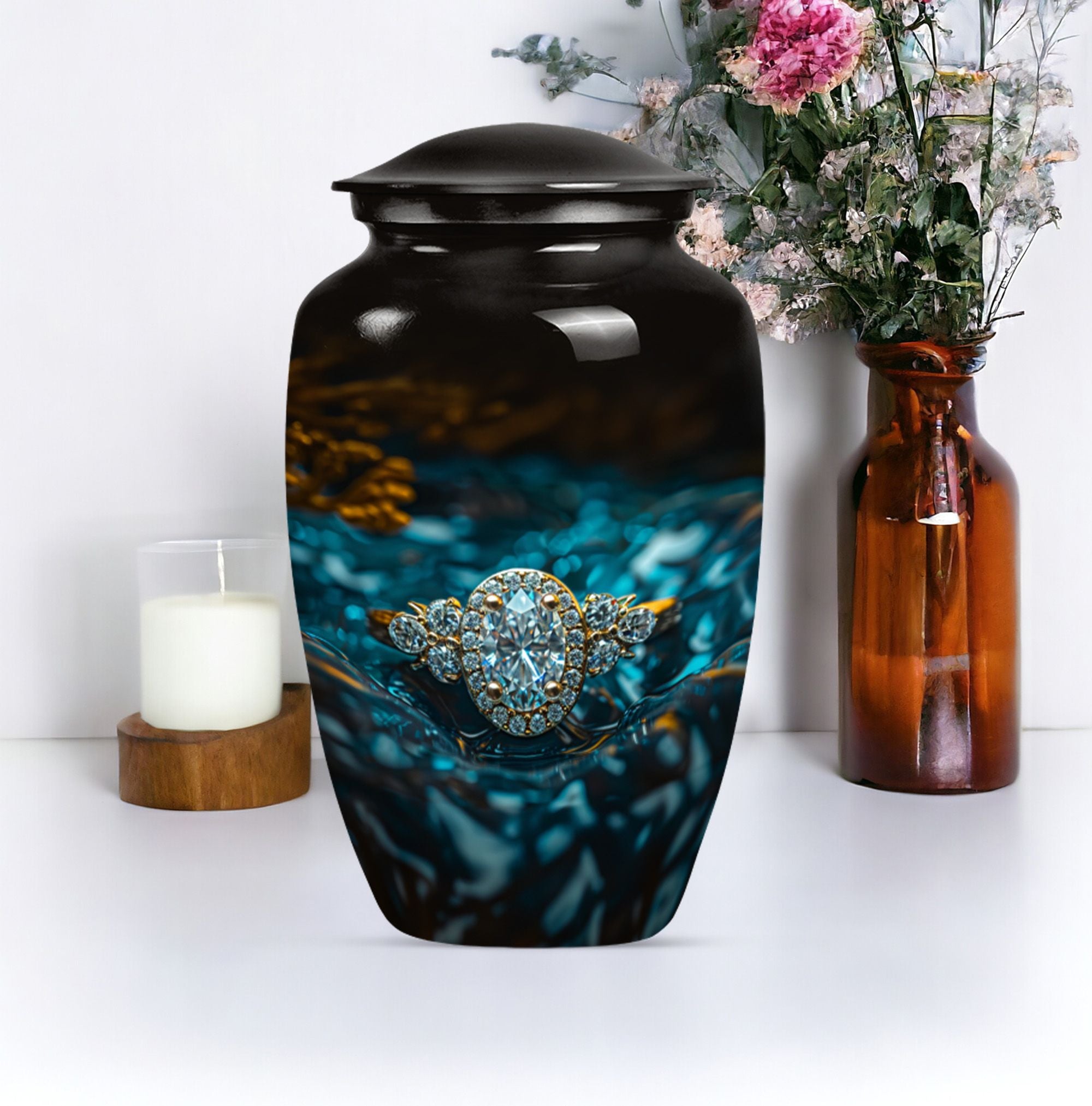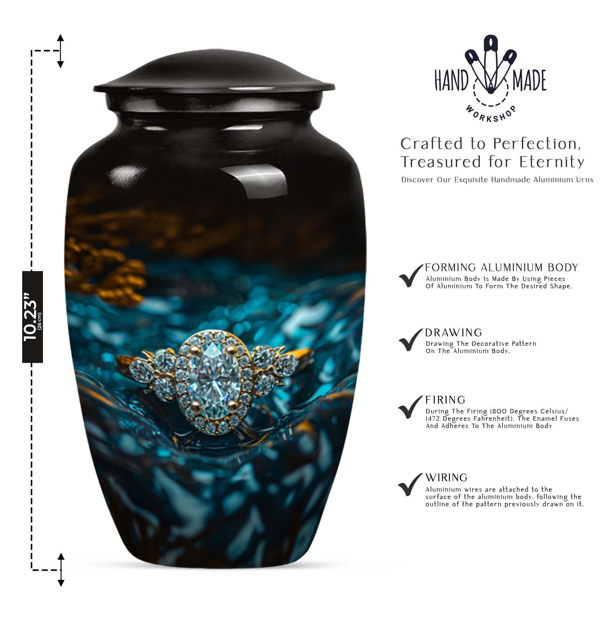 Crafted for those seeking tangible reminiscences of their departed loved ones, this 10-inch ring urn serves as a profound method to house the memories of your cherished one. Wrapped in an abstract theme, this large urn encapsulates the ethos of love and respect, rendered in high-quality aluminium. At 3.3 pounds, its dimensions stand 10 inches in height, with a commendable capacity of 200 cubic inches adequate to hold the ashes of an adult. Besides its size and weight, every urn comes with a velvet pouch, offering a dignified containment for the remains. Reflecting its classic urn design, this cremation urn facilitates a feel of connection, endearing memories, and peace during the challenging times of loss. Complementing the inherent poise is the unique feature of personalization; engrave names onto the urn for a bespoke touch. This ring urn thoughtfully balances funeral traditions and personal sentiment in its design. Ideal for both human ashes and burial in the ground, this metal urn ensures your loved ones are always close to your heart. From funeral urns for human ashes adult to cremation rings for ashes, invest in this meticulously crafted piece to celebrate eternal bonds.