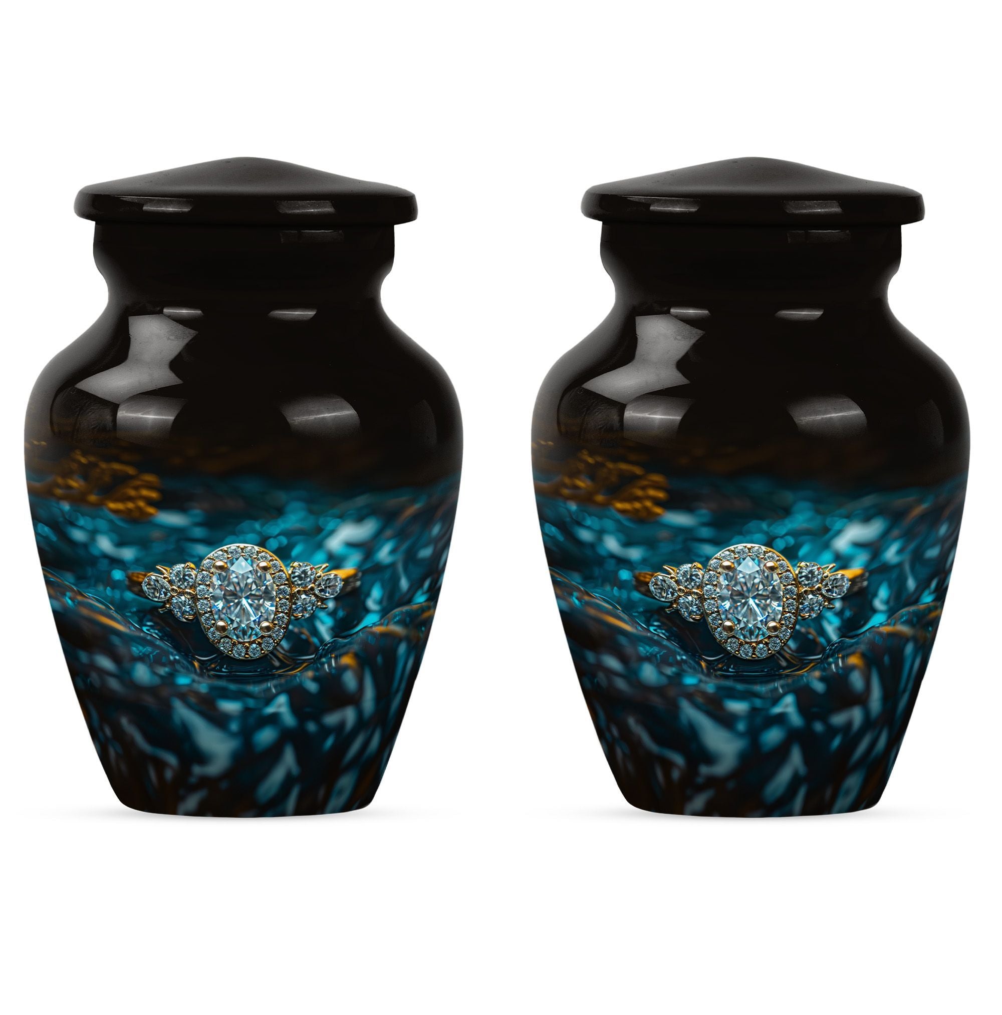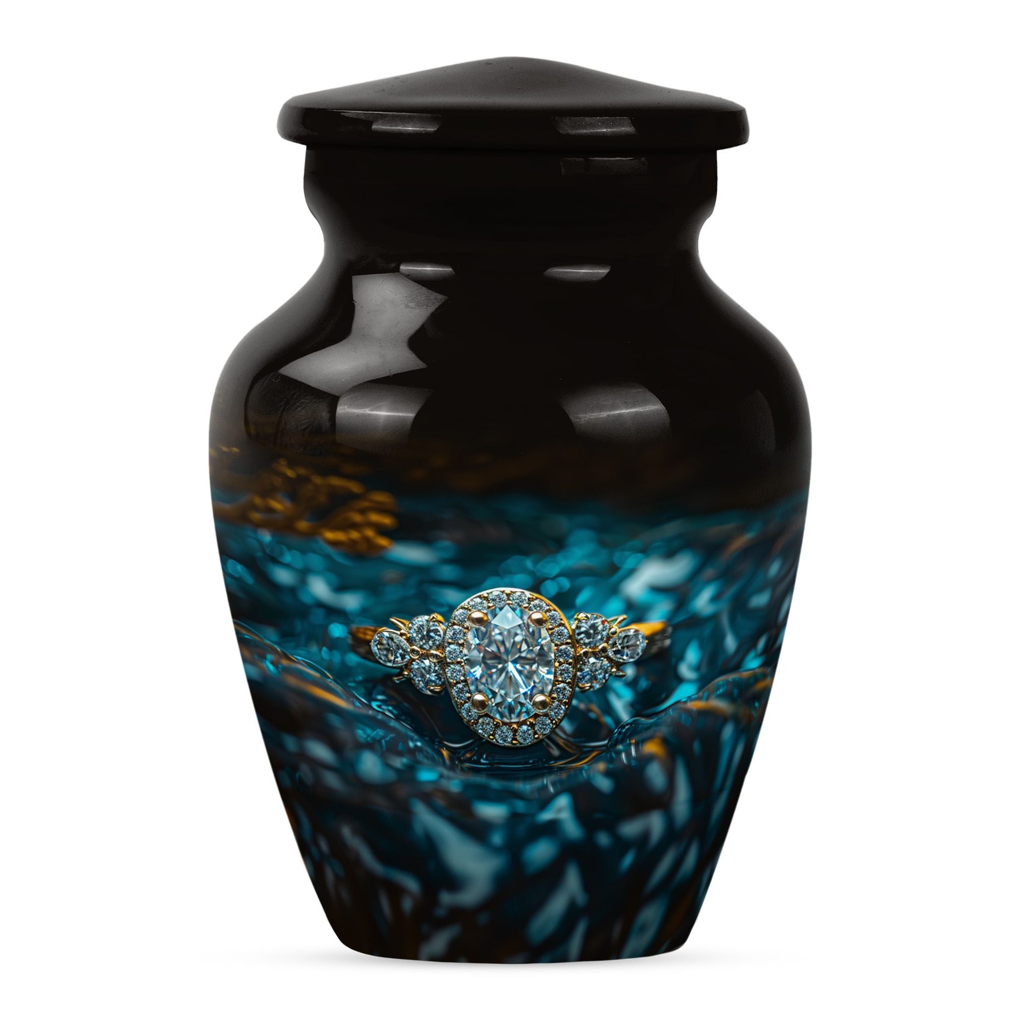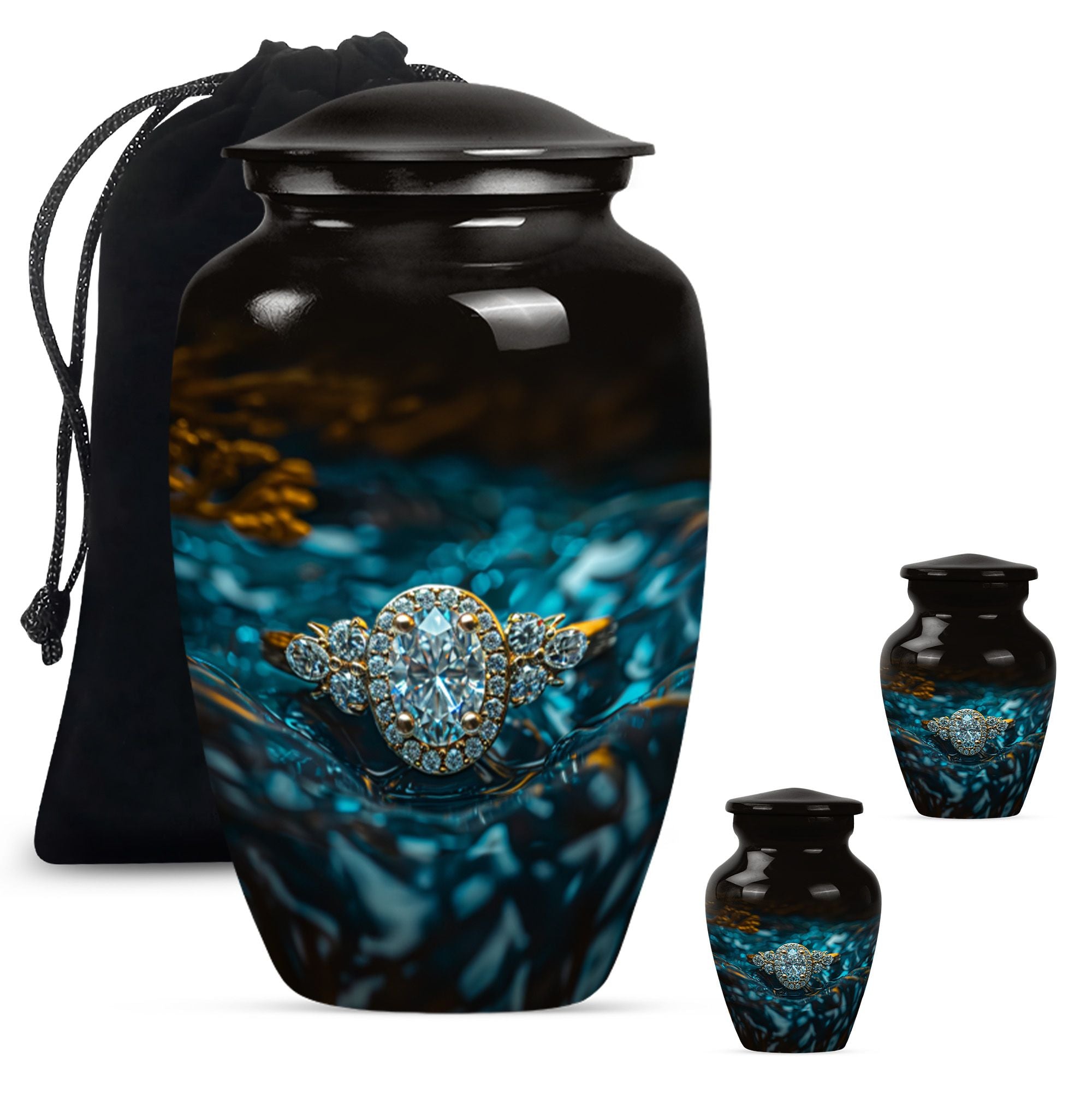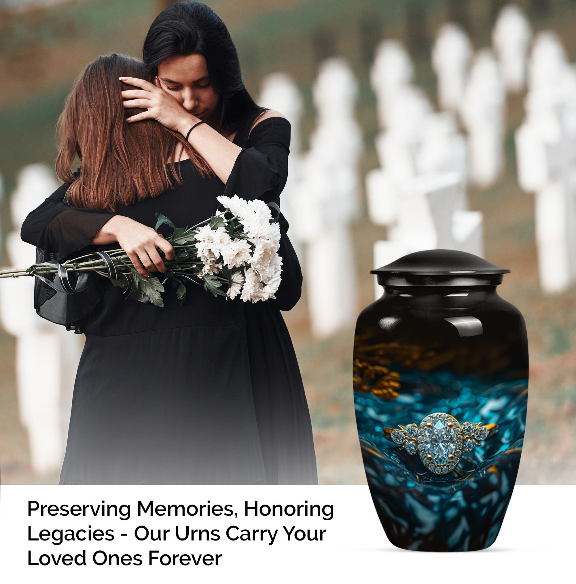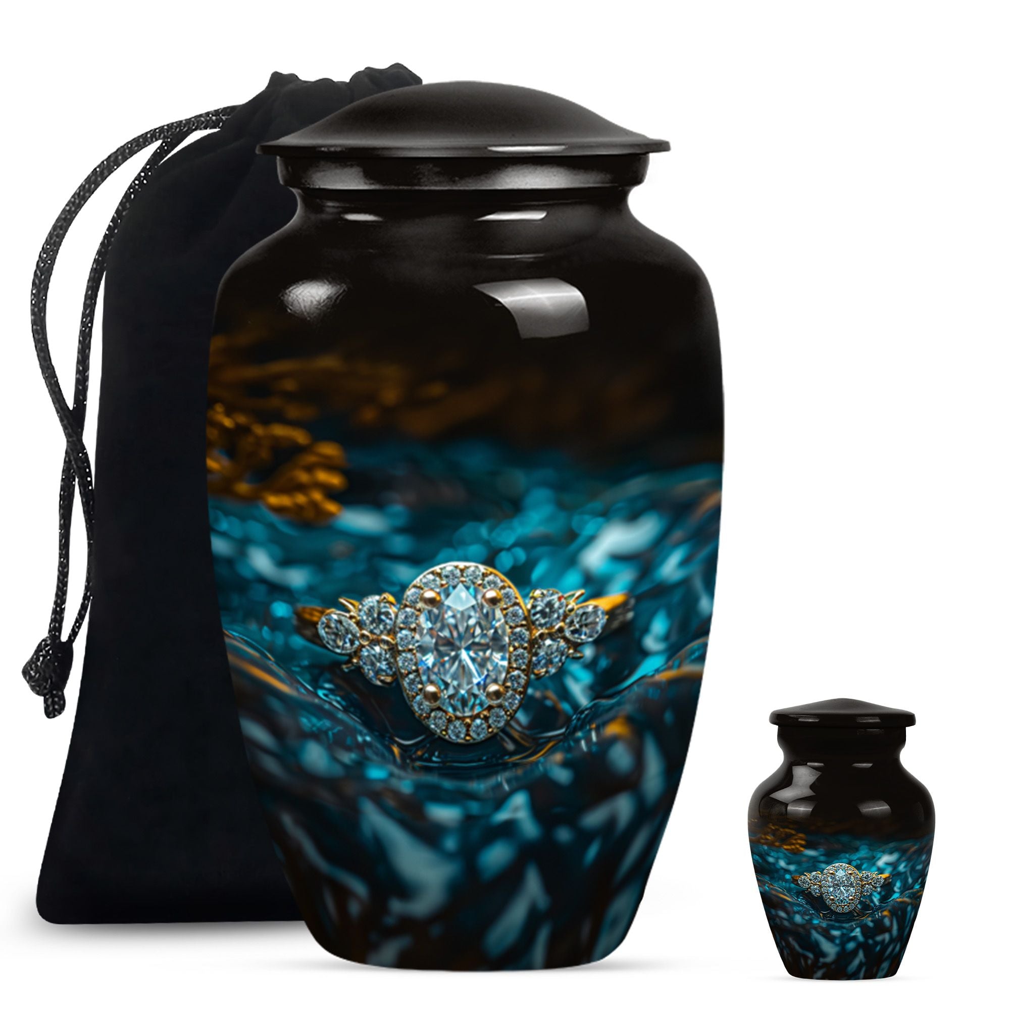 Crafted for those seeking tangible reminiscences of their departed loved ones, this 10-inch ring urn serves as a profound method to house the memories of your cherished one. Wrapped in an abstract theme, this large urn encapsulates the ethos of love and respect, rendered in high-quality aluminium. At 3.3 pounds, its dimensions stand 10 inches in height, with a commendable capacity of 200 cubic inches adequate to hold the ashes of an adult. Besides its size and weight, every urn comes with a velvet pouch, offering a dignified containment for the remains. Reflecting its classic urn design, this cremation urn facilitates a feel of connection, endearing memories, and peace during the challenging times of loss. Complementing the inherent poise is the unique feature of personalization; engrave names onto the urn for a bespoke touch. This ring urn thoughtfully balances funeral traditions and personal sentiment in its design. Ideal for both human ashes and burial in the ground, this metal urn ensures your loved ones are always close to your heart. From funeral urns for human ashes adult to cremation rings for ashes, invest in this meticulously crafted piece to celebrate eternal bonds.