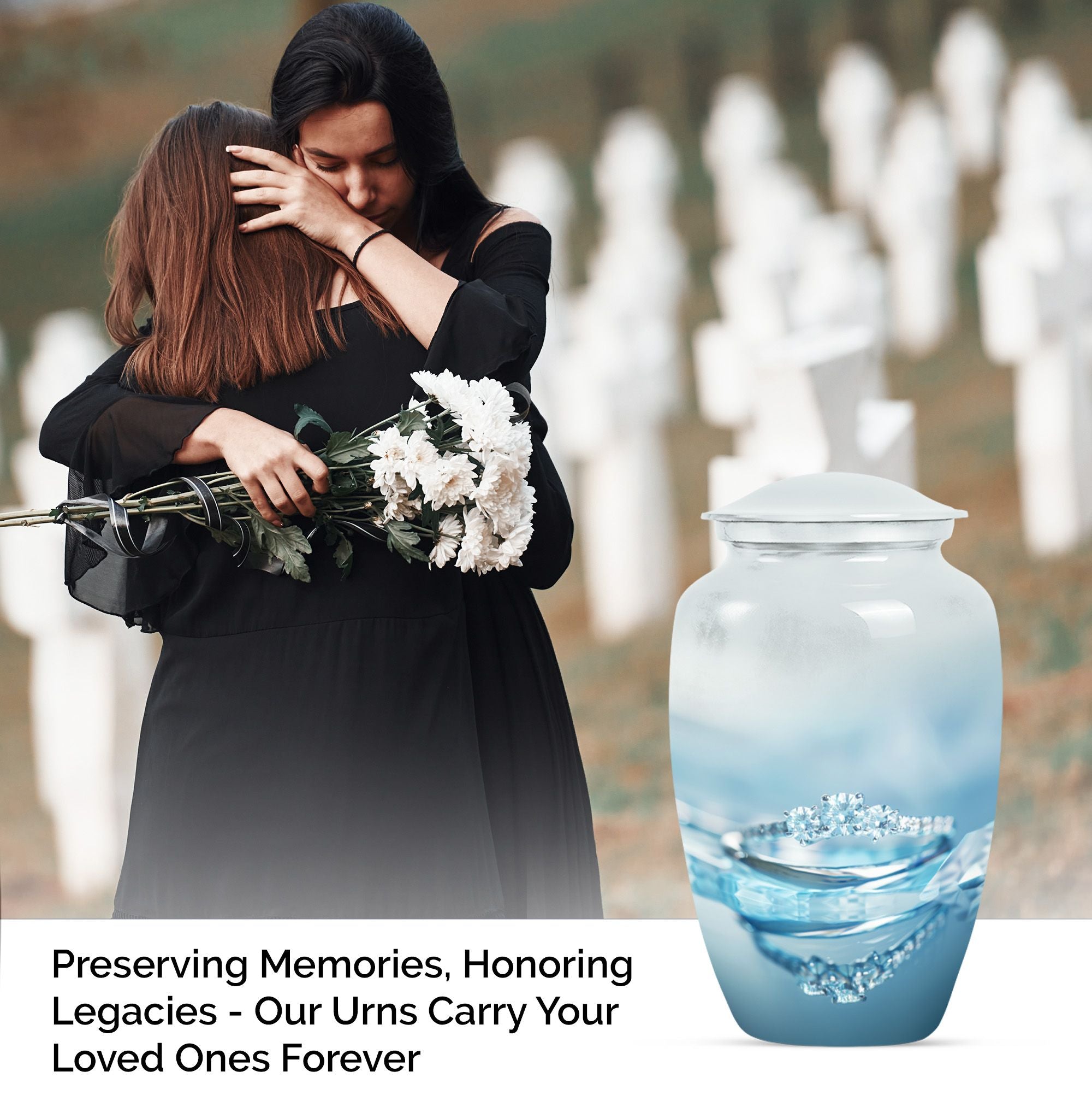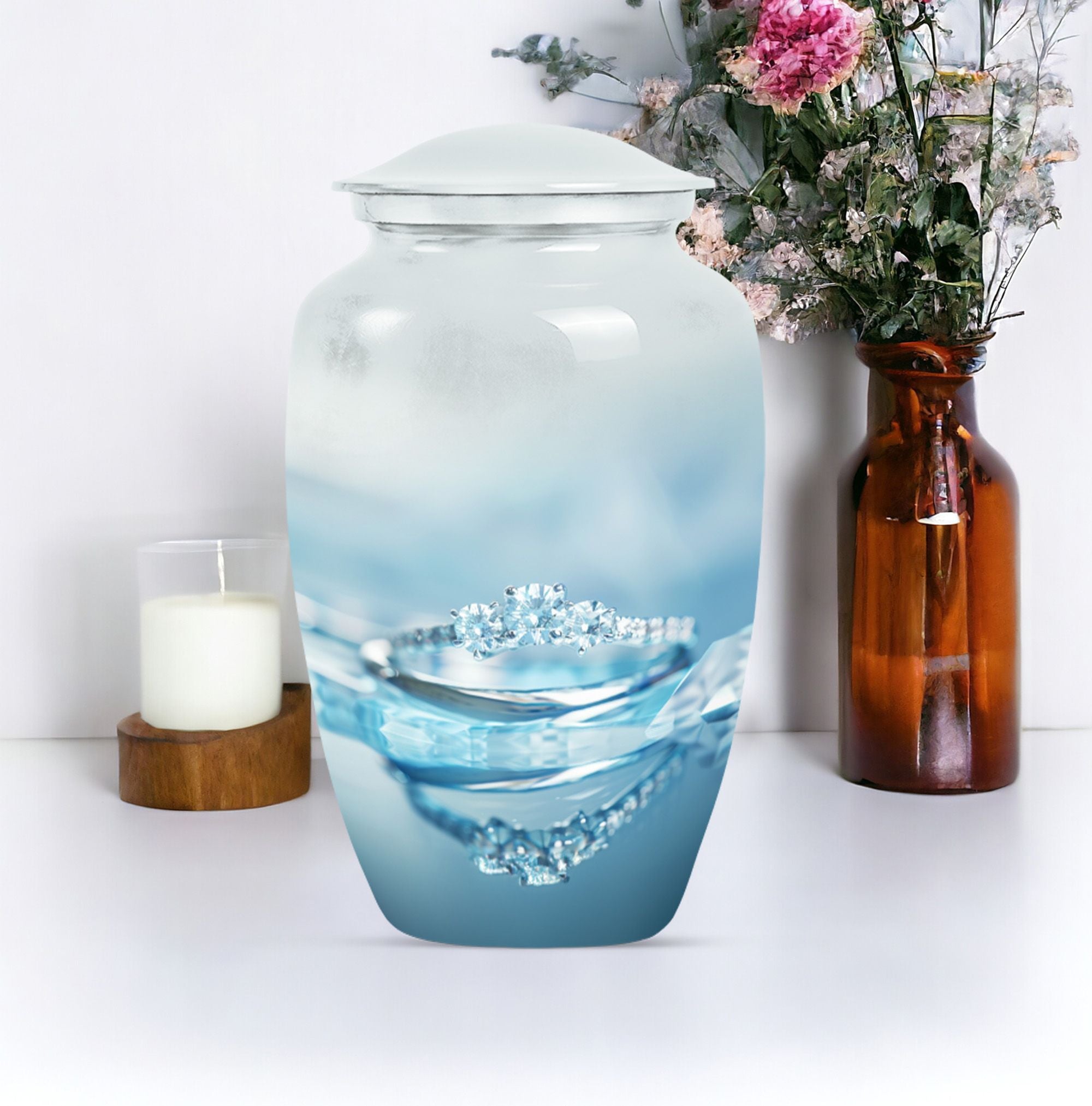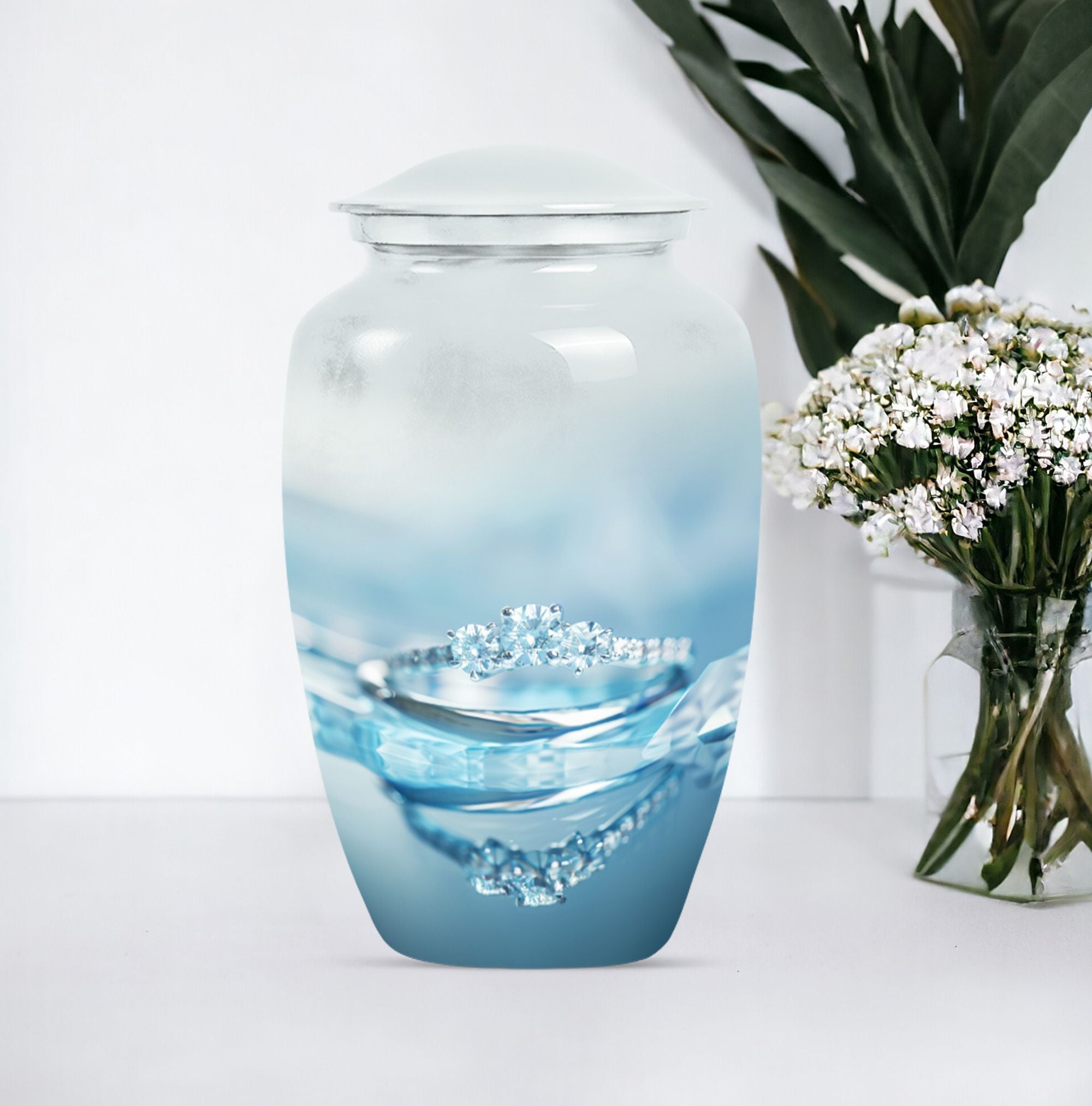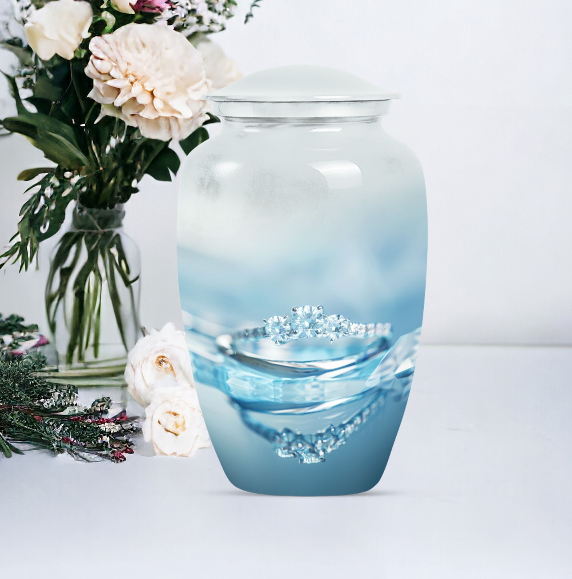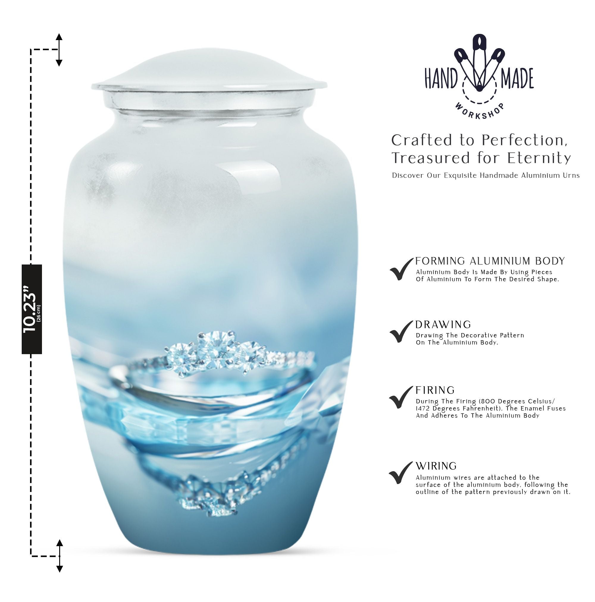 Commemorate the life of your dear one with our Classic Ring Urn, a stately and distinctive piece to secure your beloved memories. This large urn is meticulously constructed from durable aluminium material, promising longevity. Measuring 10 inches in height, with an impressive weight of 3.3 pounds, it can accommodate up to 200 cubic inches. This makes it ideal for preserving the ashes of an adult male or female, aligning well with the keywords 'cremation urns for human ashes adult male' and 'funeral urns for adult ashes women'. Crafted with an abstract theme, this memorial urn is perfect for those in search of 'burial medium size urns' or 'urn human ash cremation urn'. The urn comes complete with a velvet pouch for dignified containment of ashes. Additionally, you can personalize this cremation urn with engraved names, a significant touch to keep the memories alive. It's time to enrich your remembrance rituals with our Classic Ring Urn, the perfect tribute for your loved one.