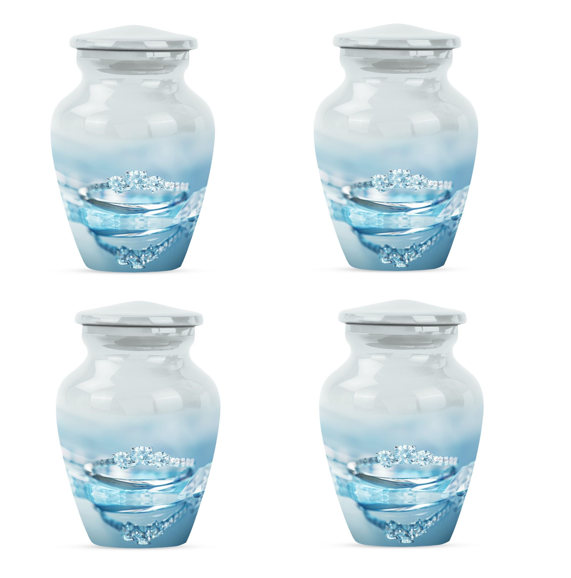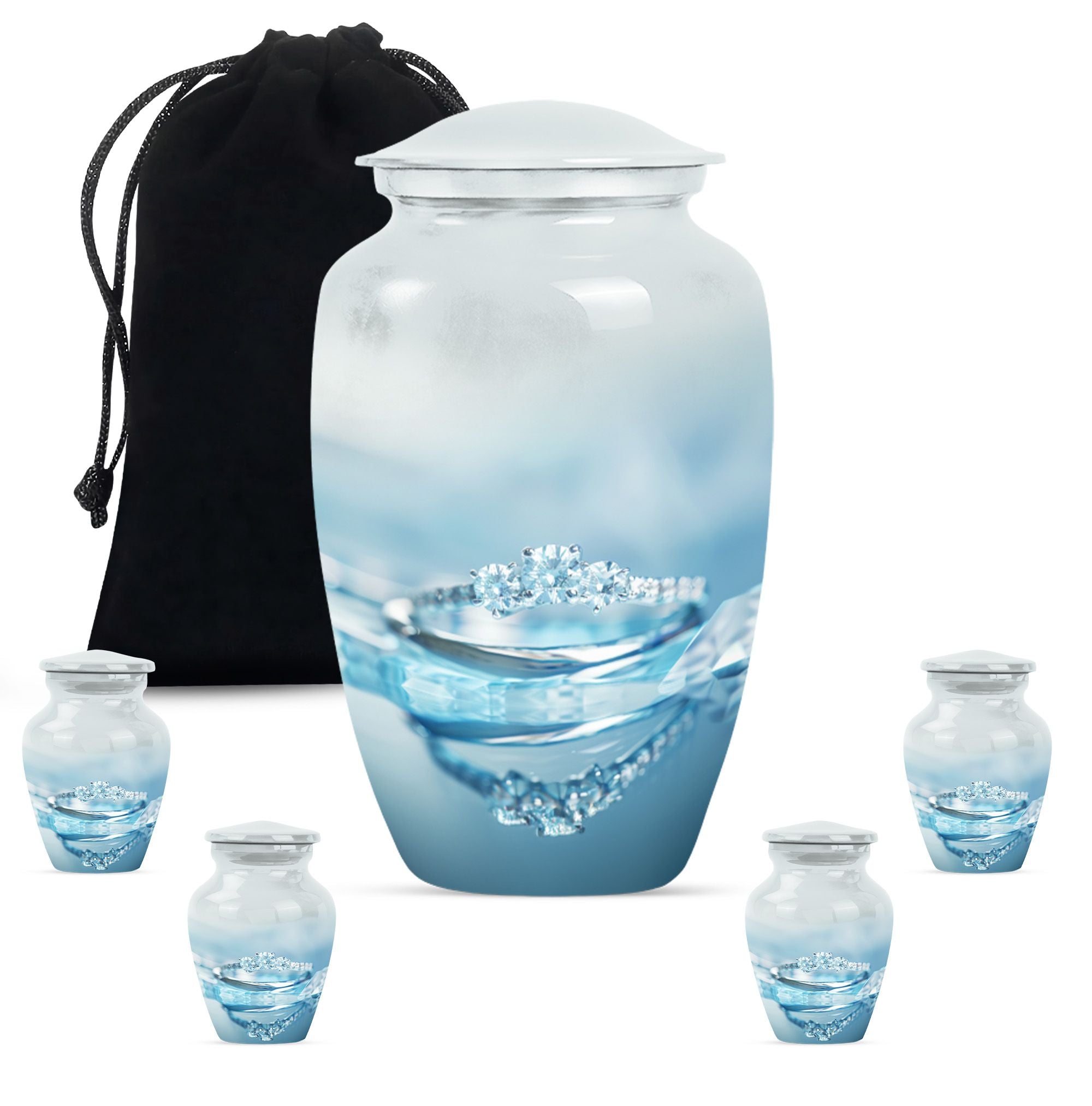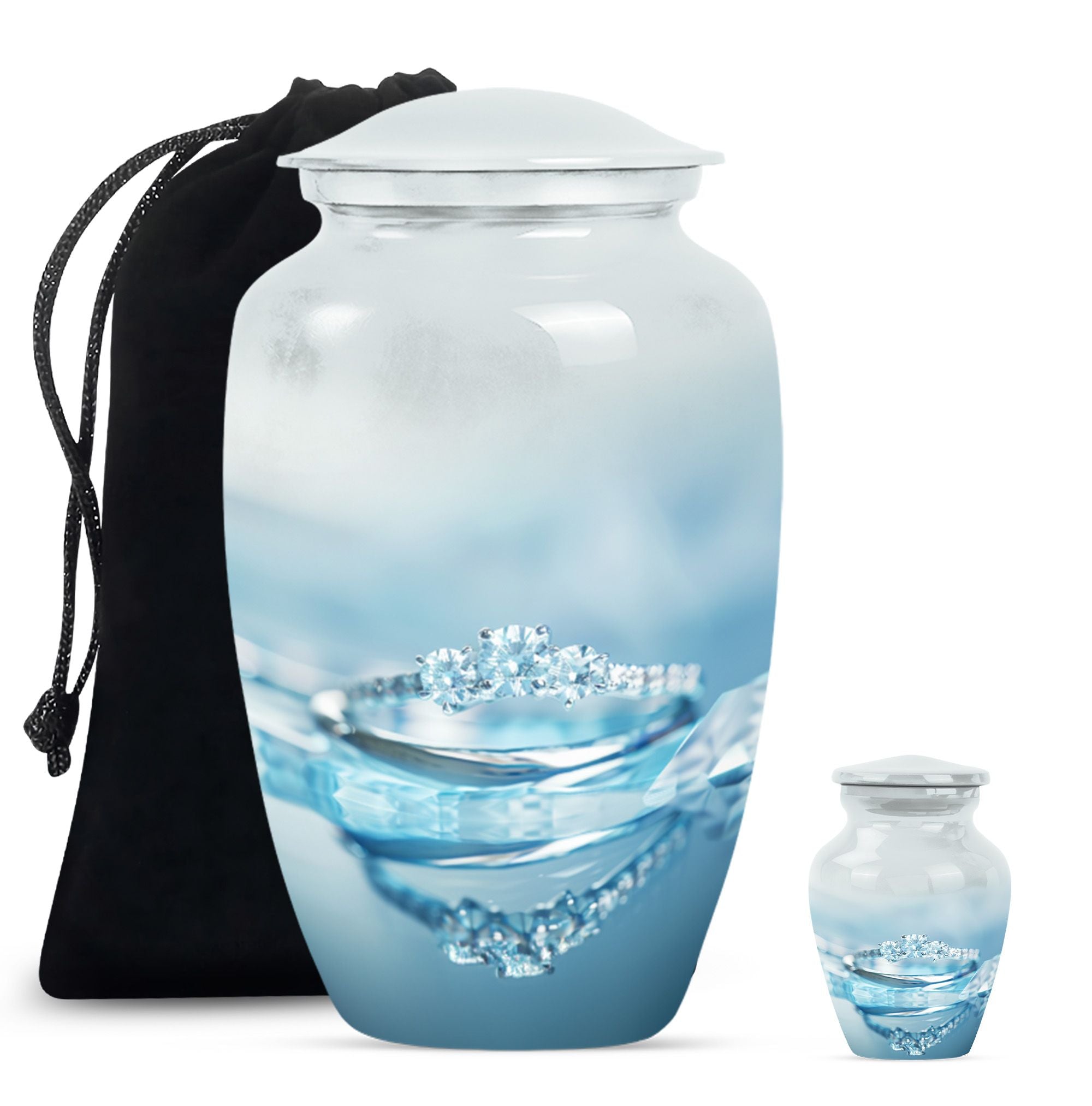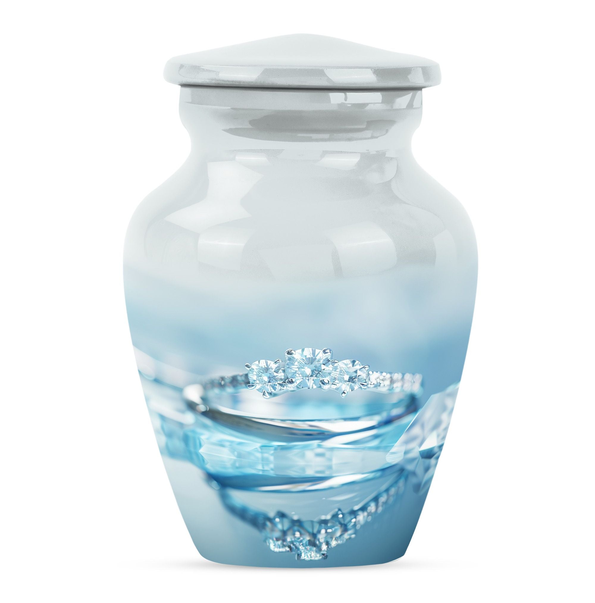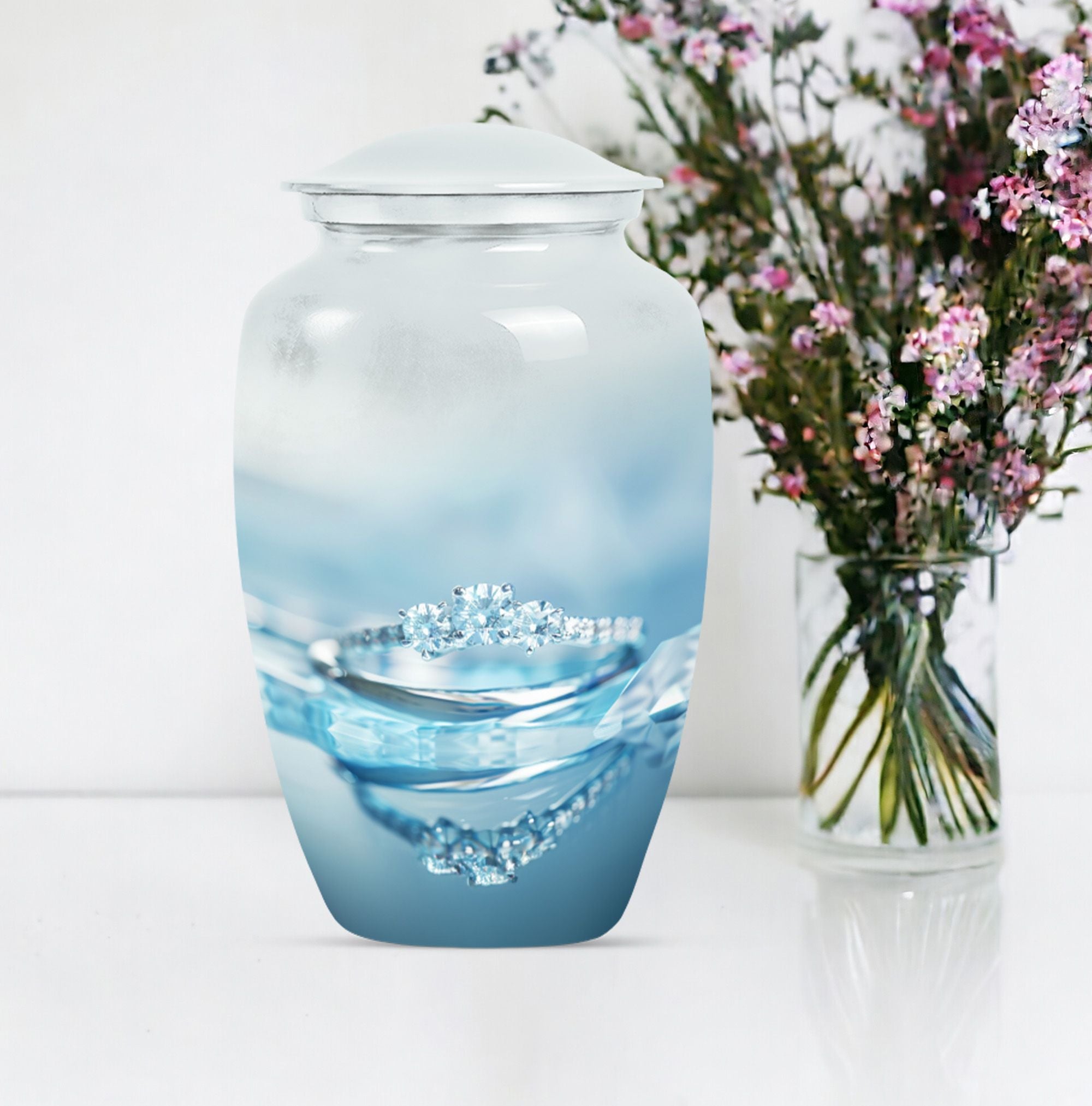 Commemorate the life of your dear one with our Classic Ring Urn, a stately and distinctive piece to secure your beloved memories. This large urn is meticulously constructed from durable aluminium material, promising longevity. Measuring 10 inches in height, with an impressive weight of 3.3 pounds, it can accommodate up to 200 cubic inches. This makes it ideal for preserving the ashes of an adult male or female, aligning well with the keywords 'cremation urns for human ashes adult male' and 'funeral urns for adult ashes women'. Crafted with an abstract theme, this memorial urn is perfect for those in search of 'burial medium size urns' or 'urn human ash cremation urn'. The urn comes complete with a velvet pouch for dignified containment of ashes. Additionally, you can personalize this cremation urn with engraved names, a significant touch to keep the memories alive. It's time to enrich your remembrance rituals with our Classic Ring Urn, the perfect tribute for your loved one.