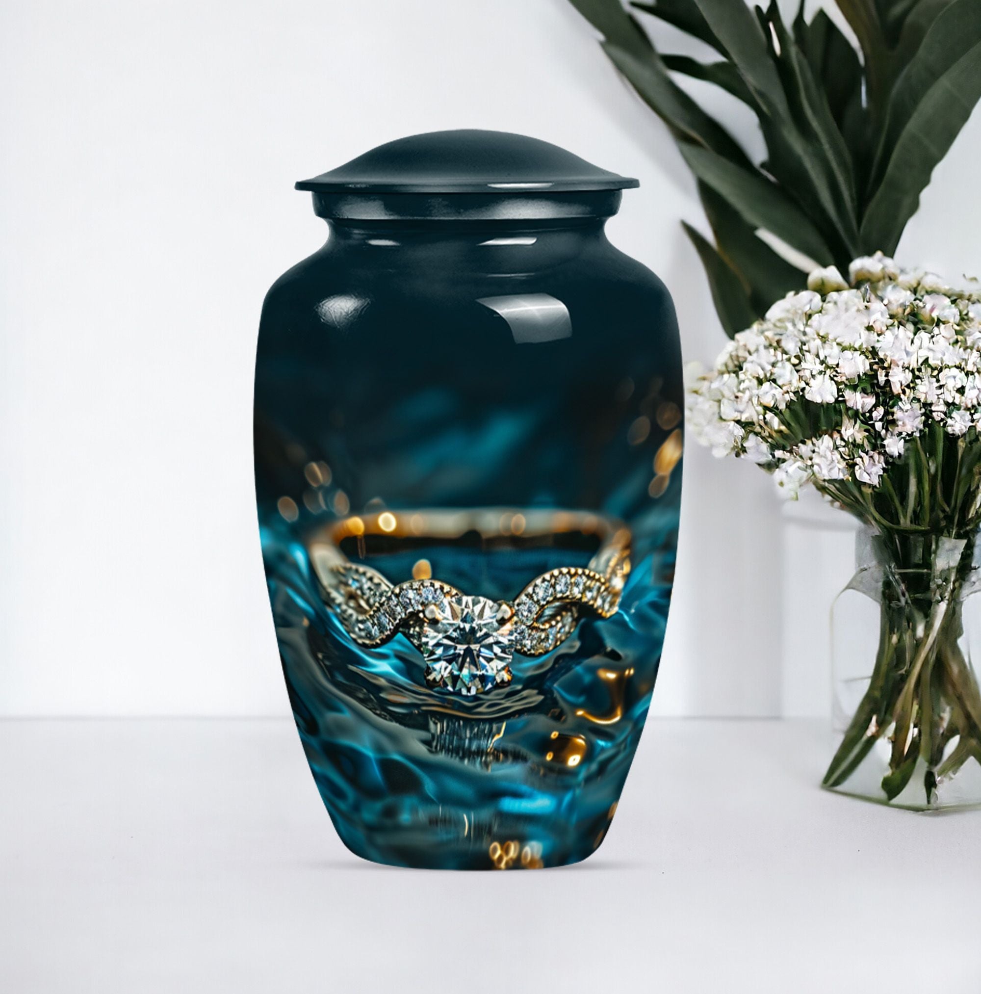 Featuring a size of 10 Inches, this Classic Ring Urn serves as a dignified memorial human urn for ashes. Crafted from sturdy and durable aluminium, it weighs a substantial 3.3 pounds, cementing a tangible presence dedicated to your loved ones. Its 10-Inch height and capacity of 200 cubic inches ensure ample space, making this an ideal 'large urn'. The shape and theme are abstract, providing both a modern design and a comforting, timeless presence. Provided alongside this cremation urn is a velvet pouch, offering tender containment and respect to the ashes. The urn offers the ability for personalization, allowing you to engrave names and perpetuate the memory of your loved ones. As a metal large urn, it perfectly caters to those searching for 'Memorial funeral urns for ashes', 'adult burial urn', or 'ashes of love'. Honor the memory of your dearly departed with this large then life urn, a fitting tribute to their lasting impact.