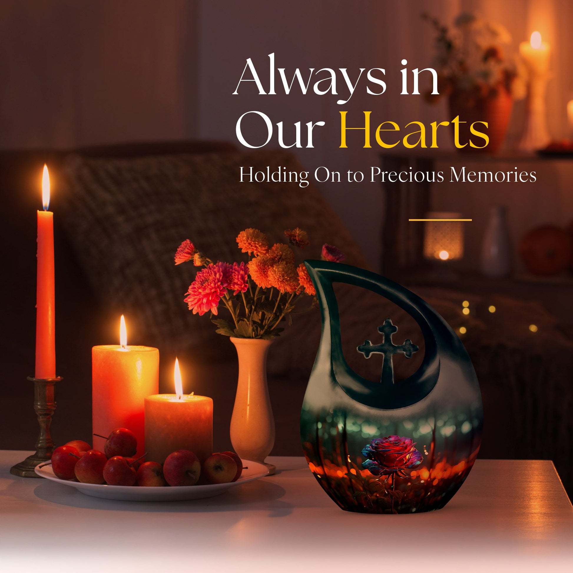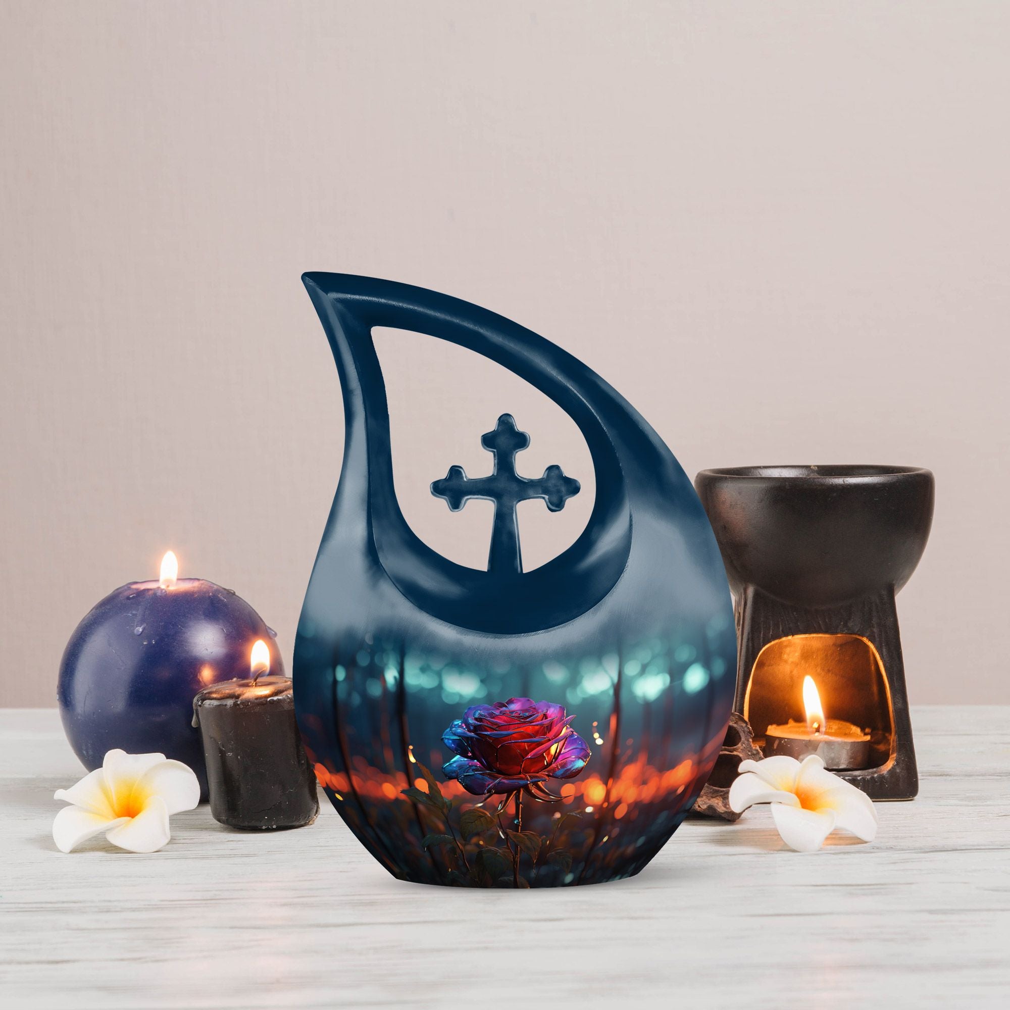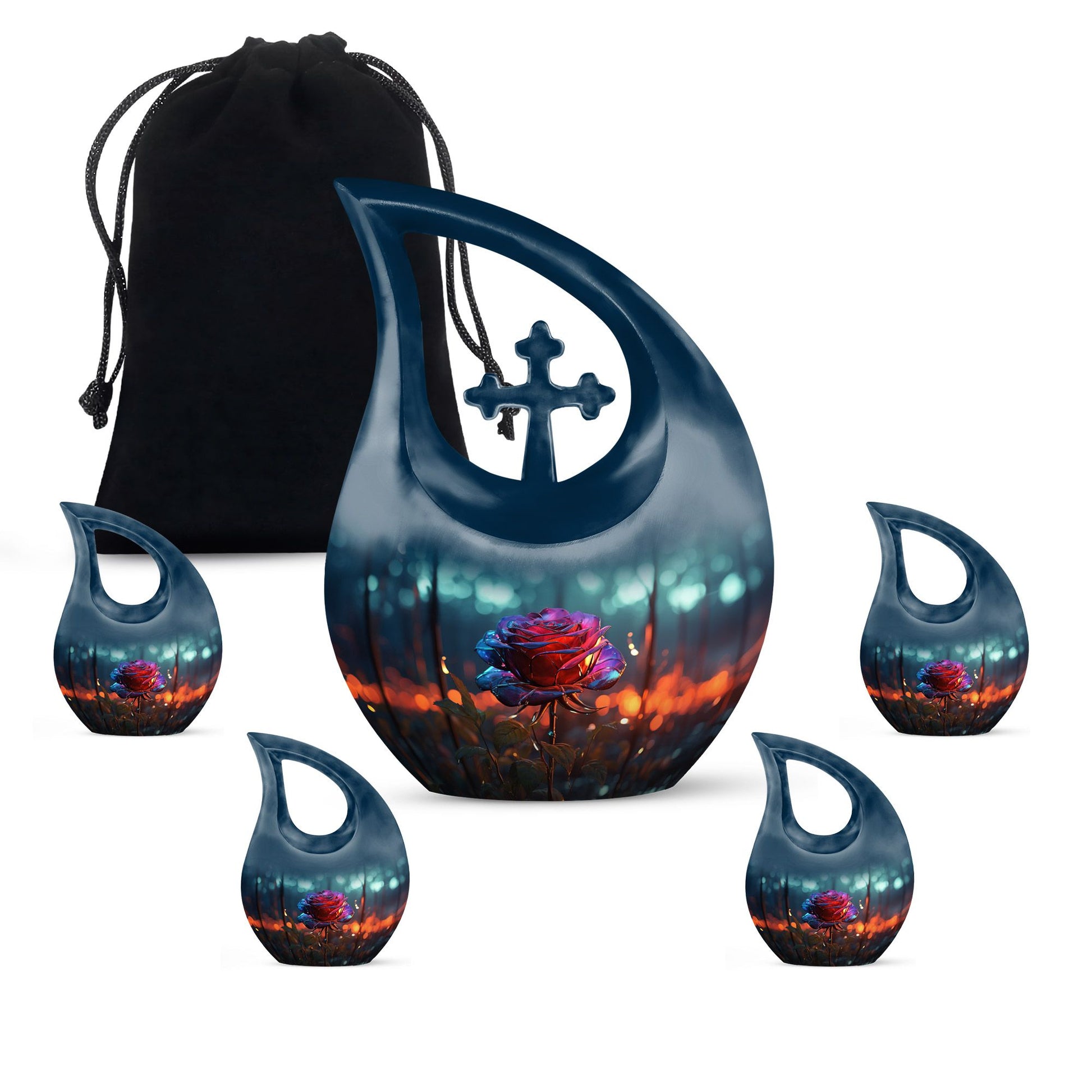 Celebrate the beauty of a cherished life with our Blue Teardrop Burial Urn for Ashes, featuring a Single Dark Rose and Cross Memorial design. This exquisite cremation burial urn embodies serenity and devotion, offering a peaceful and dignified resting place for your loved one. Whether chosen as a burial urn for ashes or for display at home, it represents faith, love, and eternal connection.